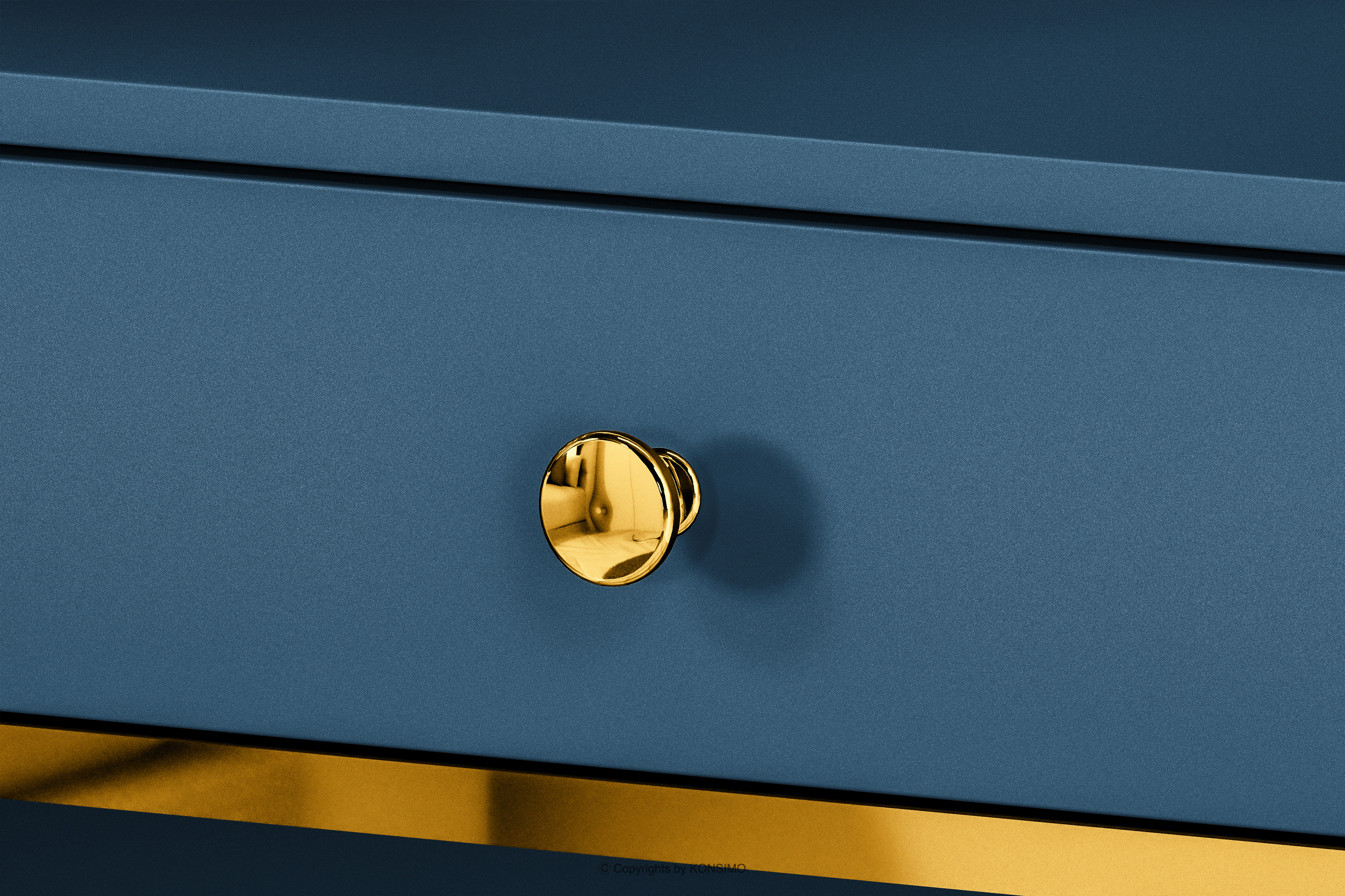 Die laminierte Platte-Front besticht nicht nur durch ihr Aussehen, sondern garantiert auch ein gleichbleibendes Erscheinungsbild über viele Jahre. Goldfarbene Akzente in Form von Griffen und Füßen tragen nicht nur zum Charme bei, sondern schmücken auch das dunkelblaue Massivholz auf zarte Weise. Die solide Konstruktion und sorgfältige Verarbeitung lassen ihn nicht nur seine Funktion erfüllen, sondern auch zum Hauptdarsteller einer eleganten Raumgestaltung werden. Die Vollauszüge in den Schubladen ermöglichen eine mühelose Nutzung, und die erhöhte Belastbarkeit dank des verstärkten Bodens sorgt dafür, dass die Kommode nicht nur beeindruckt, sondern auch praktischen Ansprüchen gerecht wird.