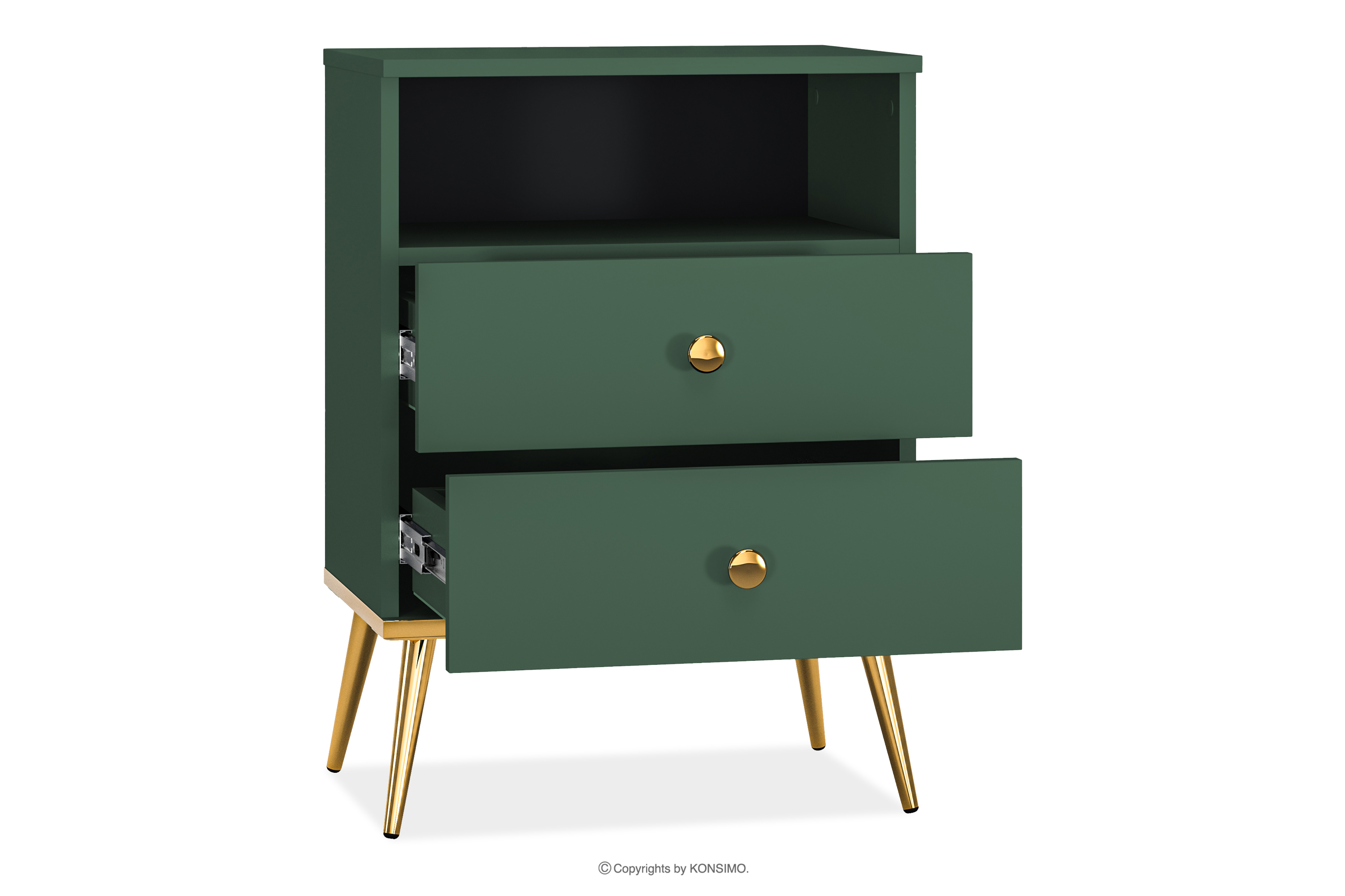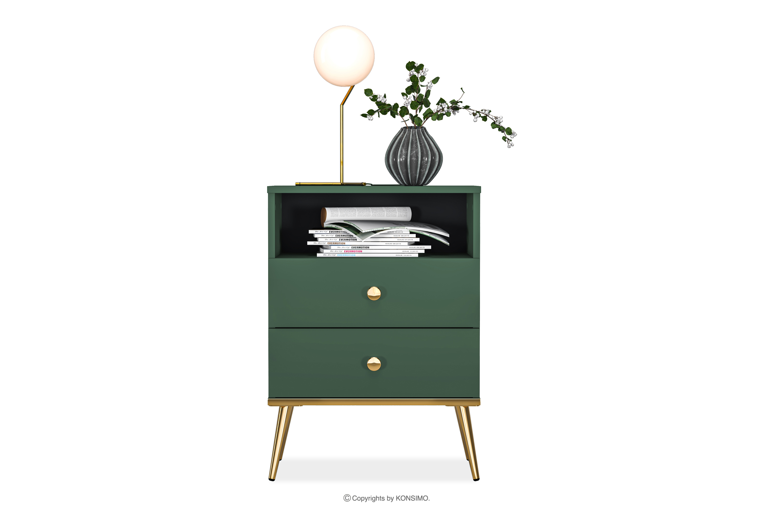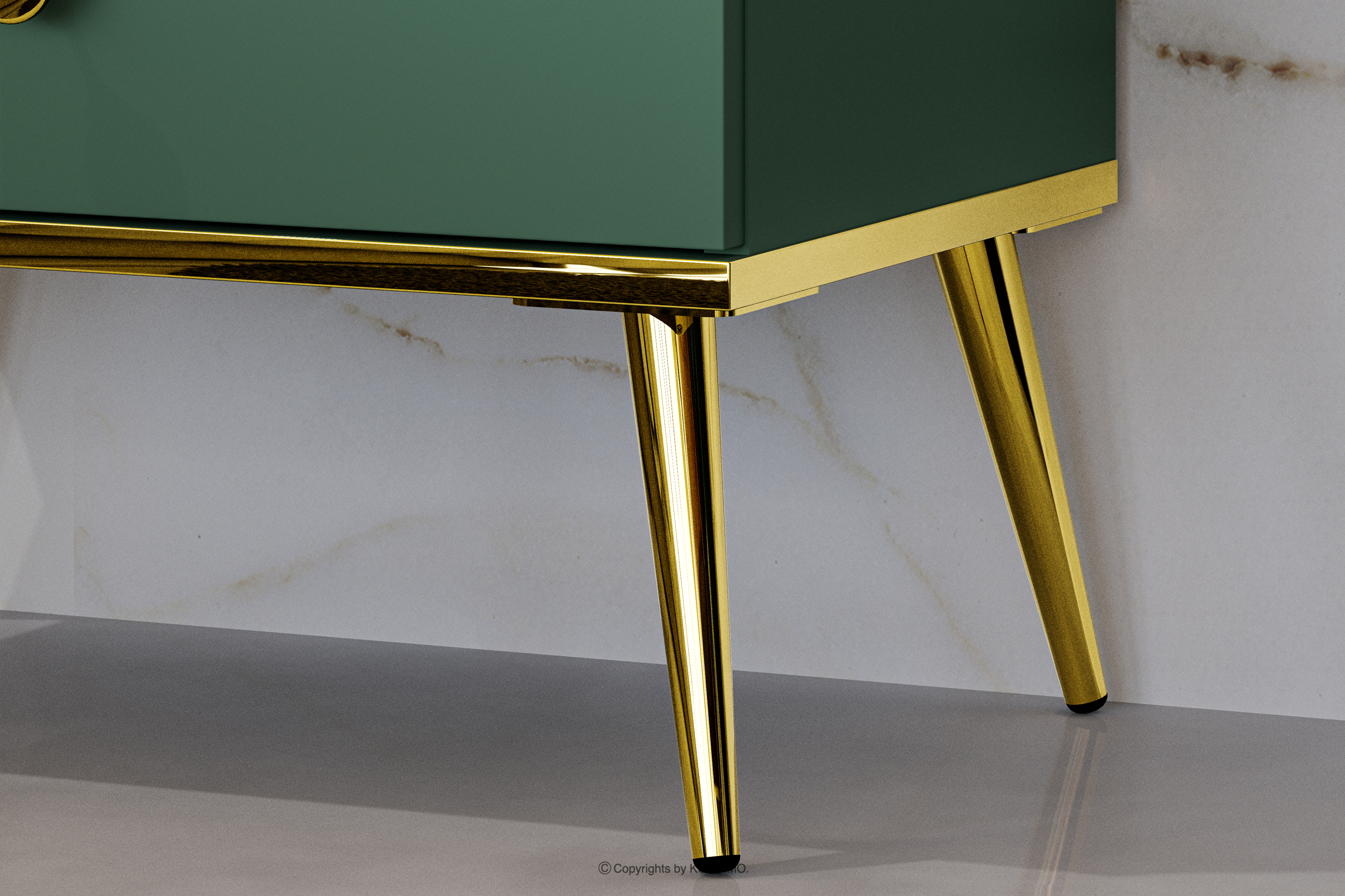 Der grüne Nachttisch auf hohen Beinen bringt einen Hauch von Schick in Ihr Interieur. Der Korpus aus laminierter Platte wurde für Liebhaber des eleganten Stils und der Robustheit entworfen und bietet eine solide Grundlage für jeden Raum. Die goldfarbenen, konischen Beine und Griffe sind wie das Tüpfelchen auf dem i. Und das ist noch nicht alles!