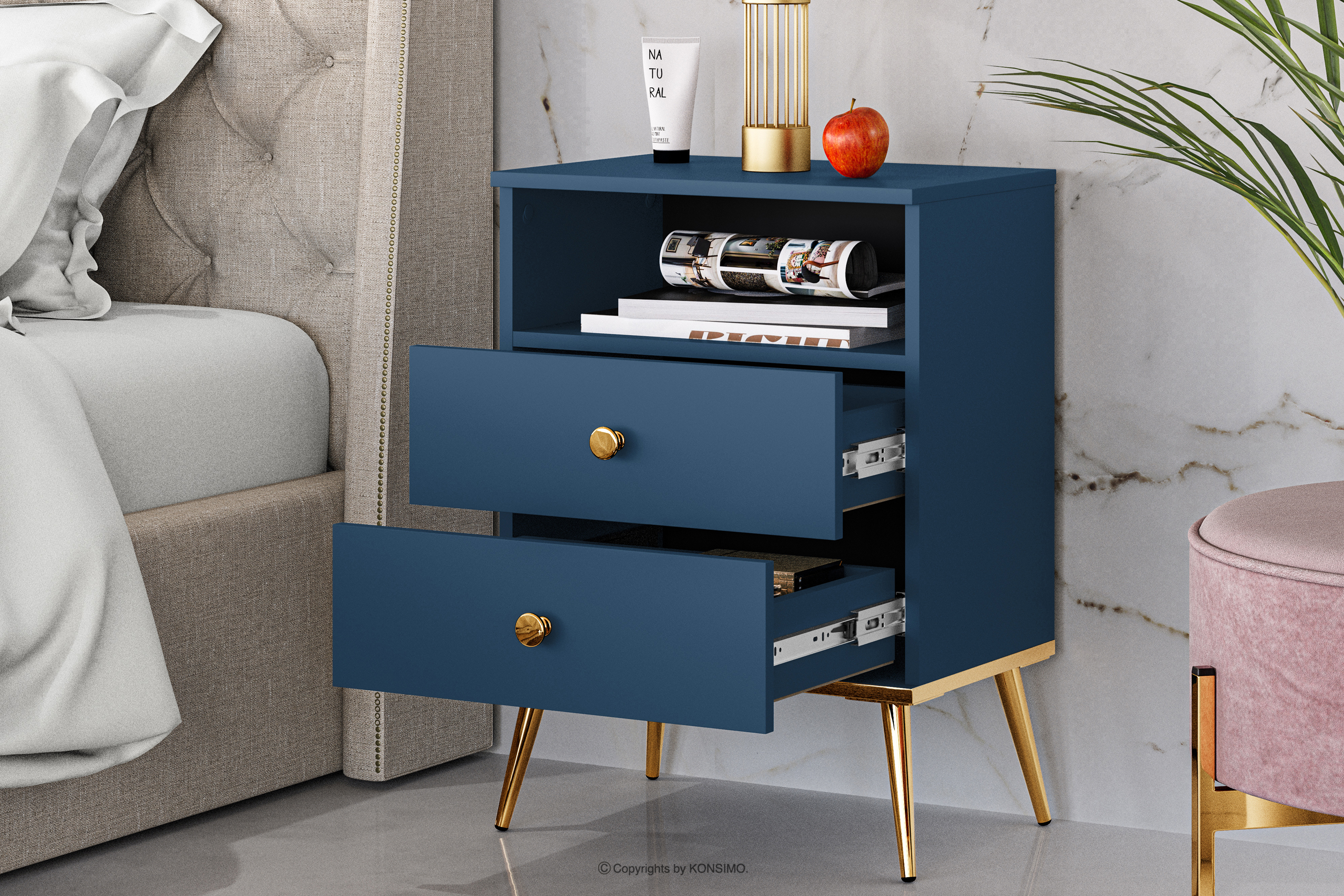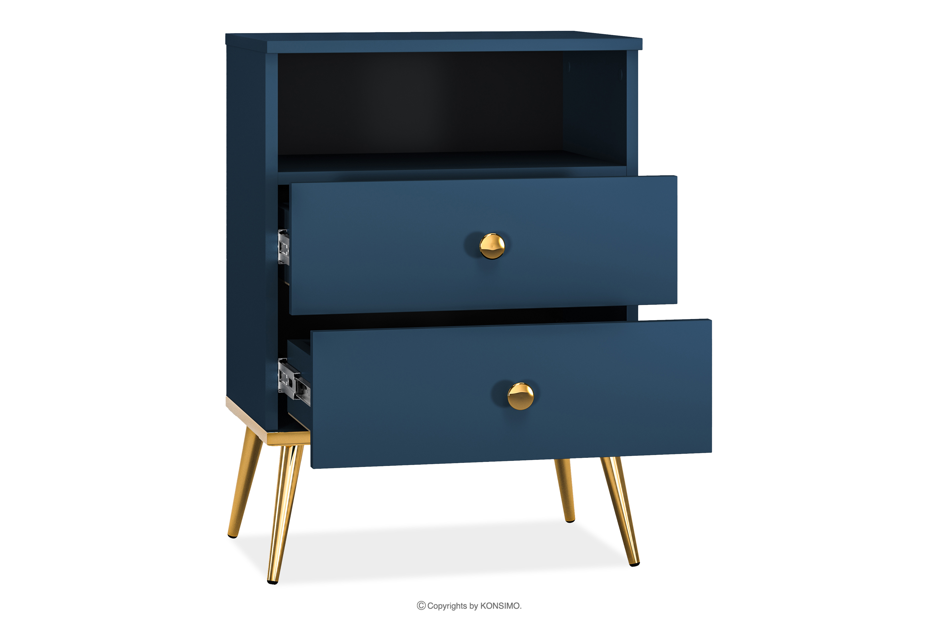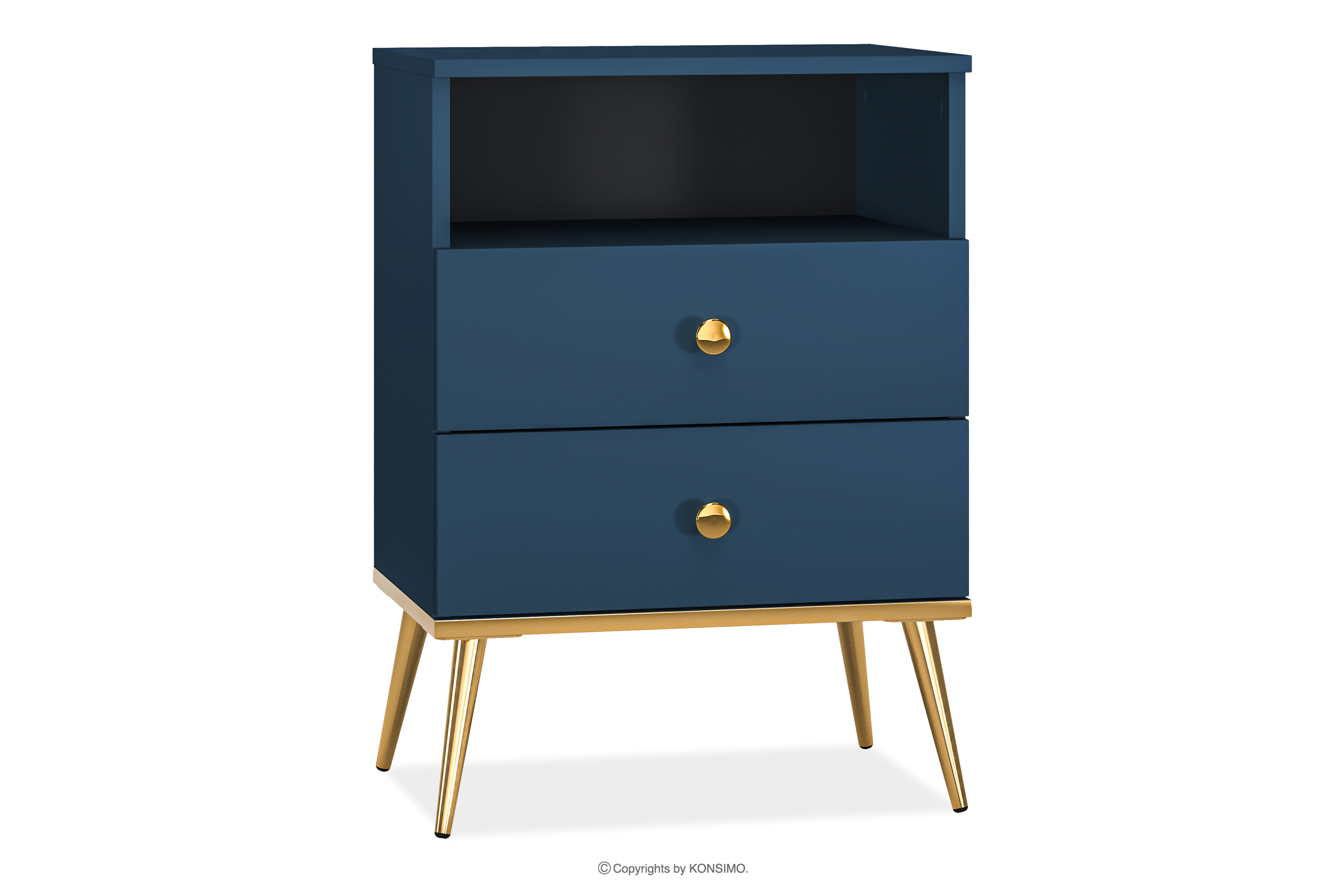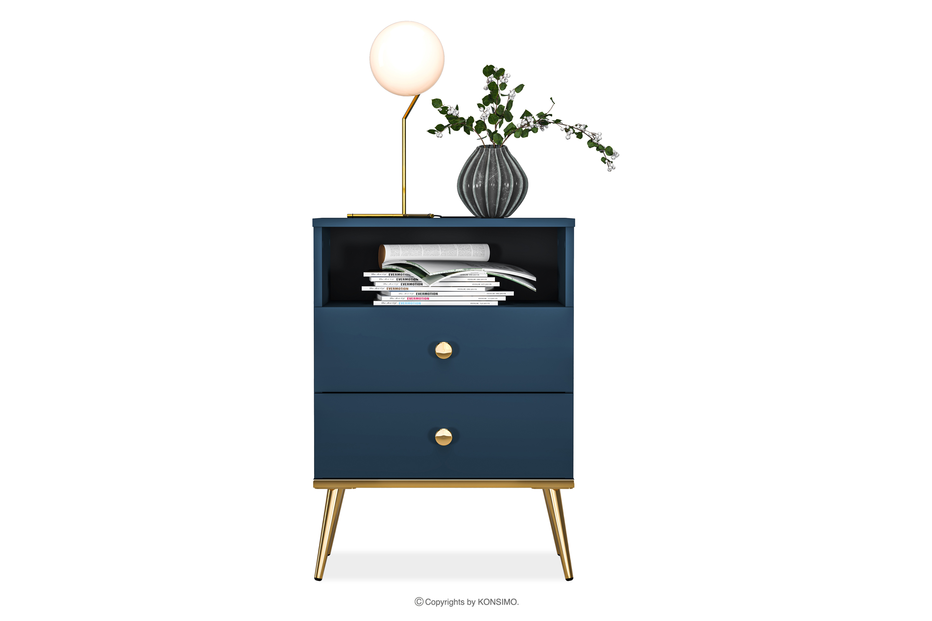 Der marineblaue Nachttisch auf hohen Beinen bringt einen Hauch von Schick in Ihr Interieur. Der Korpus aus laminierter Platte wurde für Liebhaber des eleganten Stils und der Robustheit entworfen und bietet eine solide Grundlage für jeden Raum. Die goldfarbenen, konischen Beine und Griffe sind wie das Tüpfelchen auf dem i. Und das ist noch nicht alles!