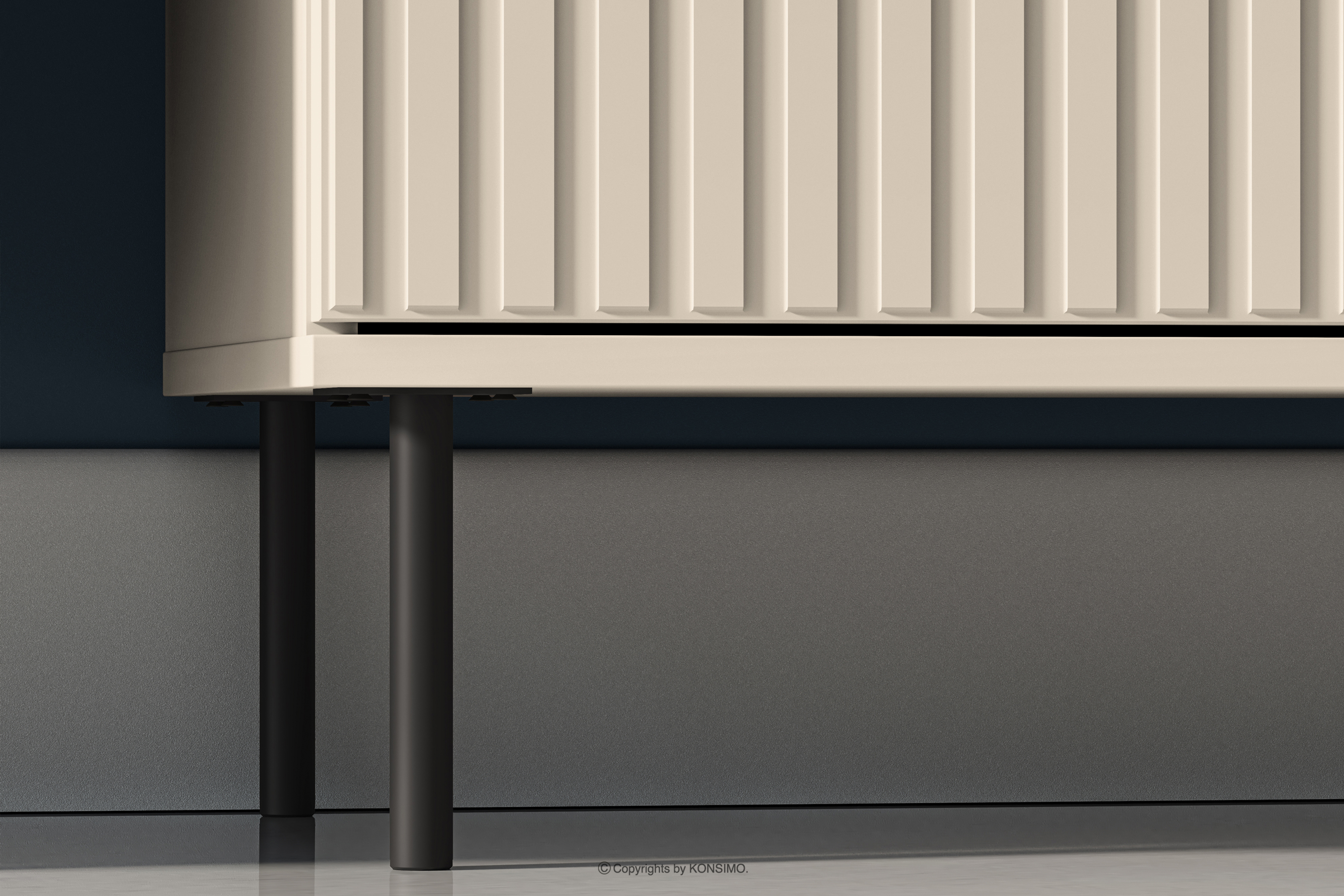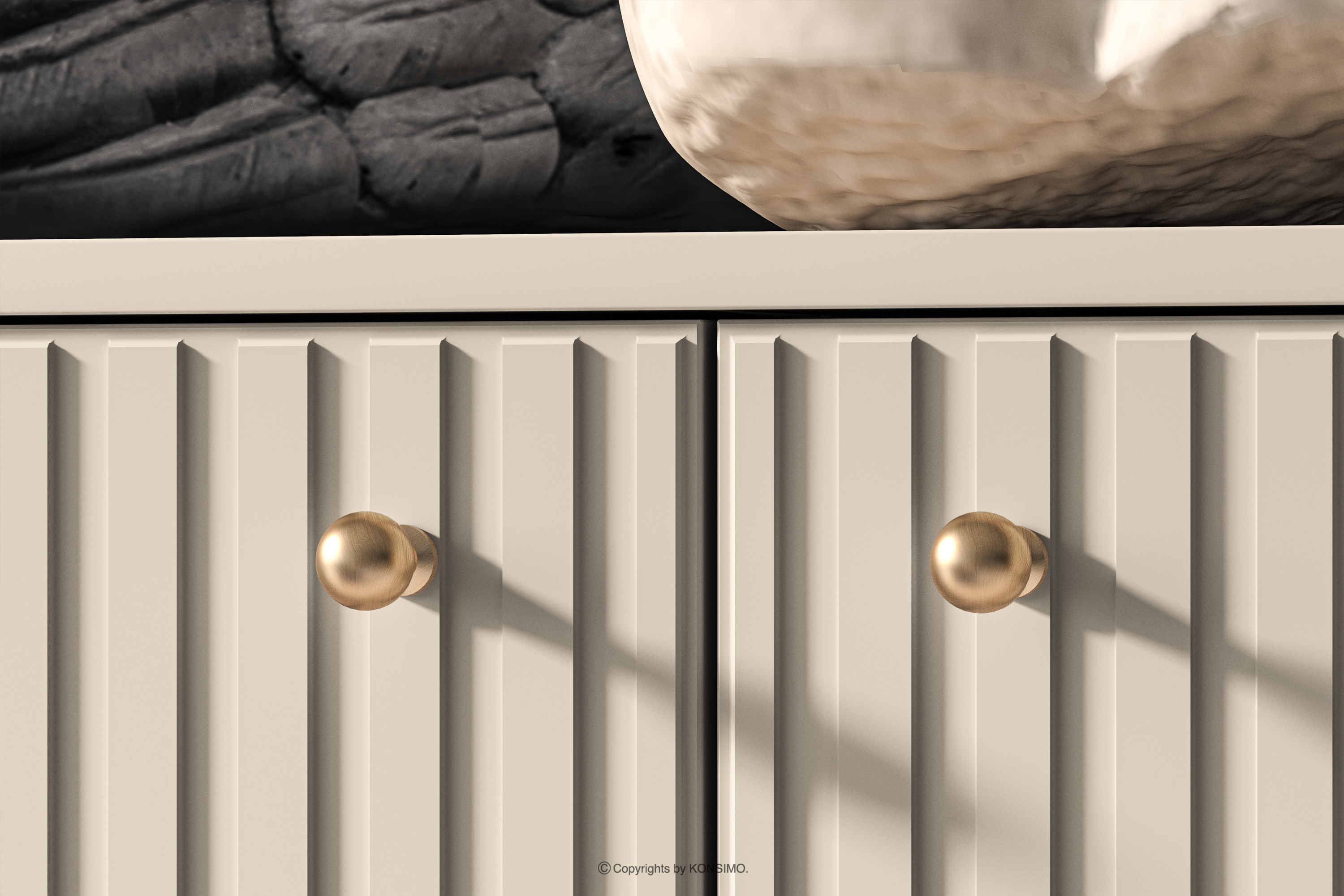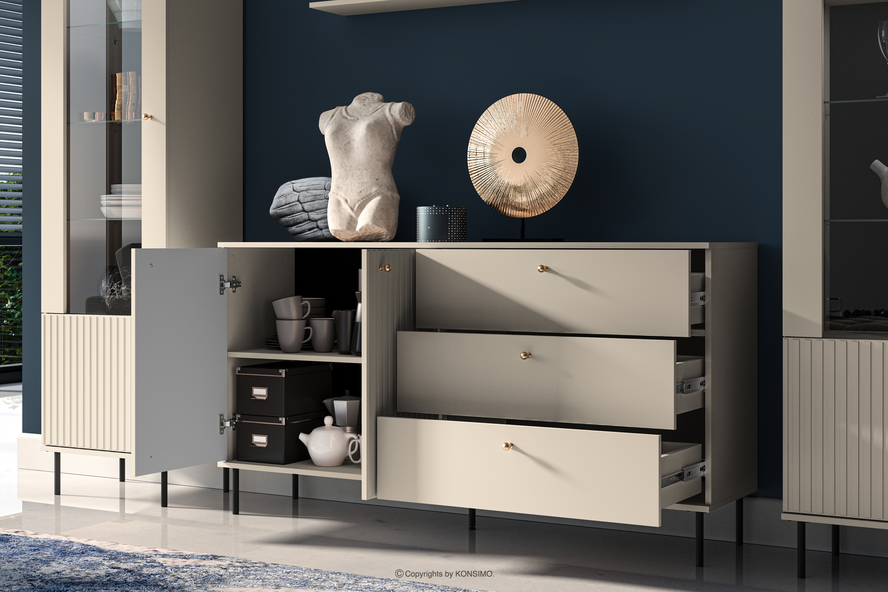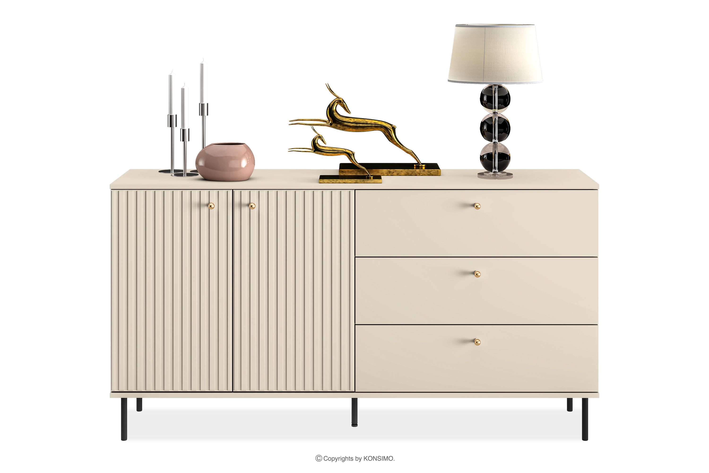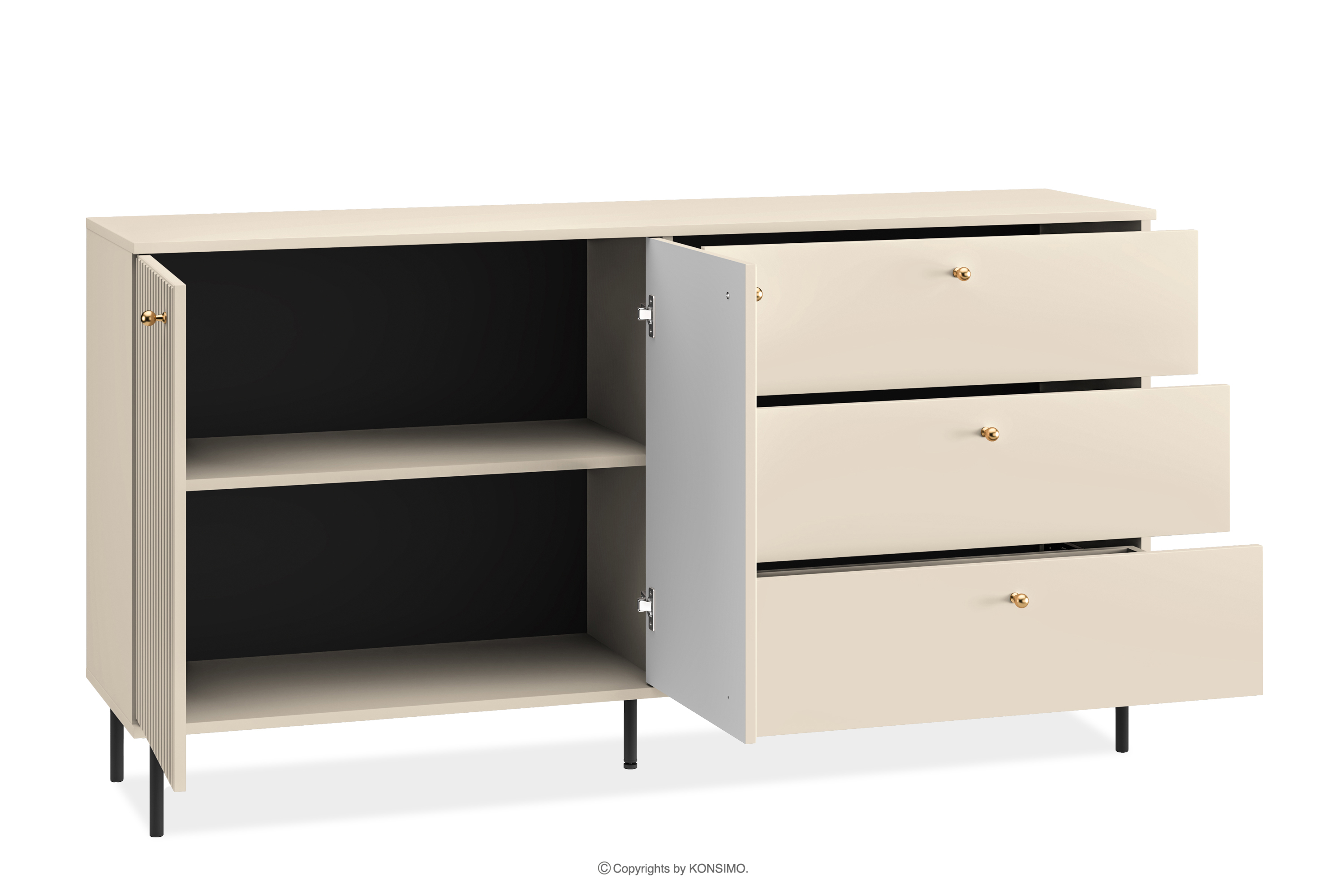 Die elegante breite Kommode in Creme bringt einen Hauch von Eleganz in Ihre Einrichtung. Der Korpus aus laminierter MDF-Platte wurde für Liebhaber von elegantem Stil und Funktionalität entworfen und bietet eine solide Grundlage für das Möbelstück. Die schwarzen Metallbeine und die goldenen Griffe verleihen dem Möbelstück eine dezente Eleganz. Aber das ist noch nicht alles!