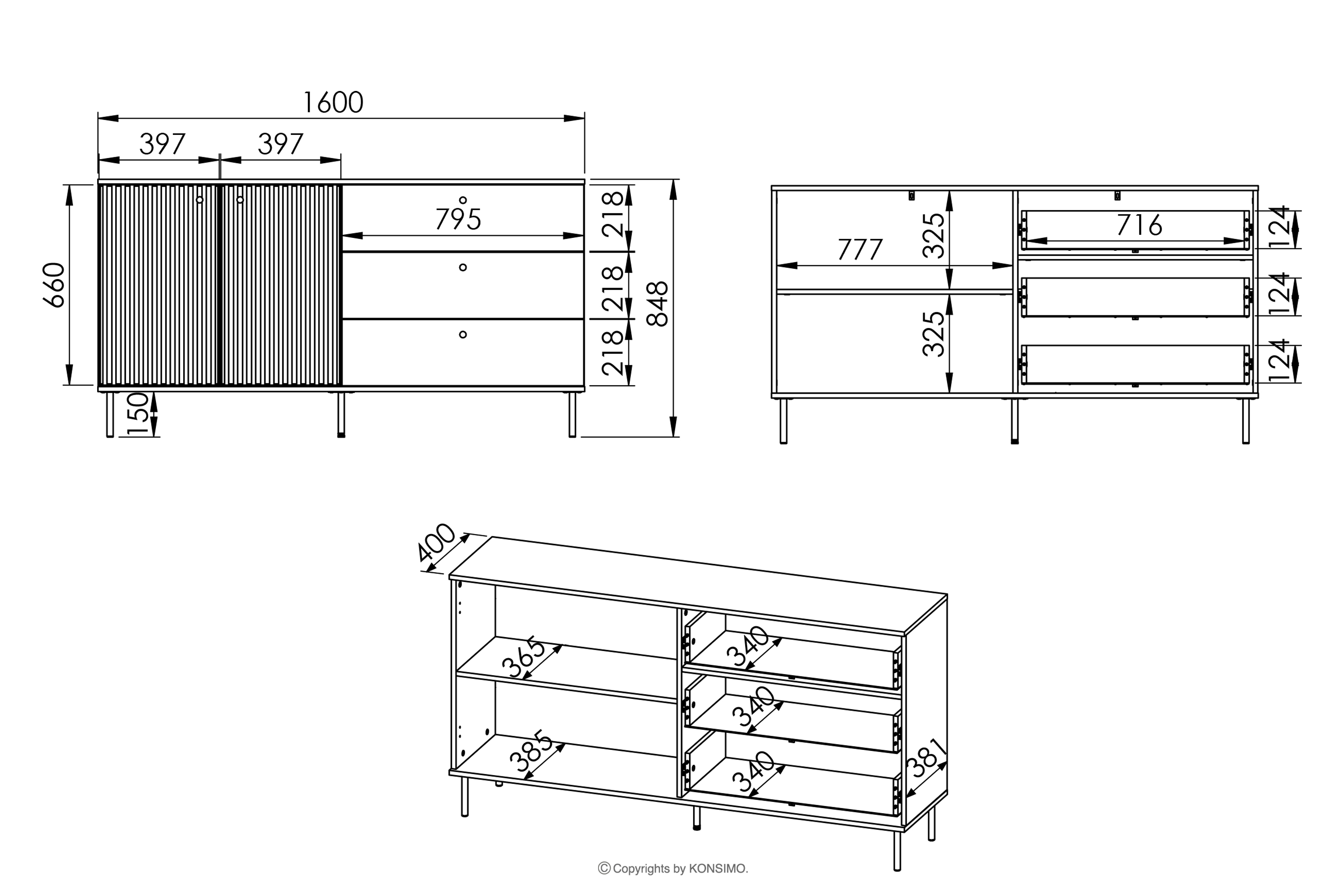 Die laminierte Platte/MDF-Front ist nicht nur ein optischer Blickfang, sondern garantiert auch ein unverändertes Aussehen über viele Jahre. Die schwarzen Metallbeine und die goldenen Griffe tragen nicht nur zum Charme des Möbels bei, sondern zieren auch das Massivholz. Die solide Konstruktion und die sorgfältige Verarbeitung lassen ihn nicht nur seine Funktion erfüllen, sondern auch zum Hauptdarsteller einer eleganten Einrichtung in der Wohnung werden. Die Vollauszüge in der Schublade sorgen für eine problemlose Handhabung, und die erhöhte Tragkraft durch die Verstärkung des Bodens garantiert, dass sie den praktischen Anforderungen gerecht wird.