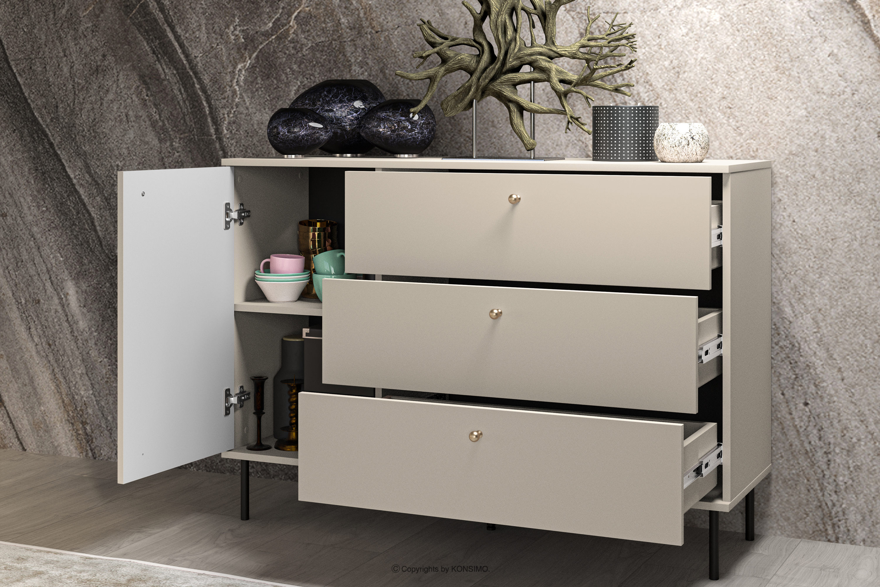 Die elegante cremefarbene Kommode bringt einen Hauch von Eleganz in Ihre Einrichtung. Der Korpus aus laminierter MDF-Platte wurde für Liebhaber von elegantem Stil und Funktionalität entworfen und bietet eine solide Grundlage für das Möbelstück. Die schwarzen Metallbeine und die goldenen Griffe verleihen dem Möbelstück eine dezente Eleganz. Aber das ist noch nicht alles!