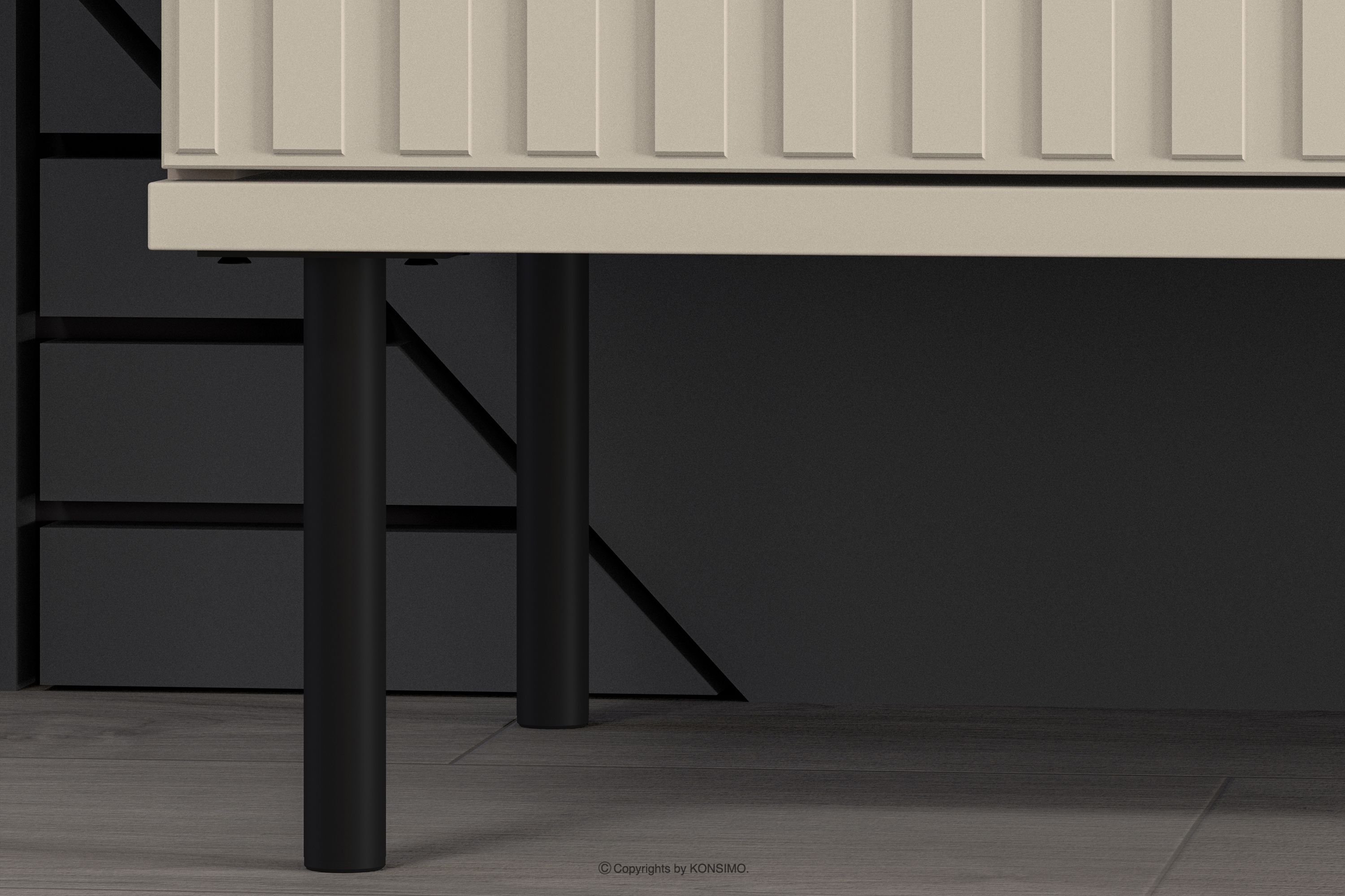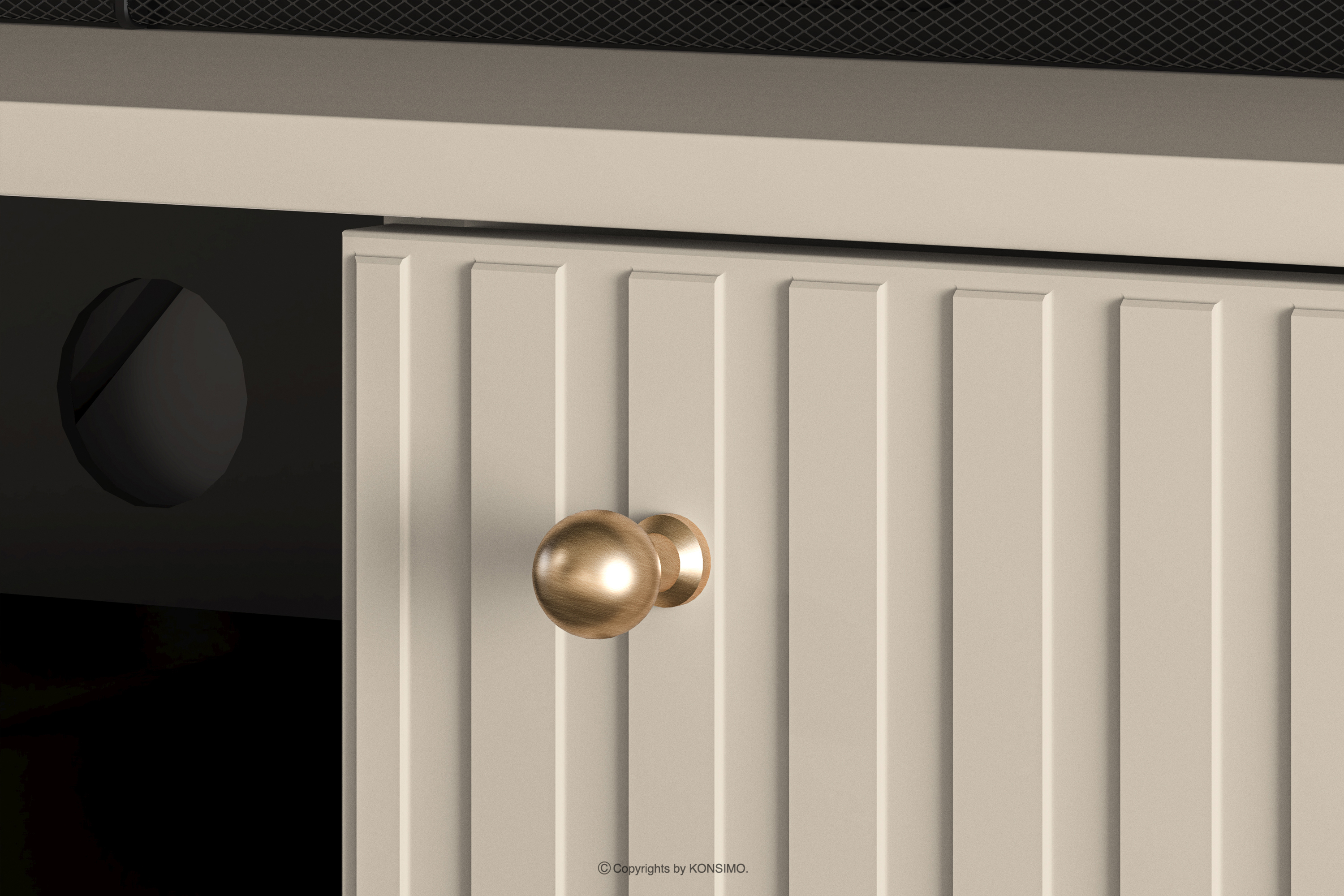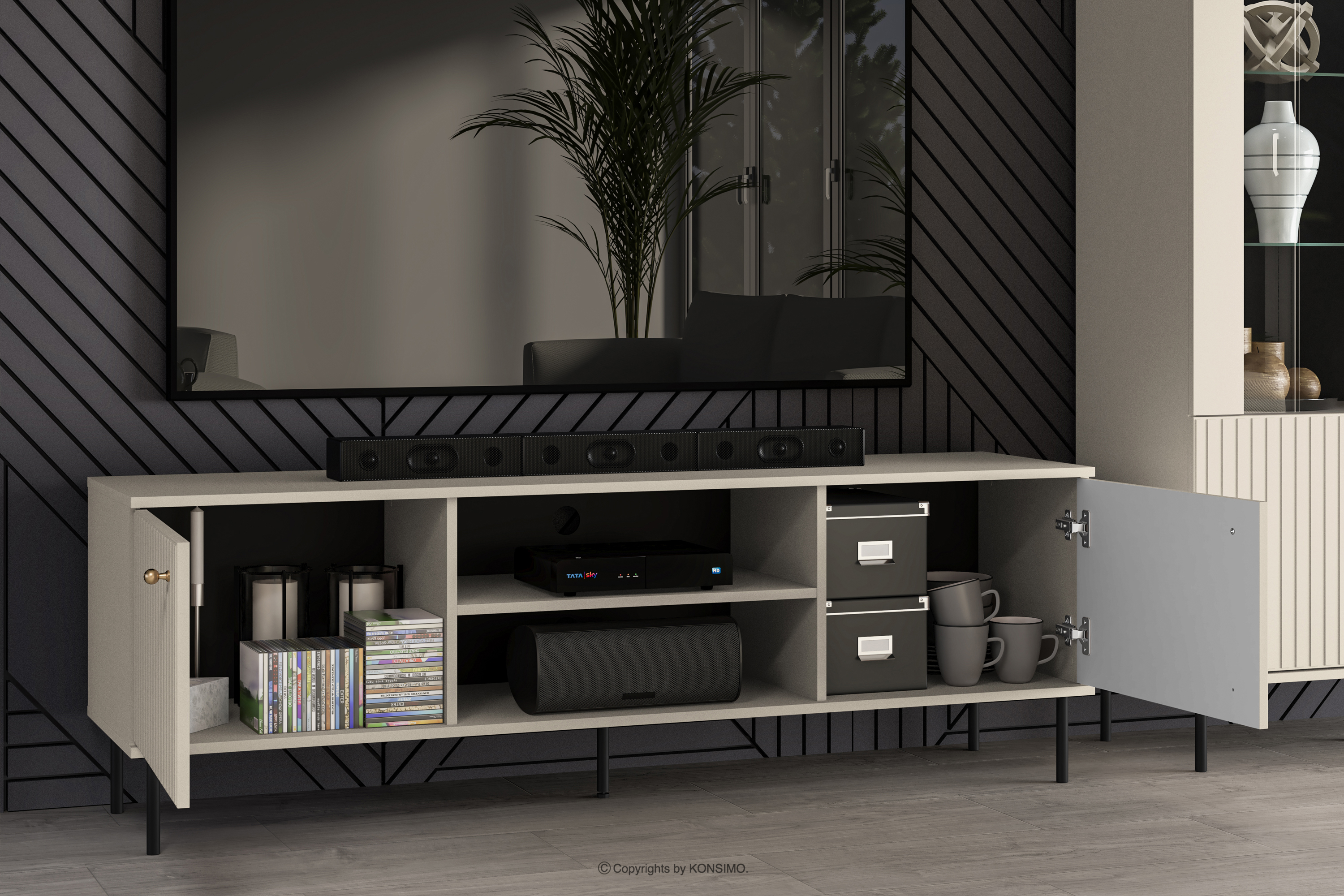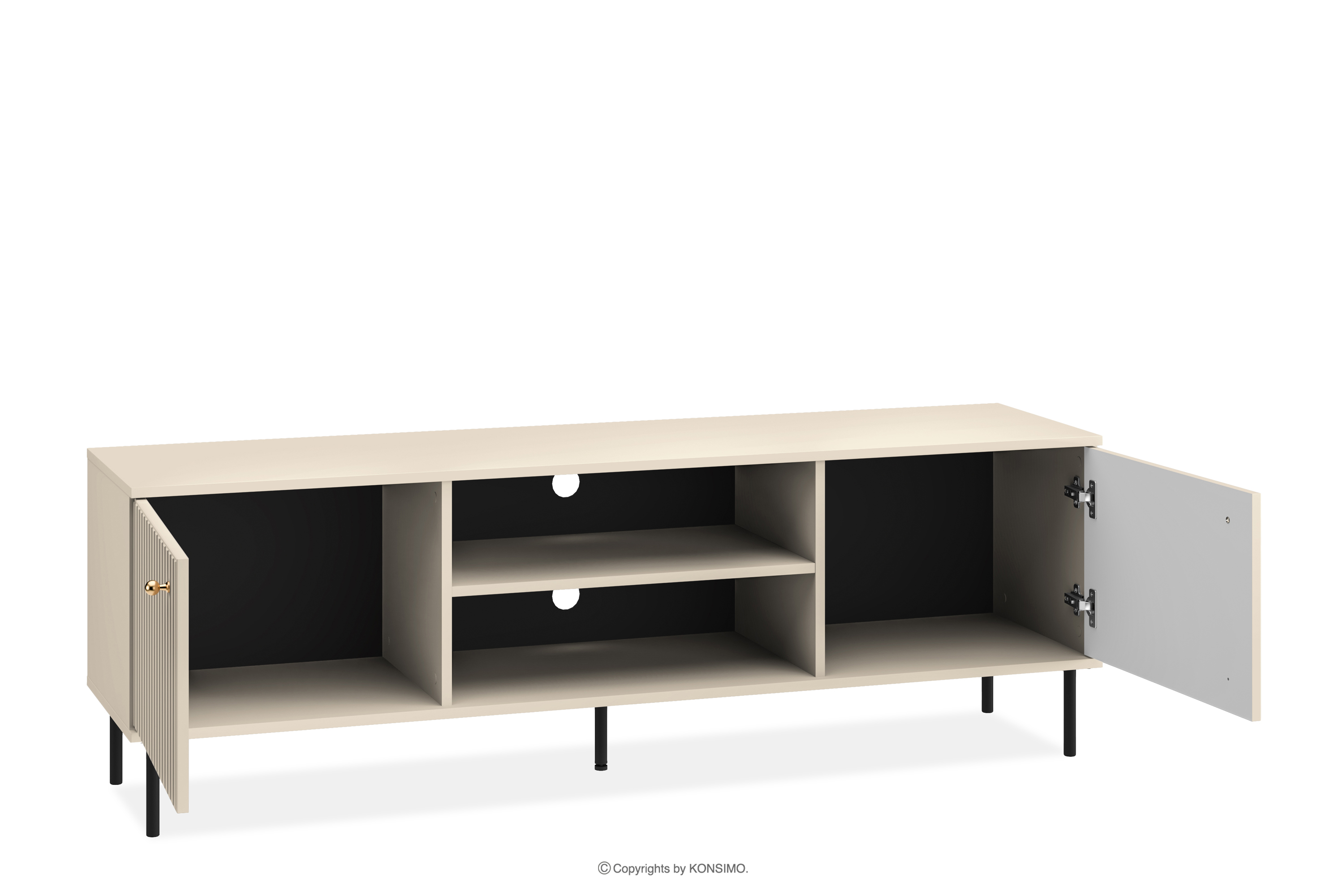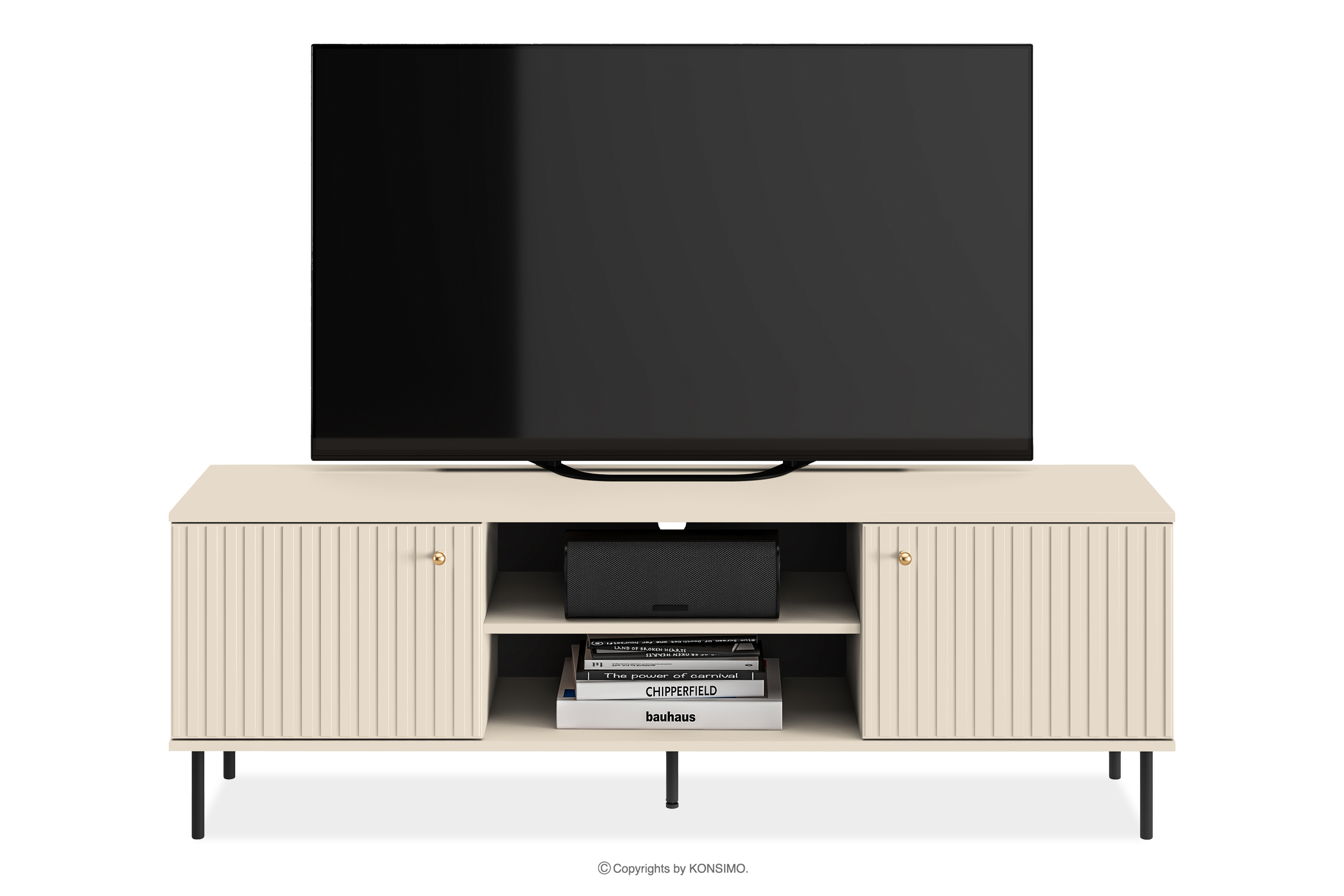 Der elegante, cremefarbene RTV-Schrank bringt einen Hauch von Eleganz in Ihre Einrichtung. Der Korpus aus laminierter MDF-Platte wurde für Liebhaber von elegantem Stil und Funktionalität entworfen und bietet eine solide Grundlage für das Möbelstück. Die schwarzen Metallbeine und die goldenen Griffe verleihen dem Möbelstück eine subtile Eleganz. Aber das ist noch nicht alles!