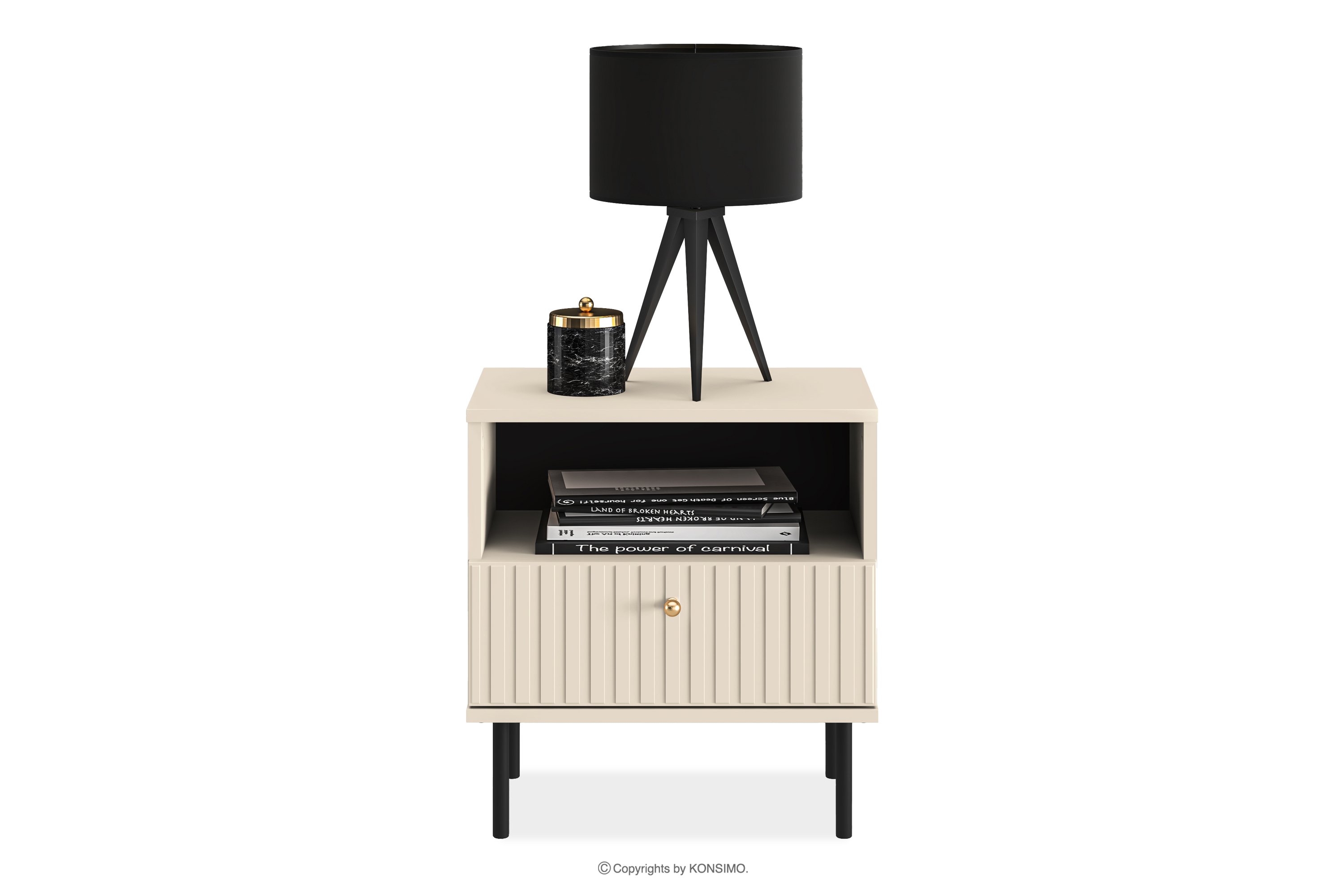 Der elegante cremefarbene Nachttisch verleiht Ihrer Einrichtung einen Hauch von Eleganz. Der Korpus aus laminierter Platte/MDF wurde für Liebhaber von elegantem Stil und Funktionalität entworfen und bietet eine solide Grundlage für das Möbelstück. Die schwarzen Metallbeine und die goldenen Griffe verleihen dem Möbelstück eine dezente Eleganz. Aber das ist noch nicht alles!