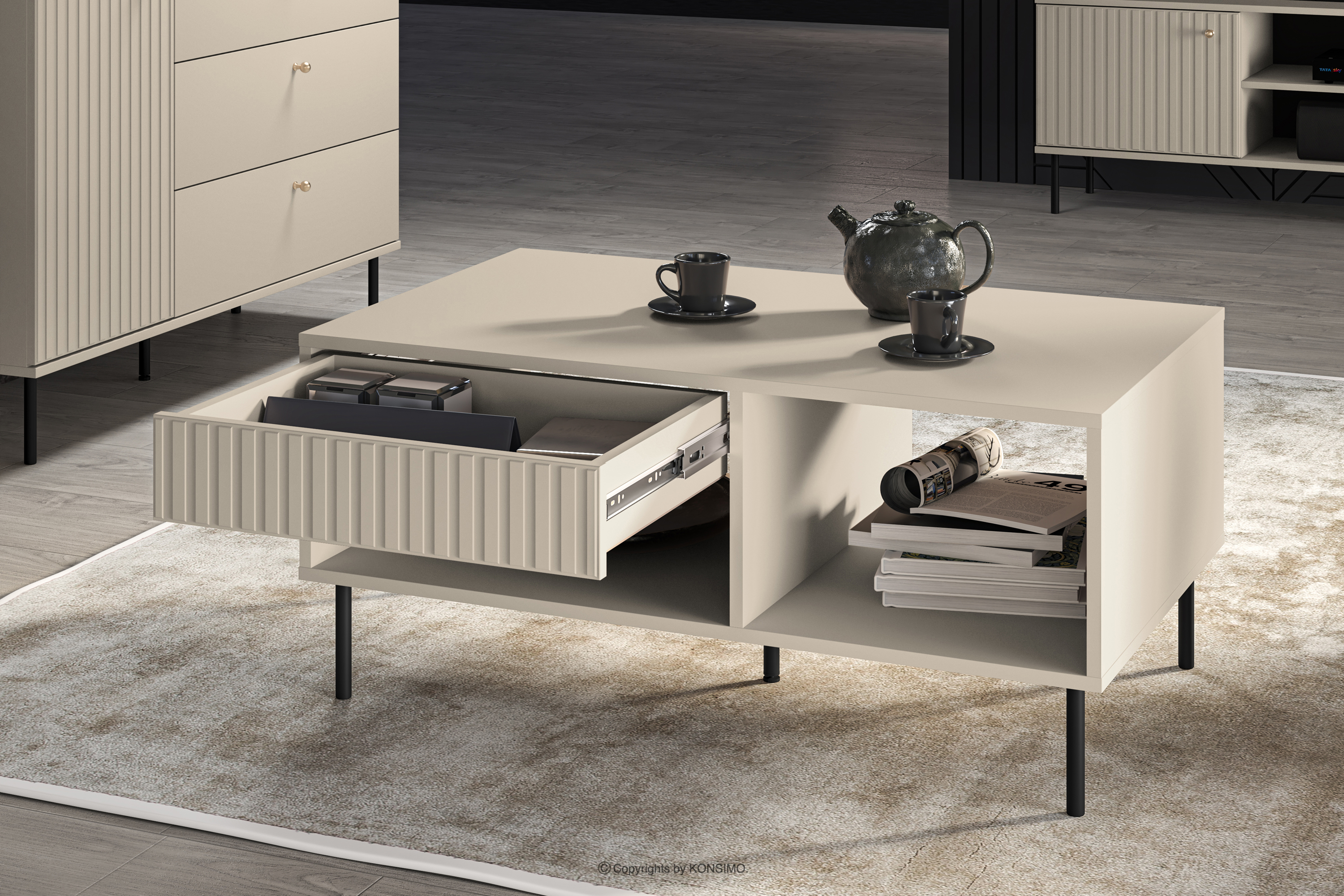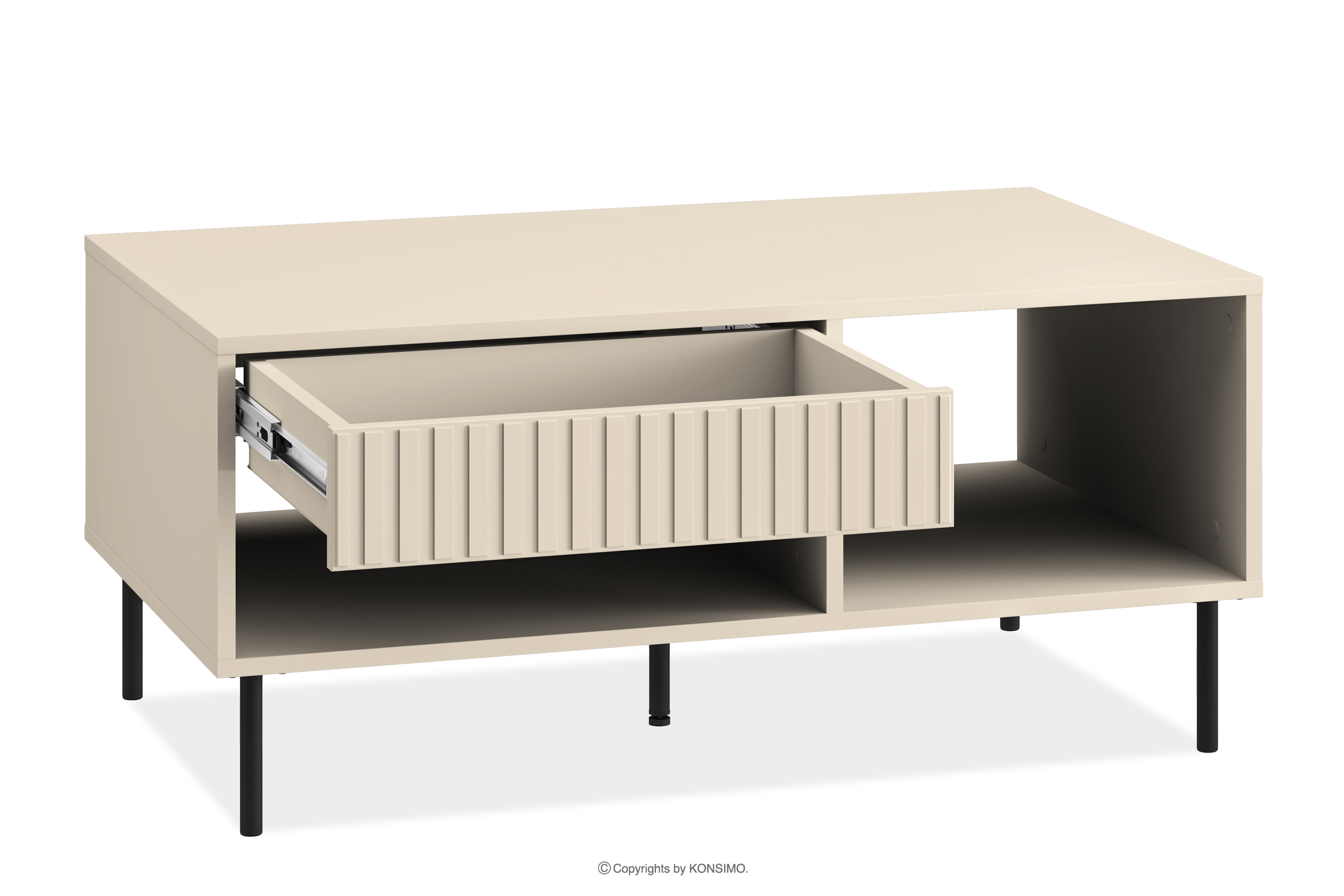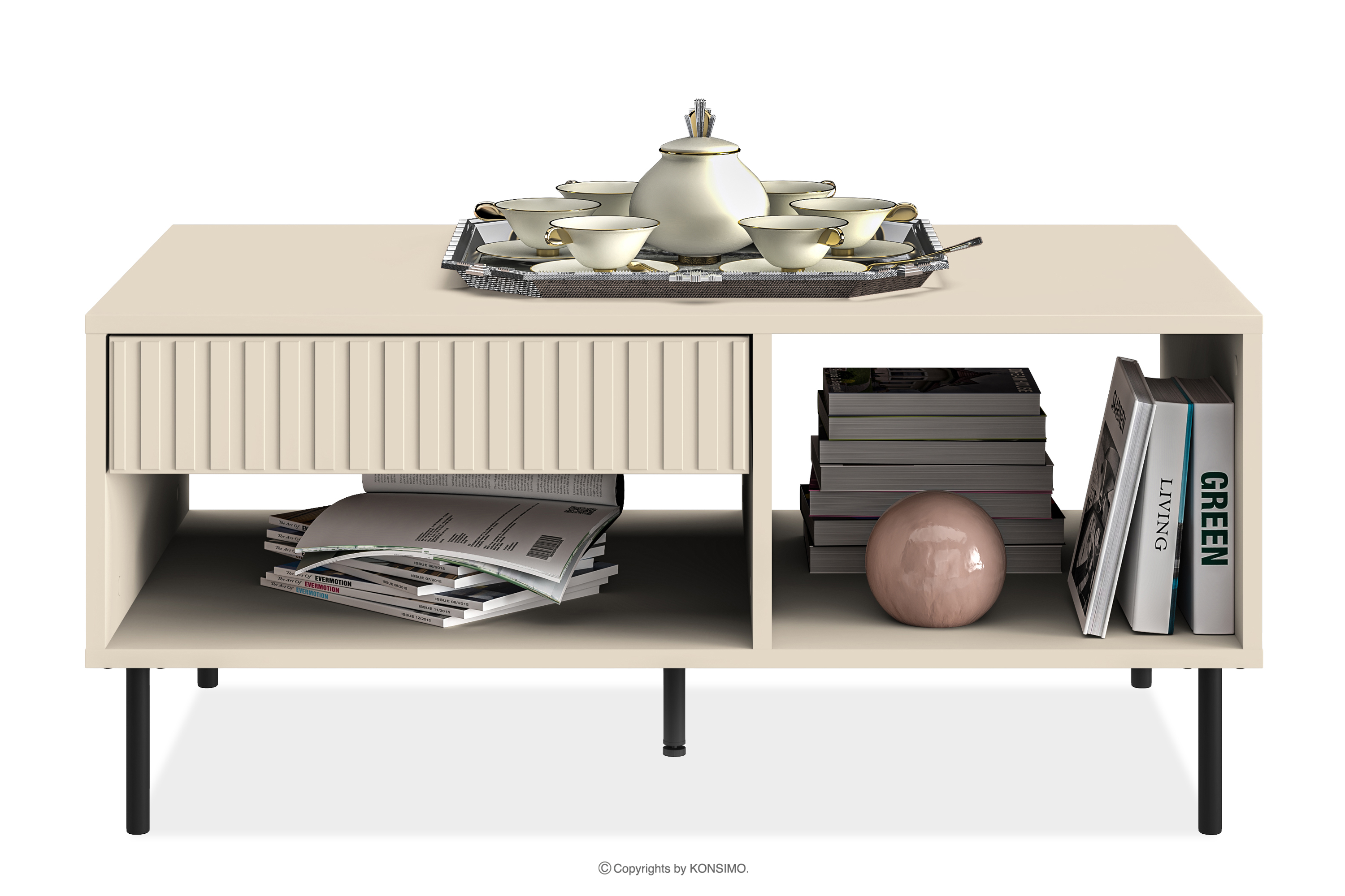 Der elegante cremefarbene Couchtisch bringt einen Hauch von Eleganz in Ihr Interieur. Der Korpus aus laminierter MDF-Platte ist für Liebhaber von elegantem Stil und Funktionalität konzipiert und bietet eine solide Grundlage für das Möbelstück. Die schwarzen Metallbeine und die goldenen Griffe verleihen dem Möbelstück eine dezente Eleganz. Aber das ist noch nicht alles!