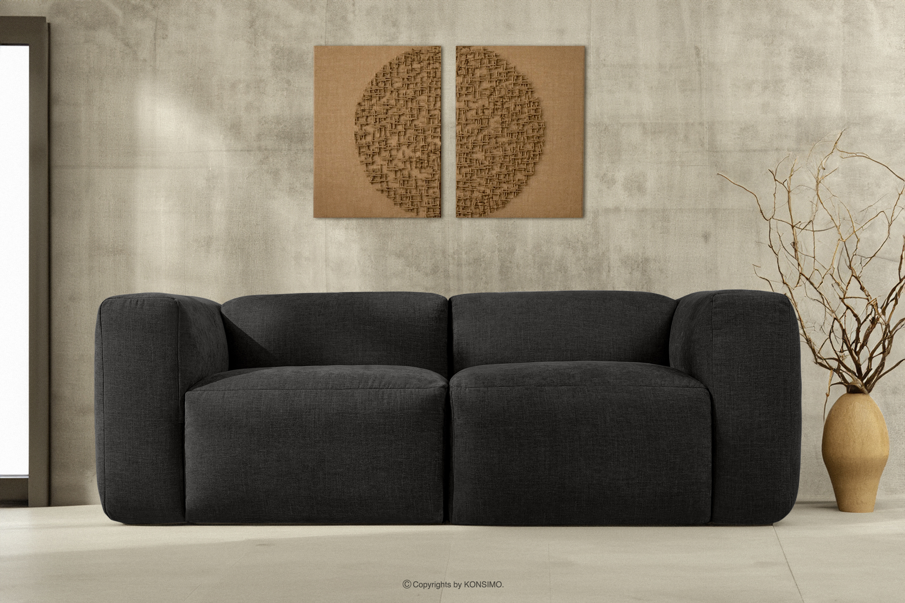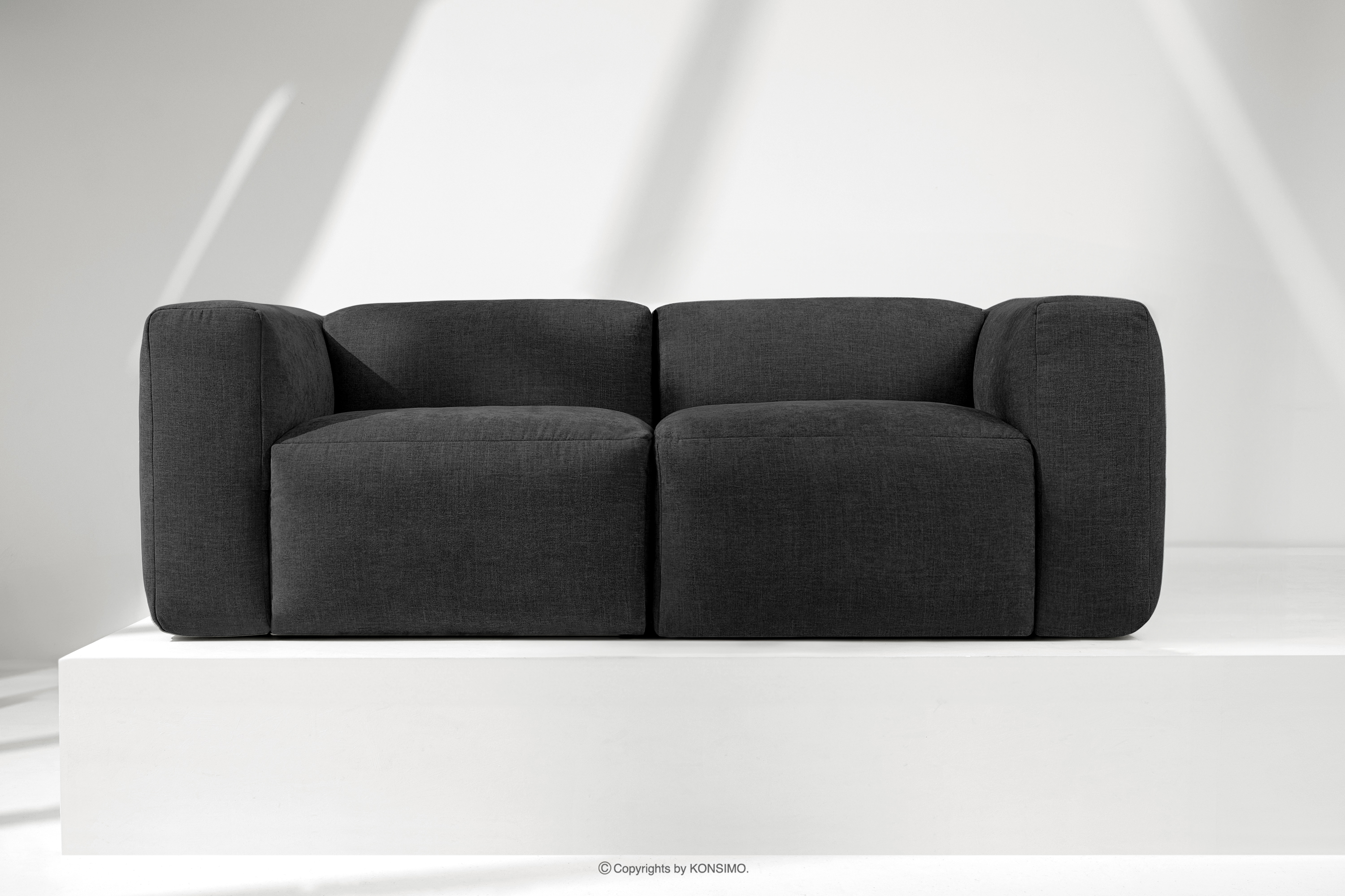 Das modulare Zweisitzer-Sofa Boho aus graphitfarbenem Gewebestoff wird mit Sicherheit zum Mittelpunkt jedes Wohnzimmers. Das Gestell ist aus langlebigem Kiefern- und Buchenholz gefertigt, das nicht nur Robustheit, sondern auch Ästhetik garantiert. Darüber hinaus erhöht die Verwendung von langlebigen Span- und Faserplatten die Stabilität und Haltbarkeit des Möbels. So bleiben sie auch bei intensiver Nutzung formstabil und widerstandsfähig gegen alle Herausforderungen des täglichen Lebens.