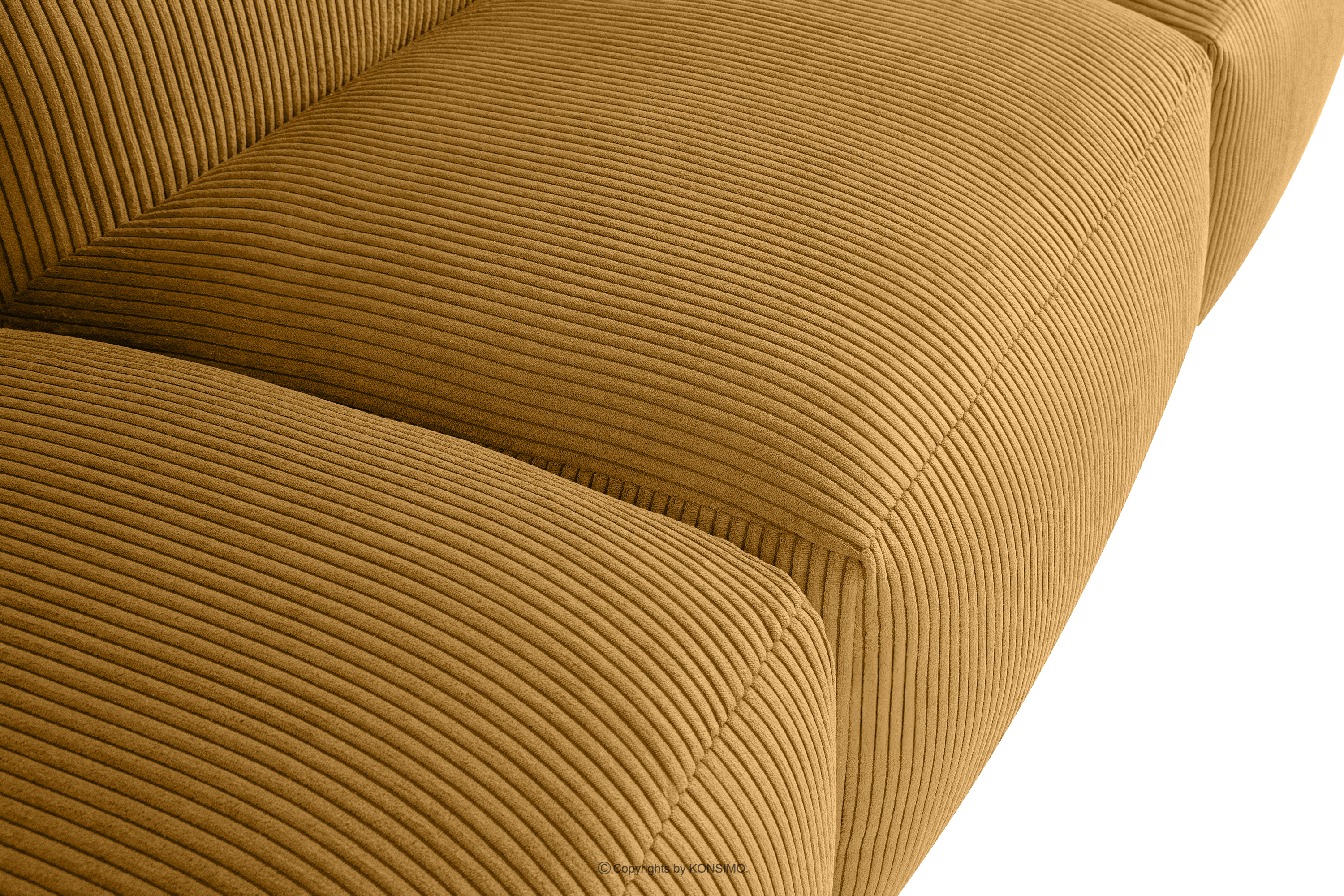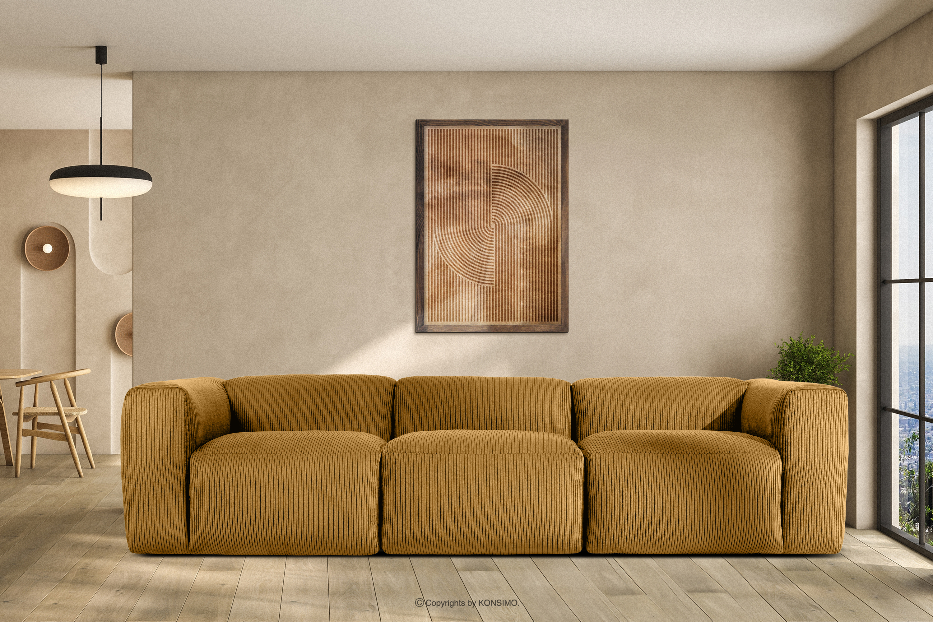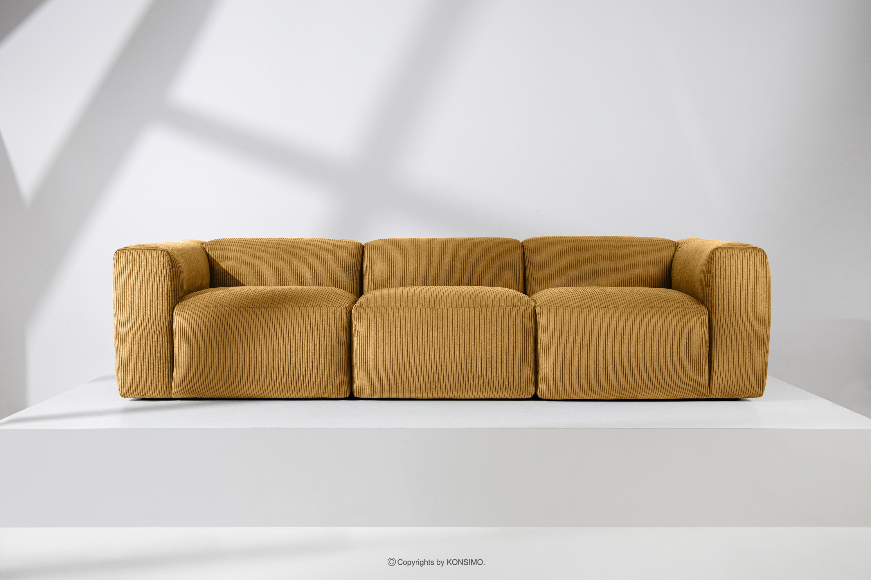 Das 3-Modul-Sofa aus gelbem Kordstoff wird mit Sicherheit zum Mittelpunkt eines jeden Wohnzimmers. Das Gestell ist aus langlebigem Kiefern- und Buchenholz gefertigt, das nicht nur für Stabilität, sondern auch für Ästhetik sorgt. Darüber hinaus erhöht die Verwendung von langlebigen Span- und Faserplatten die Stabilität und Langlebigkeit des Möbels. So bleiben sie auch bei intensiver Nutzung formstabil und widerstandsfähig gegen alle Herausforderungen des täglichen Lebens.