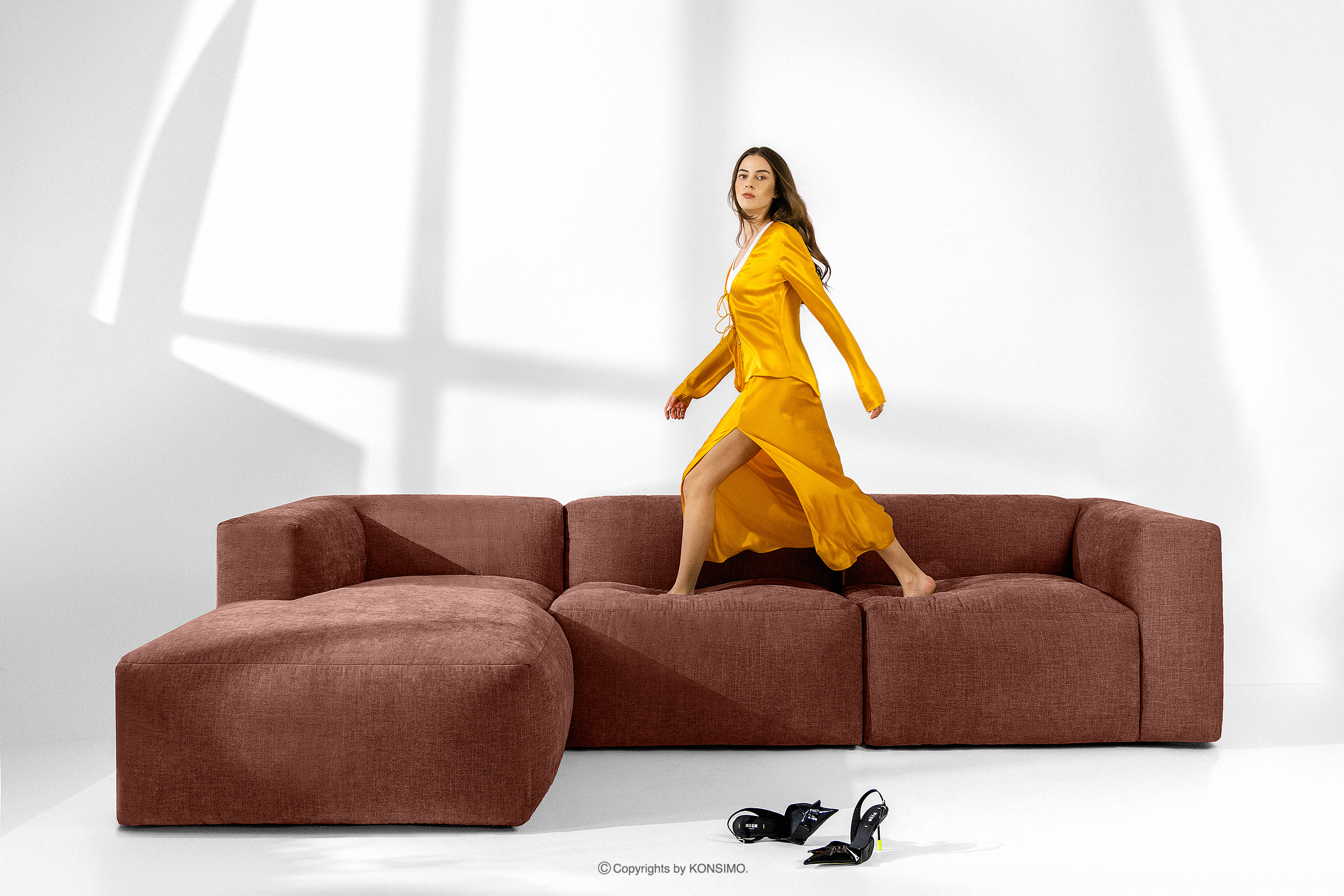 Das modulare Sofa 3 boho mit orangefarbenem Gewebestoff wird mit Sicherheit das Herzstück jedes Wohnzimmers. Das Gestell ist aus langlebigem Kiefern- und Buchenholz gefertigt, das nicht nur Stabilität, sondern auch Ästhetik garantiert. Darüber hinaus erhöht die Verwendung von langlebigen Span- und Faserplatten die Stabilität und Langlebigkeit des Möbels. So bleiben sie auch bei intensiver Nutzung formstabil und widerstandsfähig gegen alle Herausforderungen des täglichen Lebens.