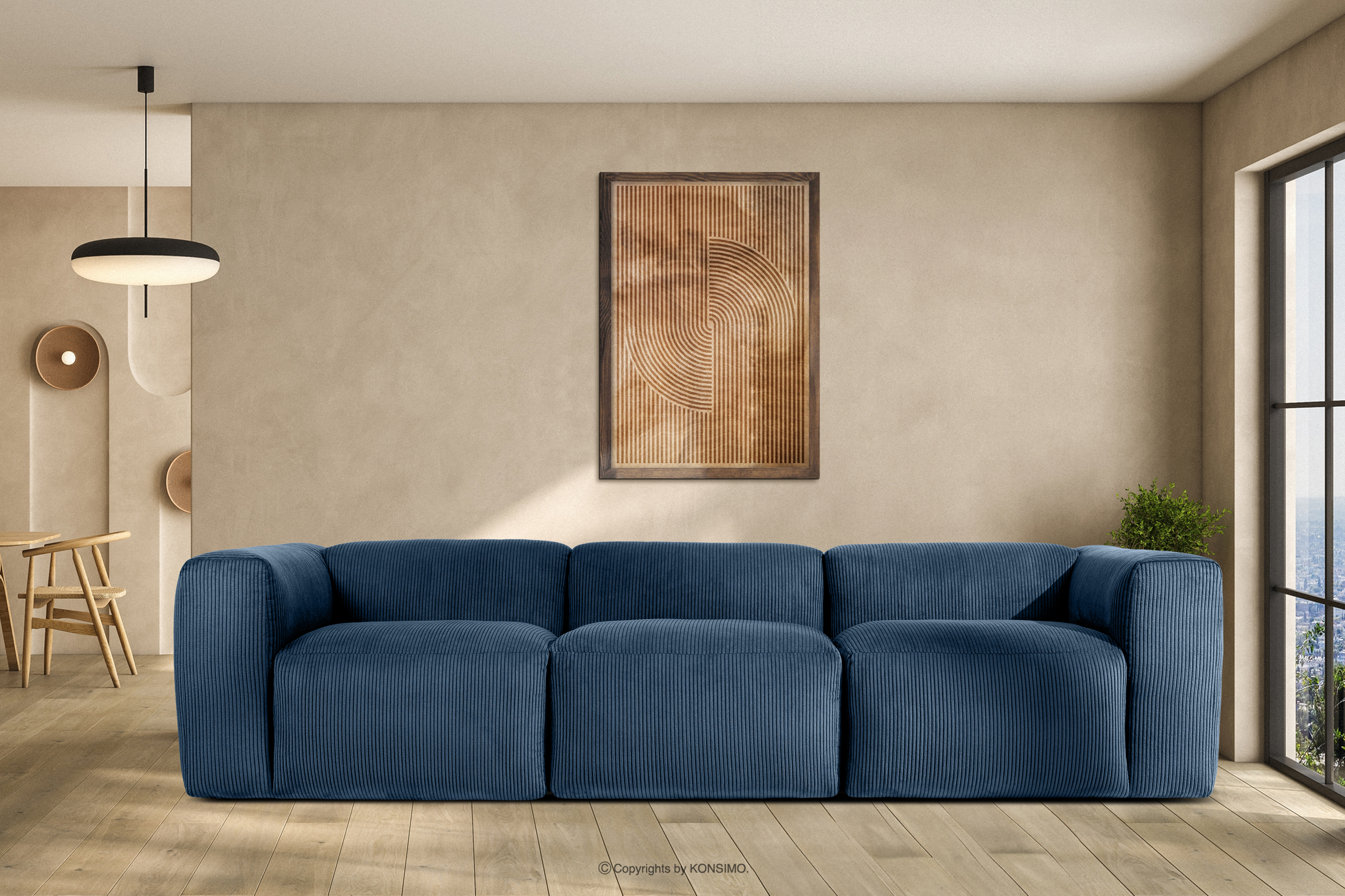 Das 3-Modul-Sofa aus marineblauem Kordstoff wird mit Sicherheit zum Mittelpunkt jedes Wohnzimmers. Das Gestell ist aus langlebigem Kiefern- und Buchenholz gefertigt, das nicht nur Stabilität, sondern auch Ästhetik garantiert. Darüber hinaus erhöht die Verwendung von langlebigen Span- und Faserplatten die Stabilität und Langlebigkeit des Möbels. So bleiben sie auch bei intensiver Nutzung formstabil und widerstandsfähig gegen alle Herausforderungen des täglichen Lebens.