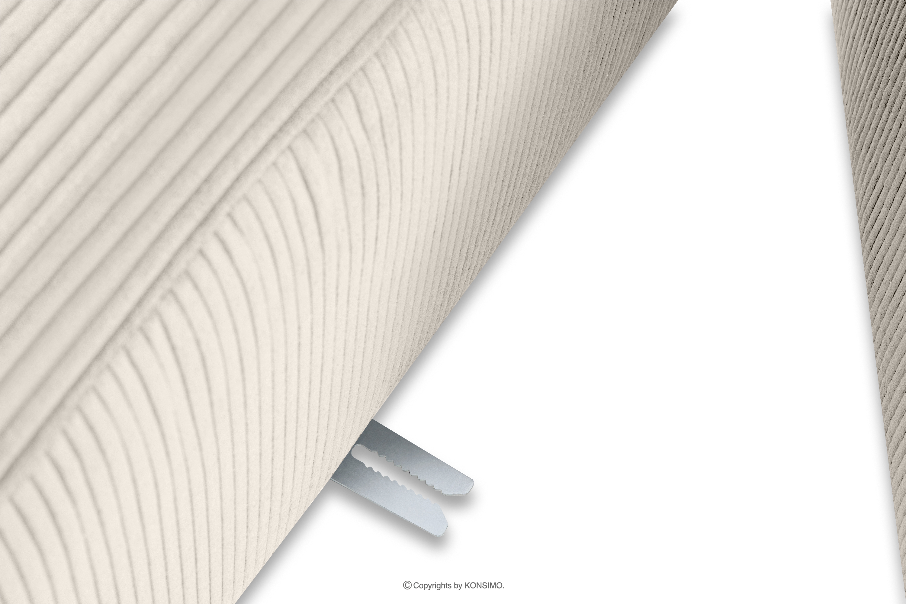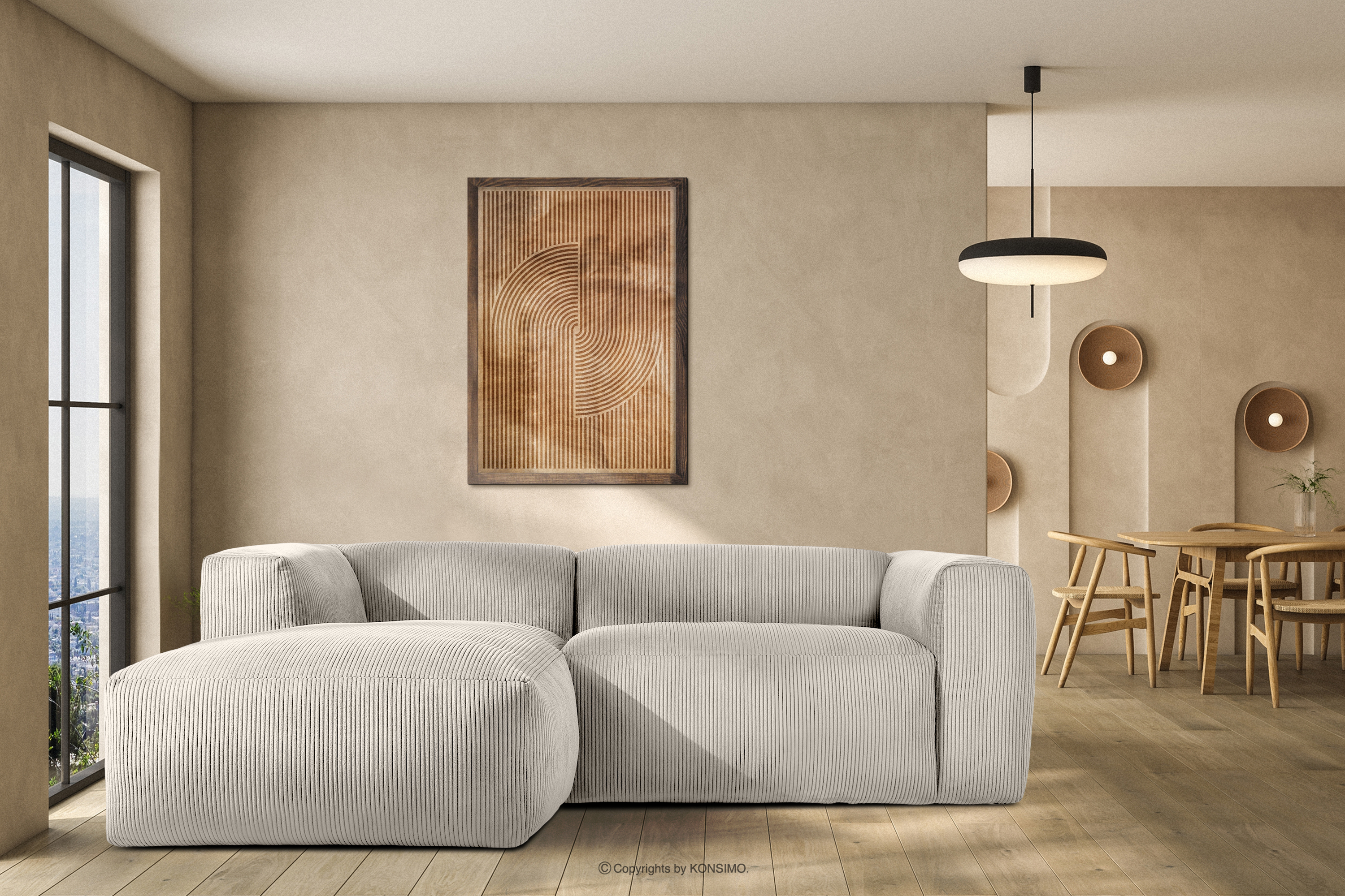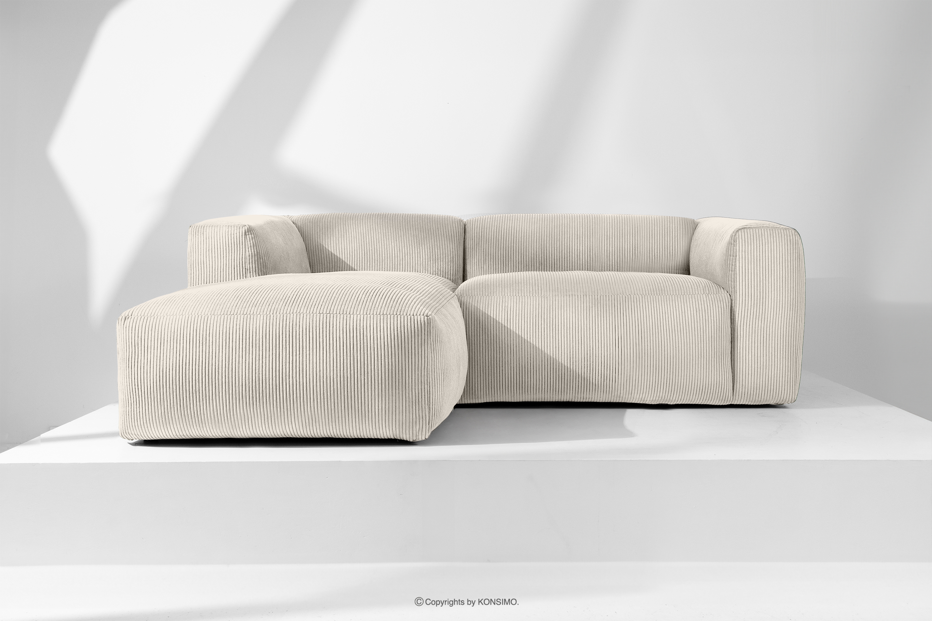 Das modulare Ecksofa aus cremefarbenem Kordstoff links wird mit Sicherheit zum Mittelpunkt jedes Wohnzimmers. Das Gestell ist aus langlebigem Kiefern- und Buchenholz gefertigt, das nicht nur Robustheit, sondern auch Ästhetik gewährleistet. Darüber hinaus erhöht die Verwendung von langlebigen Span- und Faserplatten die Stabilität und Langlebigkeit des Möbels. So bleiben sie auch bei intensiver Nutzung formstabil und widerstandsfähig gegen alle Herausforderungen des täglichen Lebens.