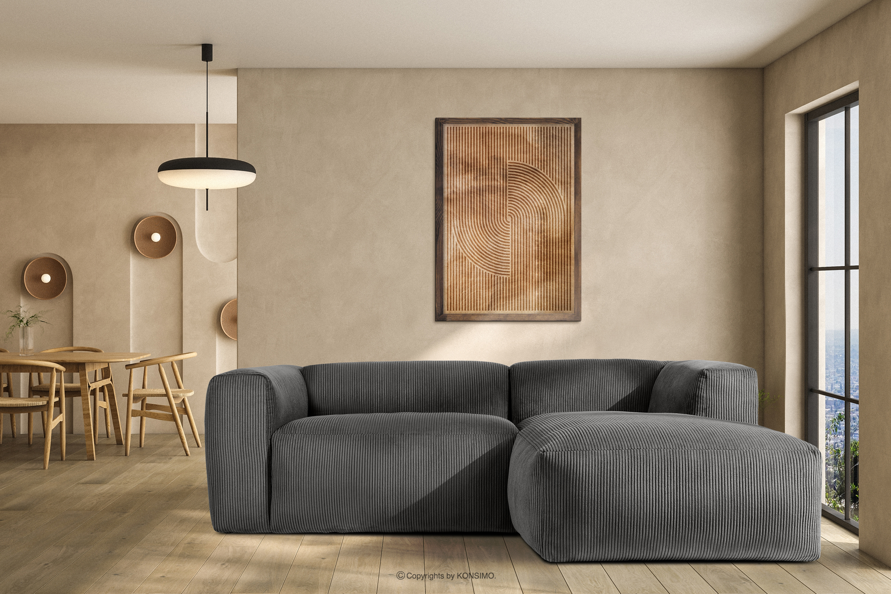 Das modulare Ecksofa für das Wohnzimmer aus grauem Kordstoff rechts wird mit Sicherheit zum Mittelpunkt eines jeden Wohnzimmers. Das Gestell ist aus strapazierfähigem Kiefern- und Buchenholz gefertigt, das nicht nur für Robustheit, sondern auch für Ästhetik sorgt. Darüber hinaus erhöht die Verwendung von langlebigen Span- und Faserplatten die Stabilität und Langlebigkeit des Möbels.