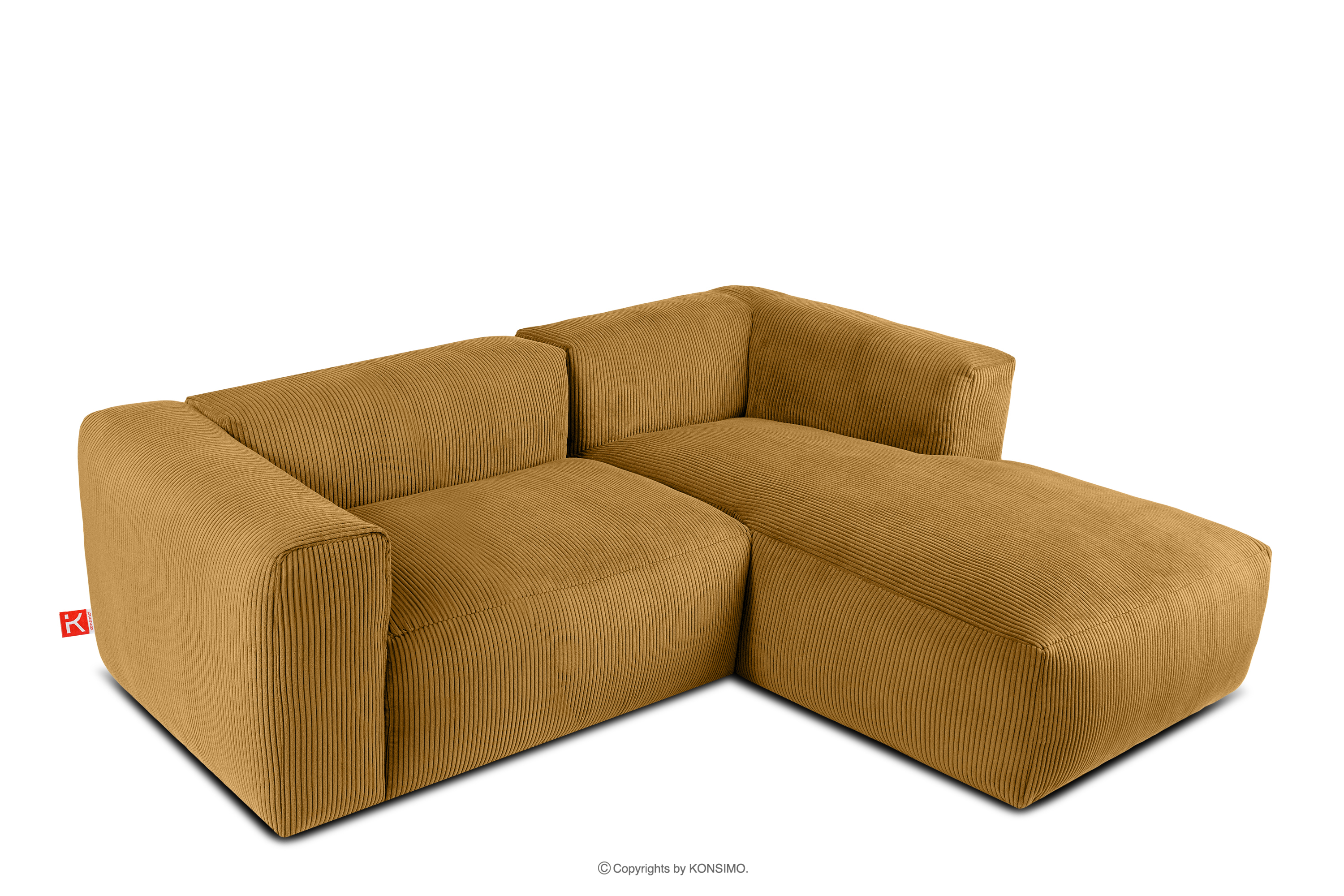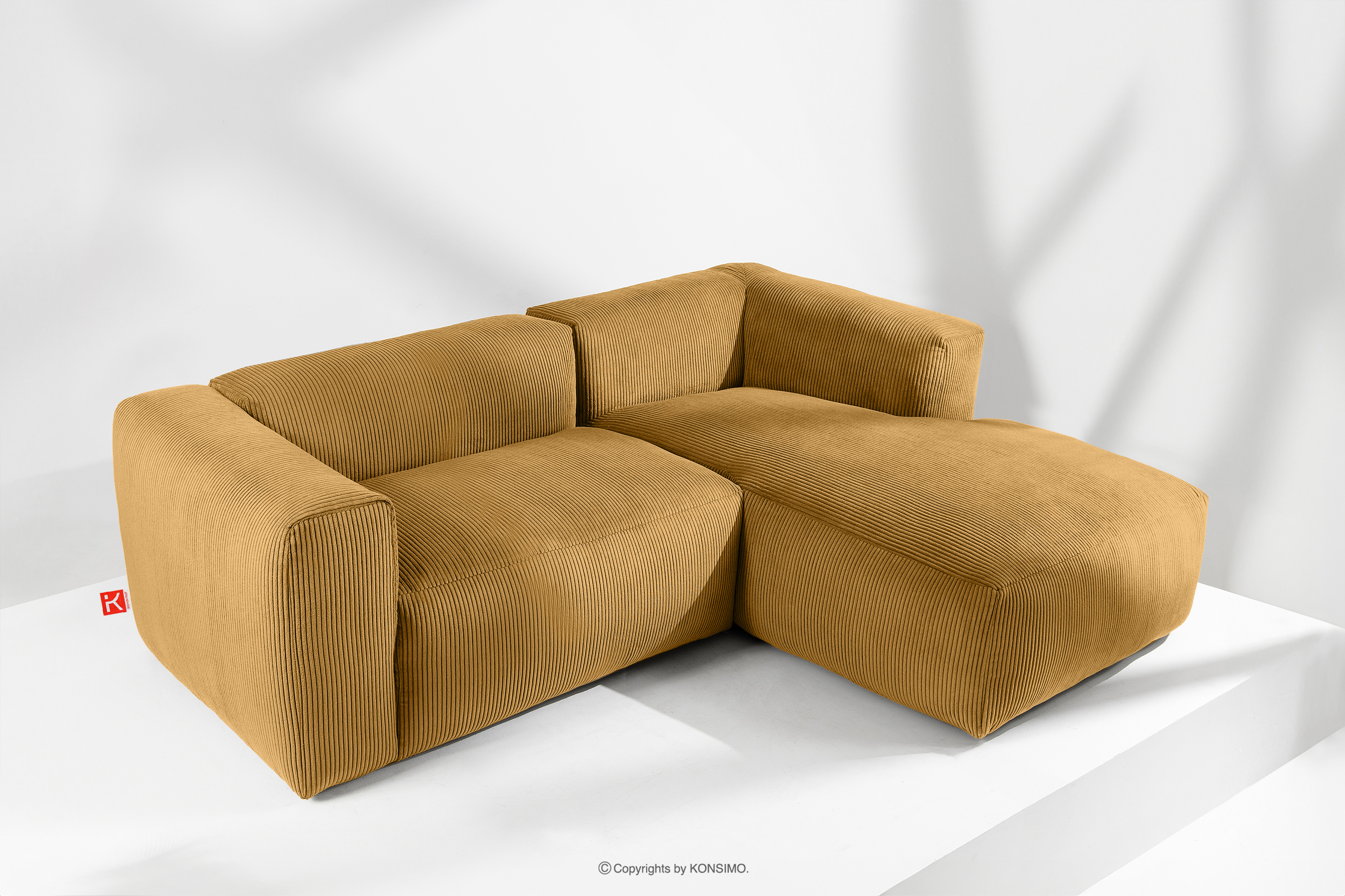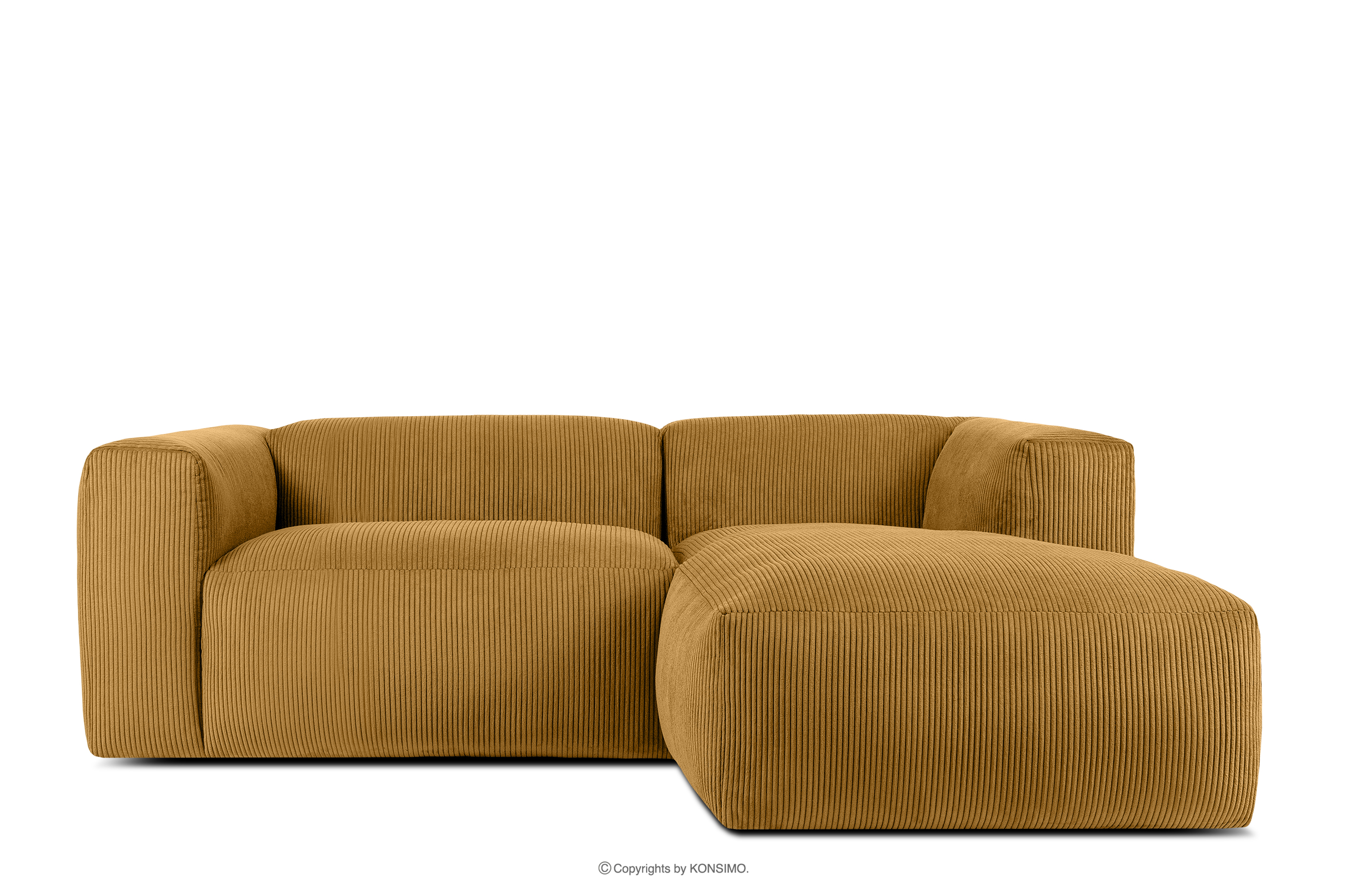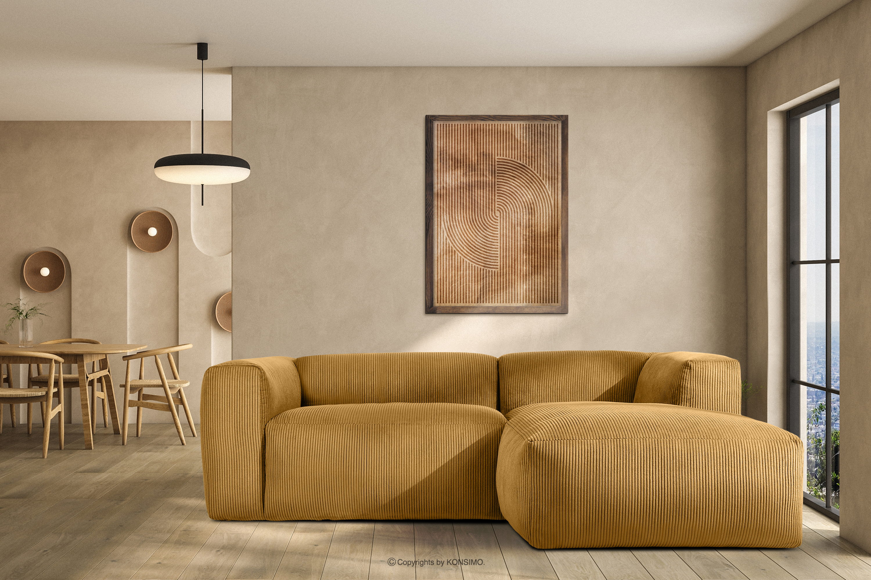 Das modulare Ecksofa für das Wohnzimmer in gelbem Kordstoff rechts wird mit Sicherheit zum Mittelpunkt eines jeden Wohnzimmers. Das Gestell ist aus strapazierfähigem Kiefern- und Buchenholz gefertigt, das nicht nur für Robustheit, sondern auch für Ästhetik sorgt. Darüber hinaus erhöht die Verwendung von langlebigen Span- und Faserplatten die Stabilität und Langlebigkeit des Möbels.