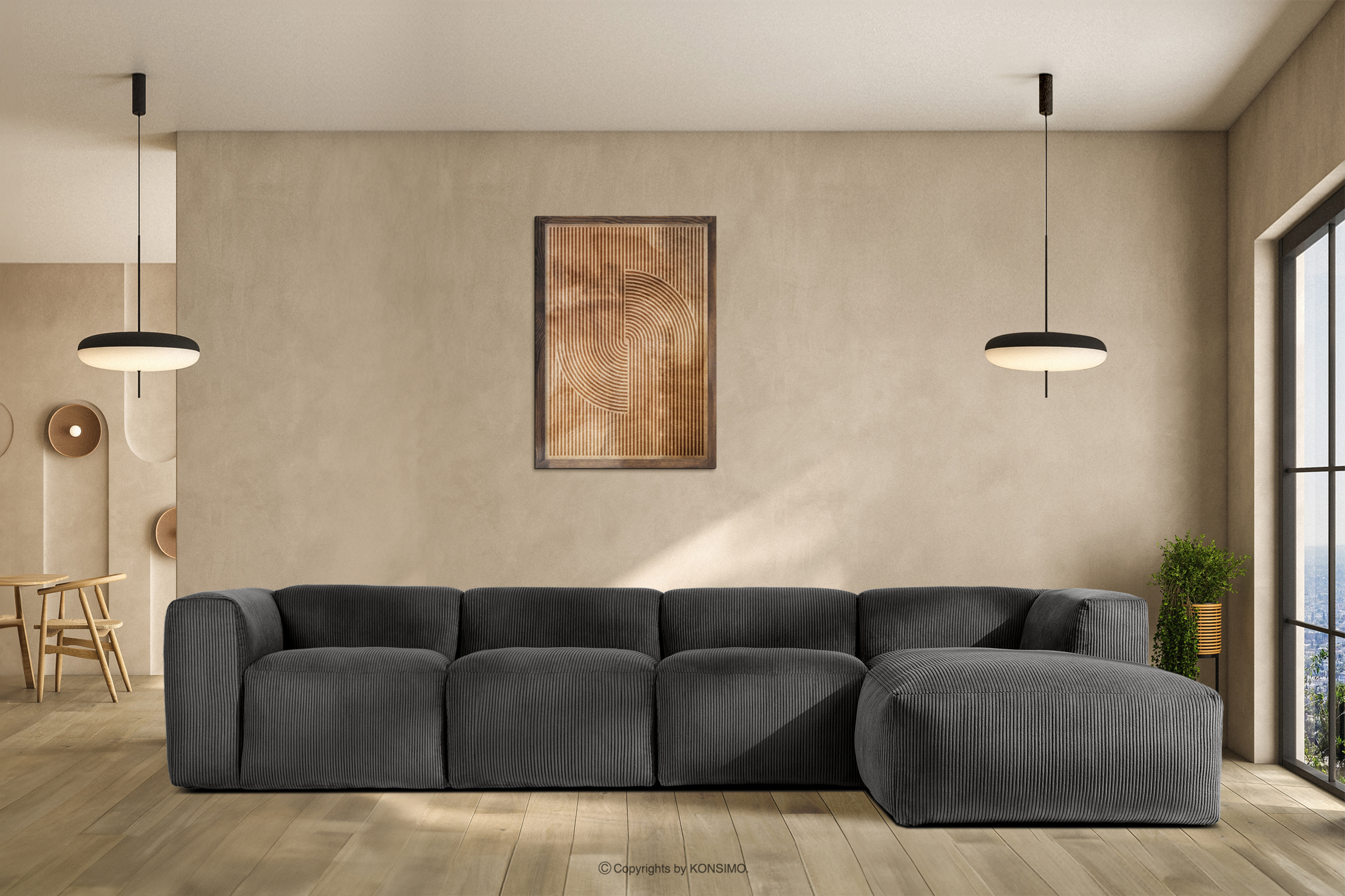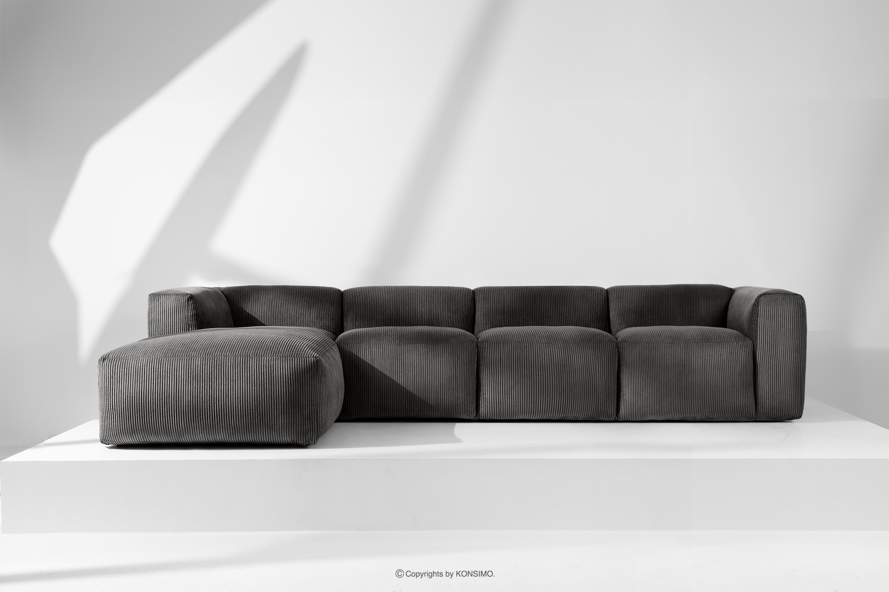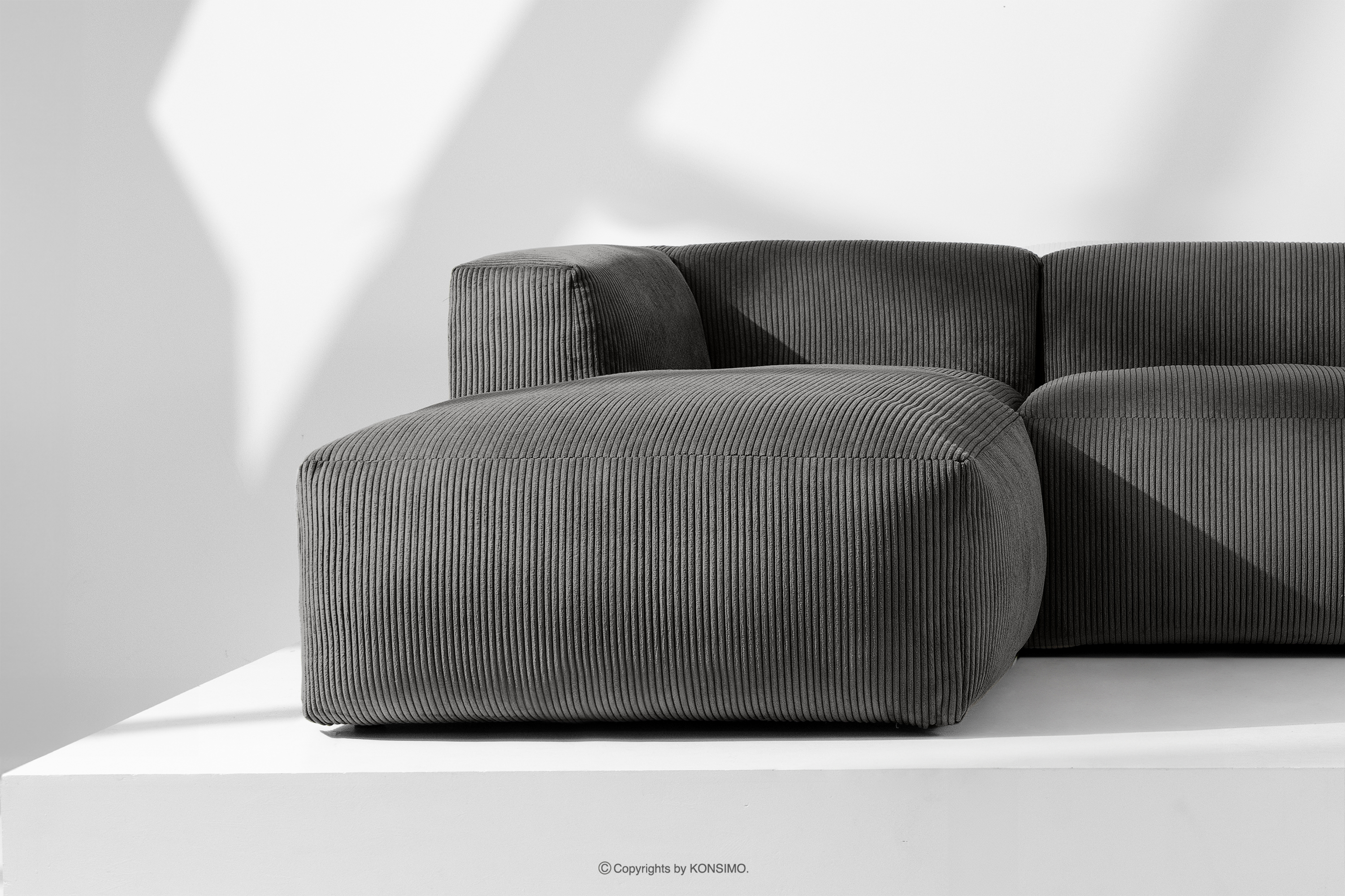 BUFFO Großes modulares Ecksofa für das Wohnzimmer aus grauem Kordstoff links