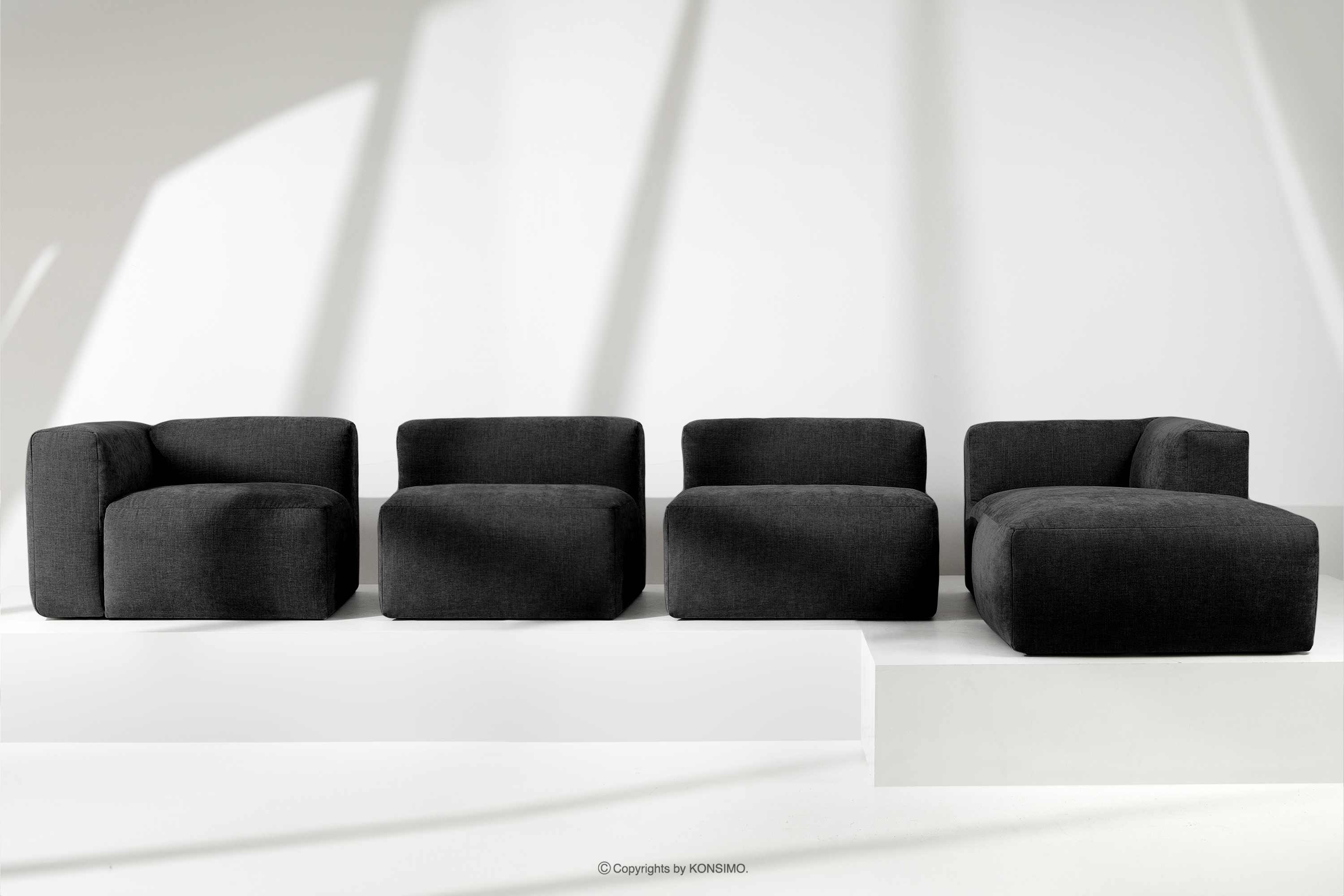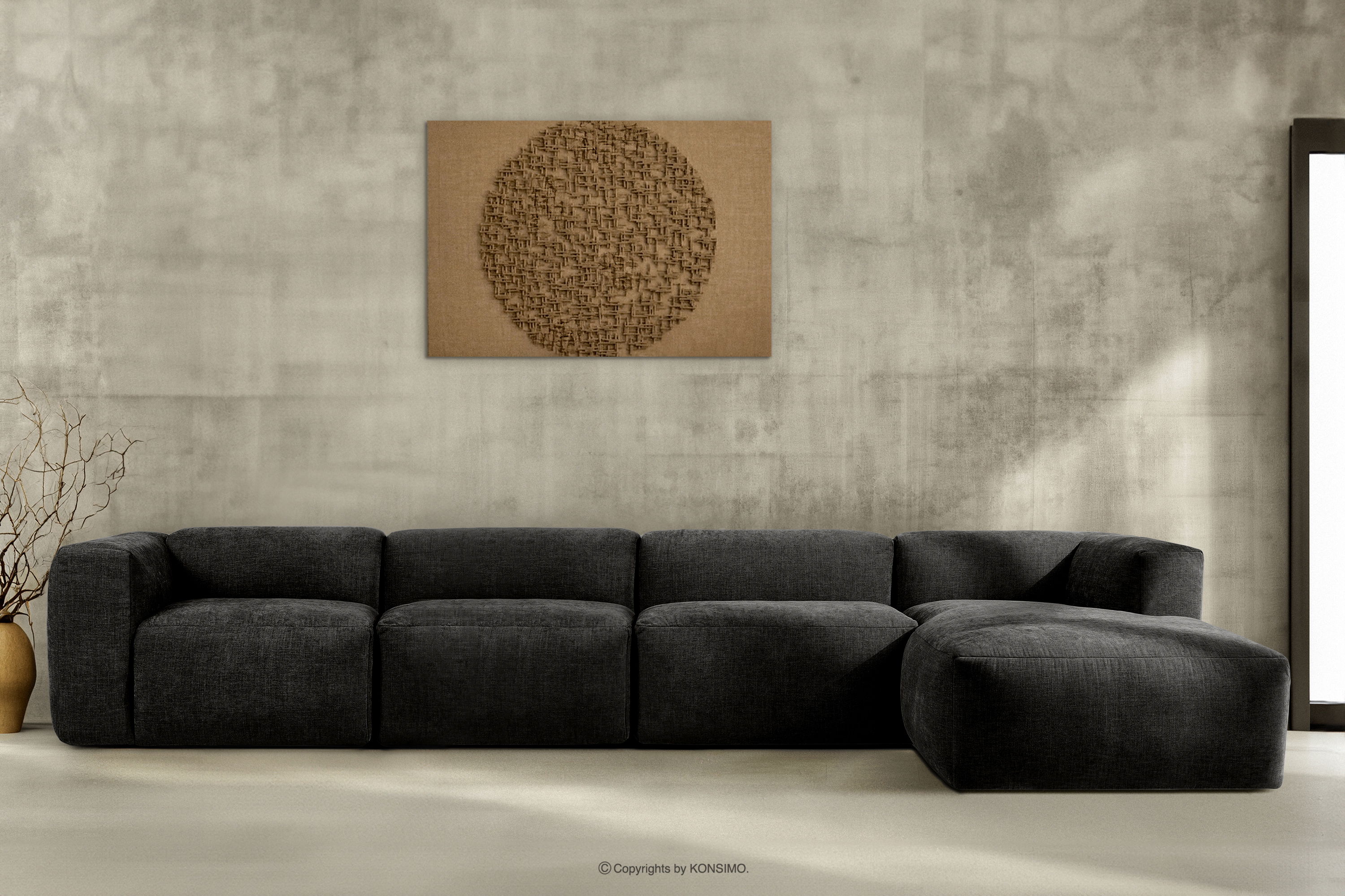 BUFFO Großes modulares Wohnzimmer-Ecksofa aus graphitfarbenem Gewebestoff, rechts