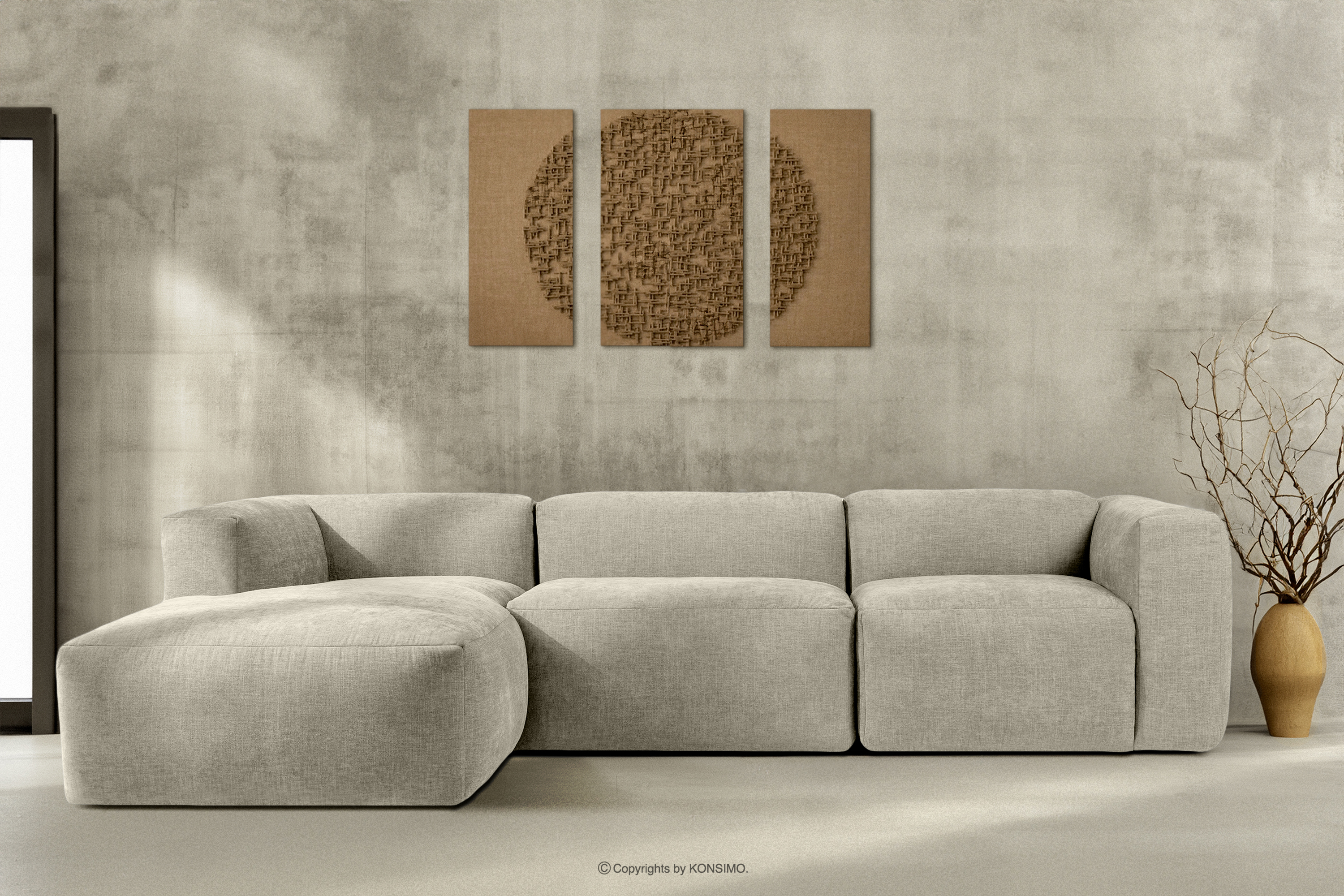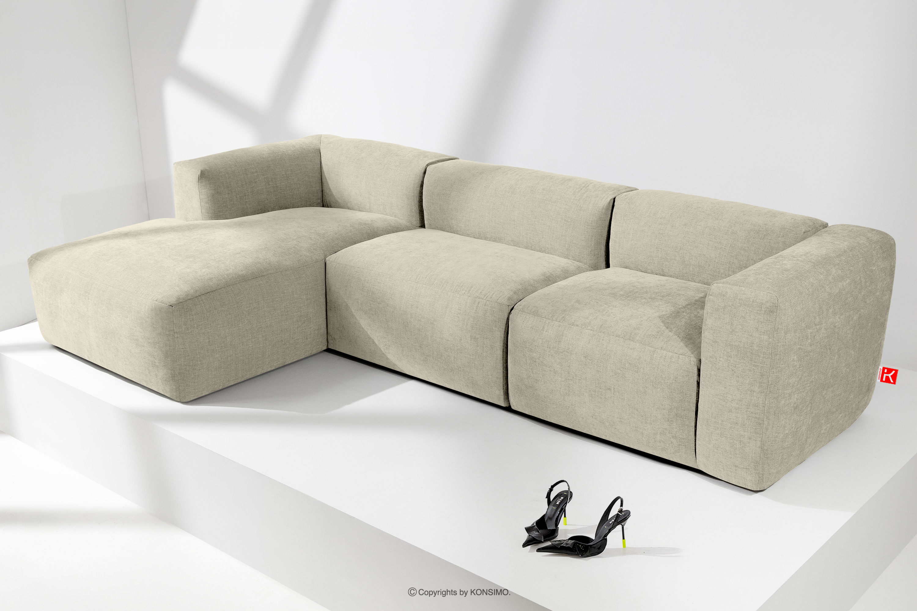 Das modulare Ecksofa aus ecrufarbenem Gewebestoff links wird mit Sicherheit zum Mittelpunkt eines jeden Wohnzimmers. Das Gestell ist aus strapazierfähigem Kiefern- und Buchenholz gefertigt, das nicht nur Solidität, sondern auch Ästhetik gewährleistet. Darüber hinaus erhöht die Verwendung von langlebigen Span- und Faserplatten die Stabilität und Langlebigkeit des Möbels. So bleiben sie auch bei intensiver Nutzung formstabil und widerstandsfähig gegen alle Herausforderungen des täglichen Lebens.
