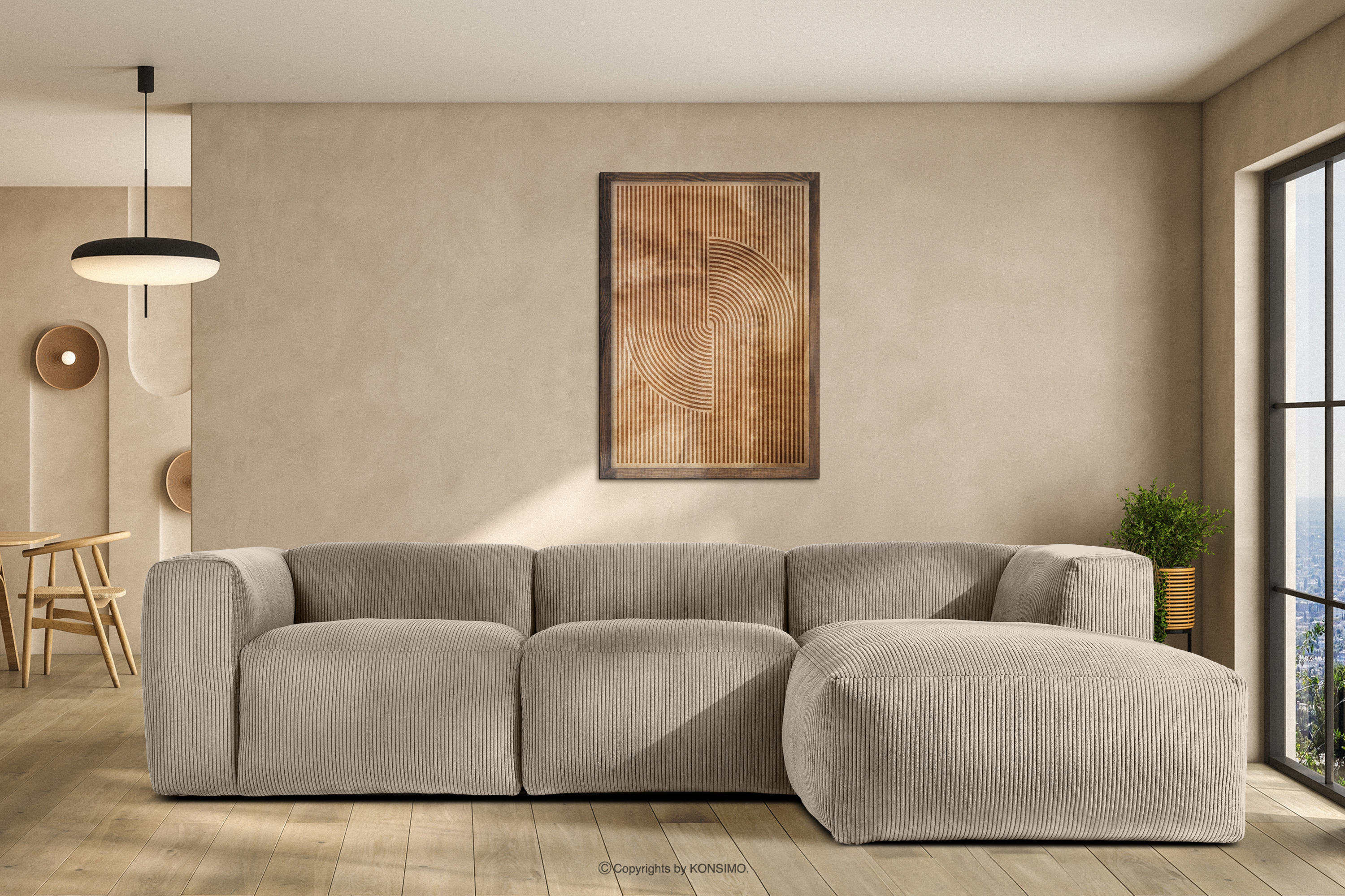 Das modulare Ecksofa aus beigefarbenem Kordstoff wird mit Sicherheit zum Mittelpunkt eines jeden Wohnzimmers. Das Gestell ist aus strapazierfähigem Kiefern- und Buchenholz gefertigt, das nicht nur für Solidität, sondern auch für Ästhetik sorgt. Darüber hinaus erhöht die Verwendung von langlebigen Span- und Faserplatten die Stabilität und Haltbarkeit des Möbels. So bleiben sie auch bei intensiver Nutzung formstabil und widerstandsfähig gegen alle Herausforderungen des täglichen Lebens.