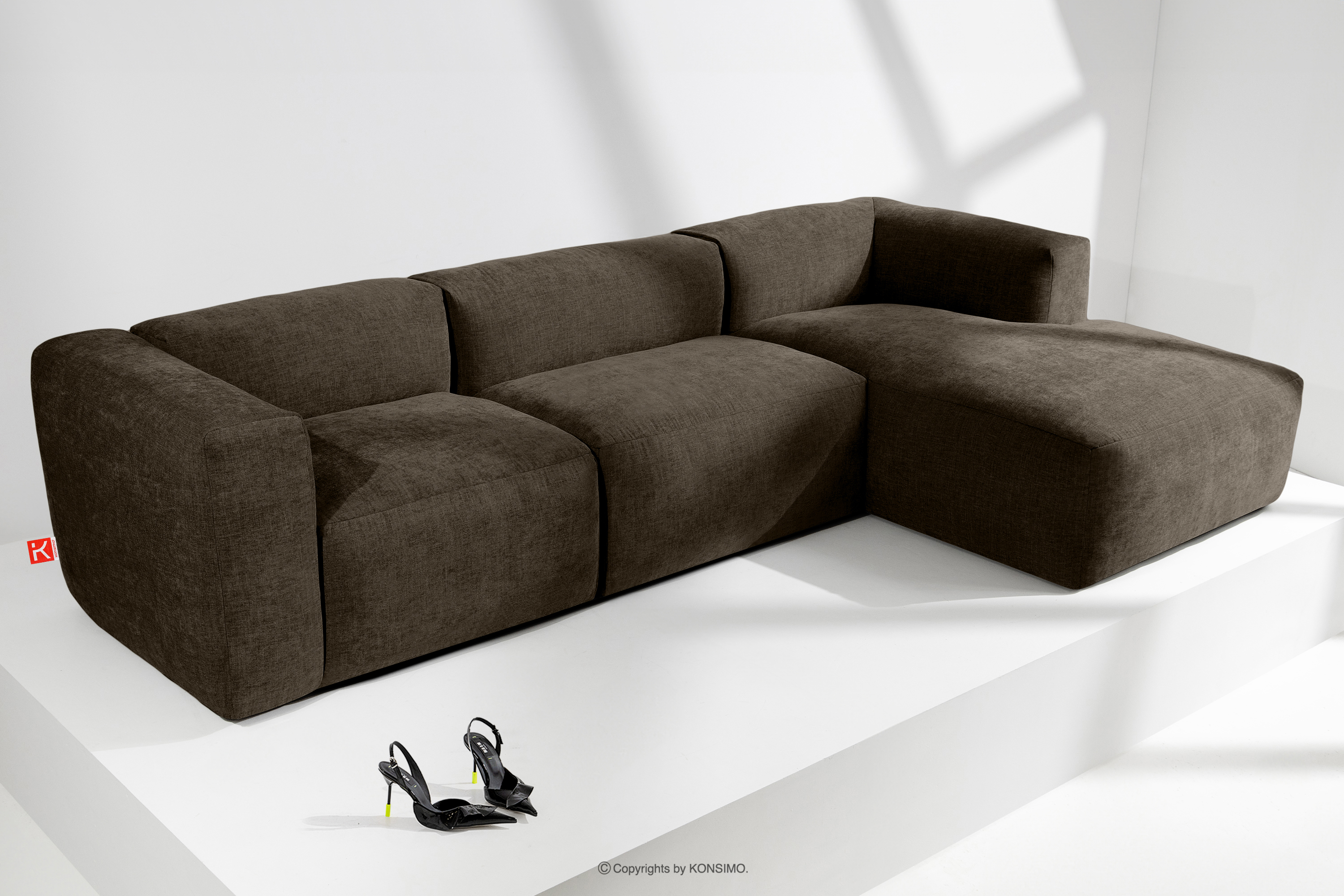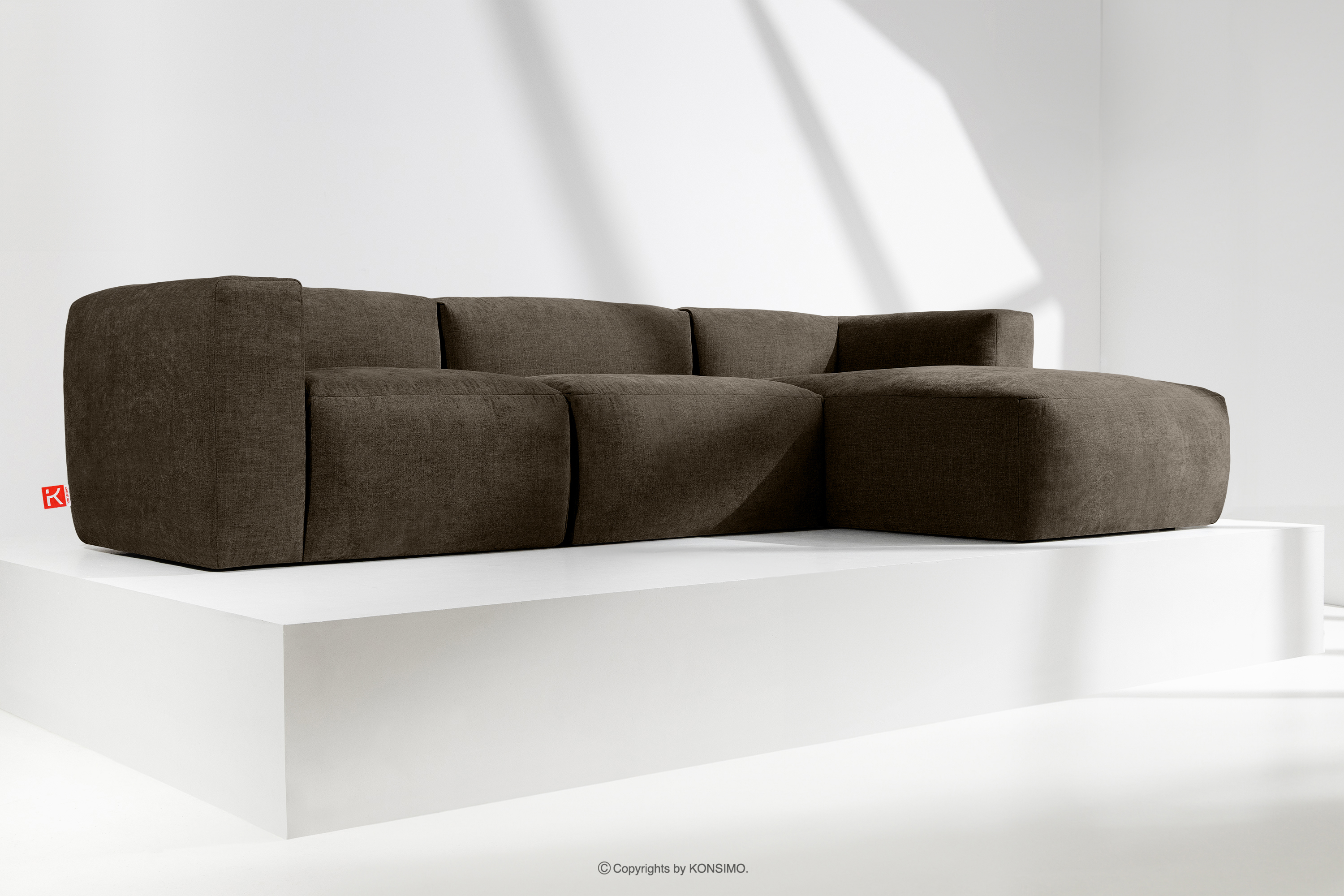 Das modulare Ecksofa aus braunem Gewebestoff rechts wird mit Sicherheit zum Mittelpunkt eines jeden Wohnzimmers. Das Gestell ist aus strapazierfähigem Kiefern- und Buchenholz gefertigt, das nicht nur Solidität, sondern auch Ästhetik gewährleistet. Darüber hinaus erhöht die Verwendung von langlebigen Span- und Faserplatten die Stabilität und Haltbarkeit des Möbels. So bleiben sie auch bei intensiver Nutzung formstabil und widerstandsfähig gegen alle Herausforderungen des täglichen Lebens.