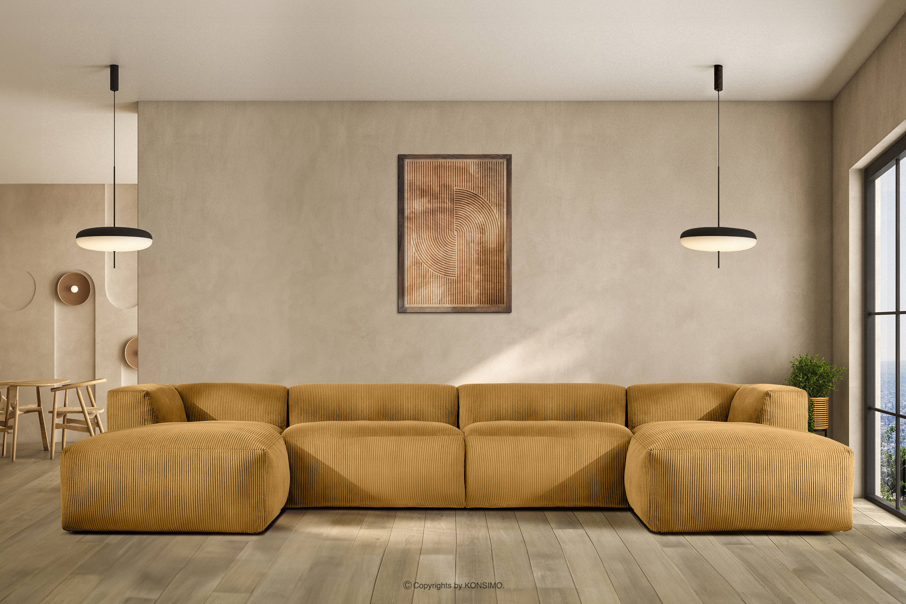 Das große U-förmige modulare Ecksofa Kordstoff gelb wird mit Sicherheit zum Mittelpunkt eines jeden Wohnzimmers. Das Gestell ist aus haltbarem Kiefern- und Buchenholz gefertigt, was nicht nur Solidität, sondern auch eine ästhetisch ansprechende Verarbeitung gewährleistet. Darüber hinaus erhöht die Verwendung von langlebigen Span- und Faserplatten die Stabilität und Langlebigkeit des Möbels.