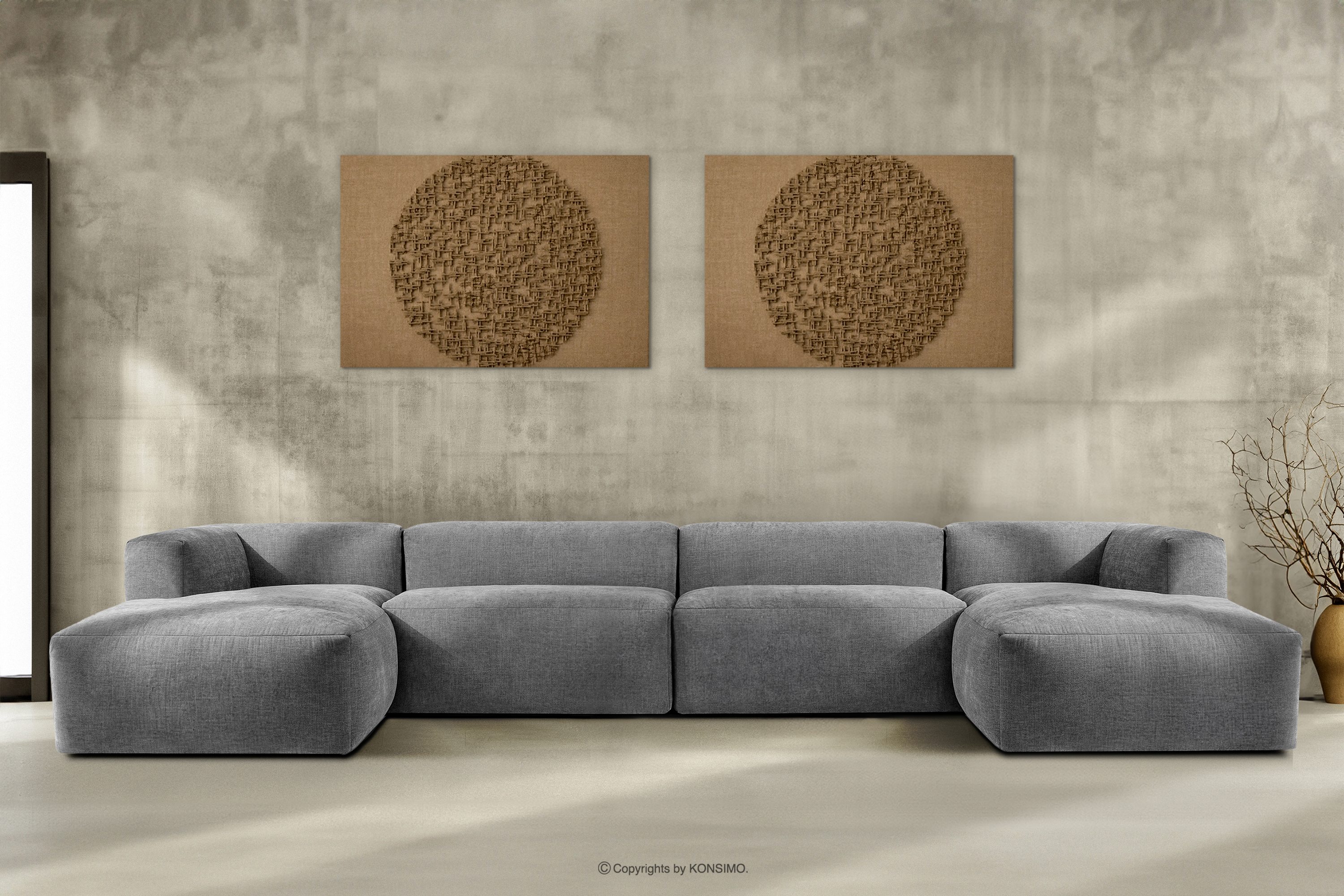 BUFFO Großes modulares U-förmiges Ecksofa aus hellgrauem Gewebestoff
