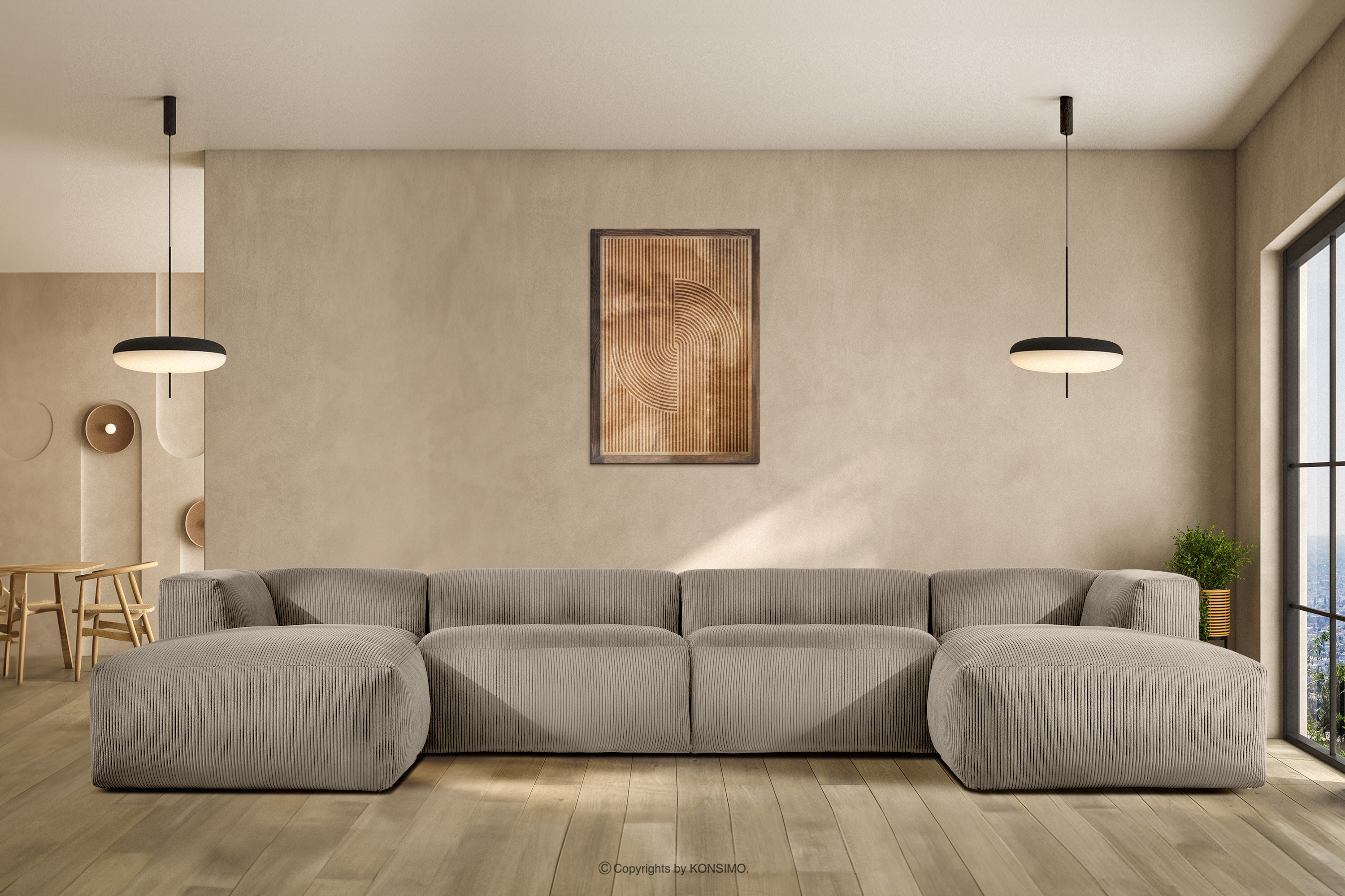 Das große U-förmige modulare Ecksofa aus beigefarbenem Kordstoff wird mit Sicherheit zum Mittelpunkt jedes Wohnzimmers. Das Gestell ist aus strapazierfähigem Kiefern- und Buchenholz gefertigt, das nicht nur Solidität, sondern auch Ästhetik gewährleistet. Darüber hinaus erhöht die Verwendung von langlebigen Span- und Faserplatten die Stabilität und Haltbarkeit des Möbels. So bleiben sie auch bei intensiver Nutzung formstabil und widerstandsfähig gegen alle Herausforderungen des täglichen Lebens.