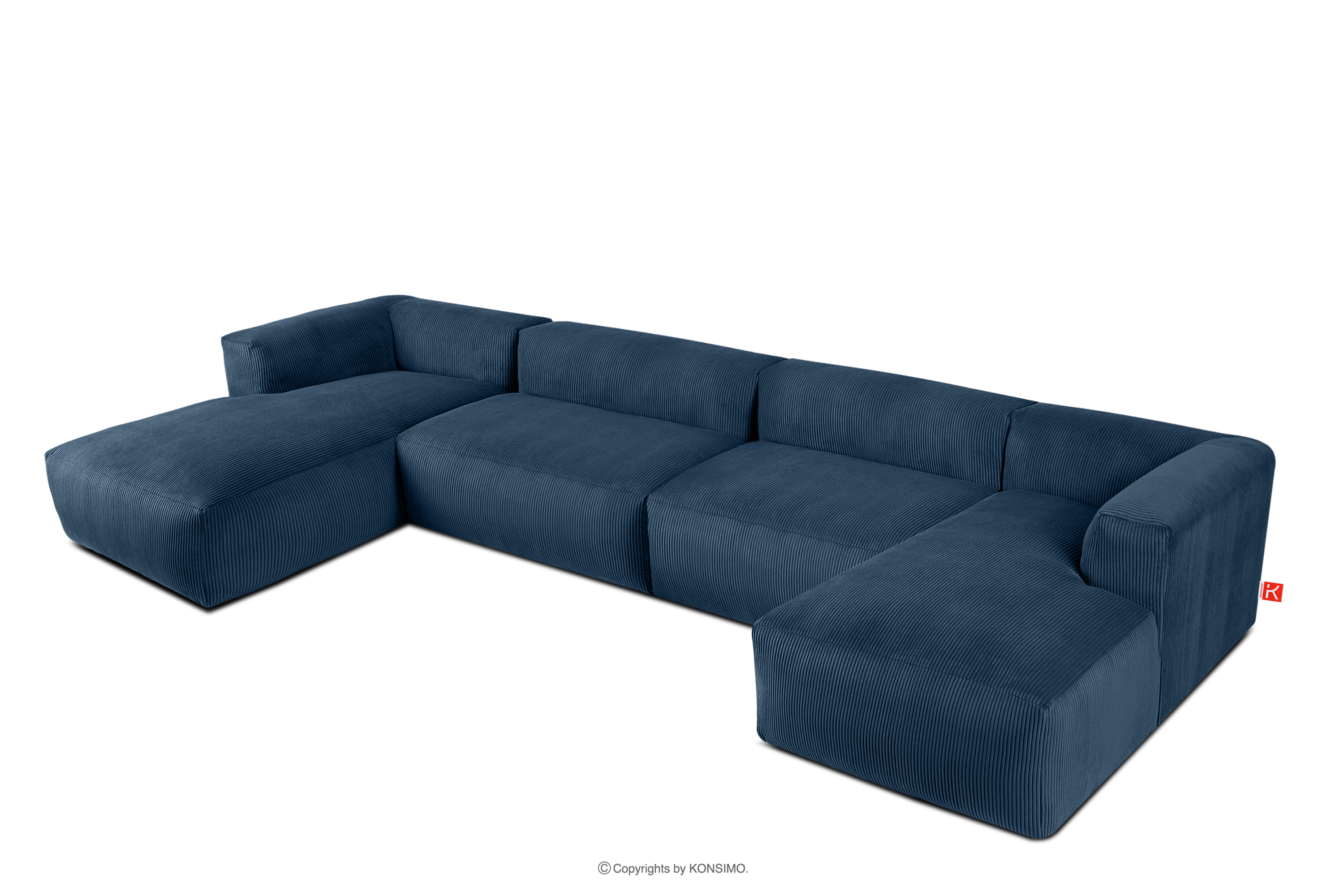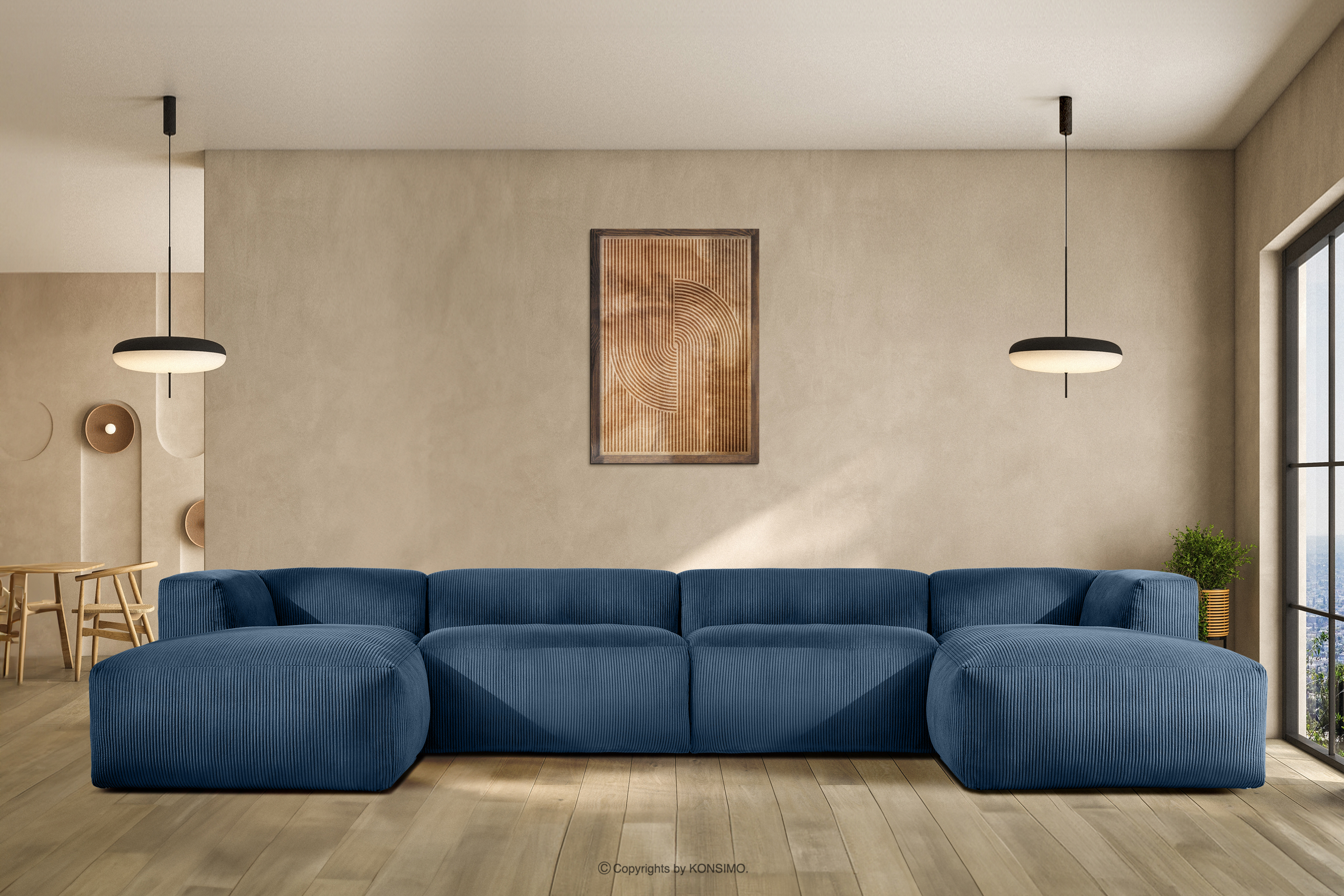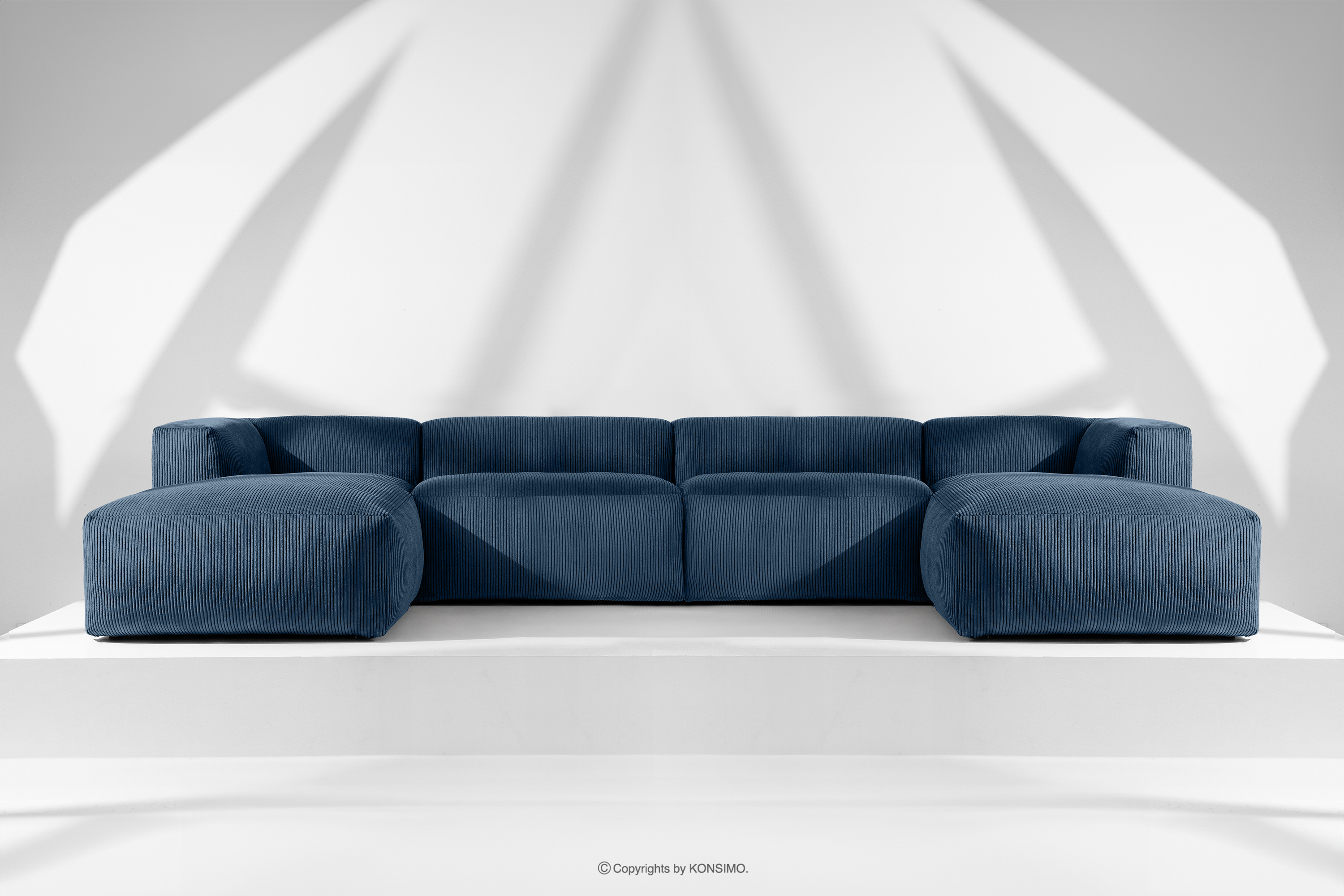 Das große U-förmige modulare Ecksofa aus marineblauem Kordstoff wird mit Sicherheit zum Mittelpunkt eines jeden Wohnzimmers. Das Gestell ist aus langlebigem Kiefern- und Buchenholz gefertigt, das nicht nur Solidität, sondern auch Ästhetik gewährleistet. Darüber hinaus erhöht die Verwendung von langlebigen Span- und Faserplatten die Stabilität und Langlebigkeit des Möbels. So bleiben sie auch bei intensiver Nutzung formstabil und widerstandsfähig gegen alle Herausforderungen des täglichen Lebens.