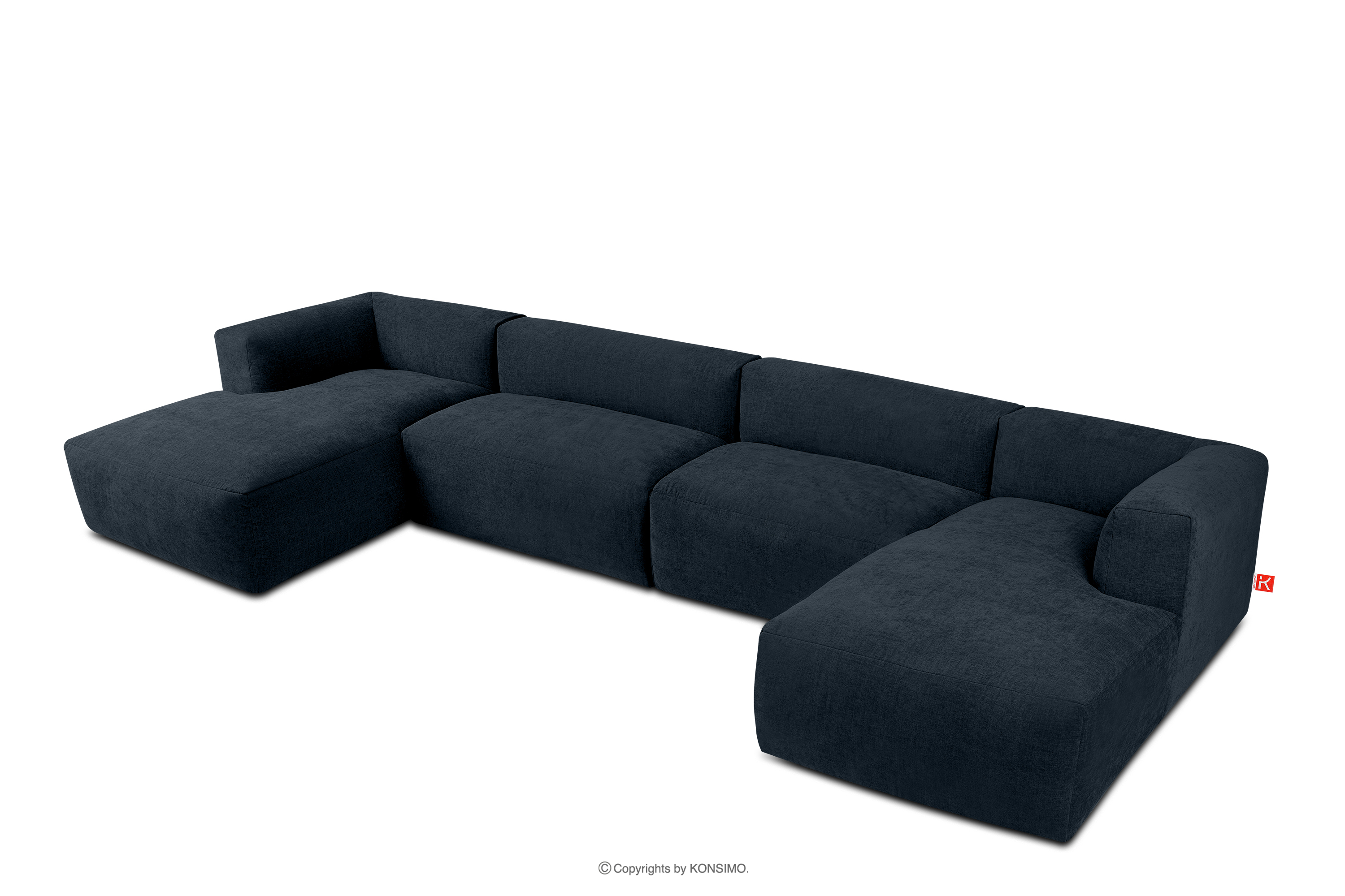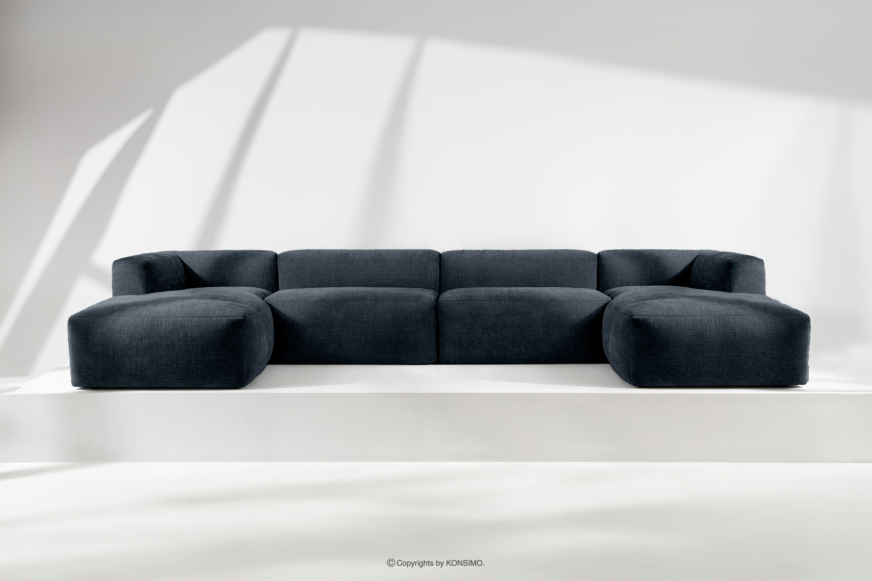 Das große U-förmige modulare Ecksofa aus dunkelblauem Gewebestoff wird mit Sicherheit zum Mittelpunkt eines jeden Wohnzimmers. Das Gestell ist aus langlebigem Kiefern- und Buchenholz gefertigt, das nicht nur Robustheit, sondern auch Ästhetik gewährleistet. Darüber hinaus erhöht die Verwendung von langlebigen Span- und Faserplatten die Stabilität und Haltbarkeit des Möbels. So bleiben sie auch bei intensiver Nutzung formstabil und widerstandsfähig gegen alle Herausforderungen des täglichen Lebens.