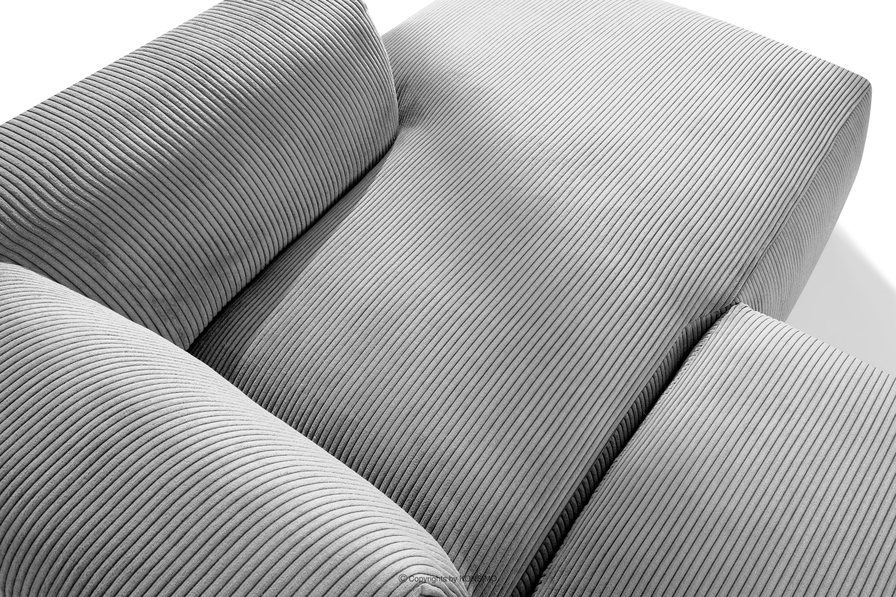 Das große Ecksofa aus hellgrauem Kordstoff ist der Blickfang in jedem Wohnzimmer. Das Gestell ist aus strapazierfähigem Kiefern- und Buchenholz gefertigt, was nicht nur für Solidität, sondern auch für Ästhetik sorgt. Darüber hinaus erhöht die Verwendung von langlebigen Span- und Faserplatten die Stabilität und Haltbarkeit des Möbels. So bleiben sie auch bei intensiver Nutzung formstabil und widerstandsfähig gegen alle Herausforderungen des täglichen Lebens.