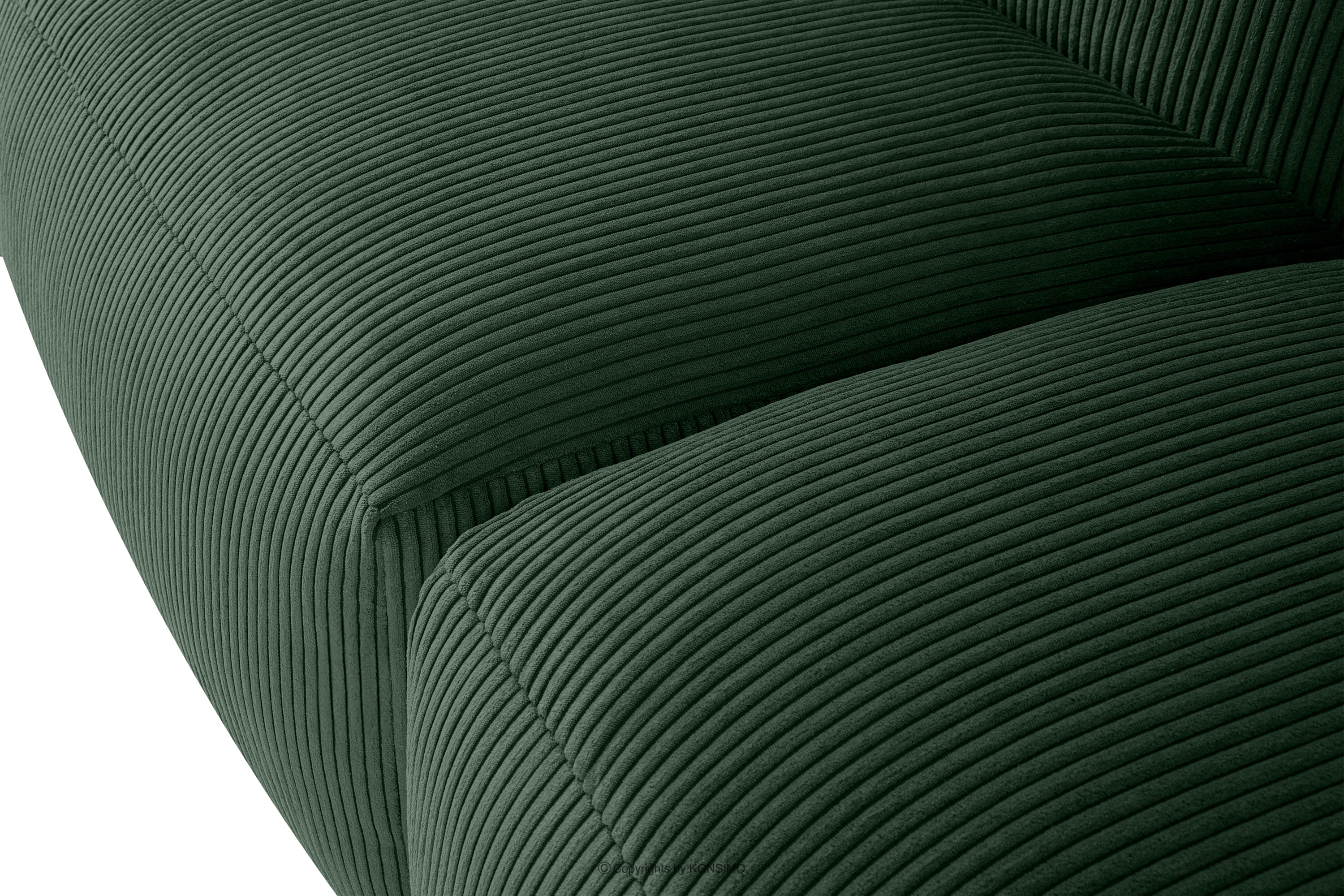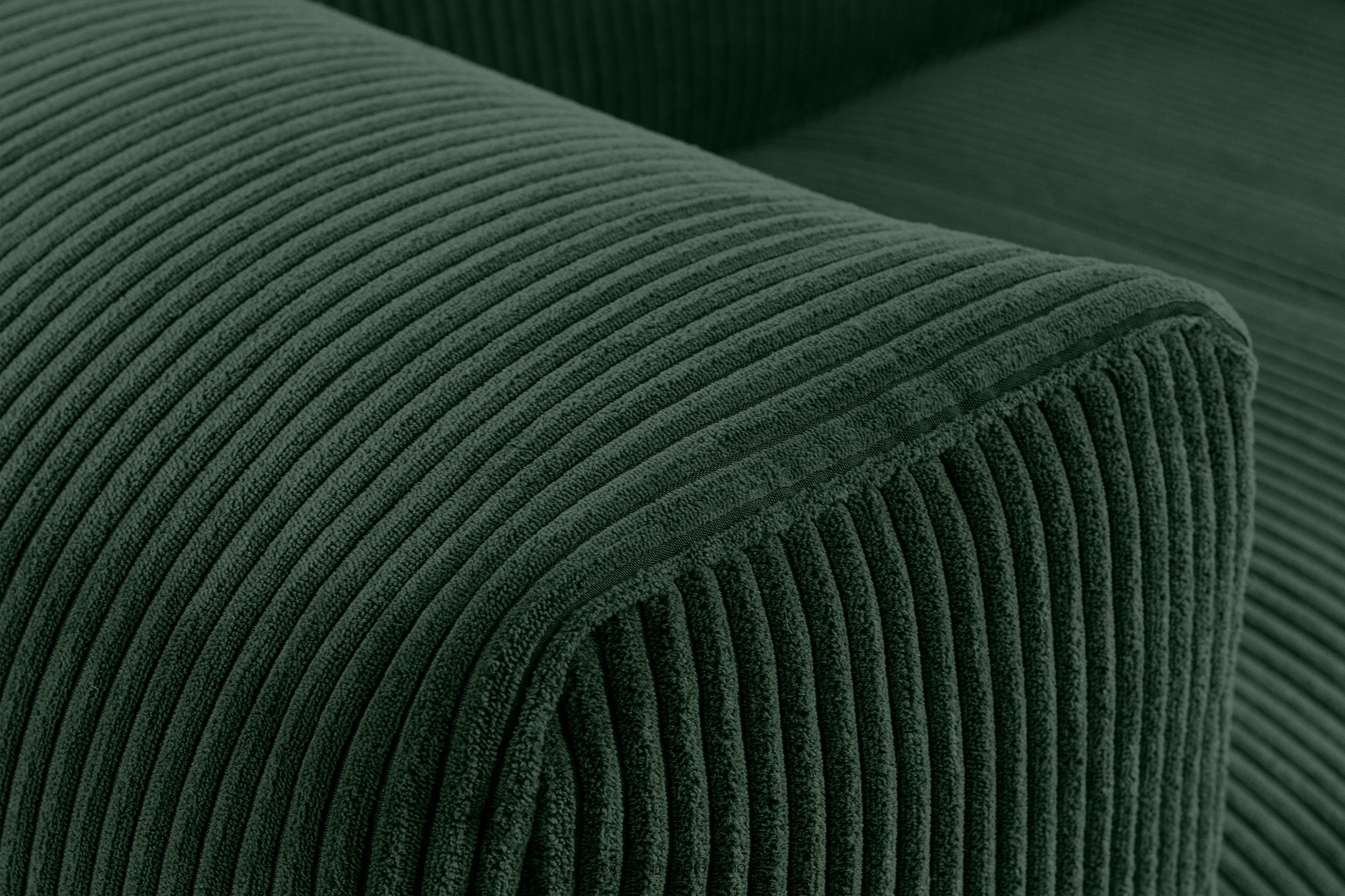 Das große Ecksofa mit dunkelgrünem Kordstoff ist der Blickfang in jedem Wohnzimmer. Das Gestell ist aus langlebigem Kiefern- und Buchenholz gefertigt, was nicht nur Solidität, sondern auch Ästhetik gewährleistet. Darüber hinaus erhöht die Verwendung von langlebigen Span- und Faserplatten die Stabilität und Haltbarkeit des Möbels. So bleiben sie auch bei intensiver Nutzung formstabil und widerstandsfähig gegen alle Herausforderungen des täglichen Lebens.