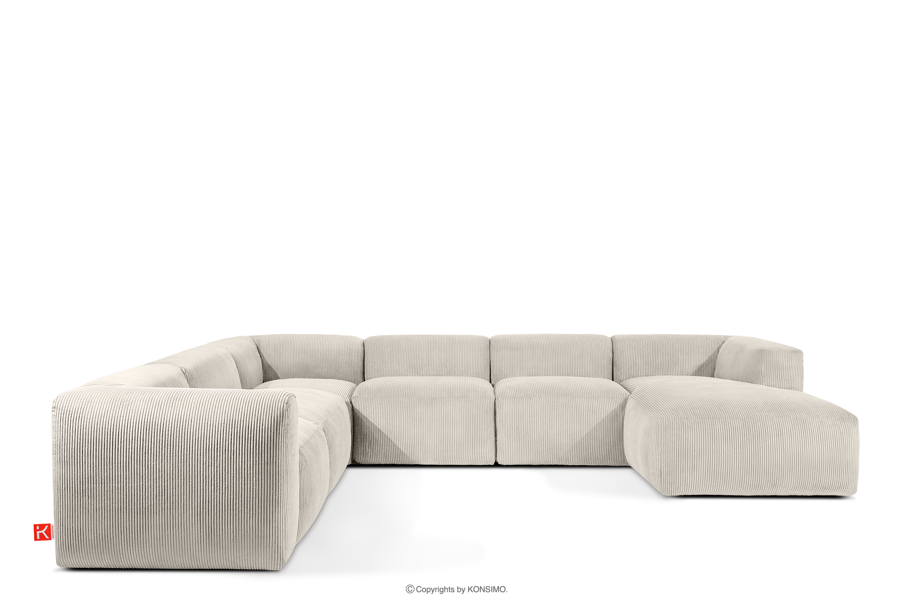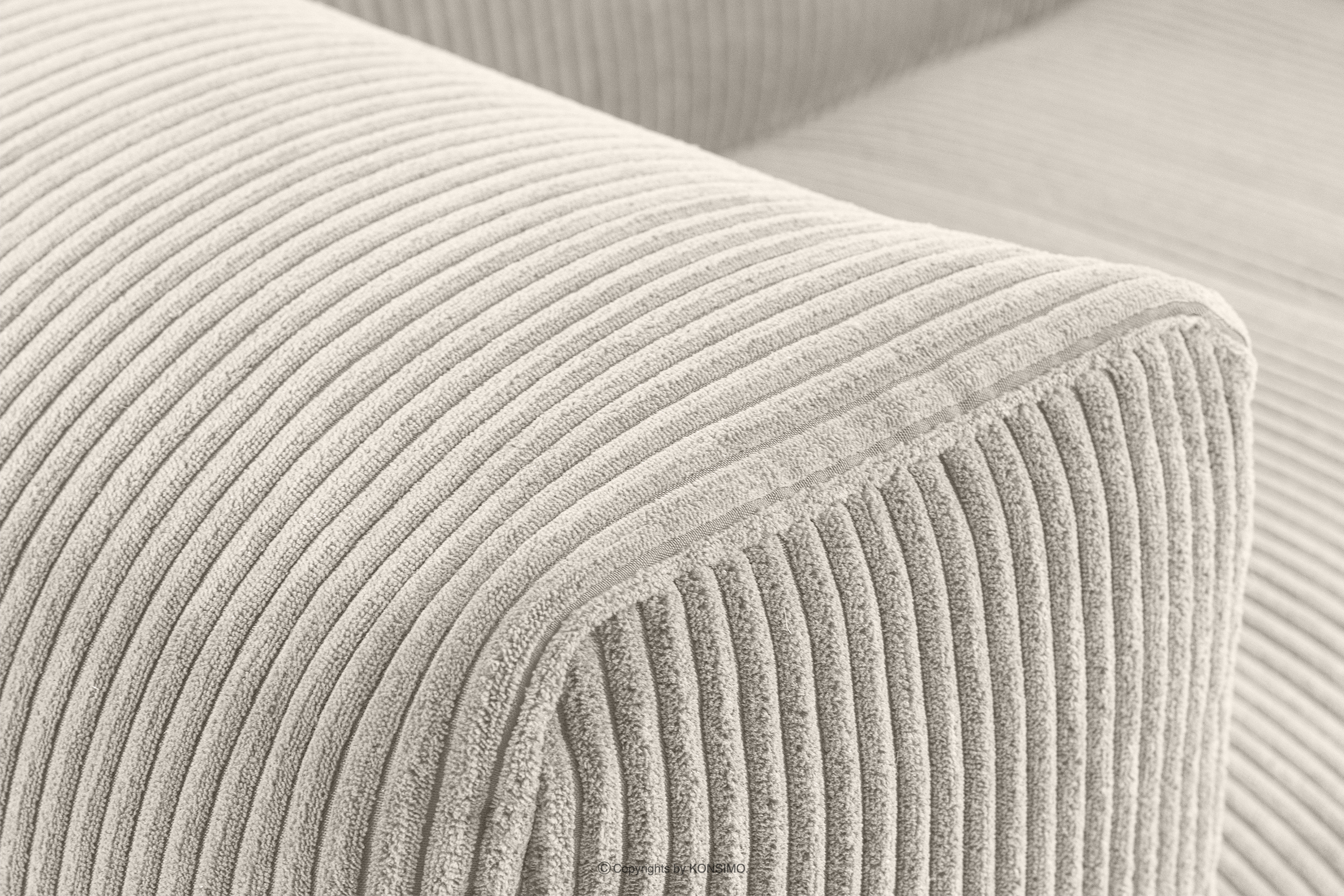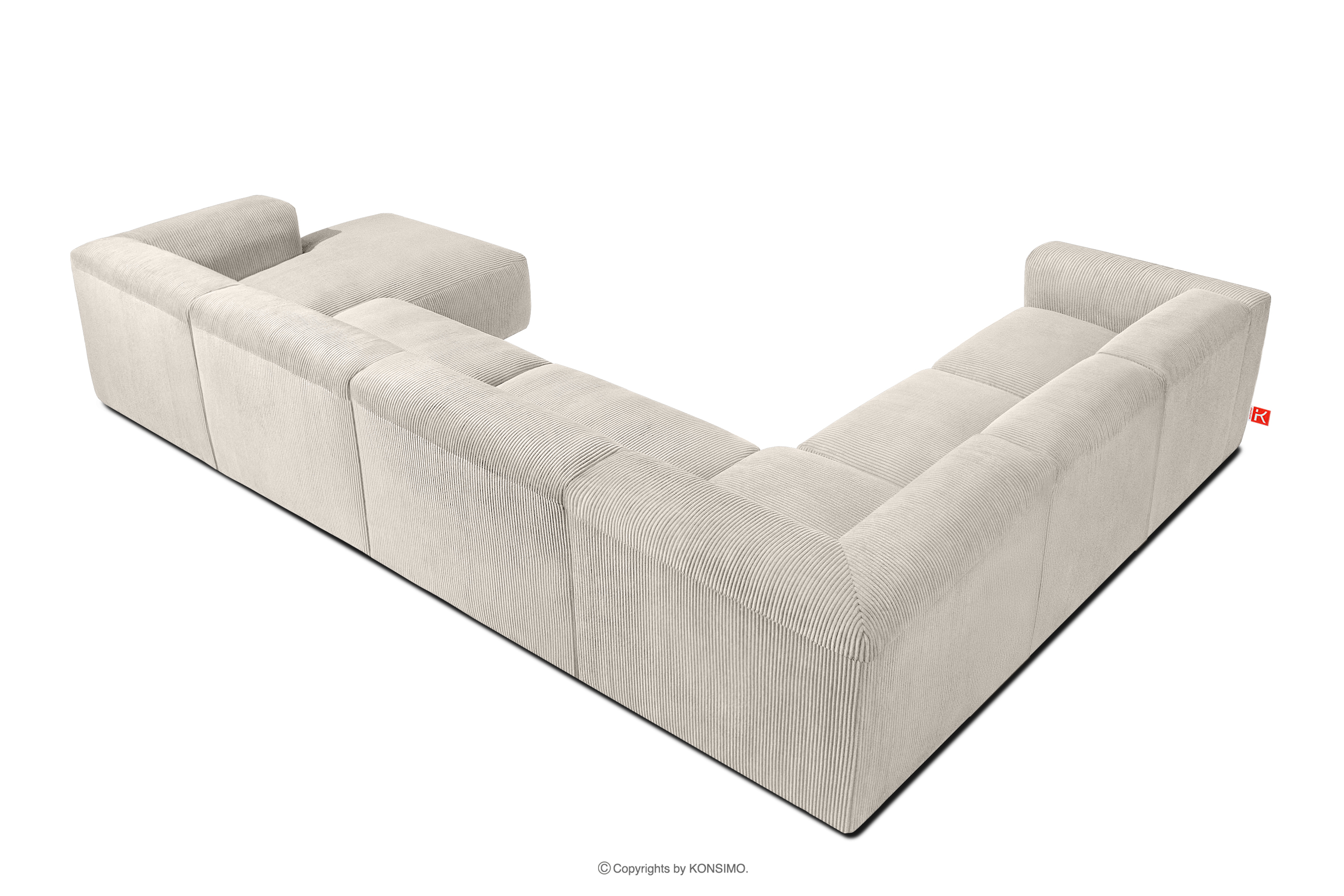 Das große Ecksofa aus cremefarbenem Kordstoff ist der Blickfang in jedem Wohnzimmer. Das Gestell ist aus langlebigem Kiefern- und Buchenholz gefertigt, was nicht nur für Stabilität, sondern auch für Ästhetik sorgt. Darüber hinaus erhöht die Verwendung von langlebigen Span- und Faserplatten die Stabilität und Langlebigkeit des Möbels. So bleiben sie auch bei intensiver Nutzung formstabil und widerstandsfähig gegen alle Herausforderungen des täglichen Lebens.