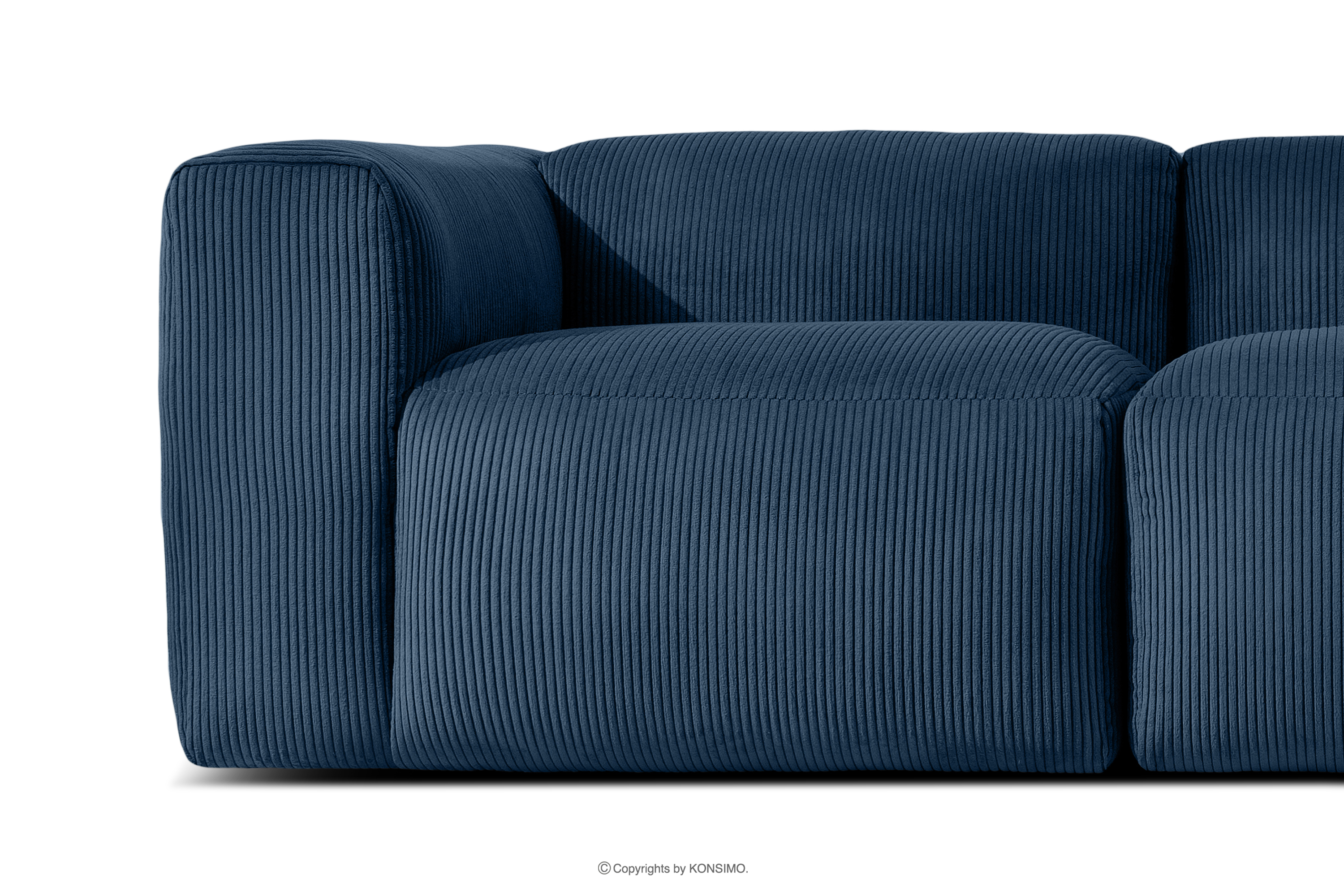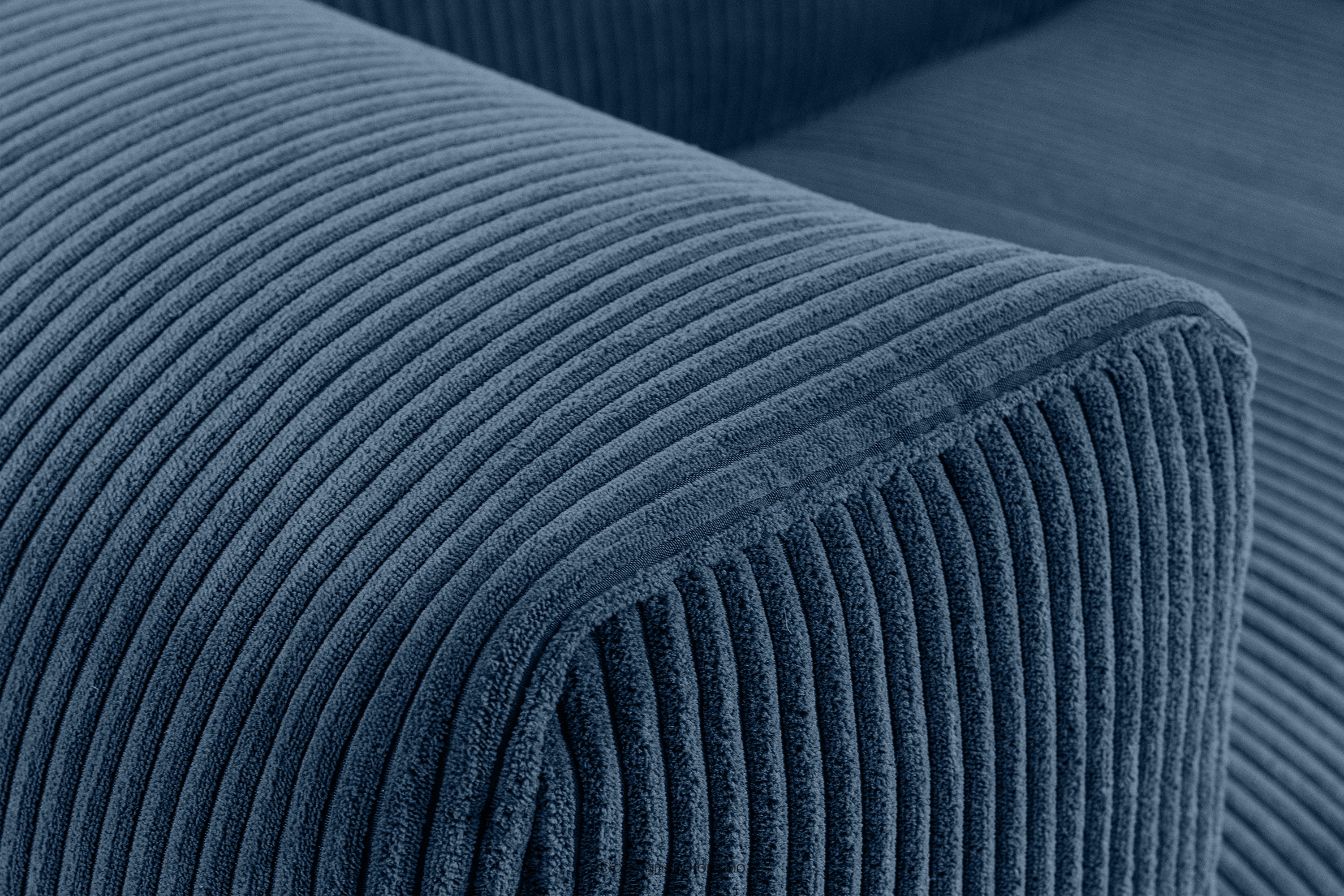 Das große Ecksofa mit marineblauem Kordstoff wird zum Blickfang in jedem Wohnzimmer. Das Gestell ist aus langlebigem Kiefern- und Buchenholz gefertigt, was nicht nur für Stabilität, sondern auch für Ästhetik sorgt. Darüber hinaus erhöht die Verwendung von langlebigen Span- und Faserplatten die Stabilität und Haltbarkeit des Möbels. So bleiben sie auch bei intensiver Nutzung formstabil und widerstandsfähig gegen alle Herausforderungen des täglichen Lebens.