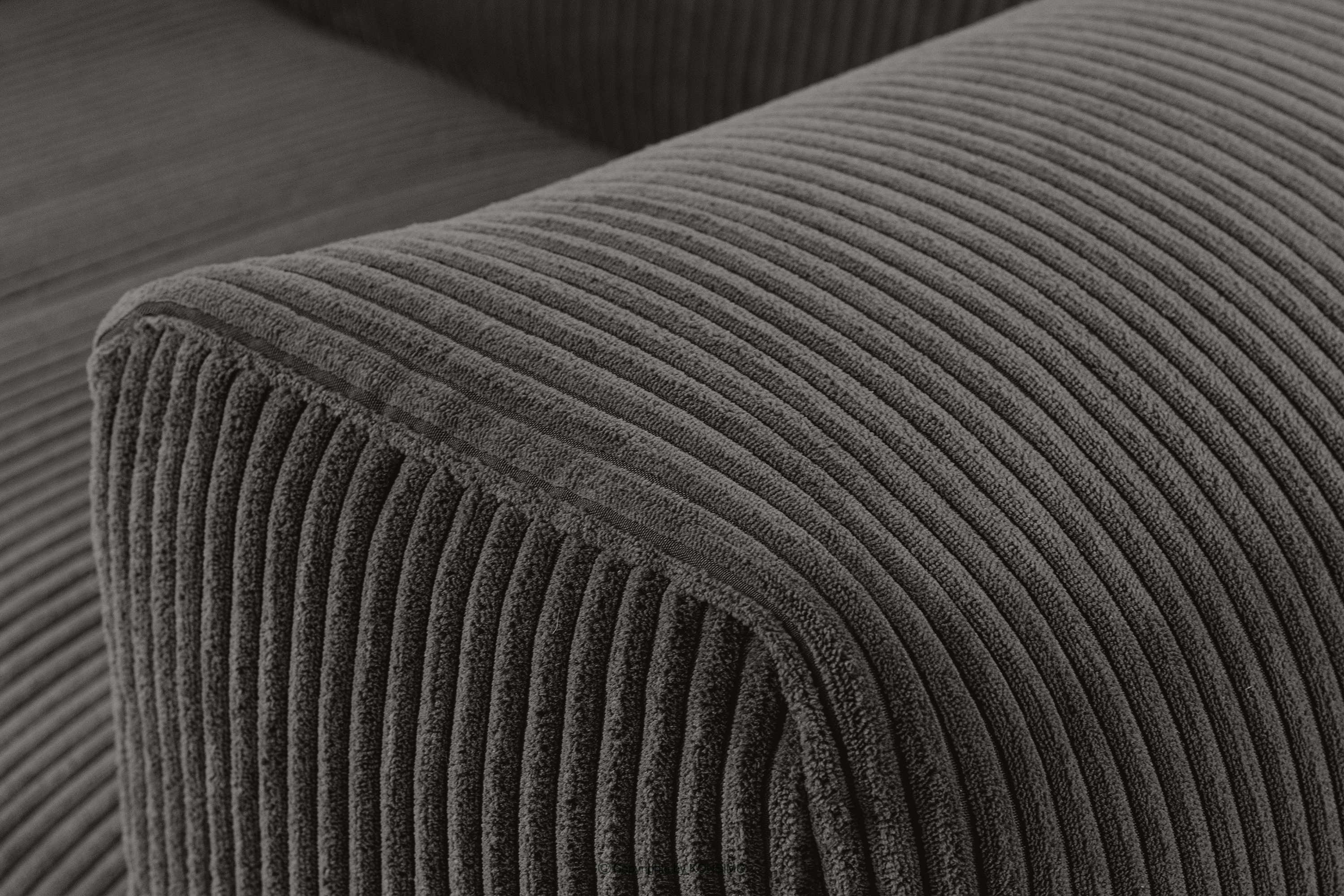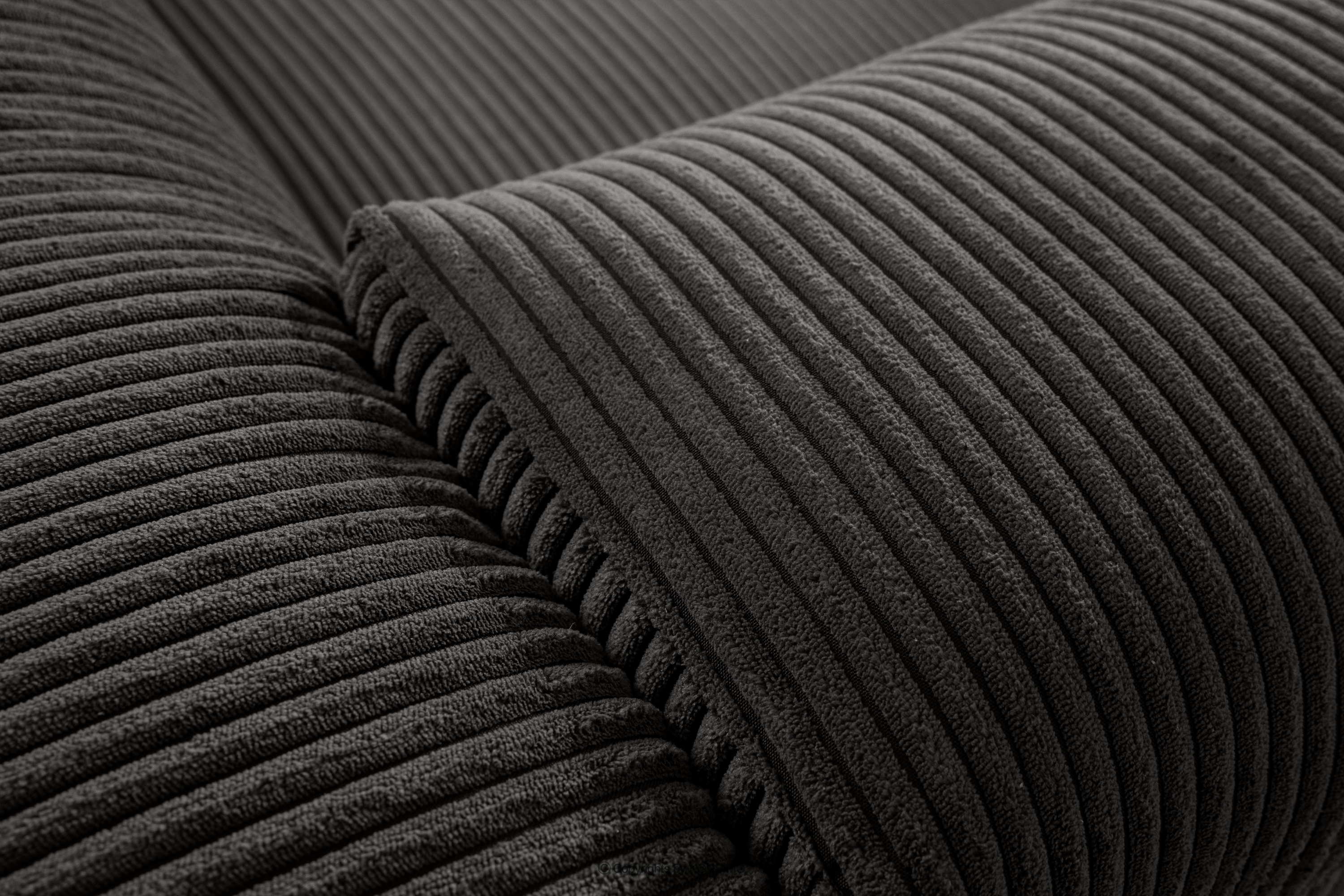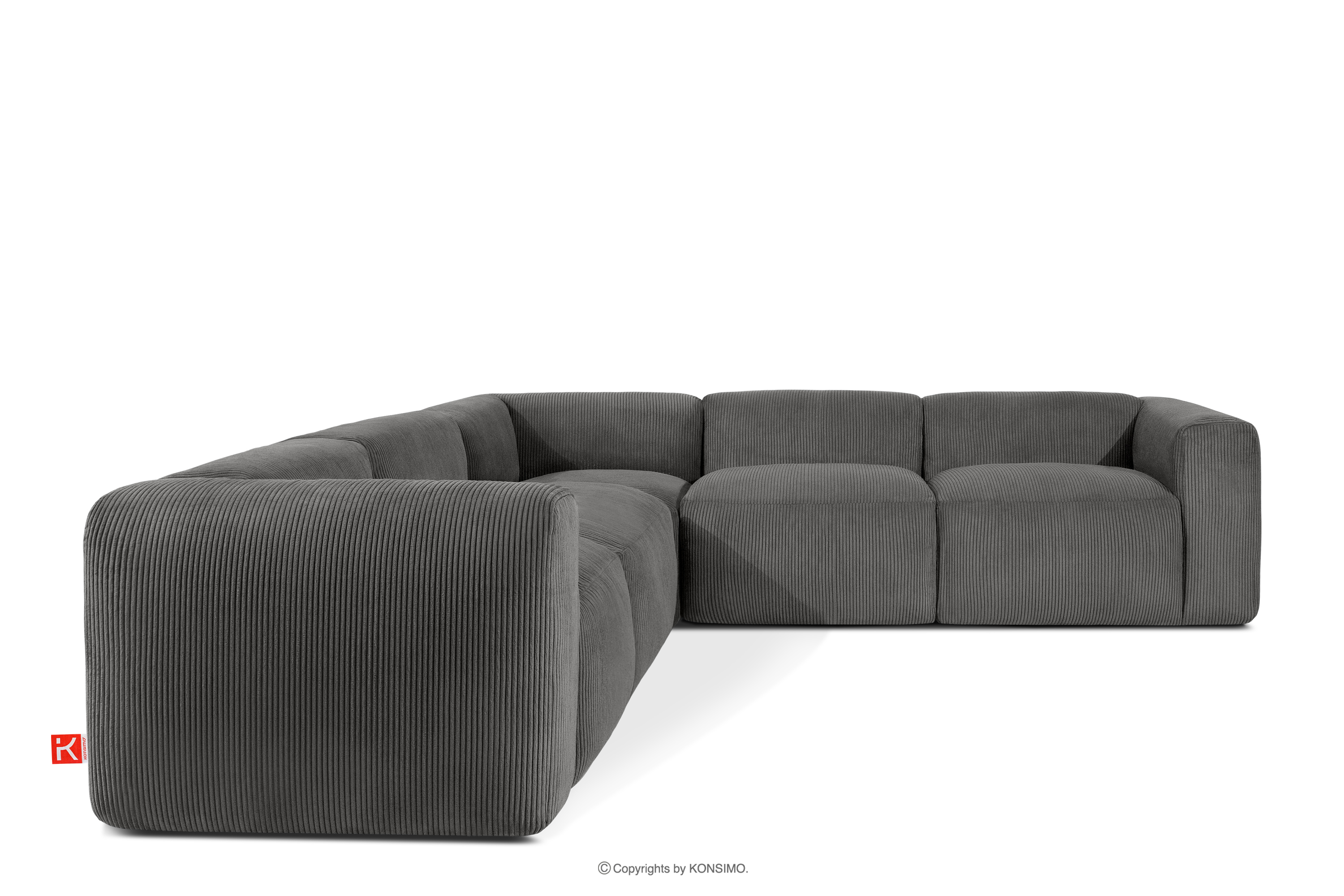 Das große modulare Ecksofa aus grauem Kordstoff wird zum Mittelpunkt eines jeden Wohnzimmers. Das Gestell ist aus langlebigem Kiefern- und Buchenholz gefertigt, das nicht nur für Stabilität, sondern auch für Ästhetik sorgt. Darüber hinaus erhöht die Verwendung von langlebigen Span- und Faserplatten die Stabilität und Haltbarkeit des Möbels. So bleiben sie auch bei intensiver Nutzung formstabil und widerstandsfähig gegen alle Herausforderungen des täglichen Lebens.