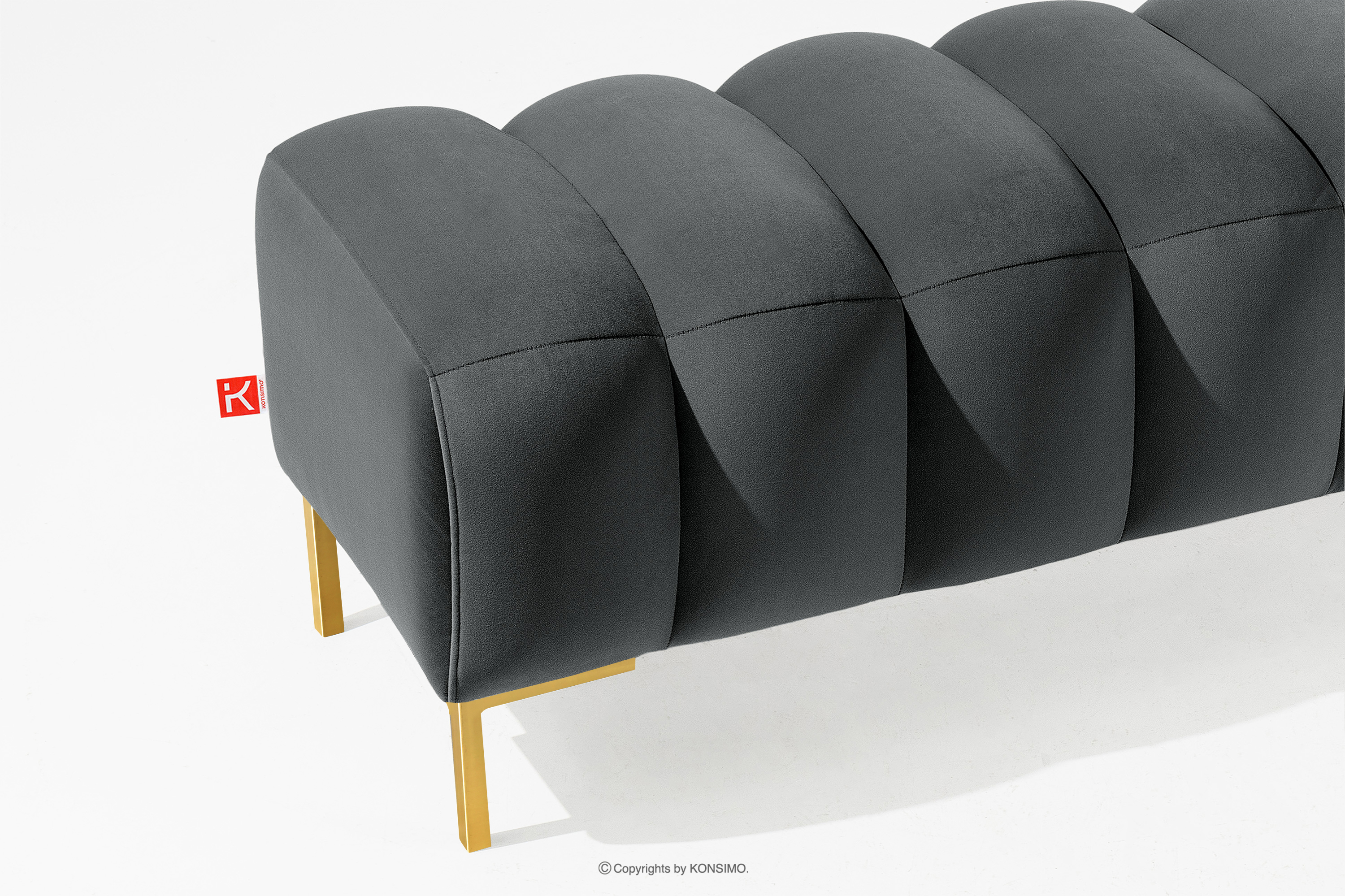 Der breite Sitzhocker mit goldenen Beinen 160 for corridor dark grey verbindet Funktionalität mit Ästhetik. Die hohen Beine verleihen der gesamten Komposition Eleganz und Leichtigkeit und bilden einen auffälligen Kontrast zur weichen Sitzfläche. Die präzisen Steppungen sind ein weiteres Element, das diesem Möbelstück seinen einzigartigen Charakter verleiht. Die sorgfältige Verarbeitung und die Aufmerksamkeit für jede Naht machen den Sitzhocker nicht nur zu einem praktischen Möbelstück, sondern auch zu einem Designerstück.