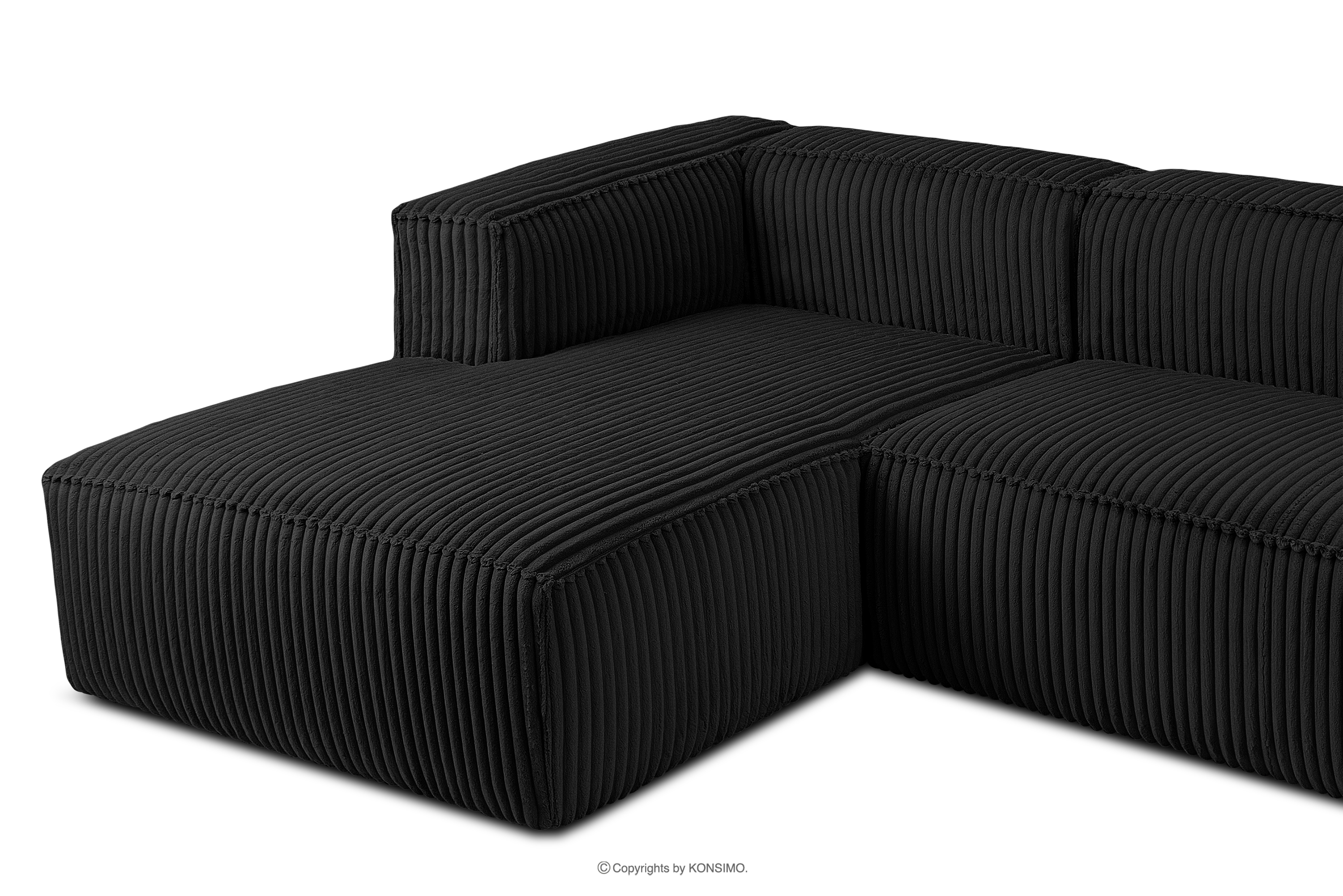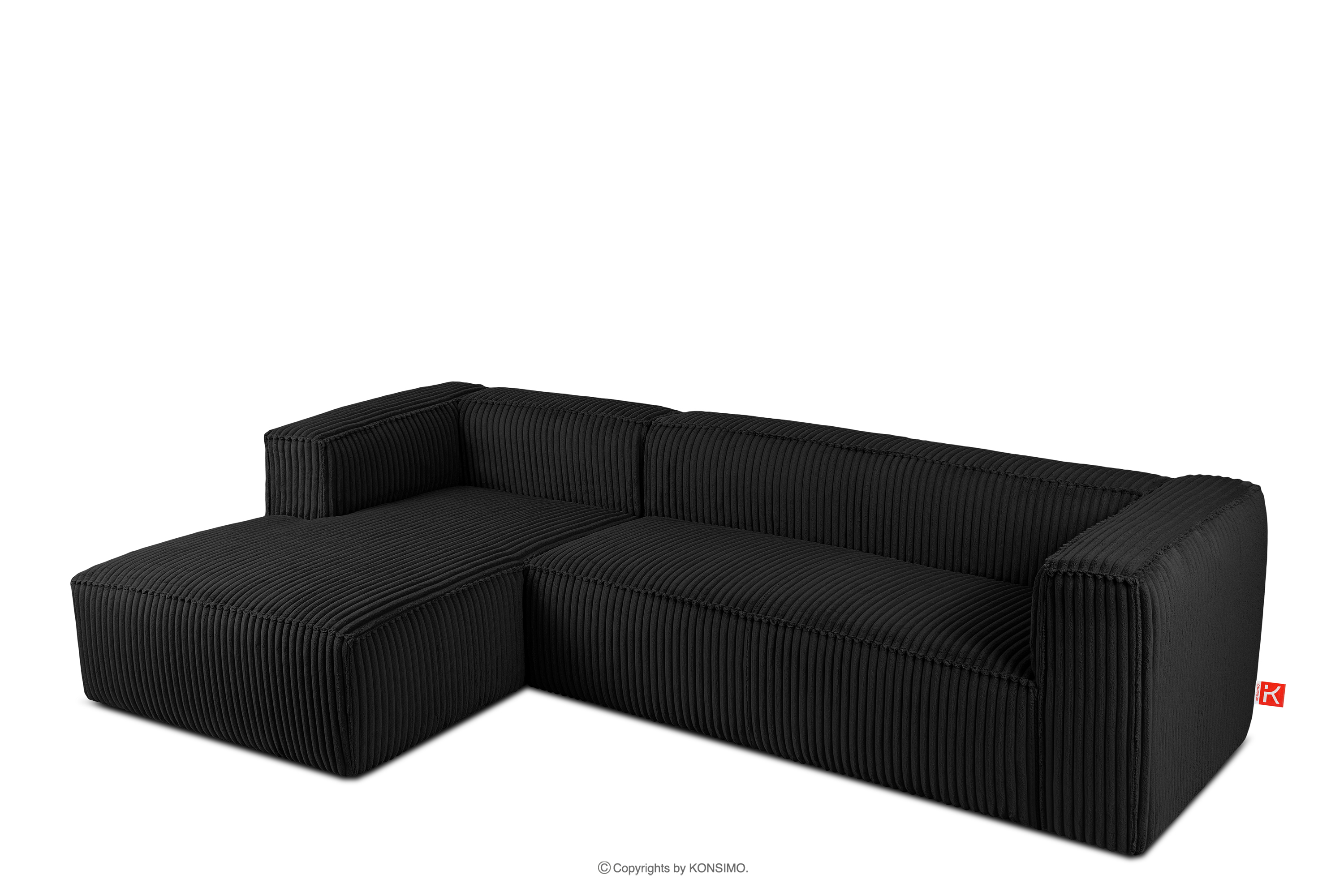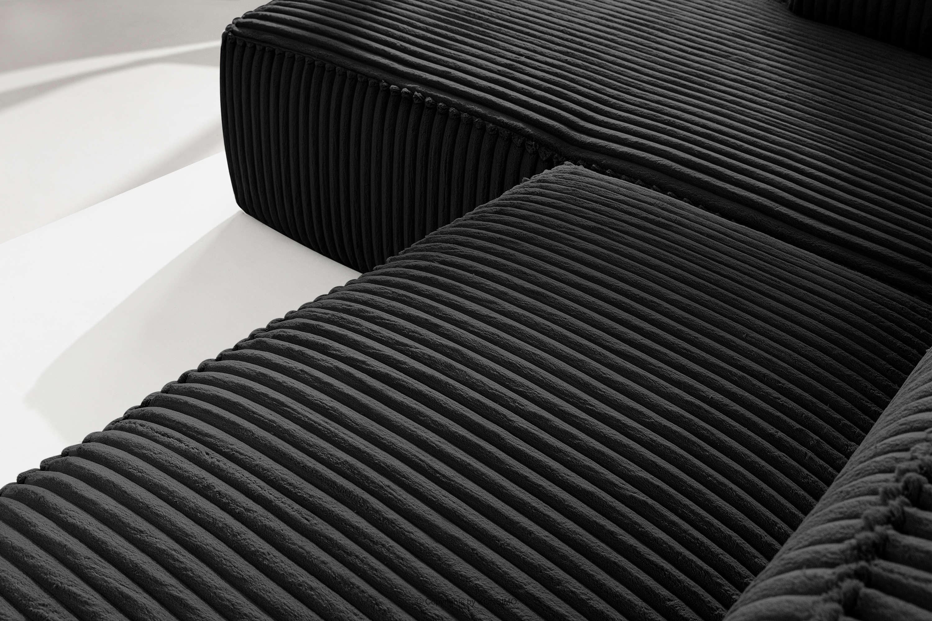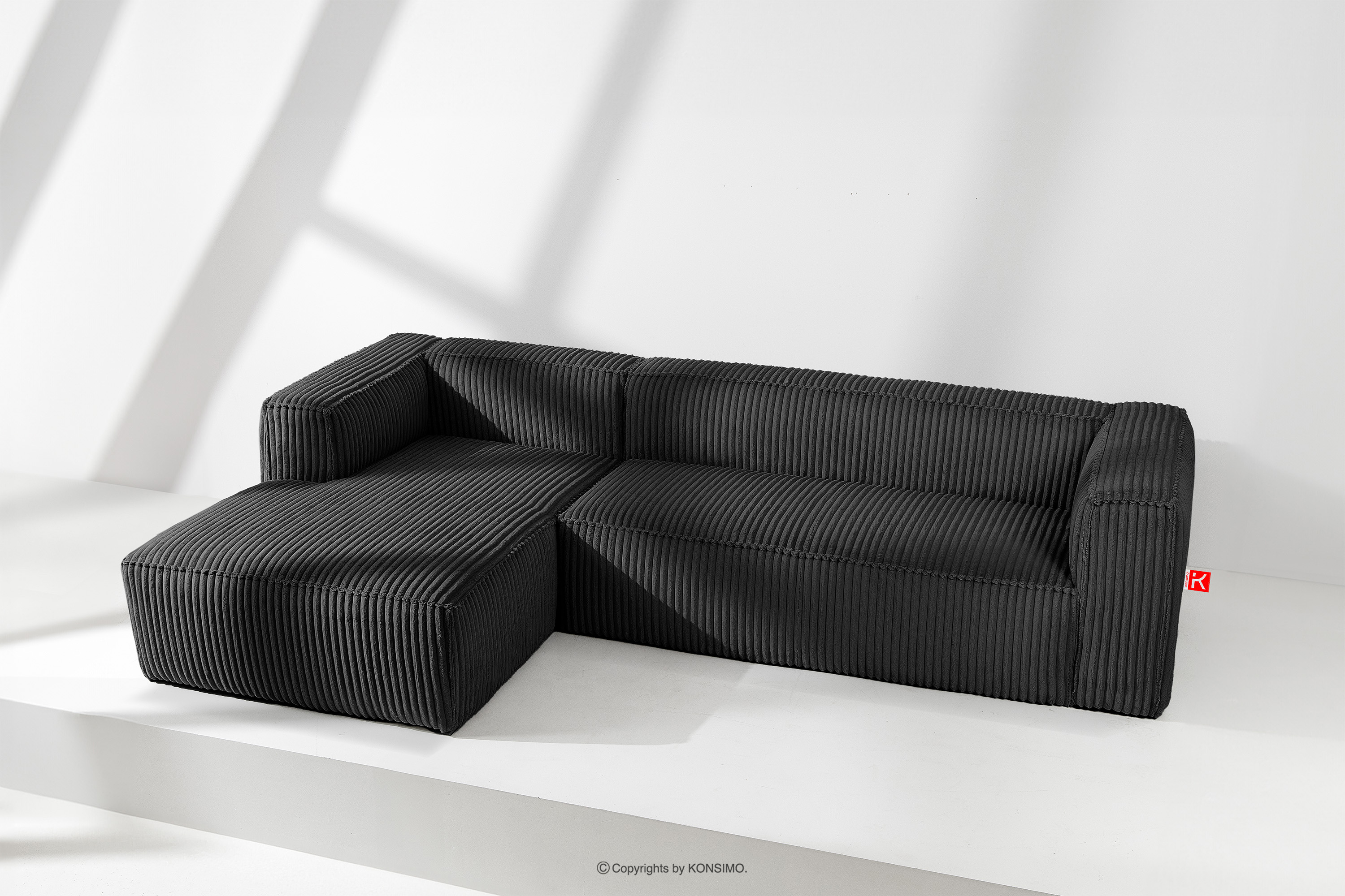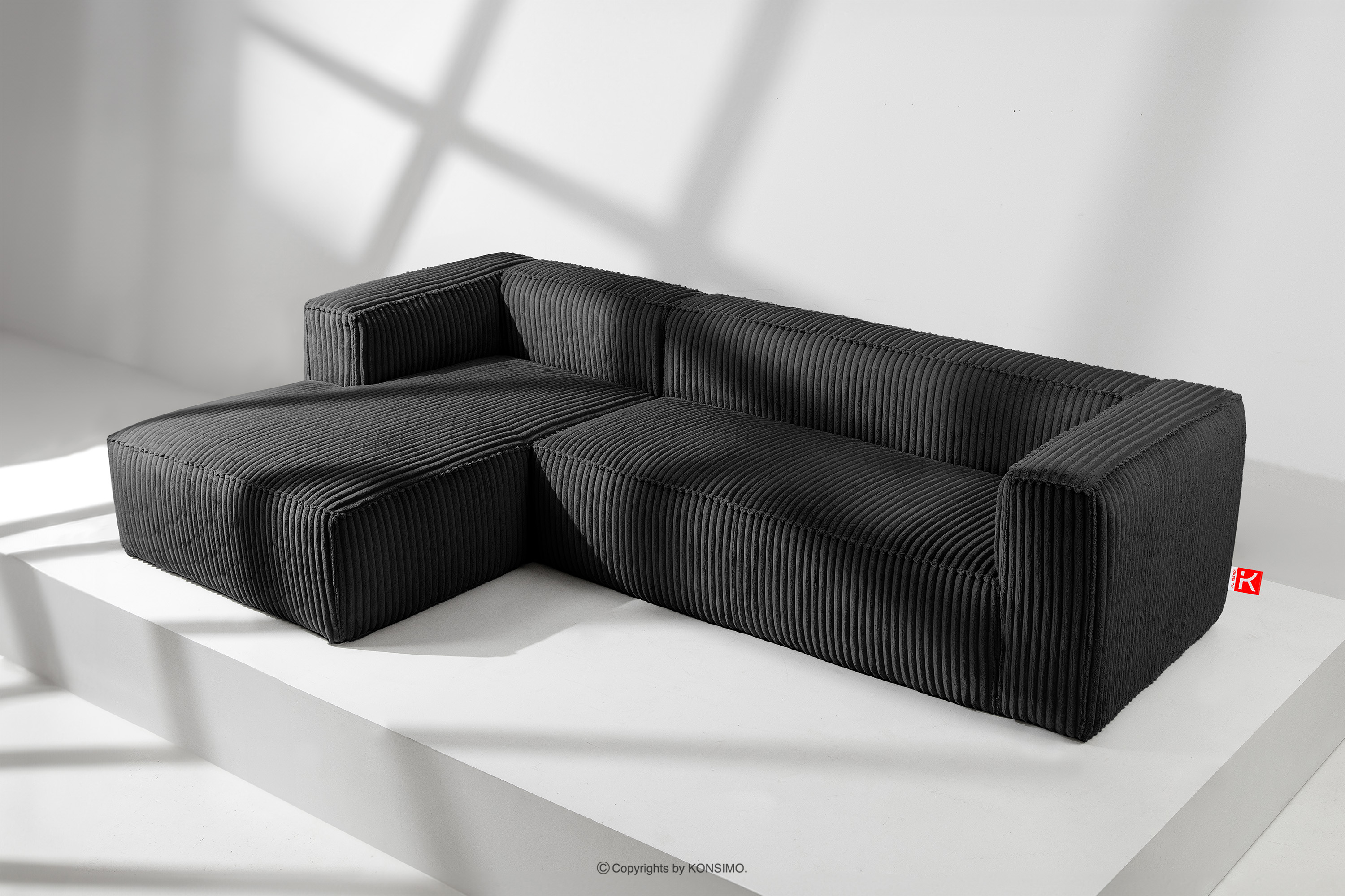 Großes schwarzes Ecksofa aus Kordstoff links mit einer soliden Konstruktion und außergewöhnlichem Design. Das Gestell dieses eleganten Möbelstücks wurde aus einer Kombination von Kiefern- und Buchenholz gefertigt, was nicht nur ein ästhetisch ansprechendes Aussehen, sondern auch eine jahrelange Haltbarkeit gewährleistet. Der Innenraum wird von einer soliden Konstruktion aus Span- und Faserplatten getragen, die Stabilität und Nutzungskomfort garantiert.