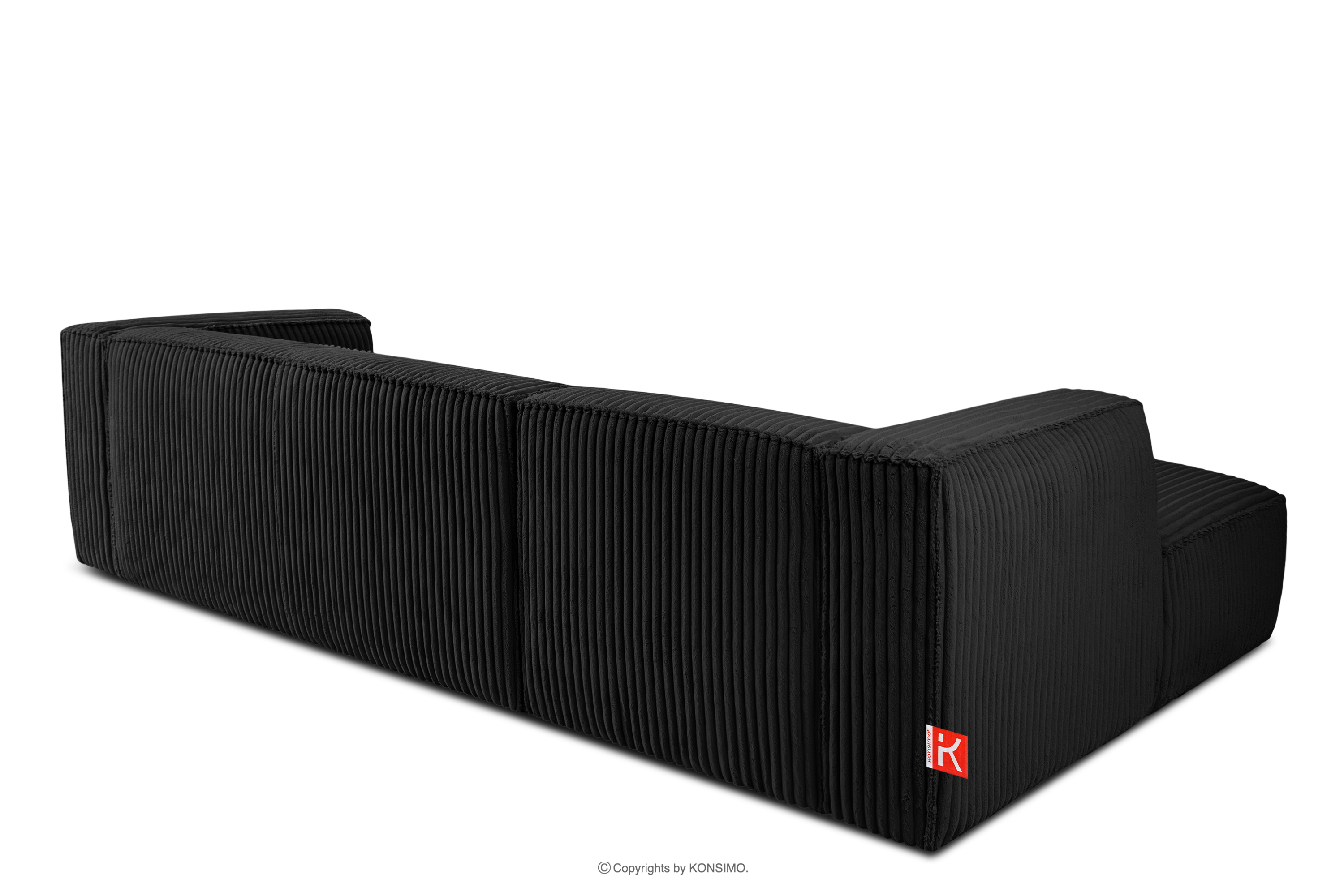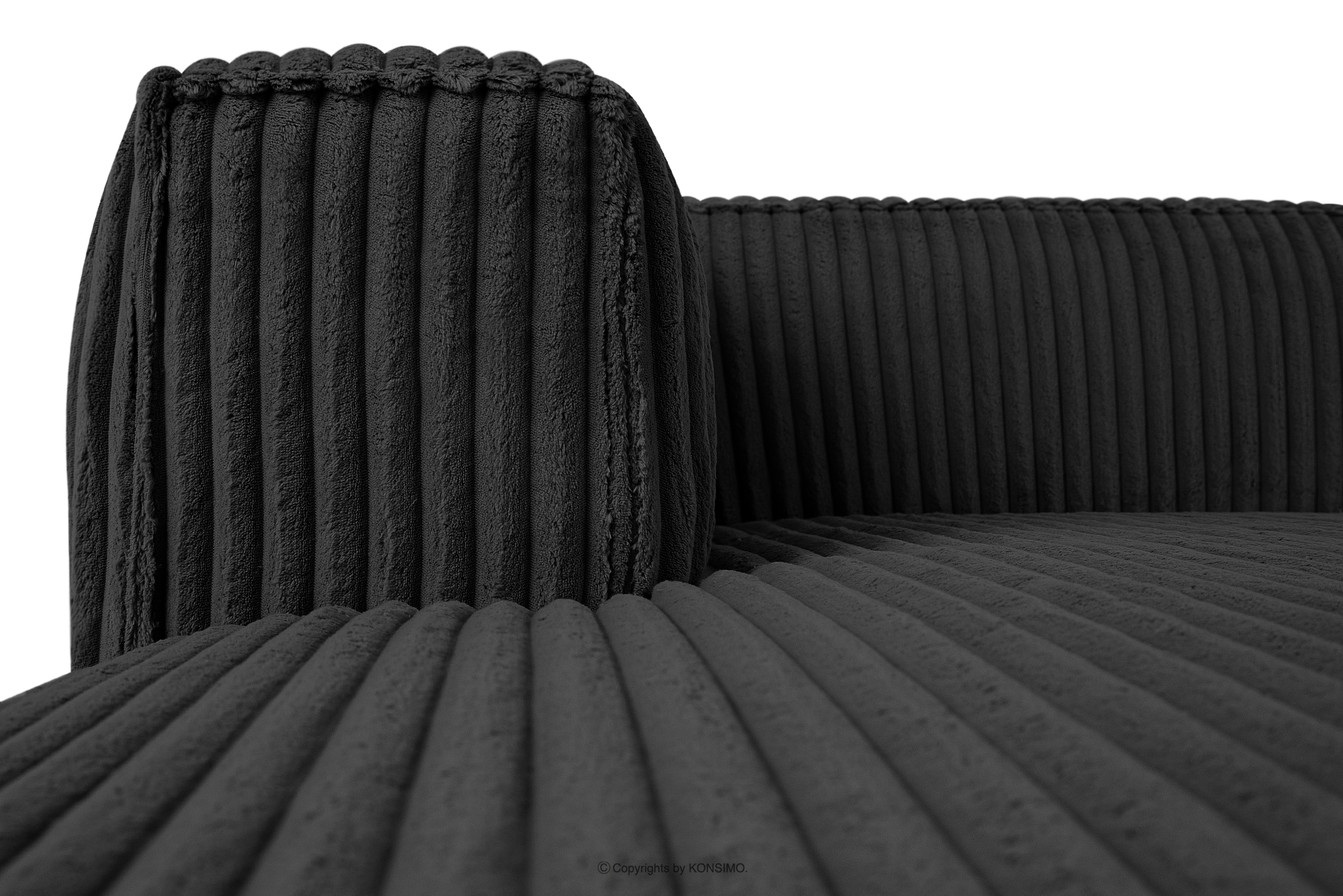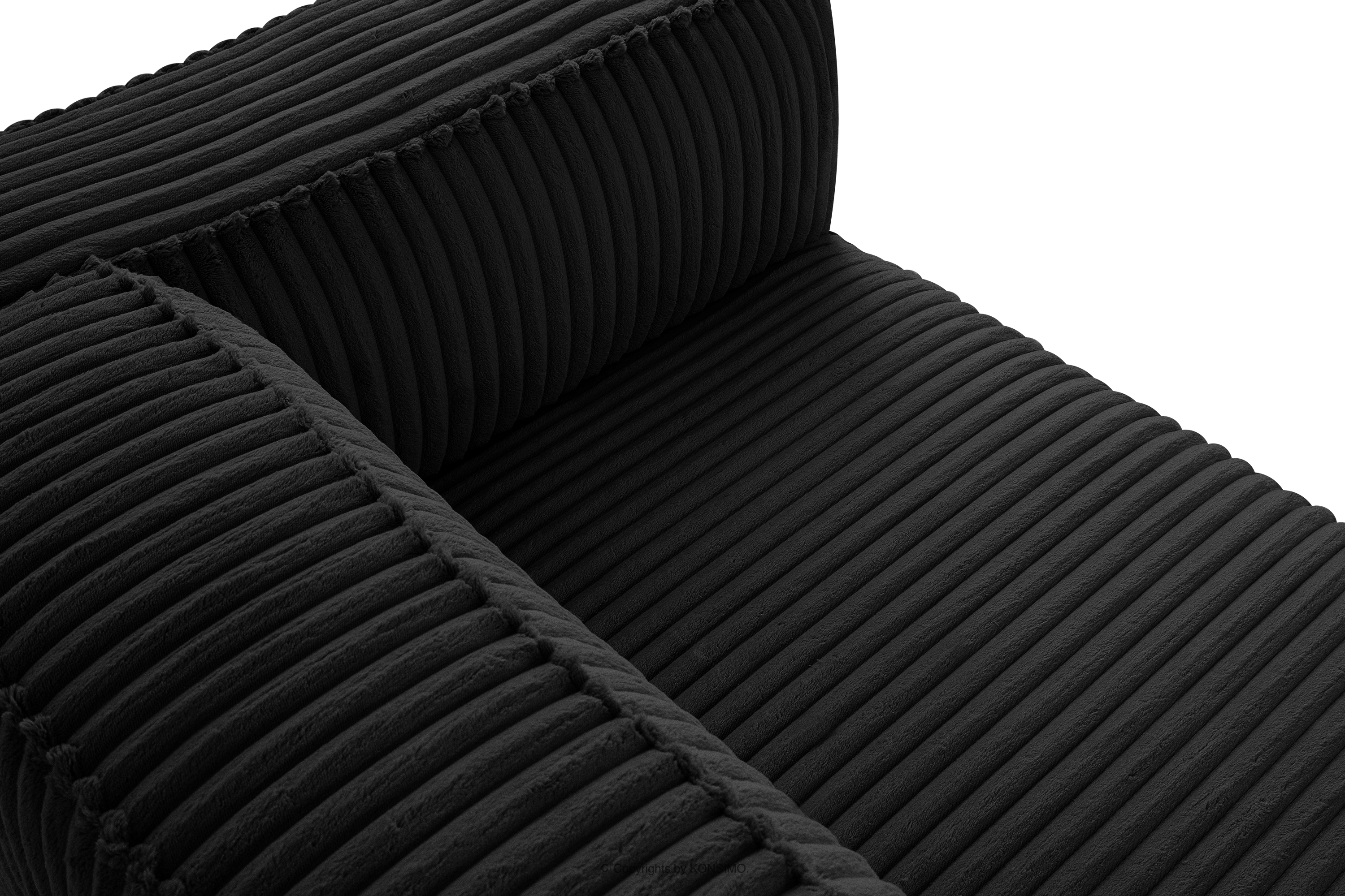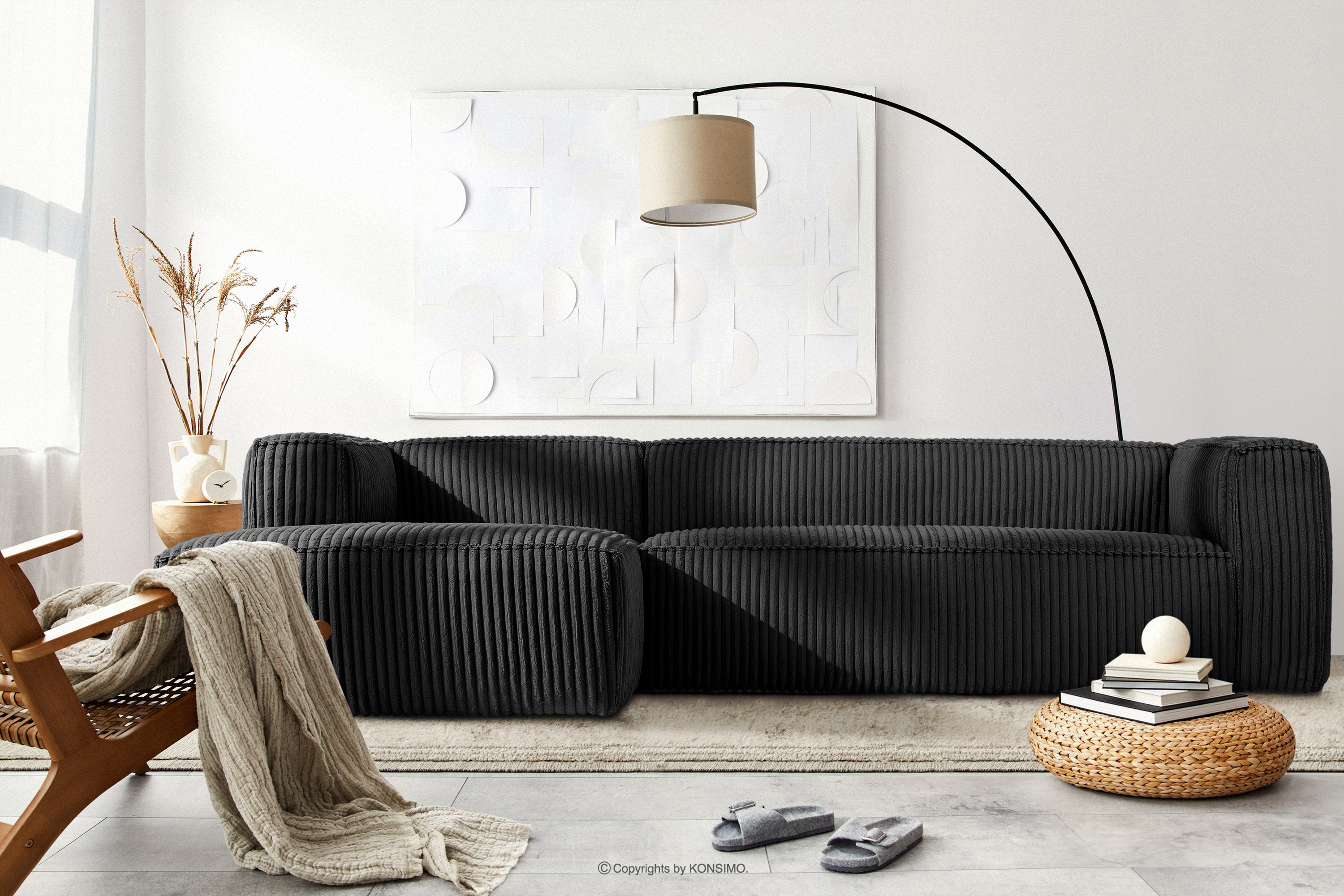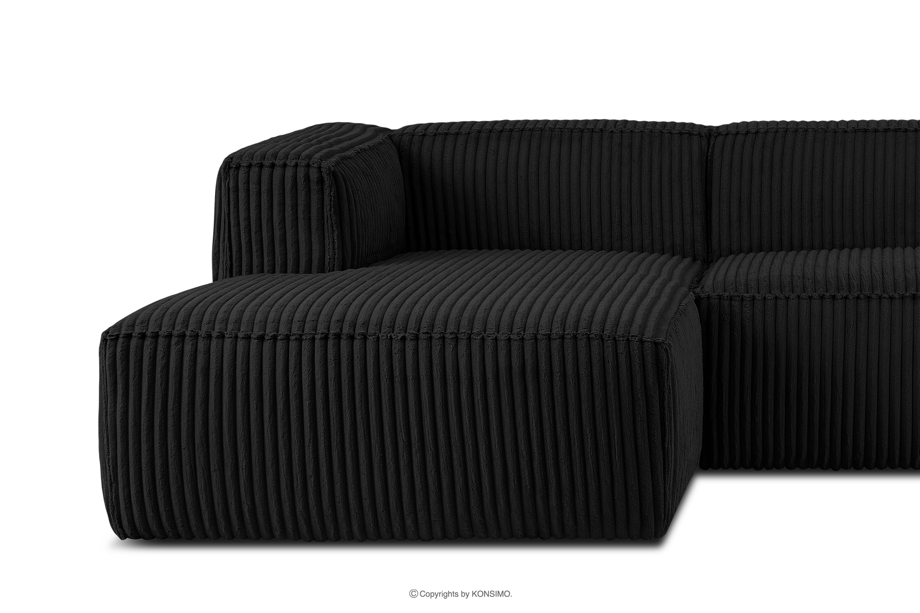 Großes schwarzes Ecksofa aus Kordstoff links mit einer soliden Konstruktion und außergewöhnlichem Design. Das Gestell dieses eleganten Möbelstücks wurde aus einer Kombination von Kiefern- und Buchenholz gefertigt, was nicht nur ein ästhetisch ansprechendes Aussehen, sondern auch eine jahrelange Haltbarkeit gewährleistet. Der Innenraum wird von einer soliden Konstruktion aus Span- und Faserplatten getragen, die Stabilität und Nutzungskomfort garantiert.