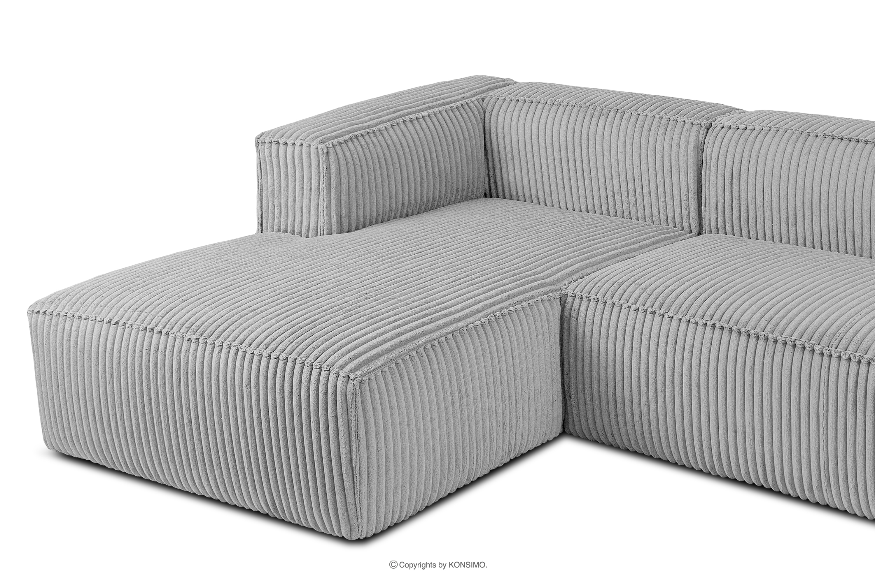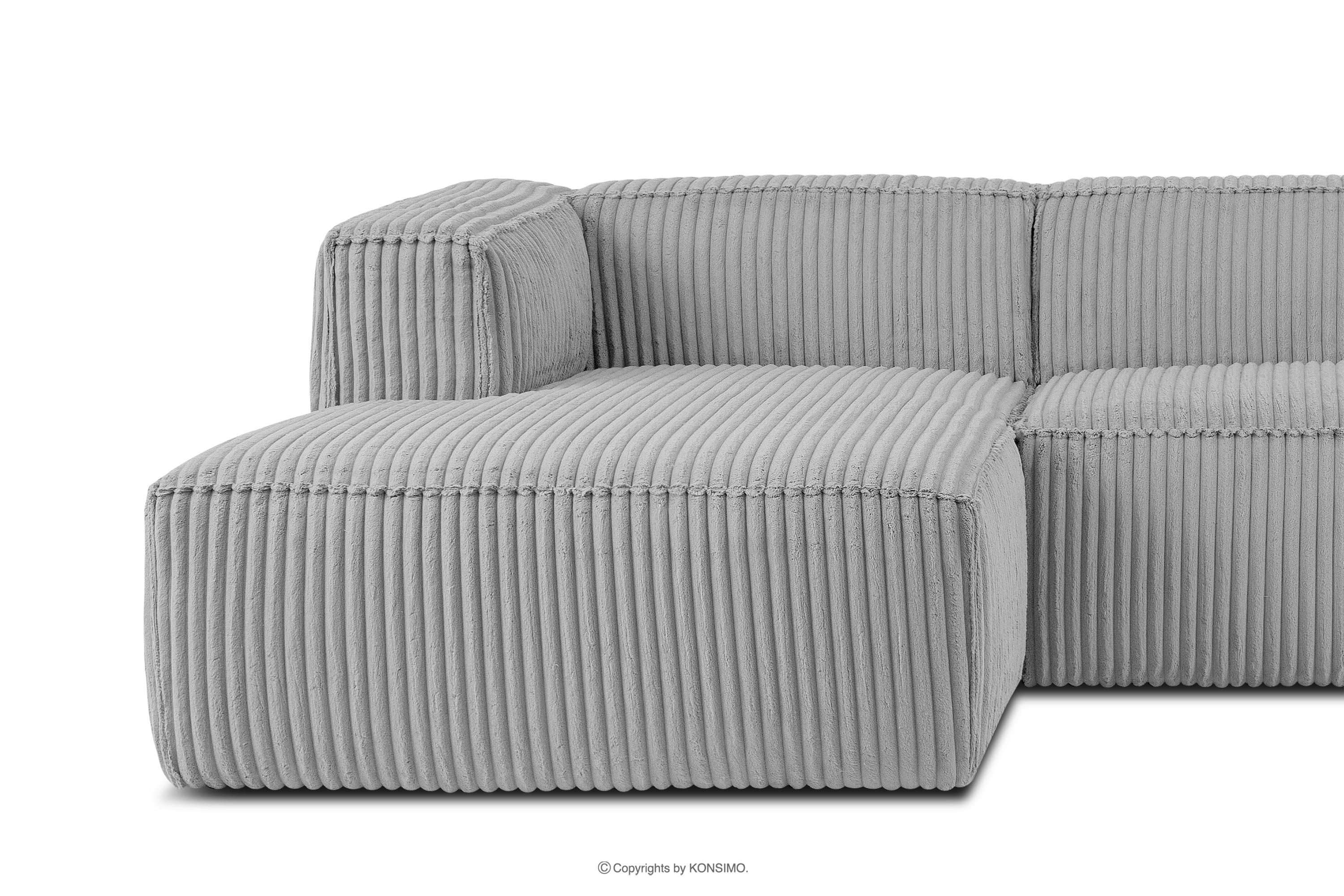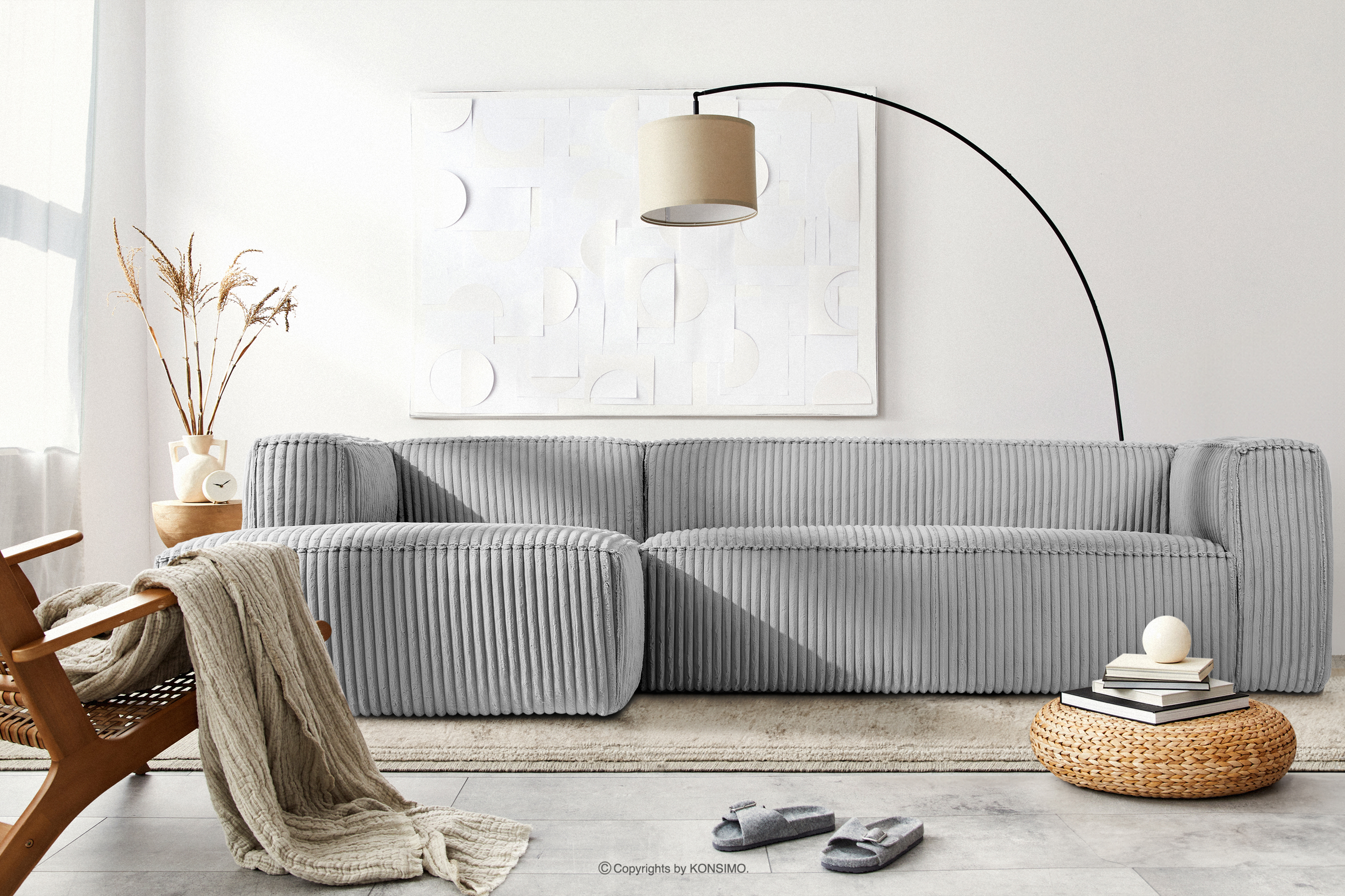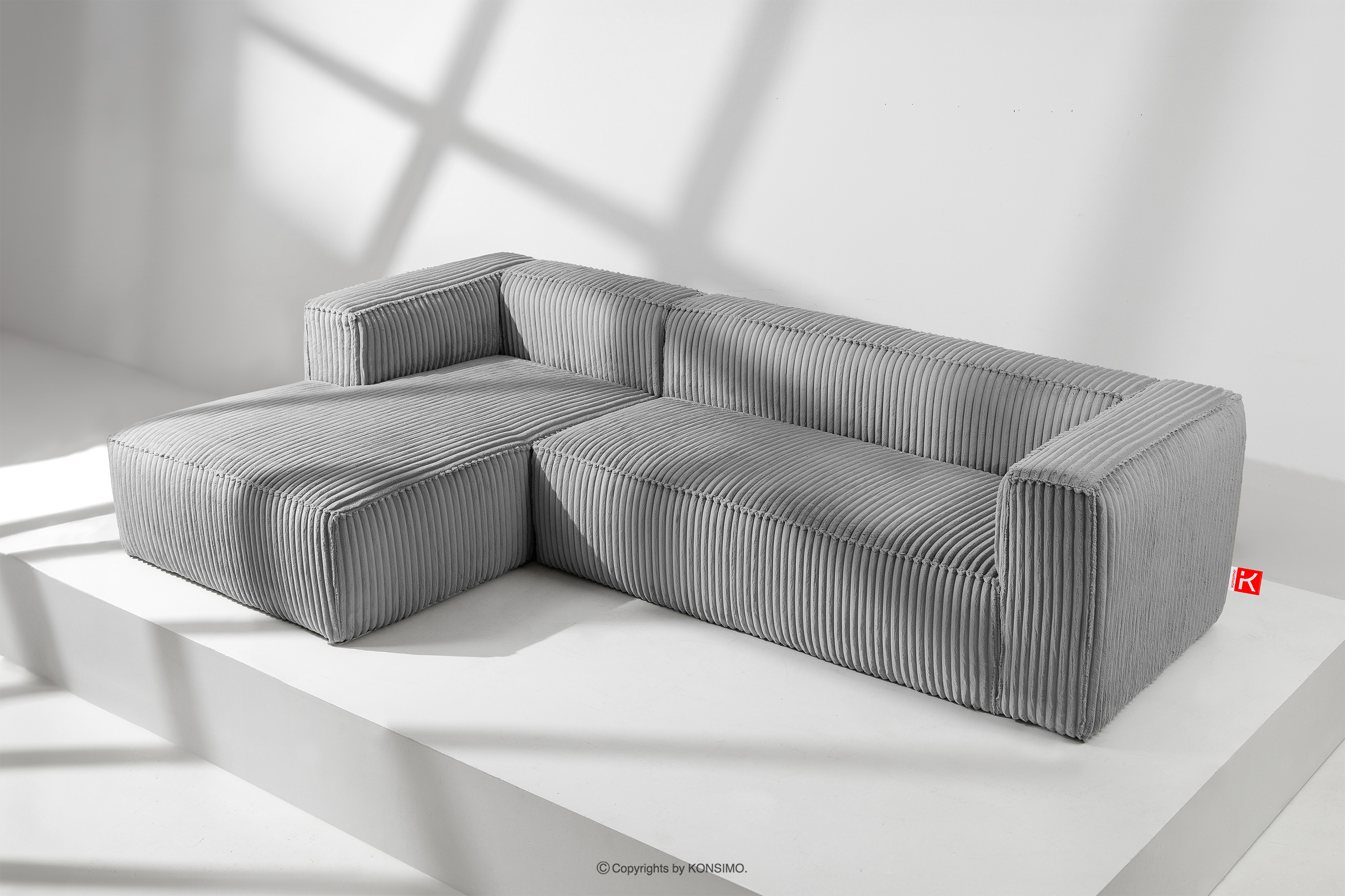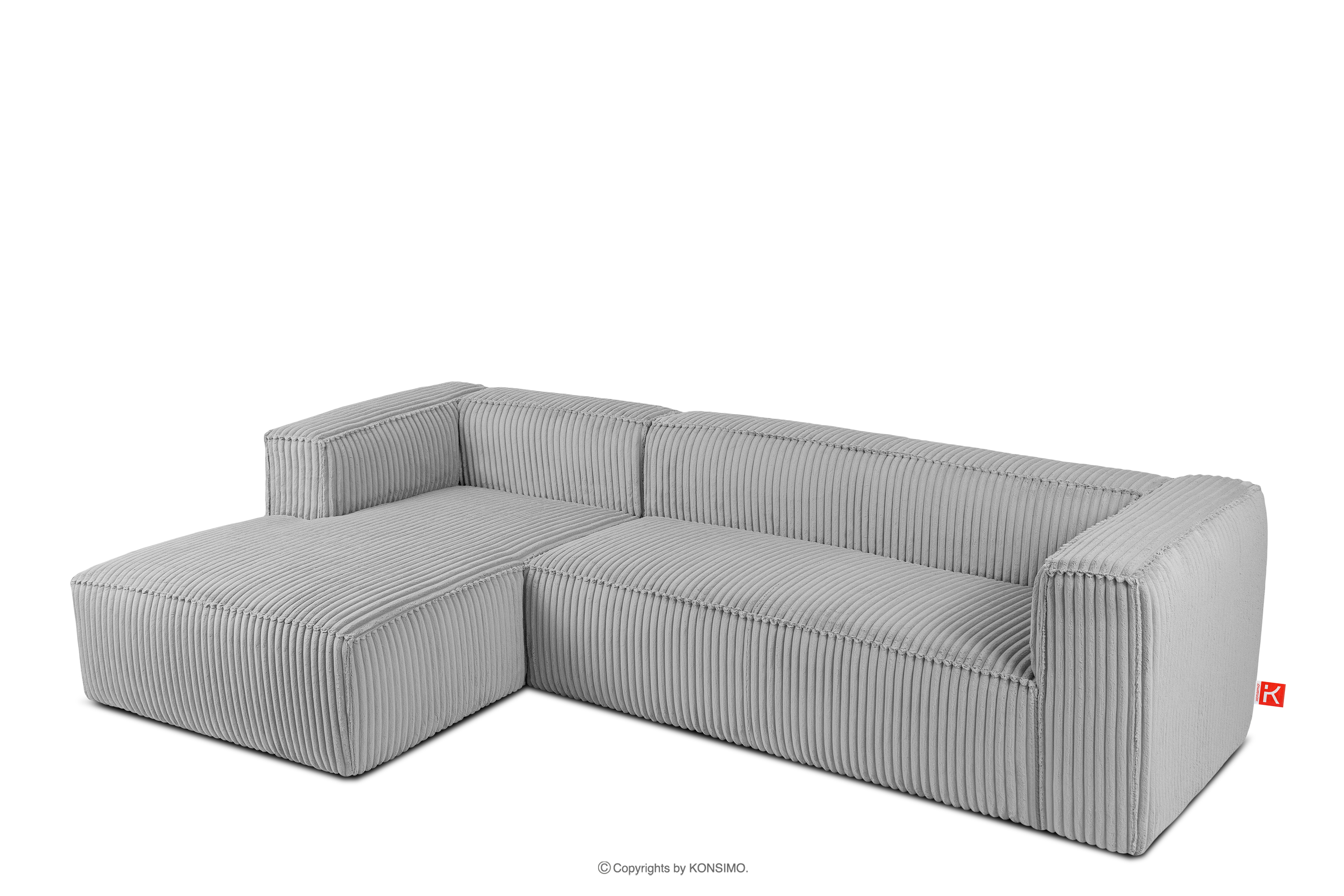 Großes hellgraues Ecksofa aus Kordstoff links mit einer soliden Konstruktion und einem außergewöhnlichen Design. Das Gestell dieses eleganten Möbelstücks wurde aus einer Kombination von Kiefern- und Buchenholz gefertigt, was nicht nur ein ästhetisch ansprechendes Aussehen, sondern auch eine jahrelange Haltbarkeit gewährleistet. Der Innenraum wird von einer soliden Konstruktion aus Span- und Faserplatten getragen, die Stabilität und Nutzungskomfort garantiert.
