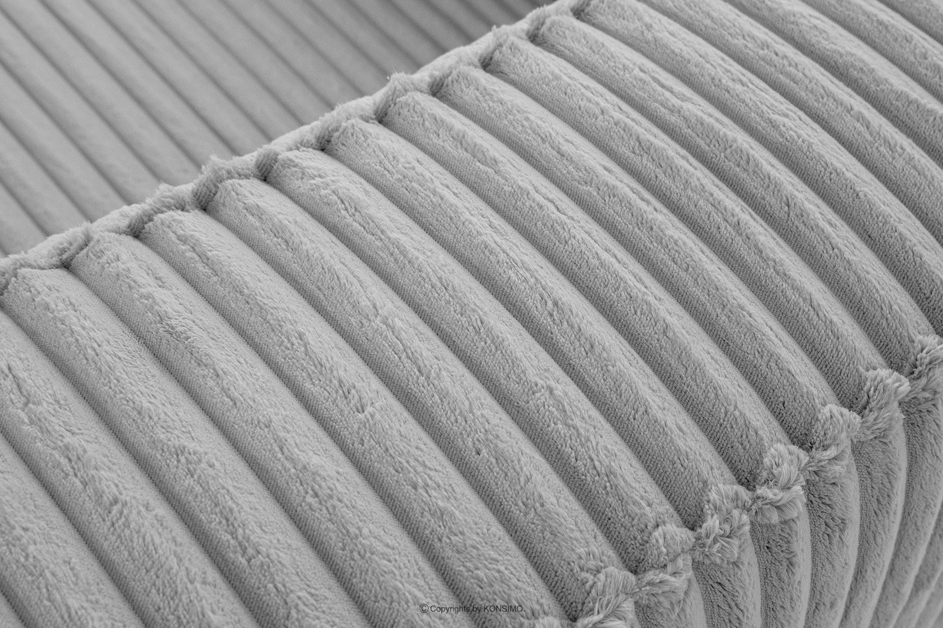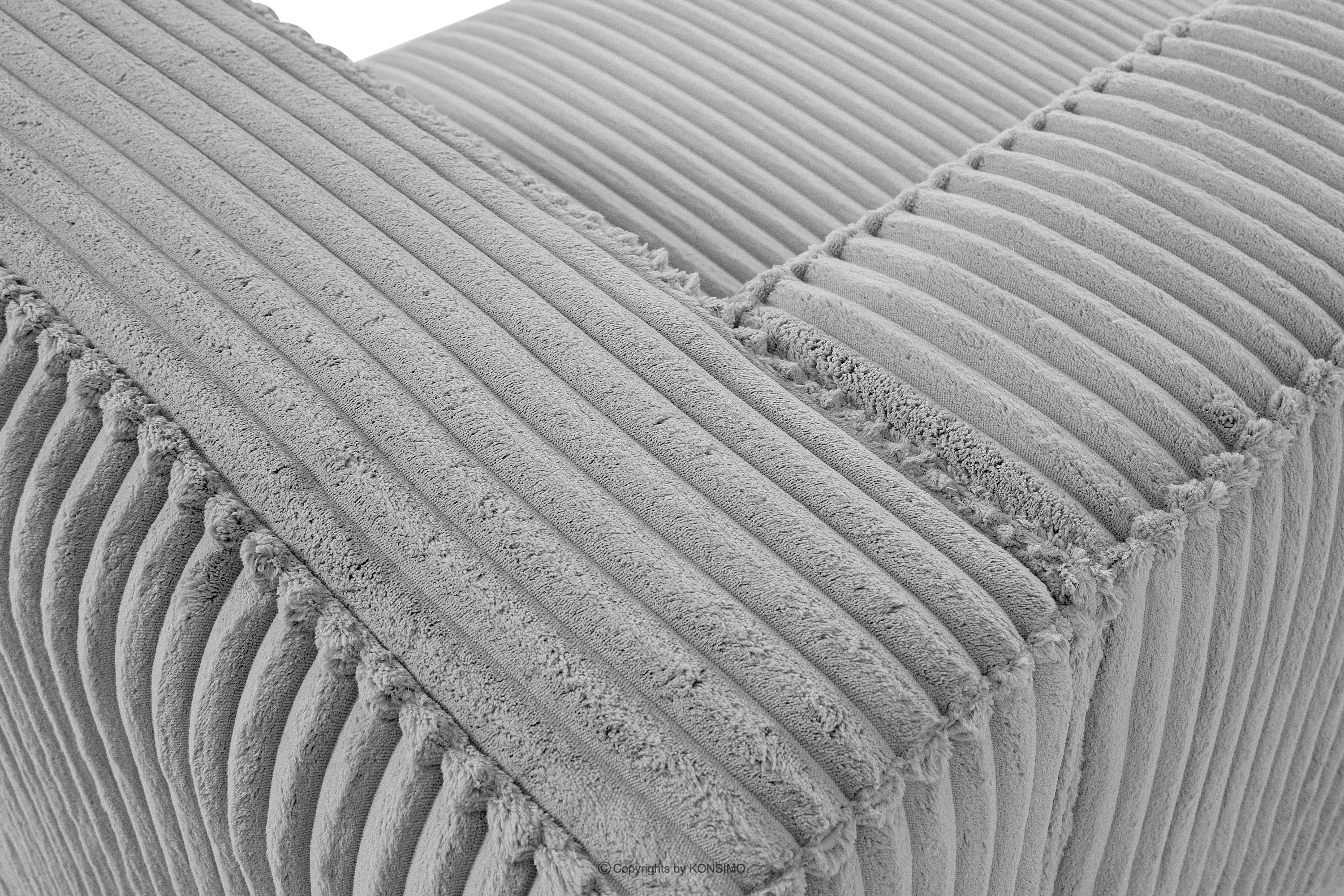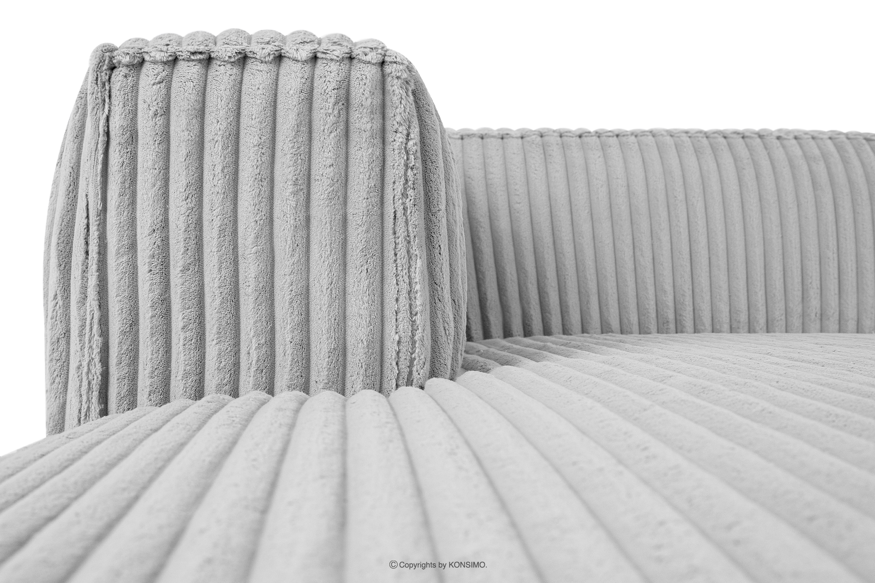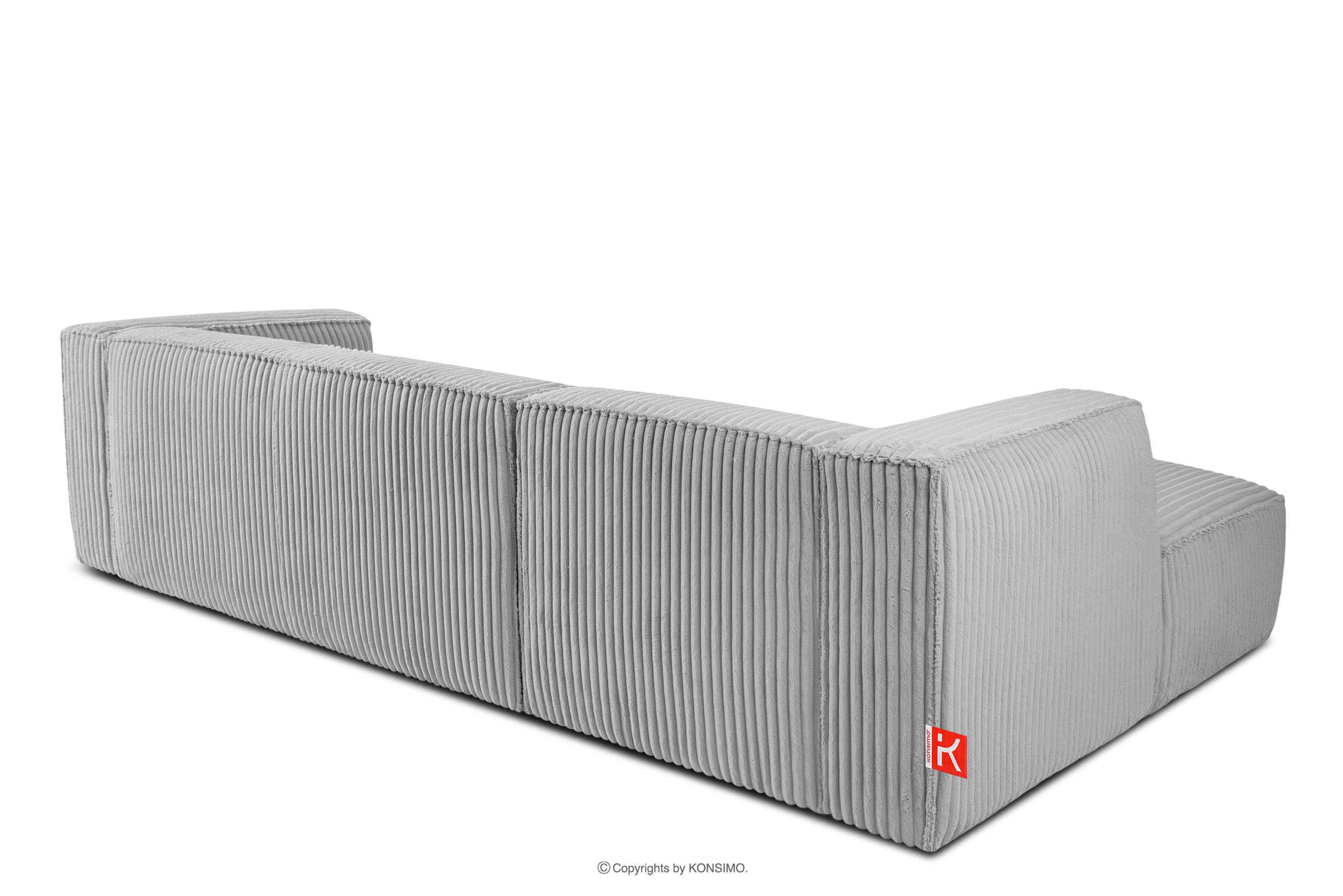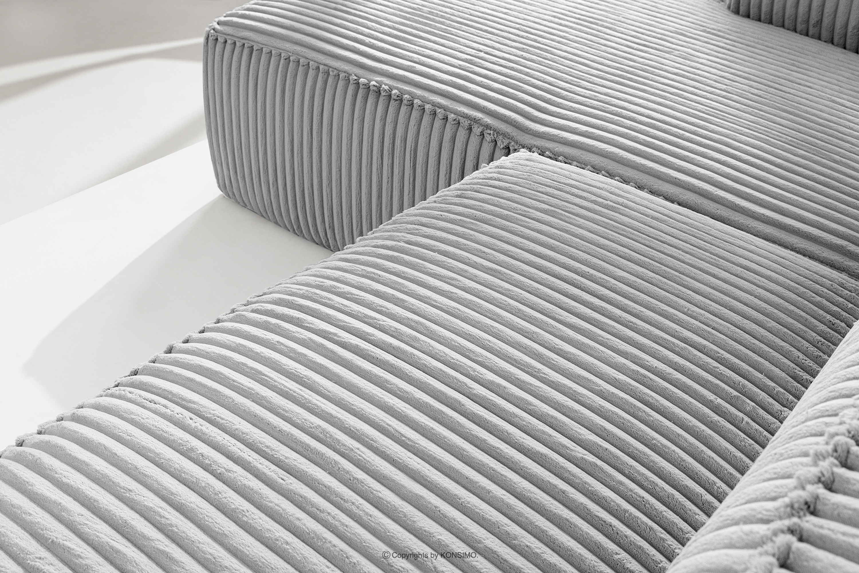 Großes hellgraues Ecksofa aus Kordstoff links mit einer soliden Konstruktion und einem außergewöhnlichen Design. Das Gestell dieses eleganten Möbelstücks wurde aus einer Kombination von Kiefern- und Buchenholz gefertigt, was nicht nur ein ästhetisch ansprechendes Aussehen, sondern auch eine jahrelange Haltbarkeit gewährleistet. Der Innenraum wird von einer soliden Konstruktion aus Span- und Faserplatten getragen, die Stabilität und Nutzungskomfort garantiert.