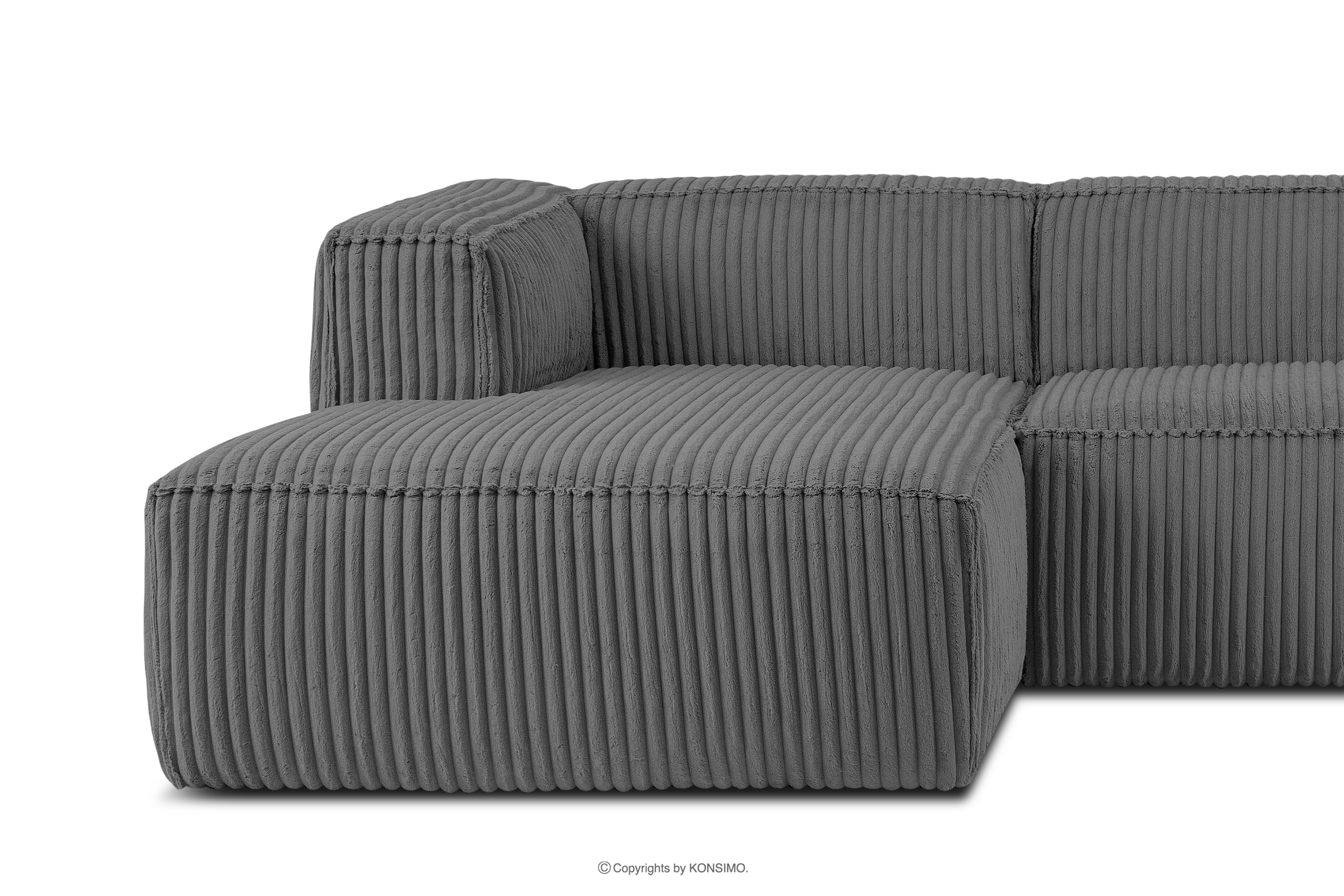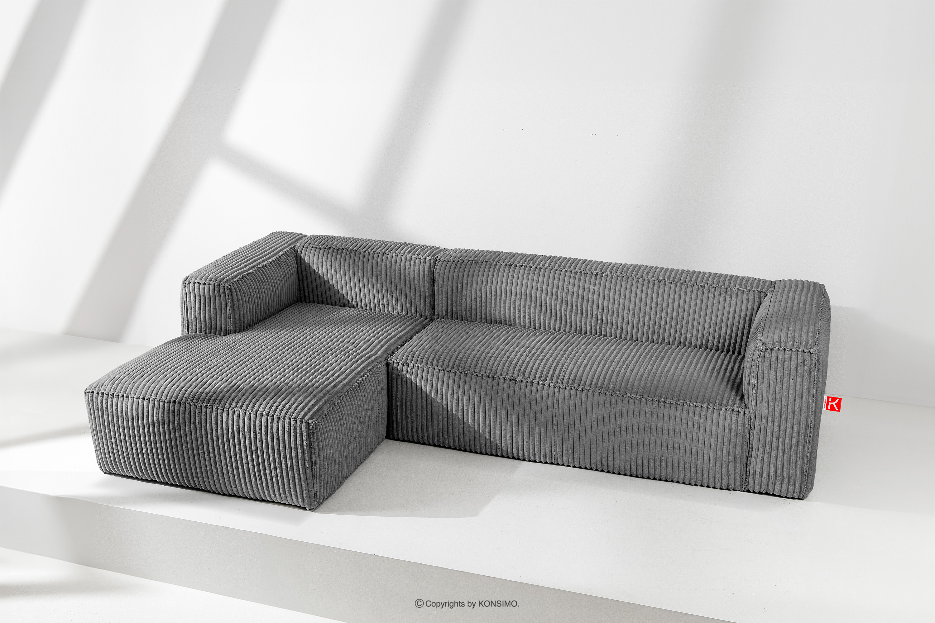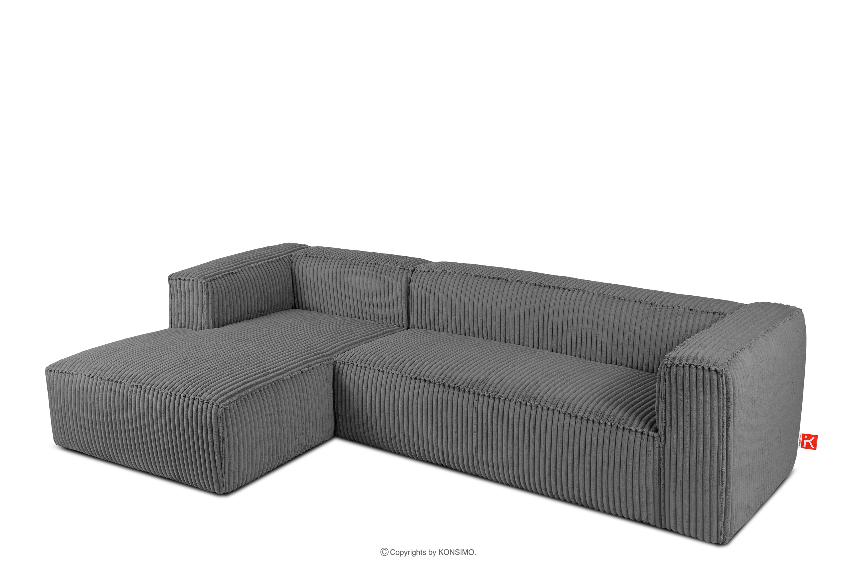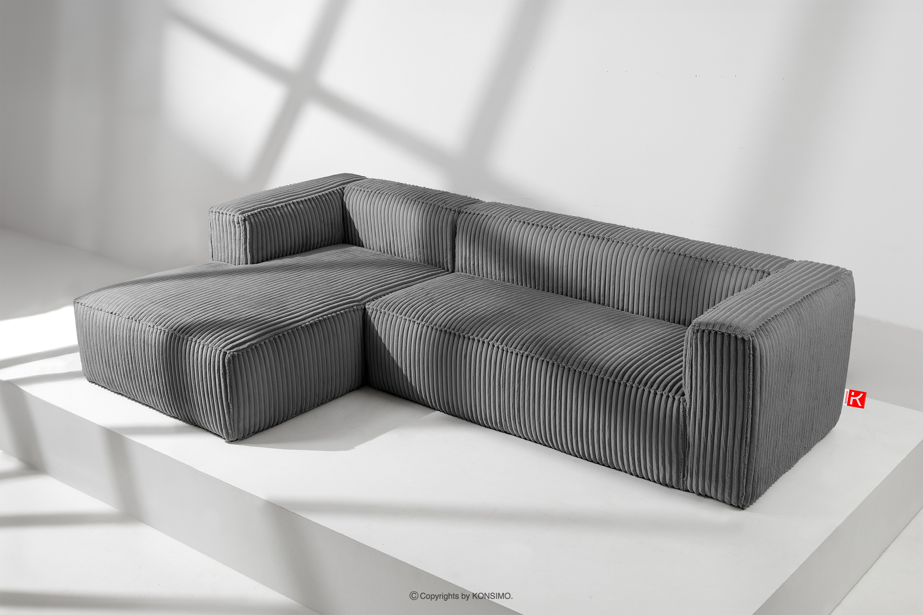 Großes dunkelgraues Ecksofa aus Kordstoff links mit einer soliden Konstruktion und einem außergewöhnlichen Design. Das Gestell dieses eleganten Möbelstücks wurde aus einer Kombination von Kiefern- und Buchenholz gefertigt, was nicht nur ein ästhetisch ansprechendes Aussehen, sondern auch eine jahrelange Haltbarkeit gewährleistet. Der Innenraum wird von einer soliden Konstruktion aus Span- und Faserplatten getragen, die Stabilität und Nutzungskomfort garantiert.