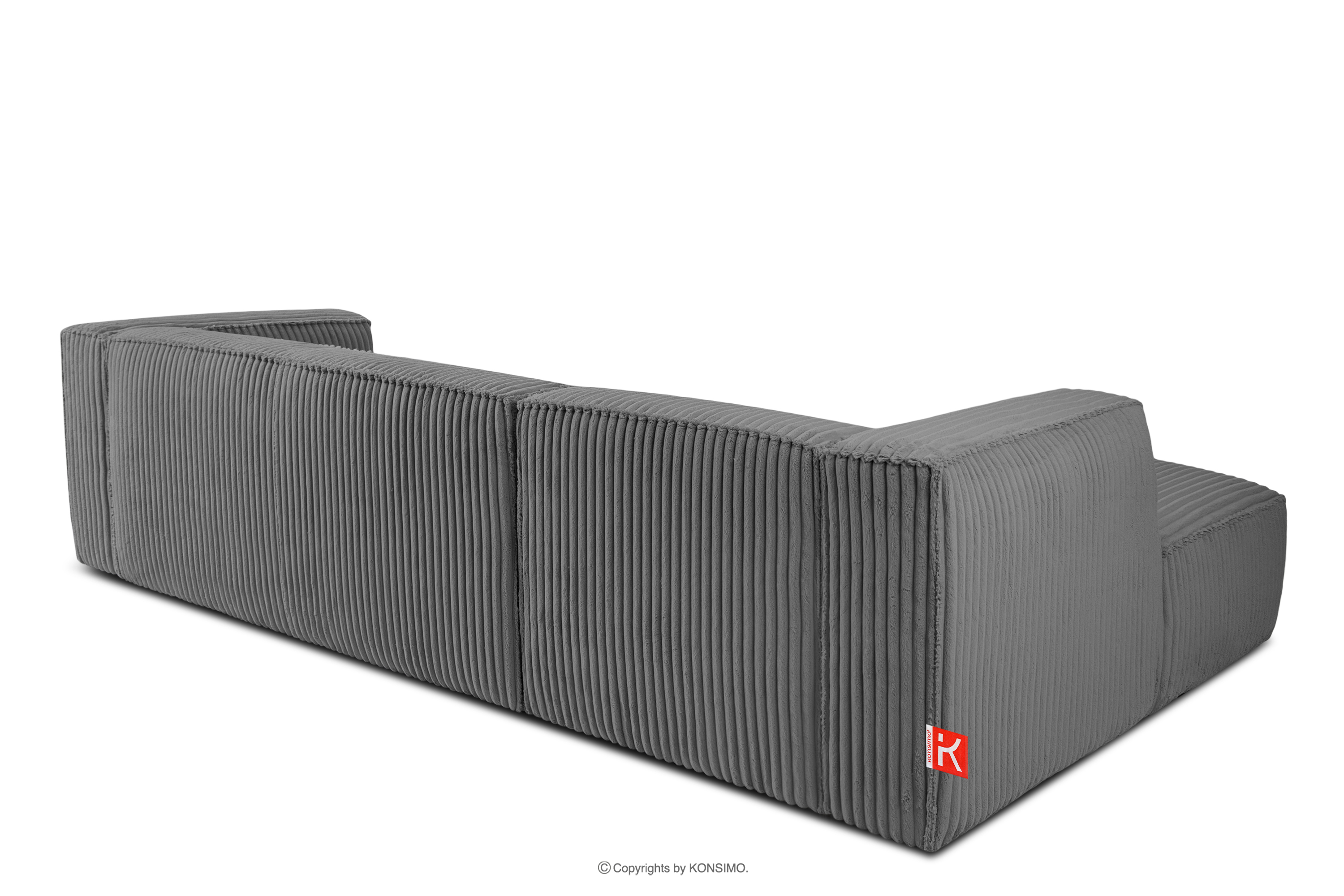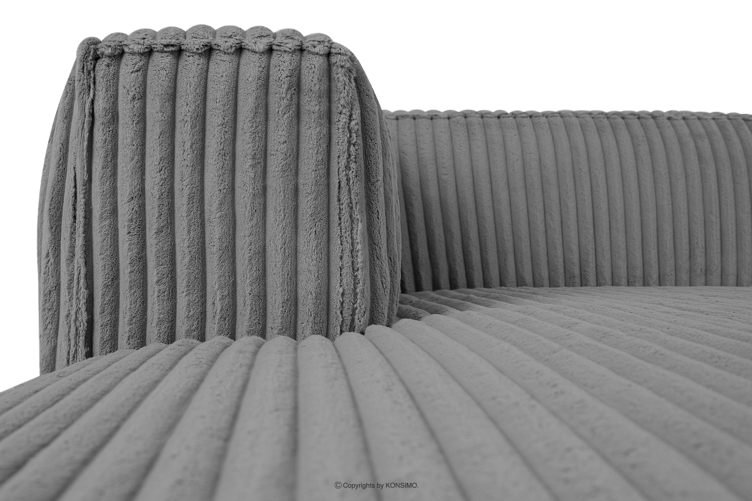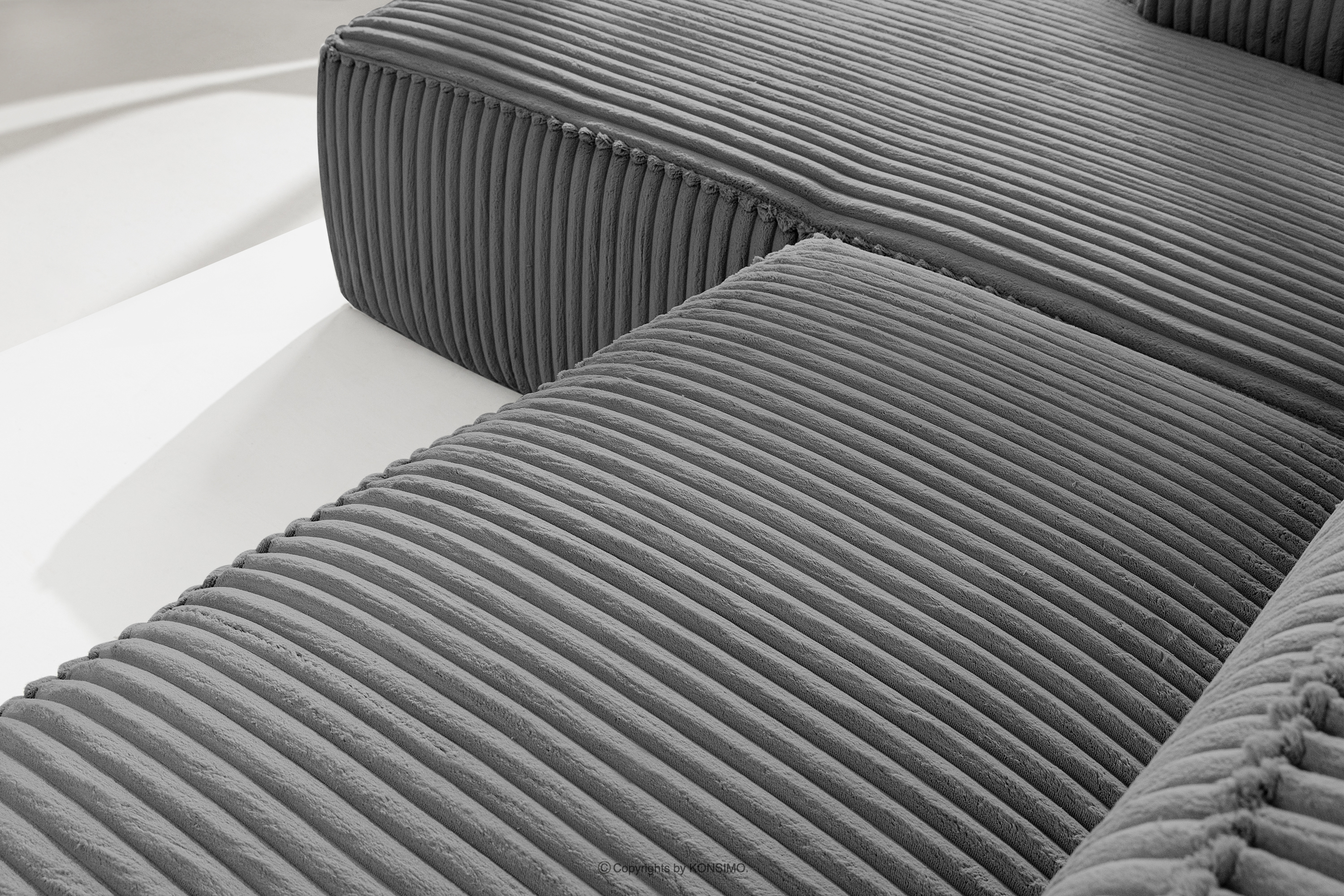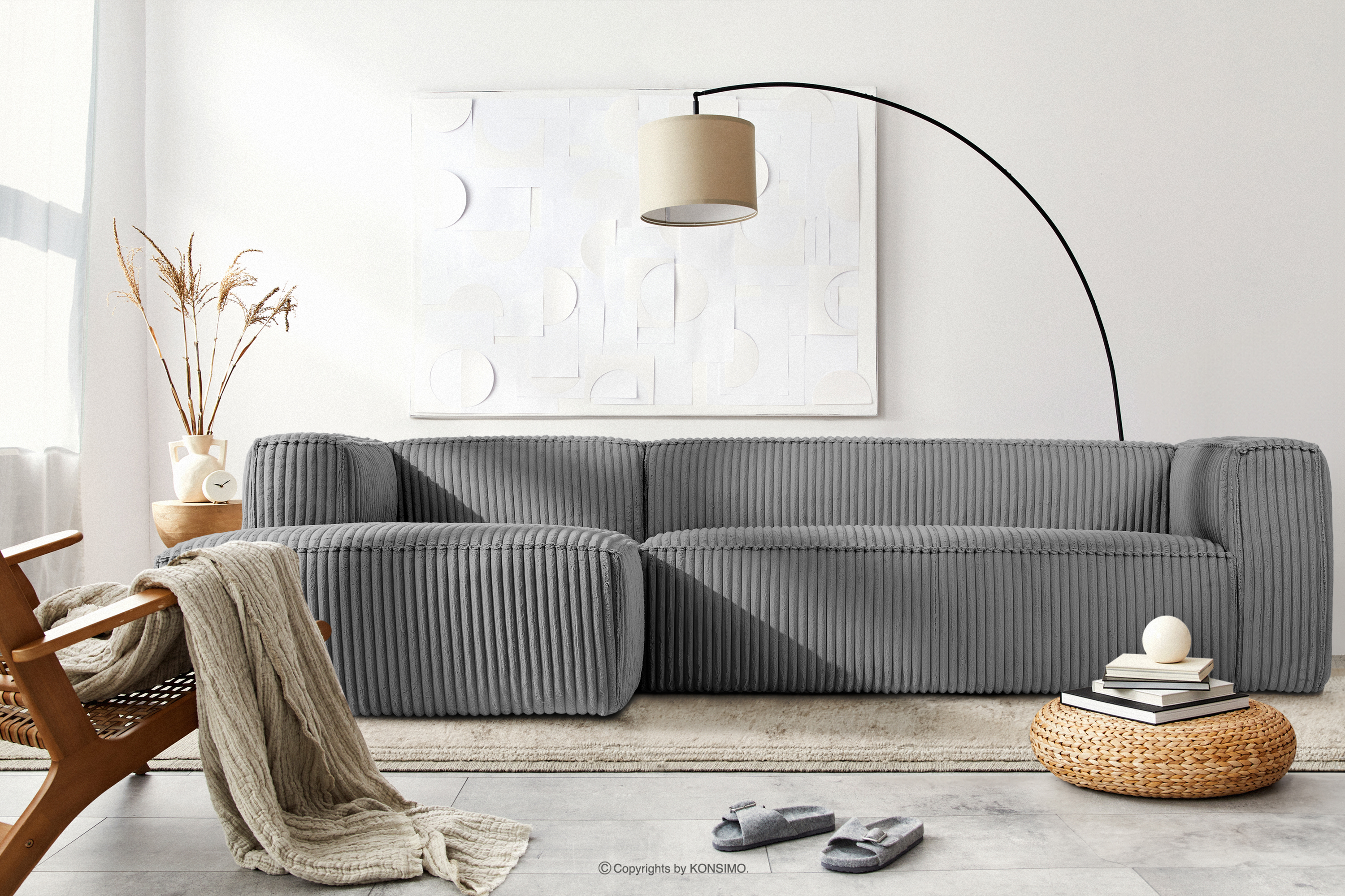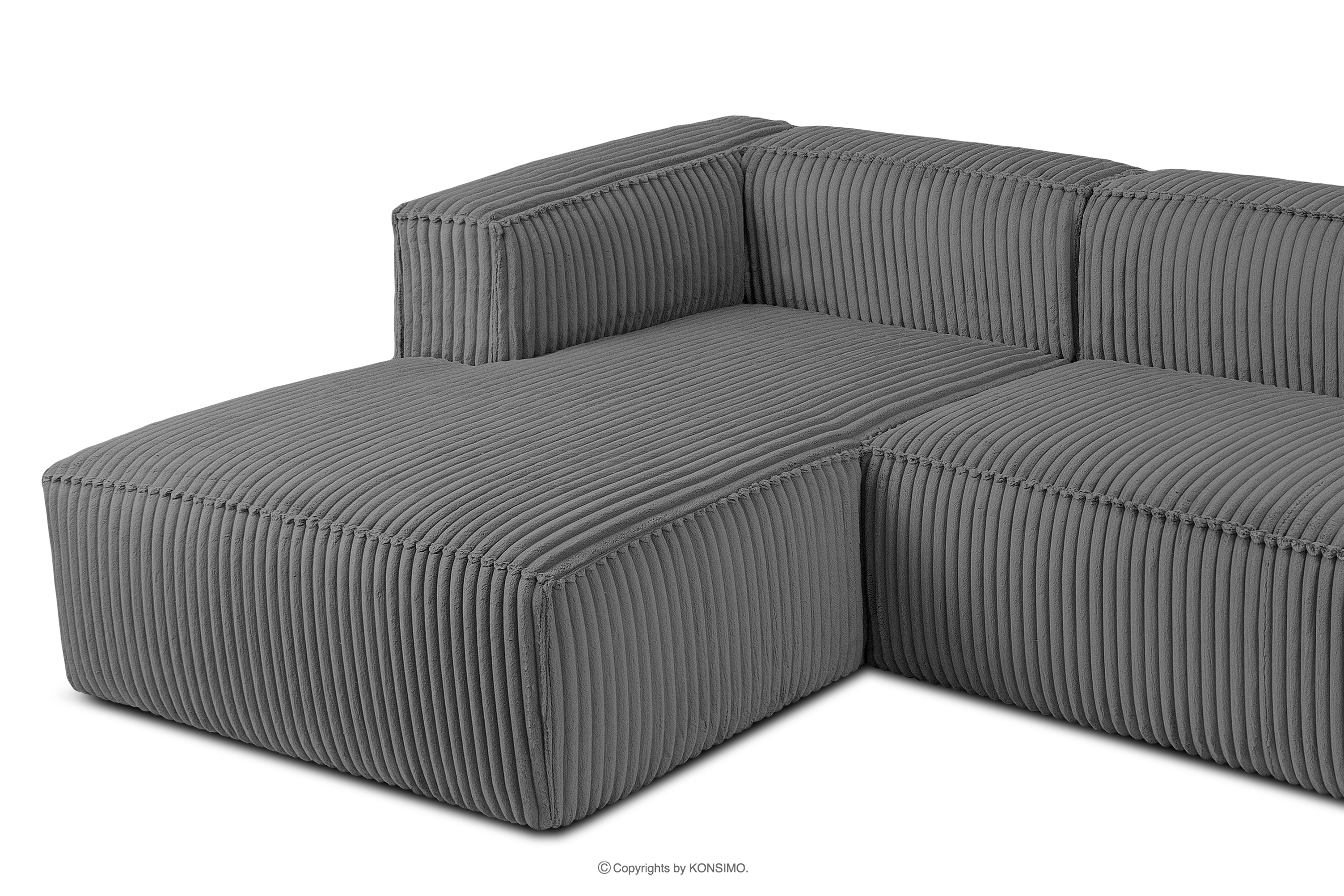 Großes dunkelgraues Ecksofa aus Kordstoff links mit einer soliden Konstruktion und einem außergewöhnlichen Design. Das Gestell dieses eleganten Möbelstücks wurde aus einer Kombination von Kiefern- und Buchenholz gefertigt, was nicht nur ein ästhetisch ansprechendes Aussehen, sondern auch eine jahrelange Haltbarkeit gewährleistet. Der Innenraum wird von einer soliden Konstruktion aus Span- und Faserplatten getragen, die Stabilität und Nutzungskomfort garantiert.