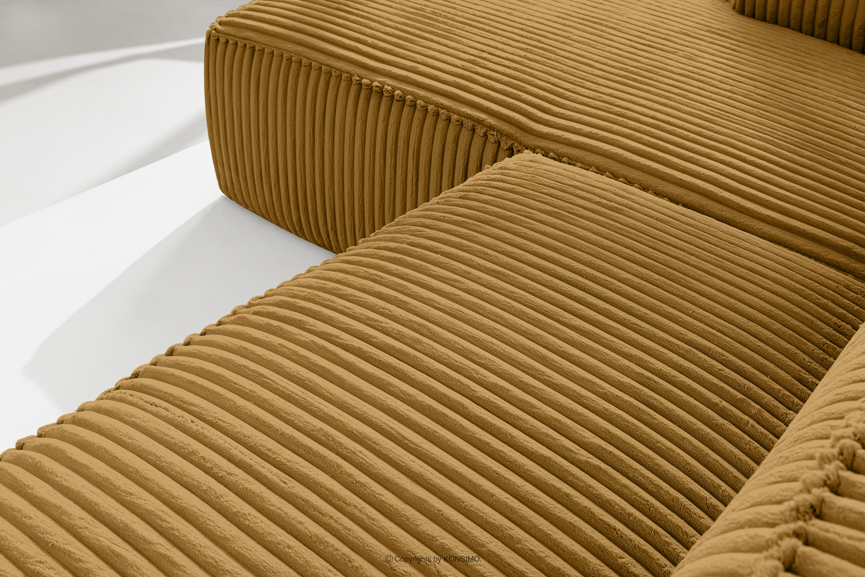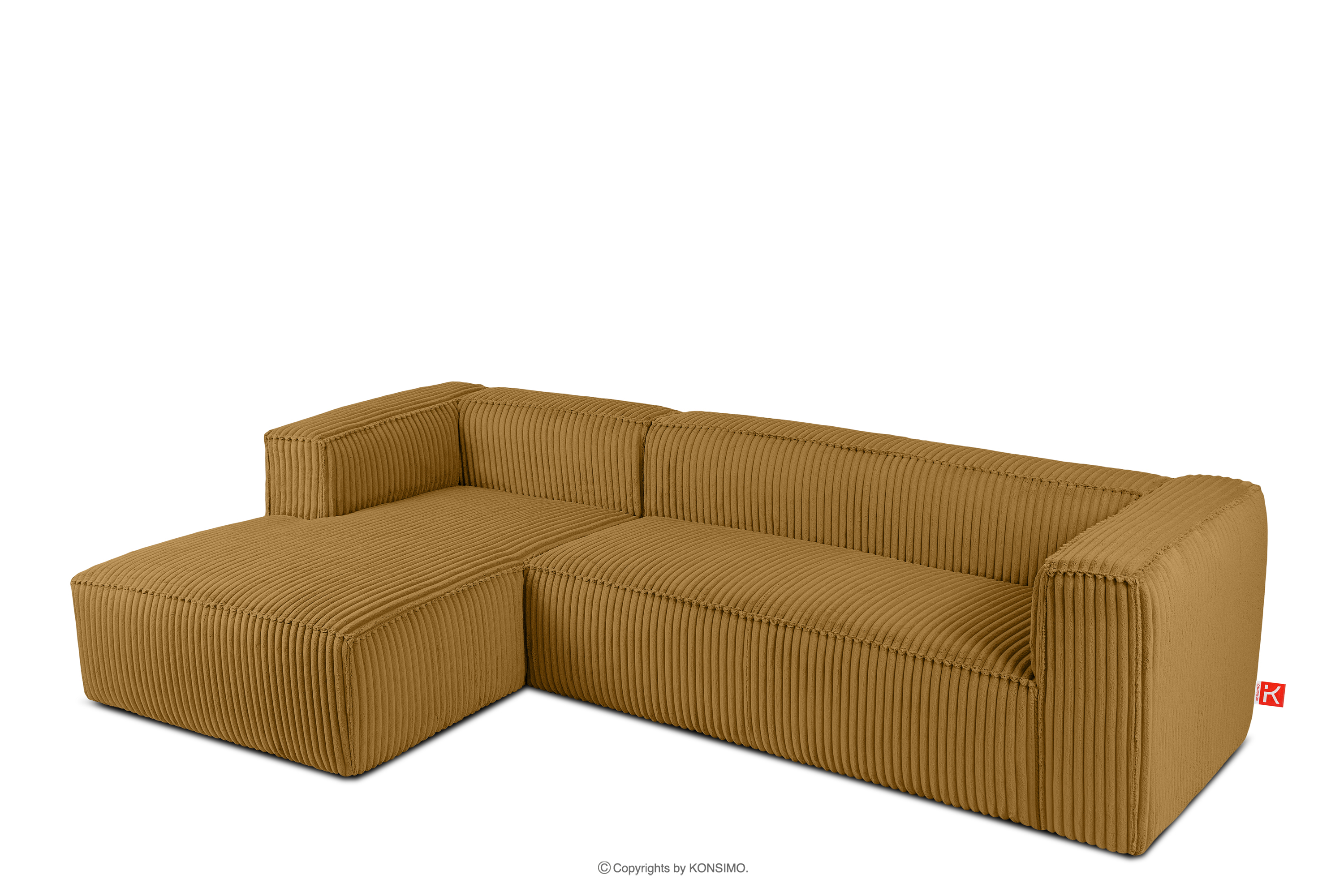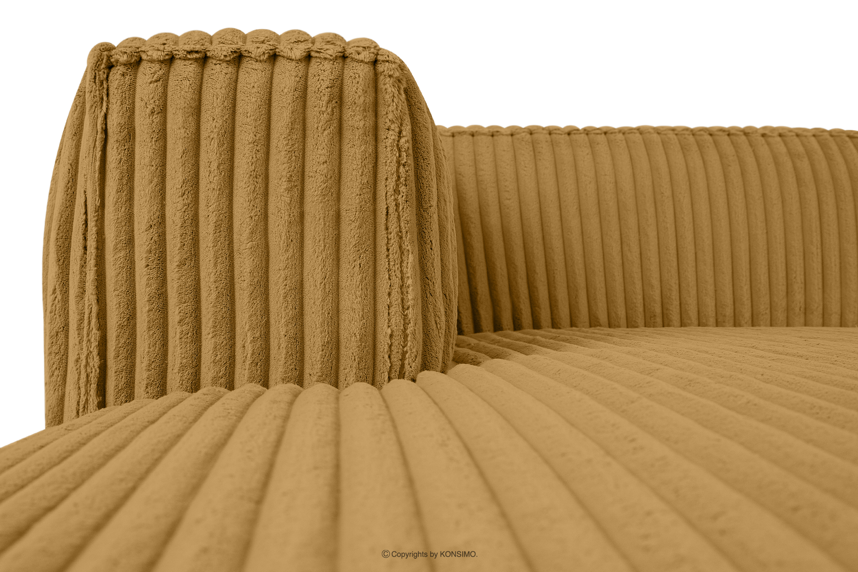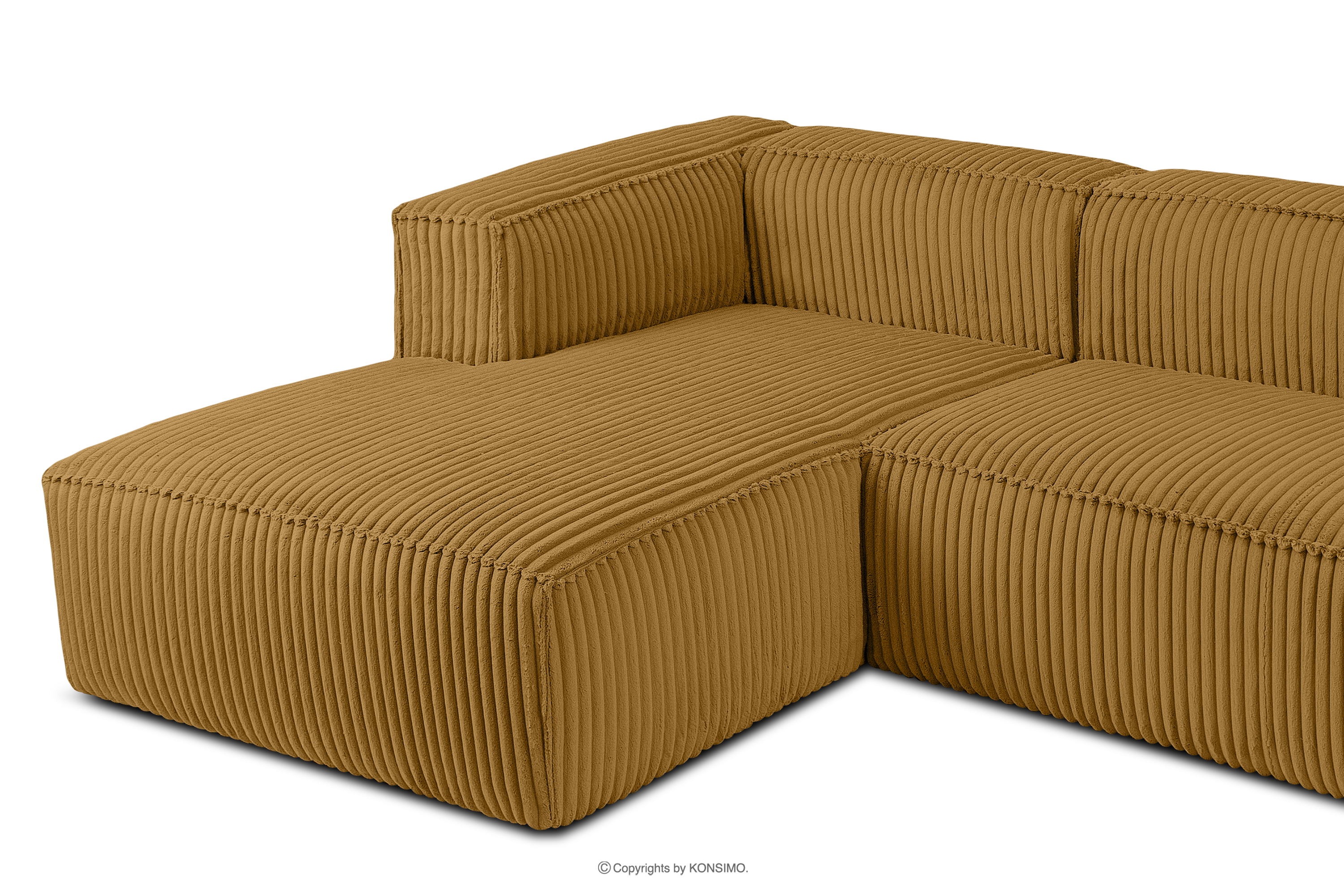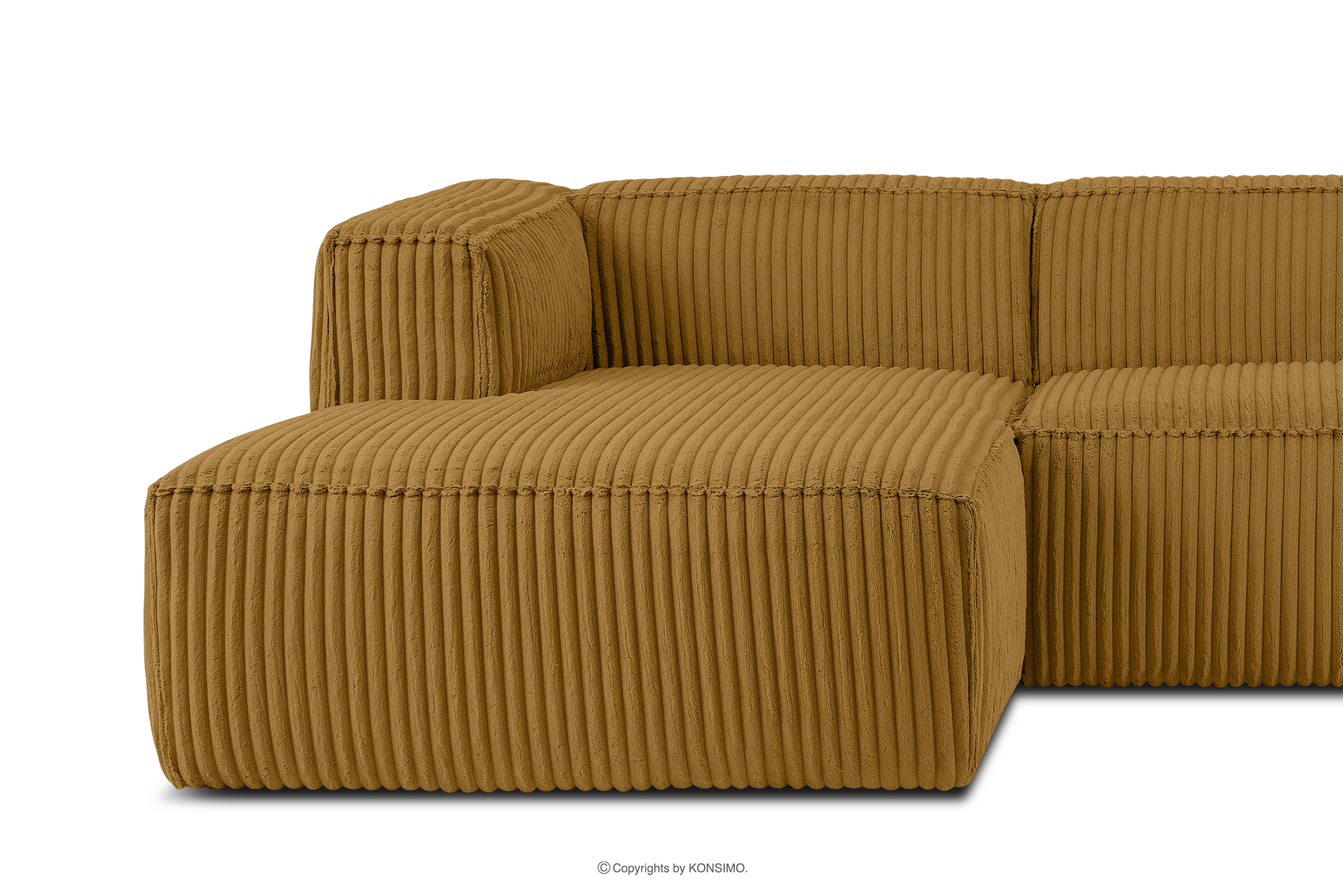 Großes gelbes Ecksofa aus Kordstoff links mit einer soliden Konstruktion und einem einzigartigen Design. Das Gestell dieses eleganten Möbelstücks wurde aus einer Kombination von Kiefern- und Buchenholz gefertigt, was nicht nur ein ästhetisch ansprechendes Aussehen, sondern auch eine jahrelange Haltbarkeit gewährleistet. Der Innenraum wird von einer soliden Konstruktion aus Span- und Faserplatten getragen, die Stabilität und Nutzungskomfort garantiert.