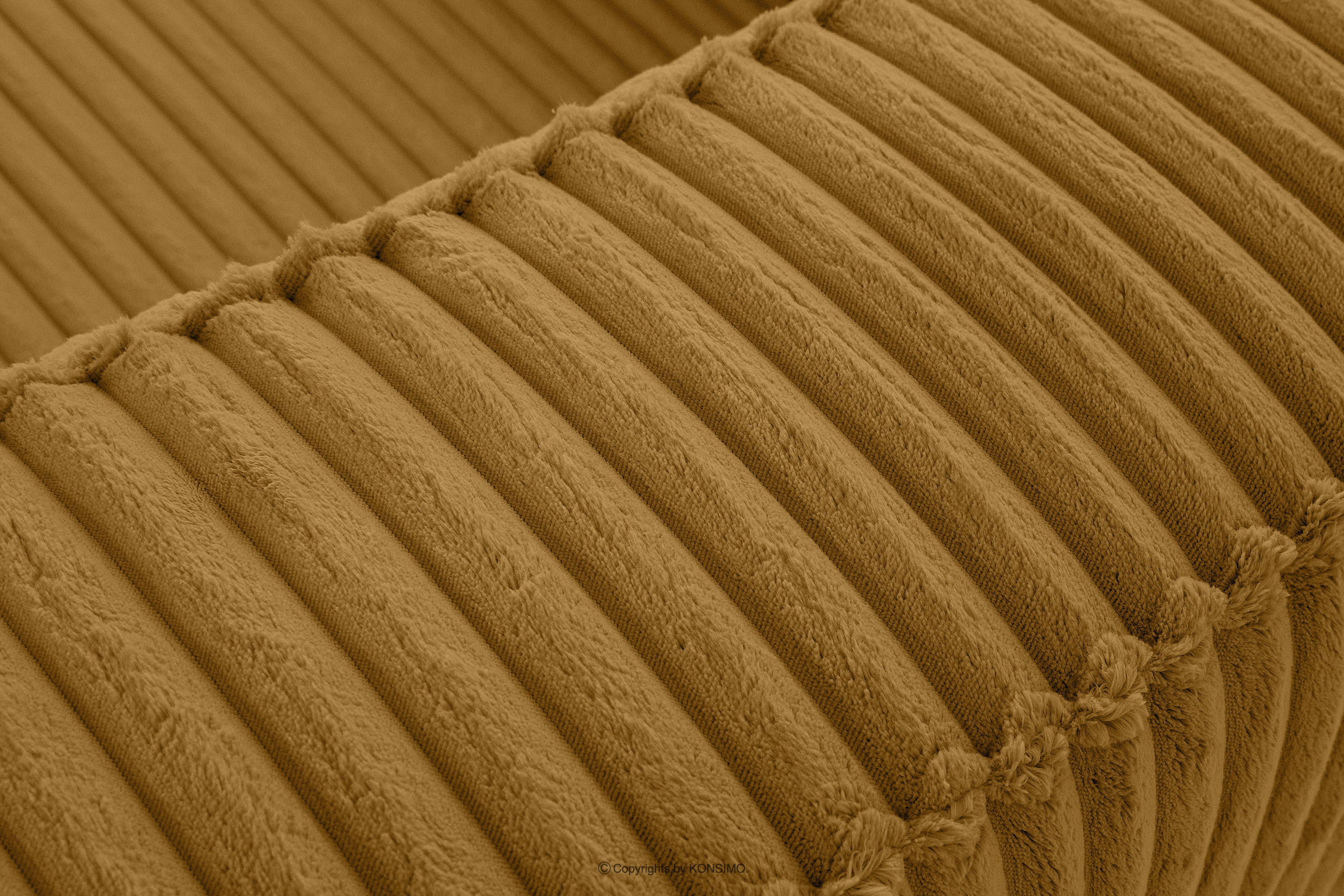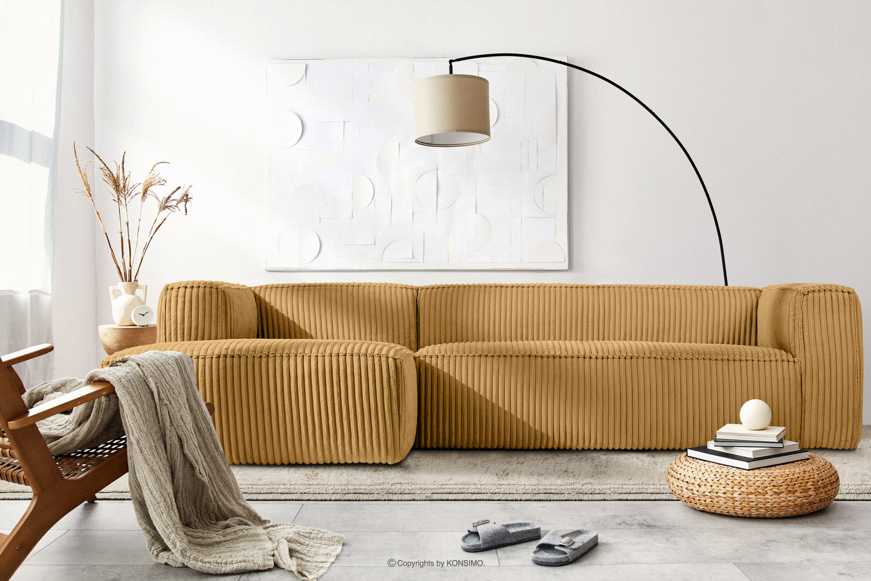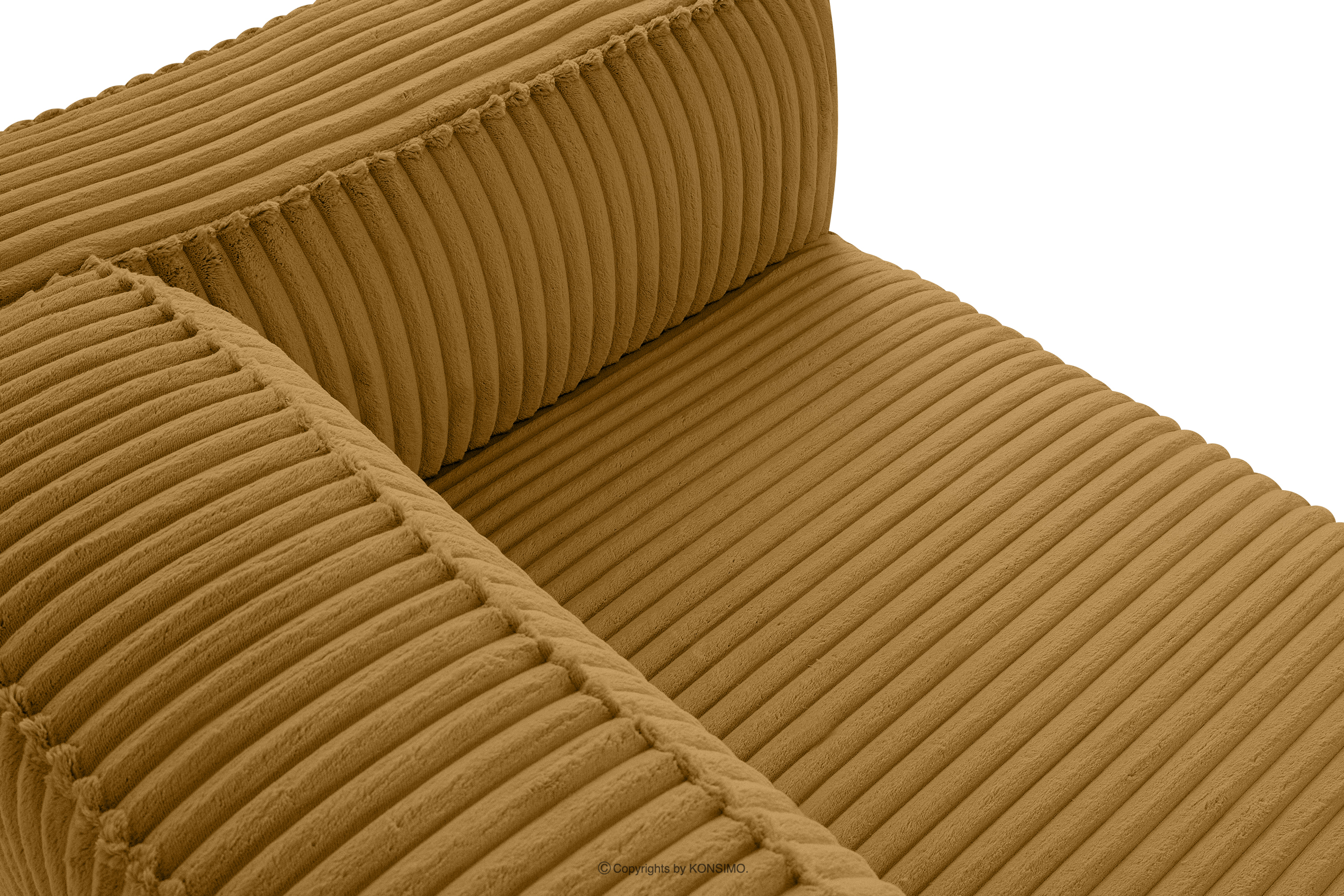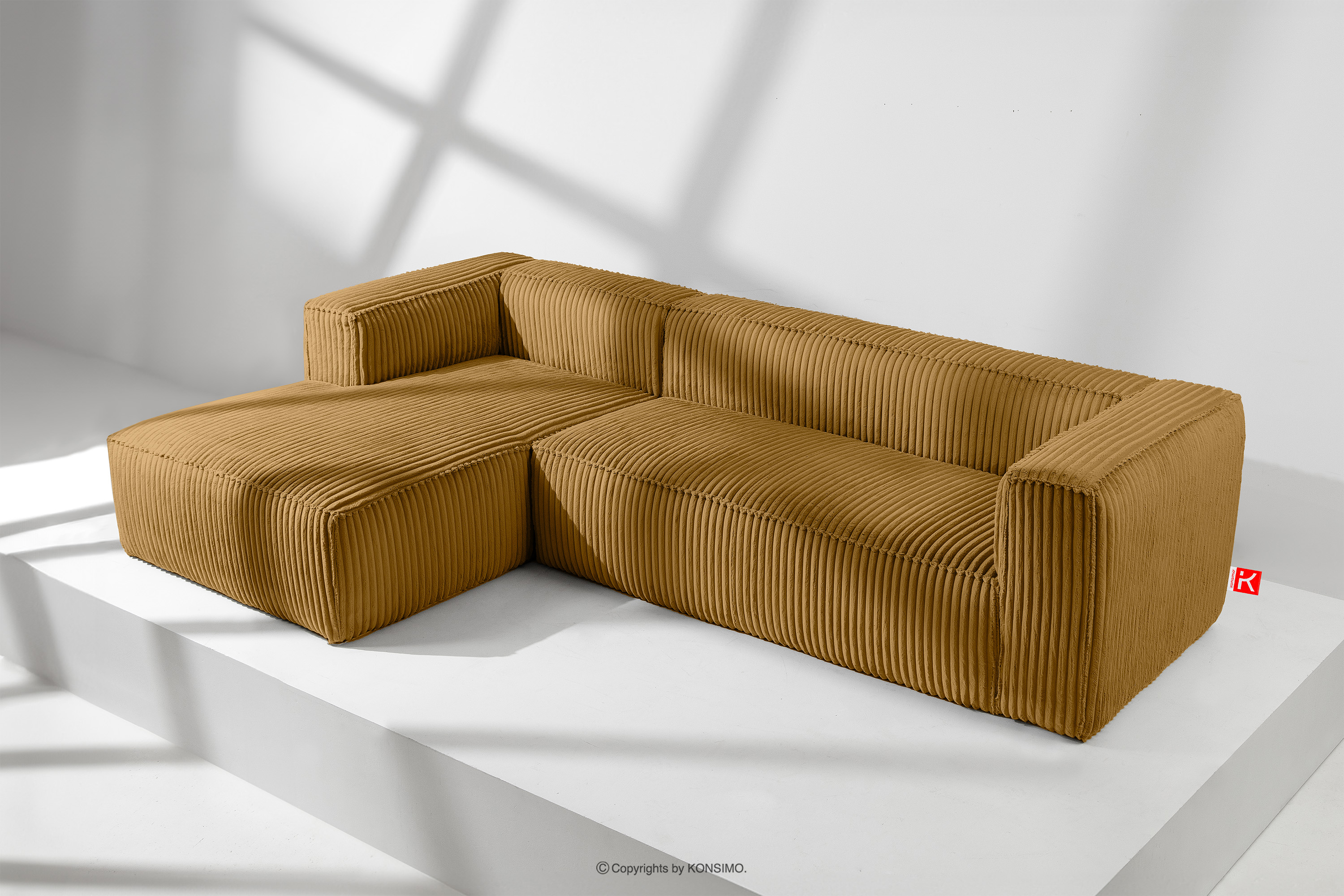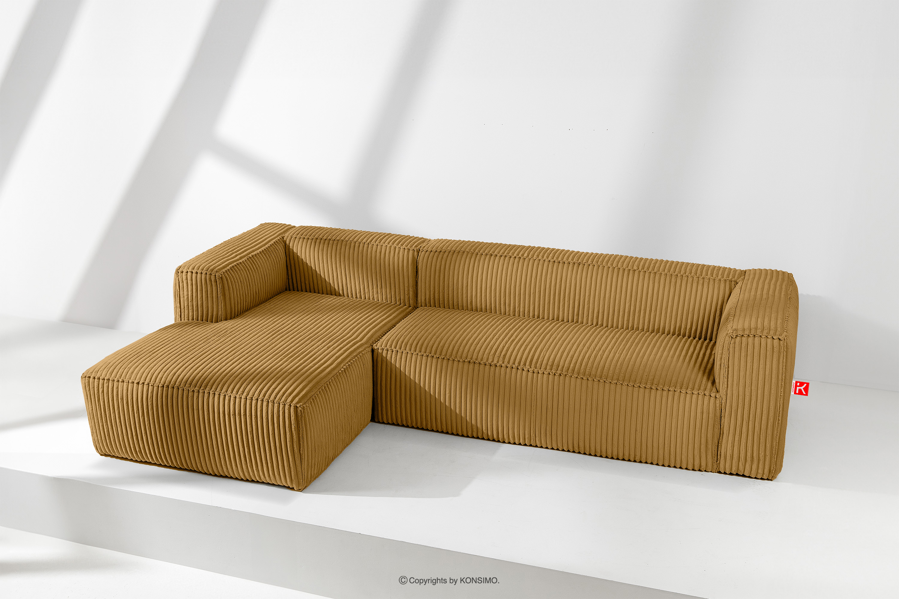 Großes gelbes Ecksofa aus Kordstoff links mit einer soliden Konstruktion und einem einzigartigen Design. Das Gestell dieses eleganten Möbelstücks wurde aus einer Kombination von Kiefern- und Buchenholz gefertigt, was nicht nur ein ästhetisch ansprechendes Aussehen, sondern auch eine jahrelange Haltbarkeit gewährleistet. Der Innenraum wird von einer soliden Konstruktion aus Span- und Faserplatten getragen, die Stabilität und Nutzungskomfort garantiert.