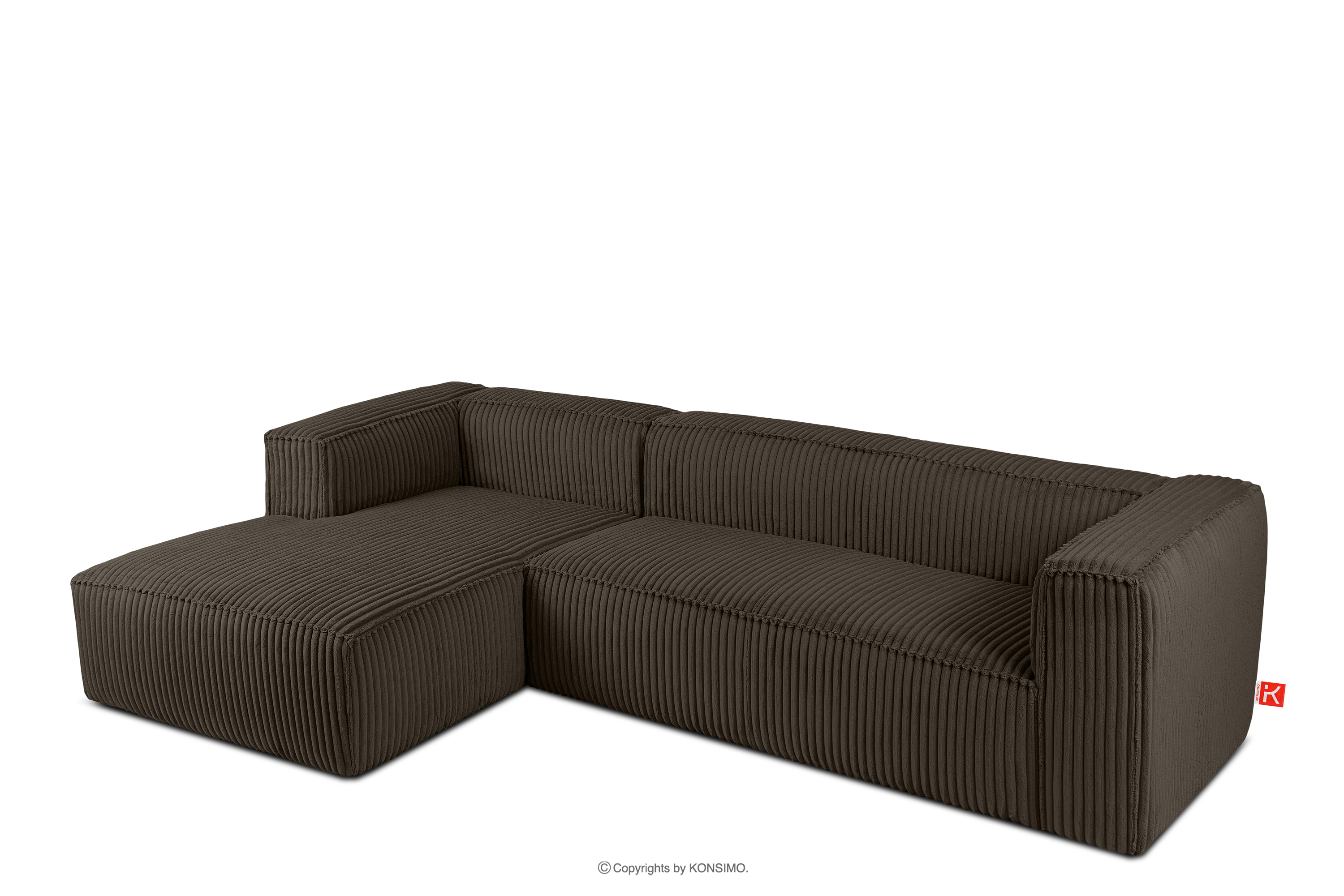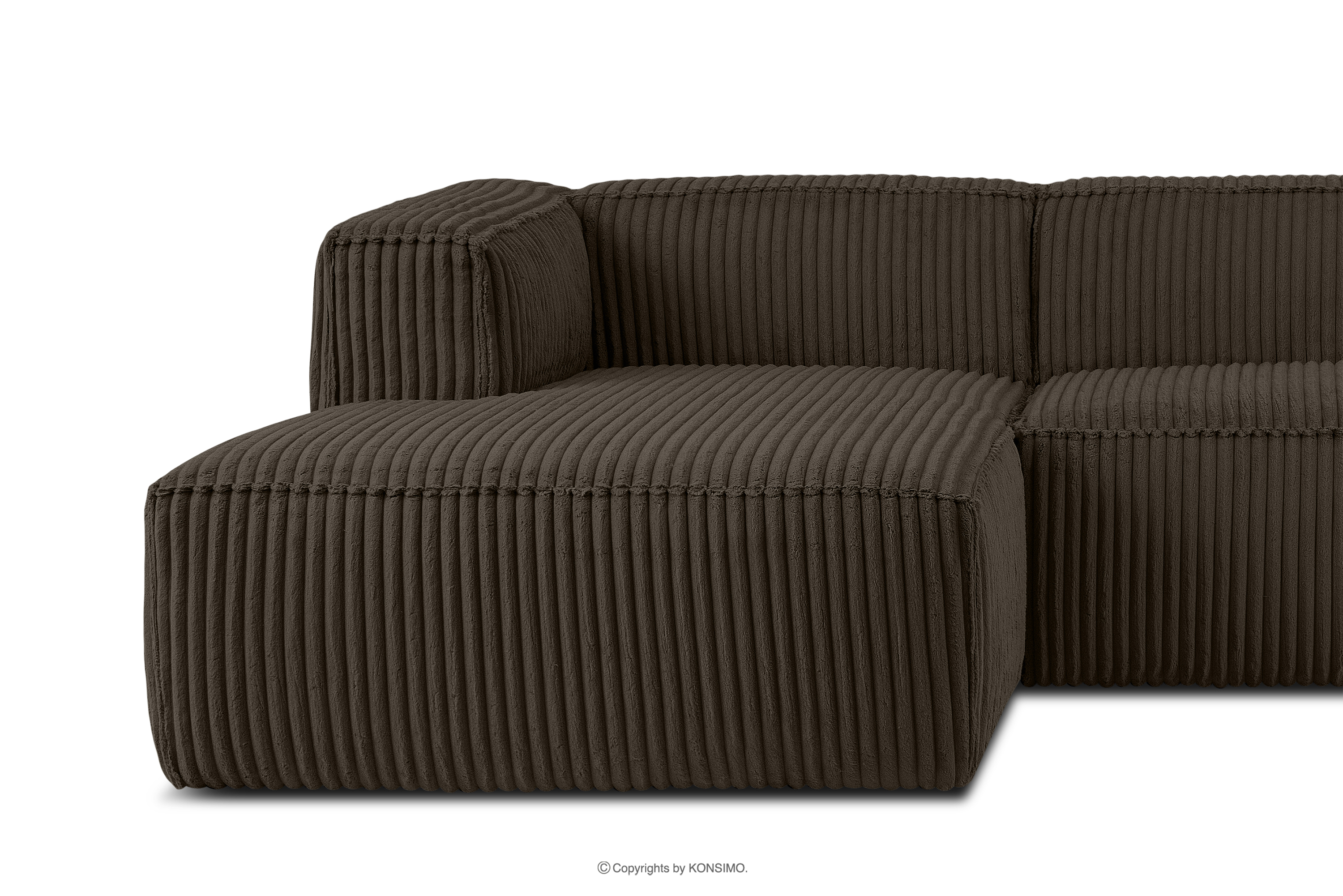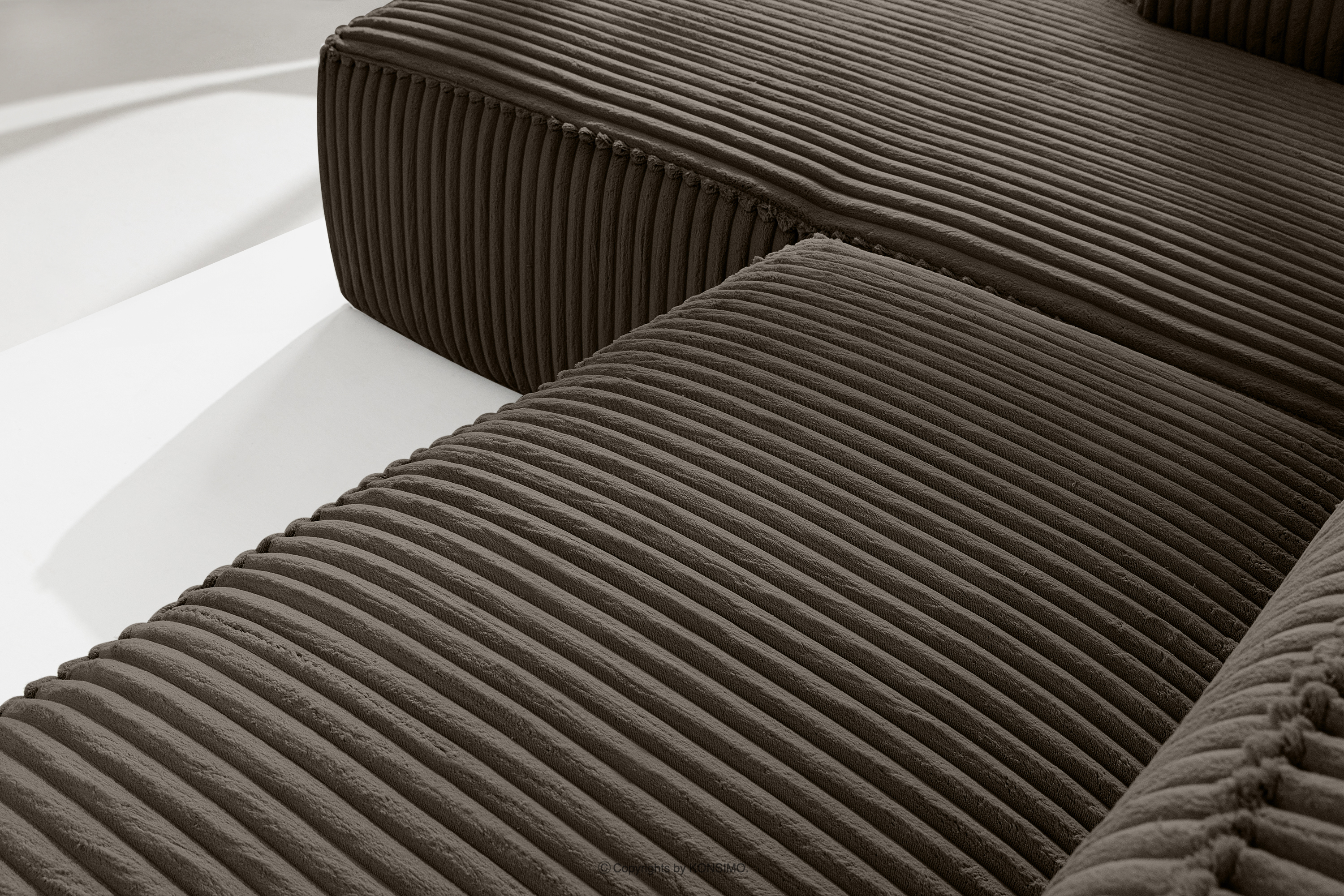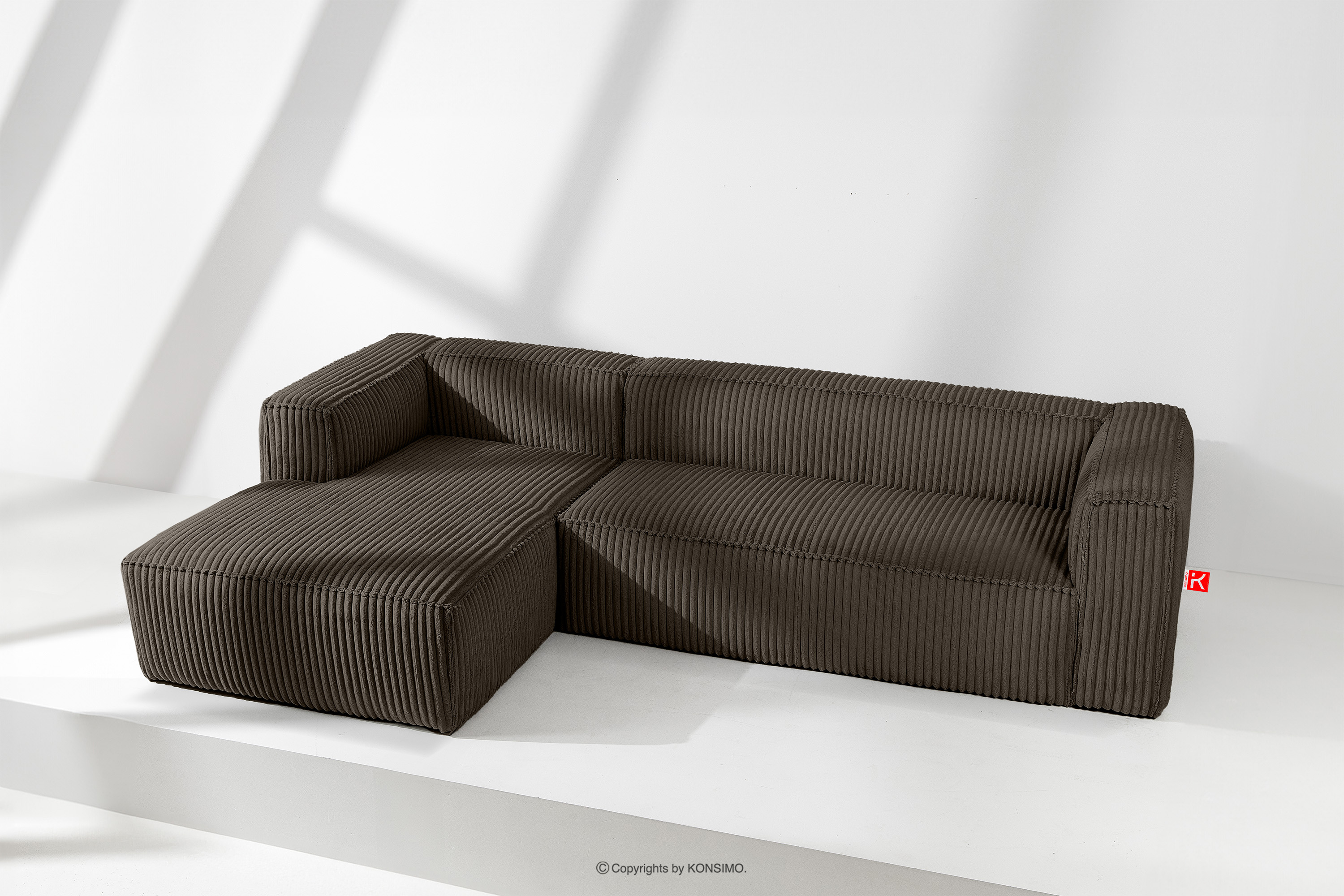 Großes braunes Ecksofa aus Kordstoff links mit einer soliden Konstruktion und außergewöhnlichem Design. Das Gestell dieses eleganten Möbelstücks wurde aus einer Kombination von Kiefern- und Buchenholz gefertigt, was nicht nur ein ästhetisch ansprechendes Aussehen, sondern auch eine jahrelange Haltbarkeit gewährleistet. Der Innenraum wird von einer soliden Konstruktion aus Span- und Faserplatten getragen, die Stabilität und Nutzungskomfort garantiert.