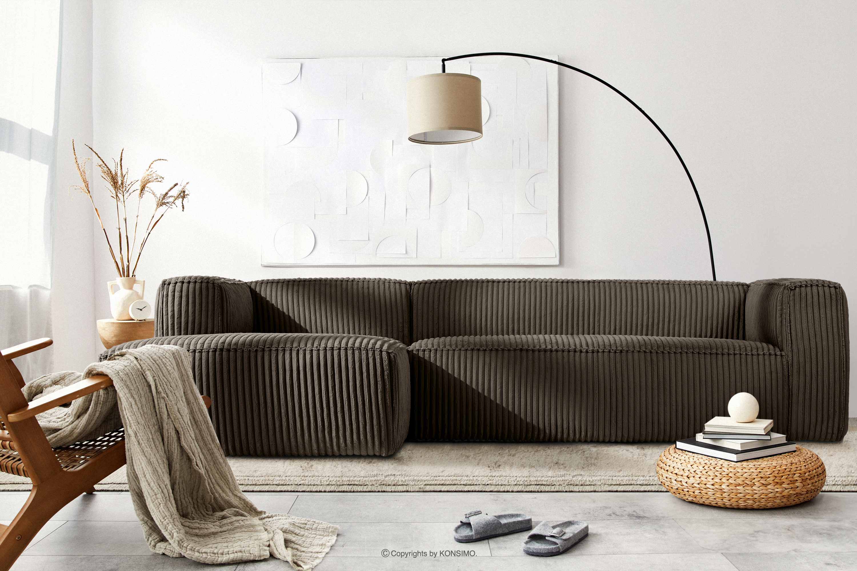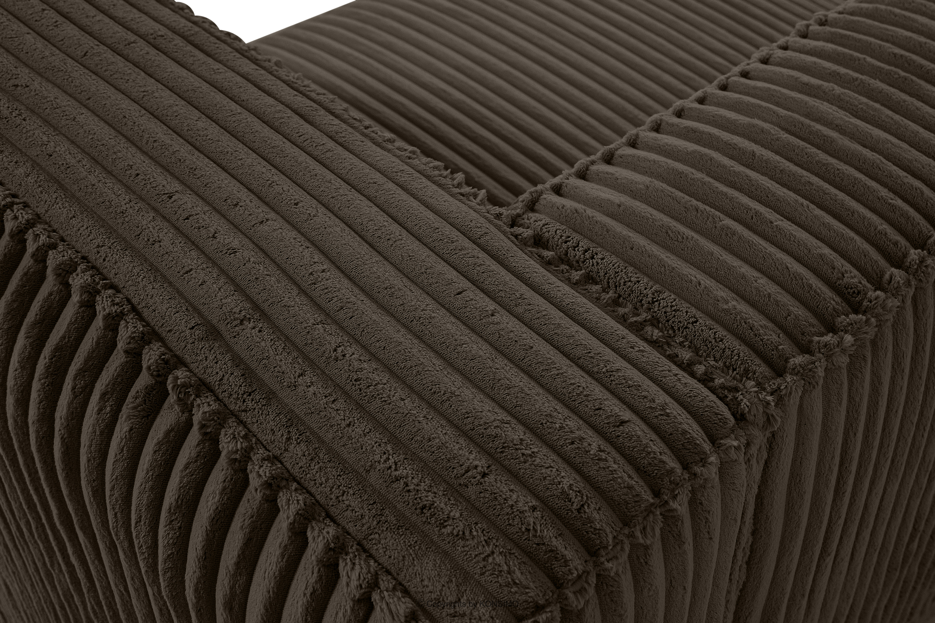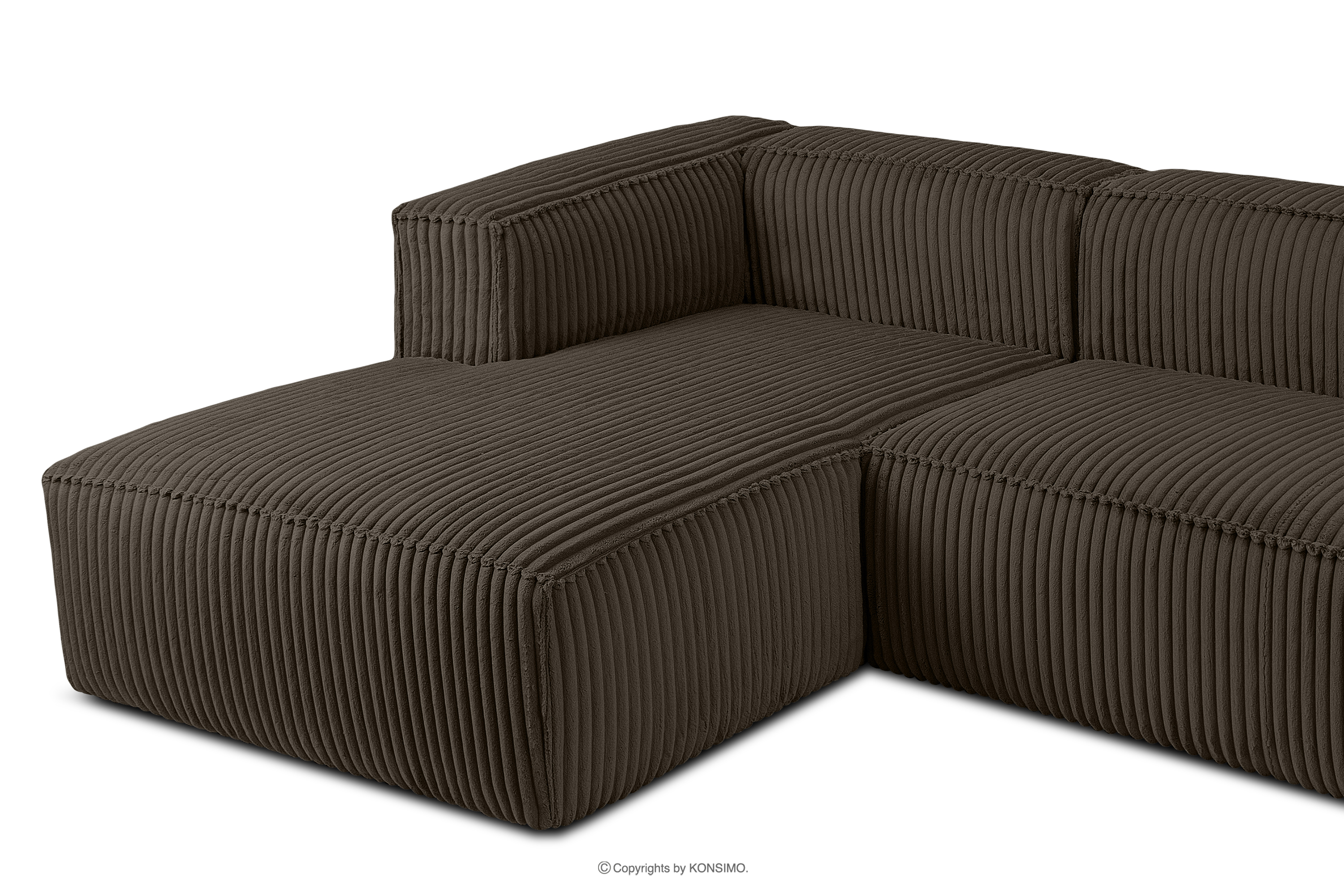 Großes braunes Ecksofa aus Kordstoff links mit einer soliden Konstruktion und außergewöhnlichem Design. Das Gestell dieses eleganten Möbelstücks wurde aus einer Kombination von Kiefern- und Buchenholz gefertigt, was nicht nur ein ästhetisch ansprechendes Aussehen, sondern auch eine jahrelange Haltbarkeit gewährleistet. Der Innenraum wird von einer soliden Konstruktion aus Span- und Faserplatten getragen, die Stabilität und Nutzungskomfort garantiert.