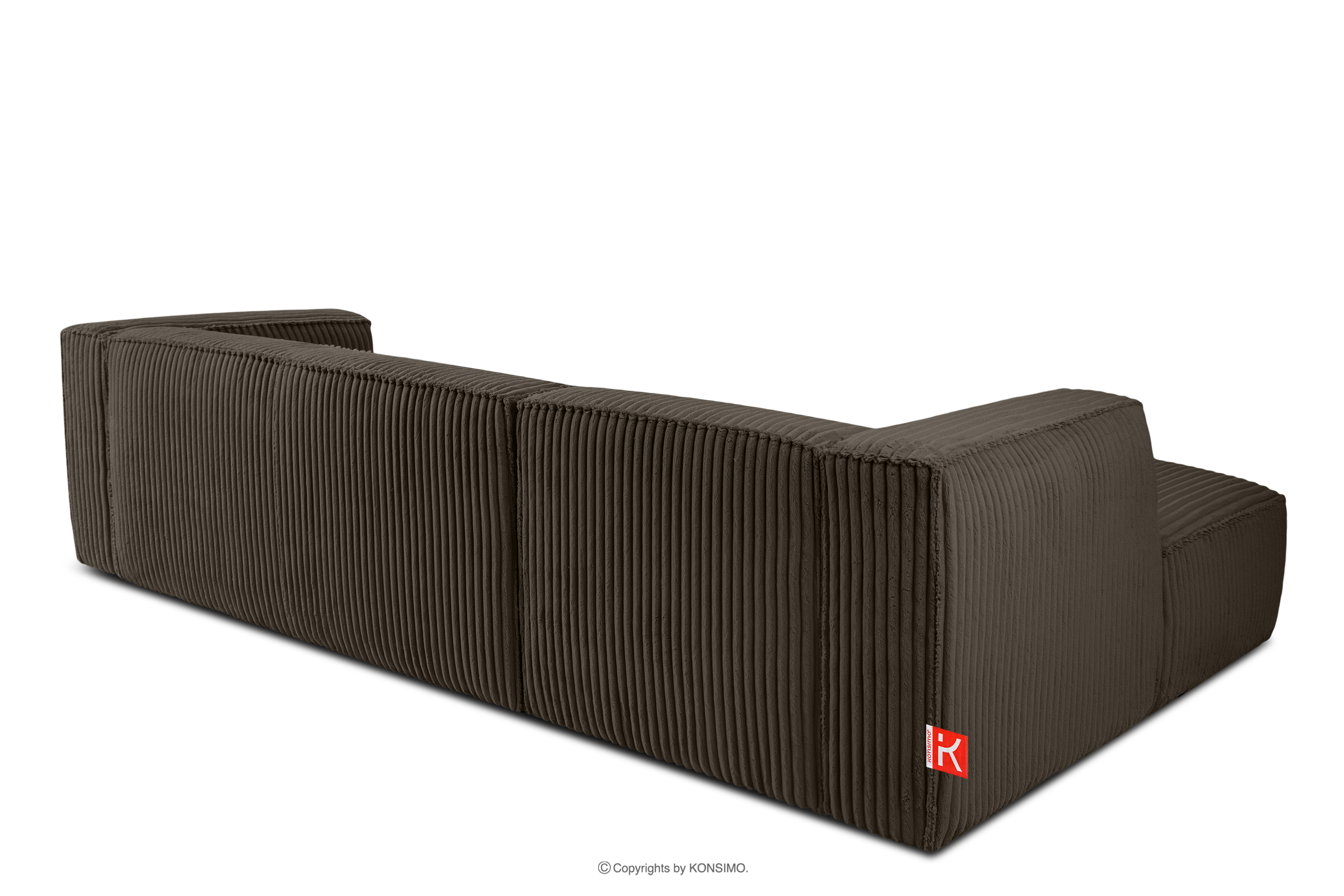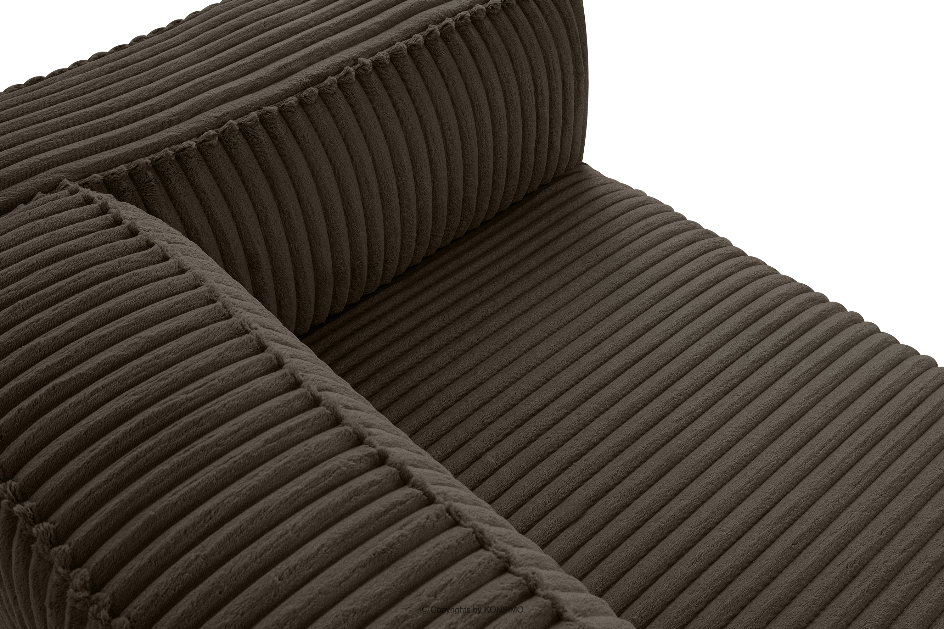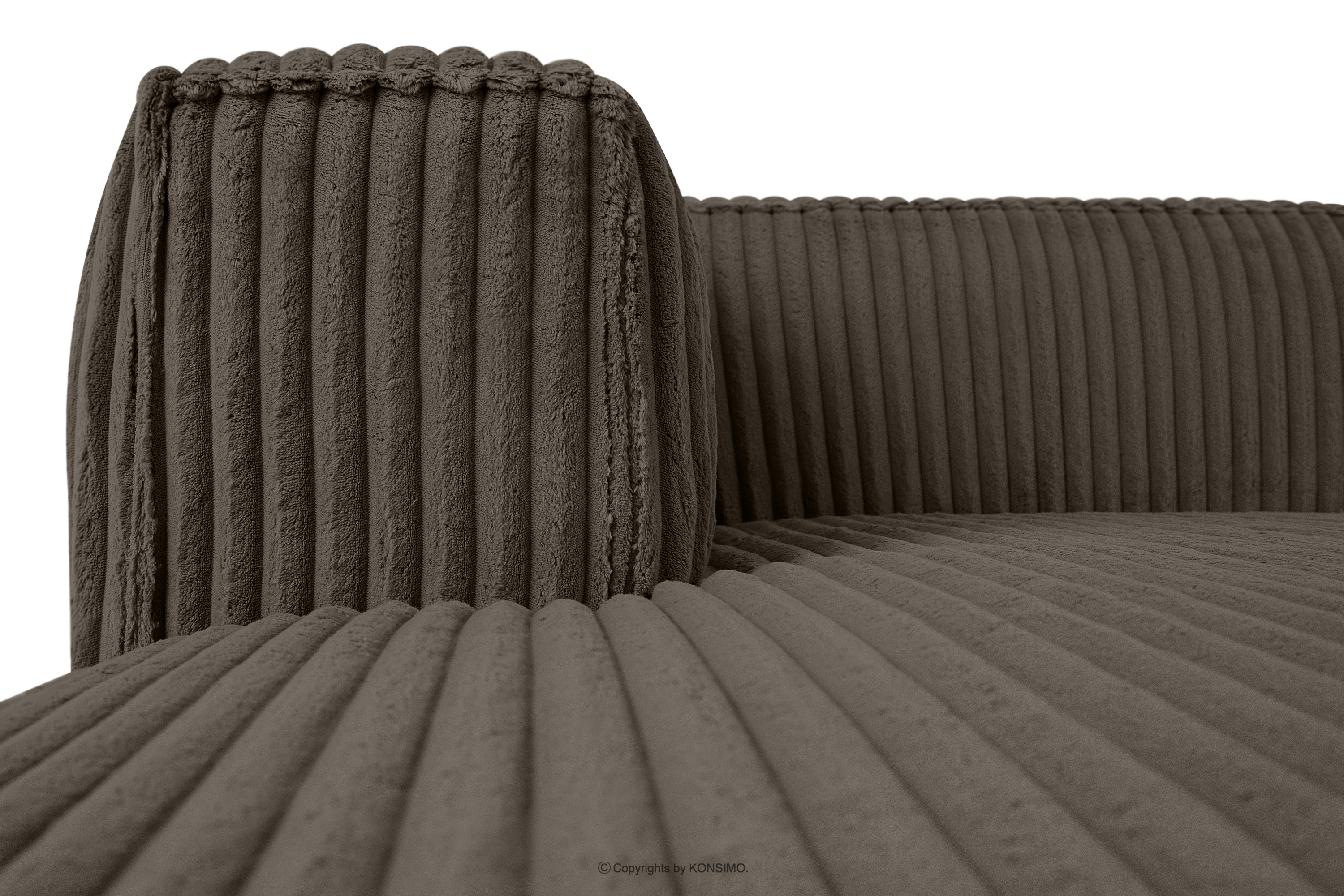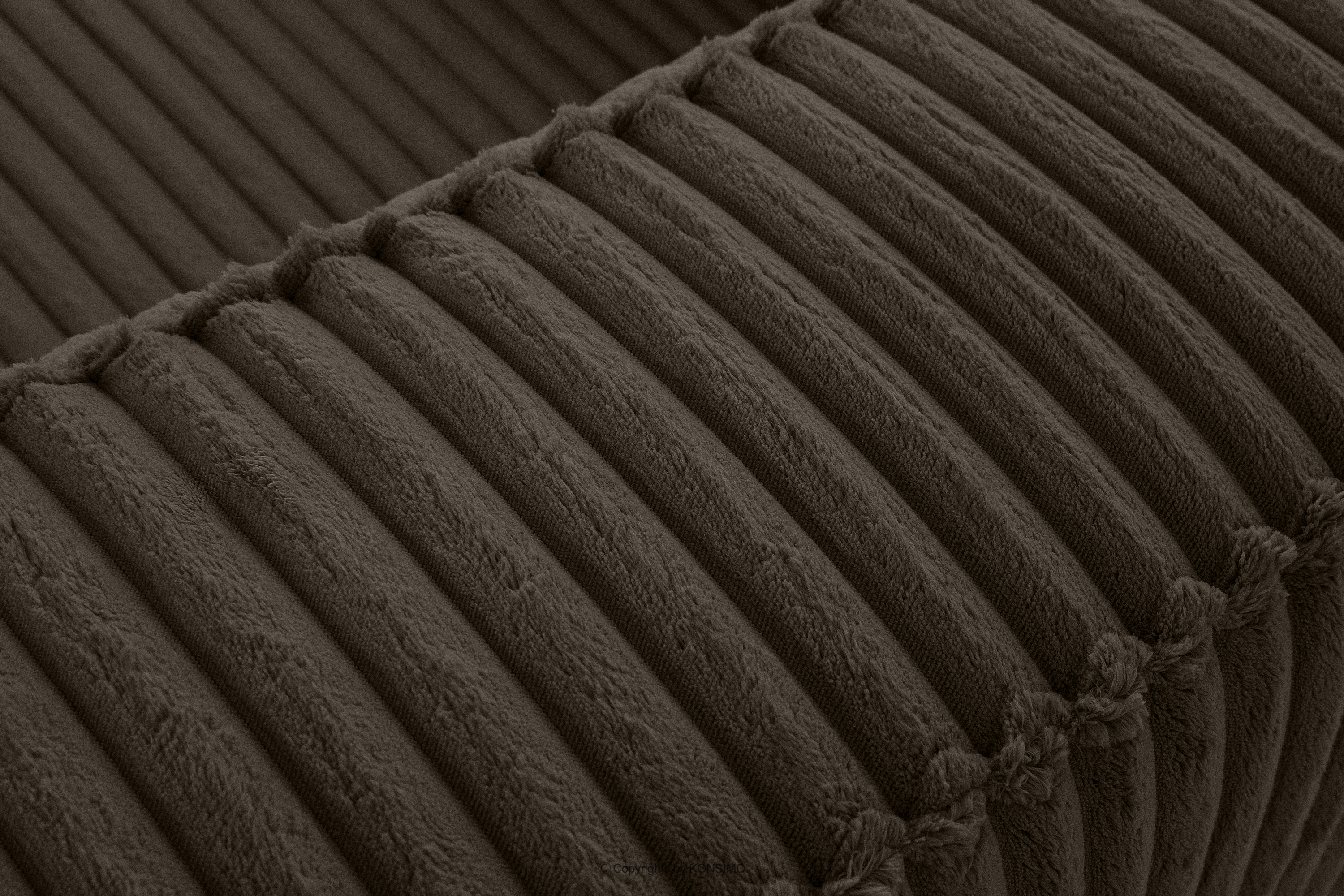Großes braunes Ecksofa aus Kordstoff links mit einer soliden Konstruktion und außergewöhnlichem Design. Das Gestell dieses eleganten Möbelstücks wurde aus einer Kombination von Kiefern- und Buchenholz gefertigt, was nicht nur ein ästhetisch ansprechendes Aussehen, sondern auch eine jahrelange Haltbarkeit gewährleistet. Der Innenraum wird von einer soliden Konstruktion aus Span- und Faserplatten getragen, die Stabilität und Nutzungskomfort garantiert.