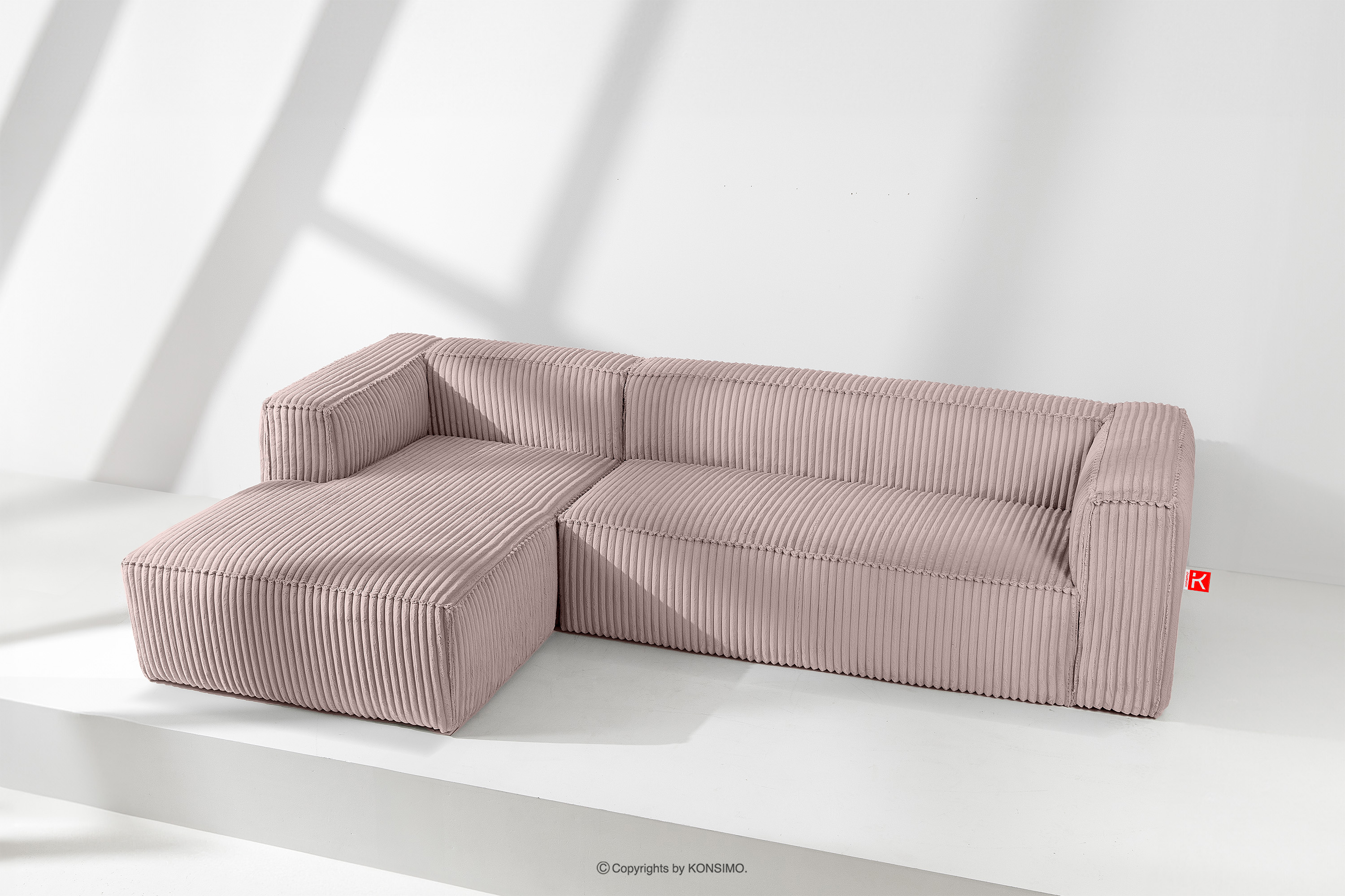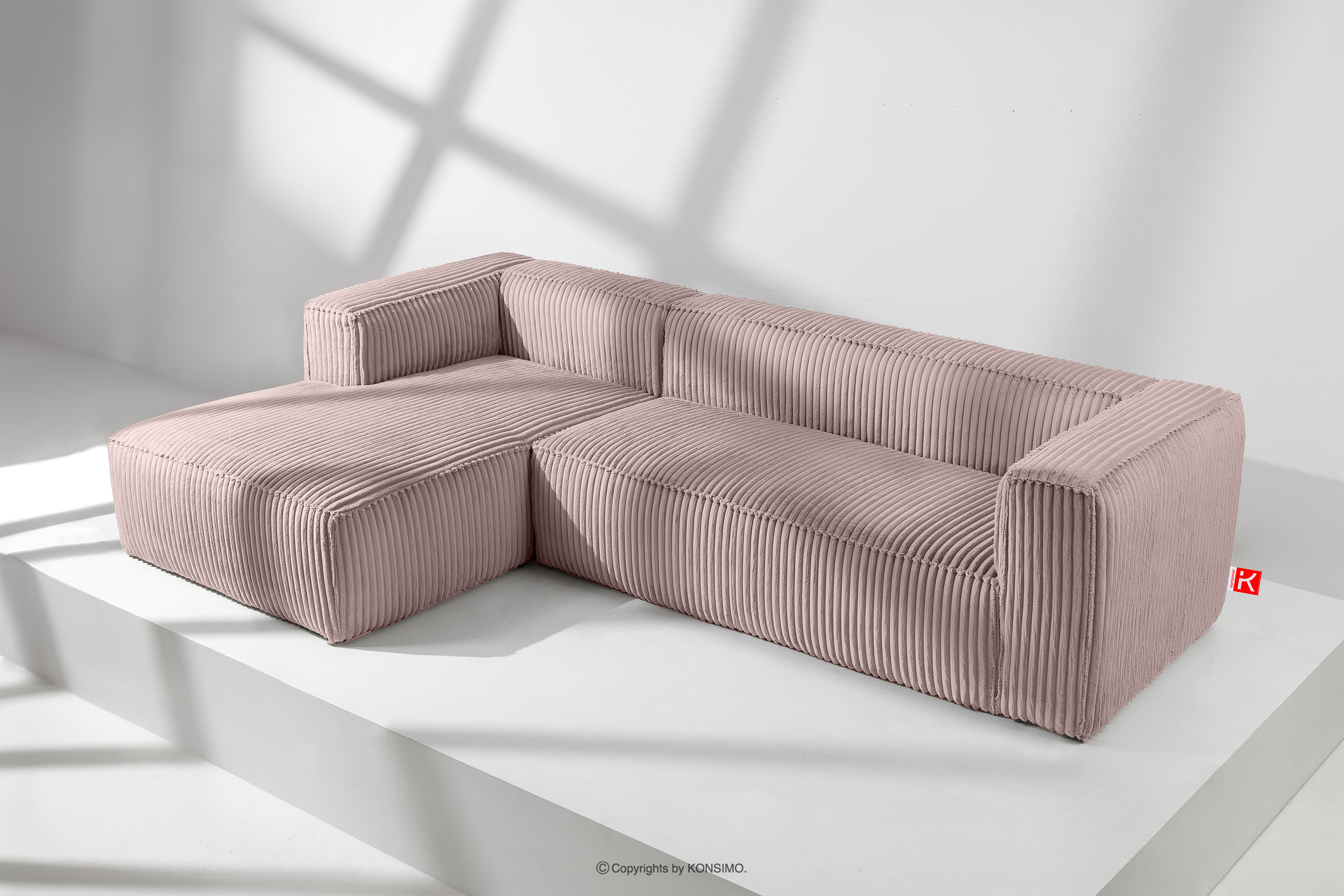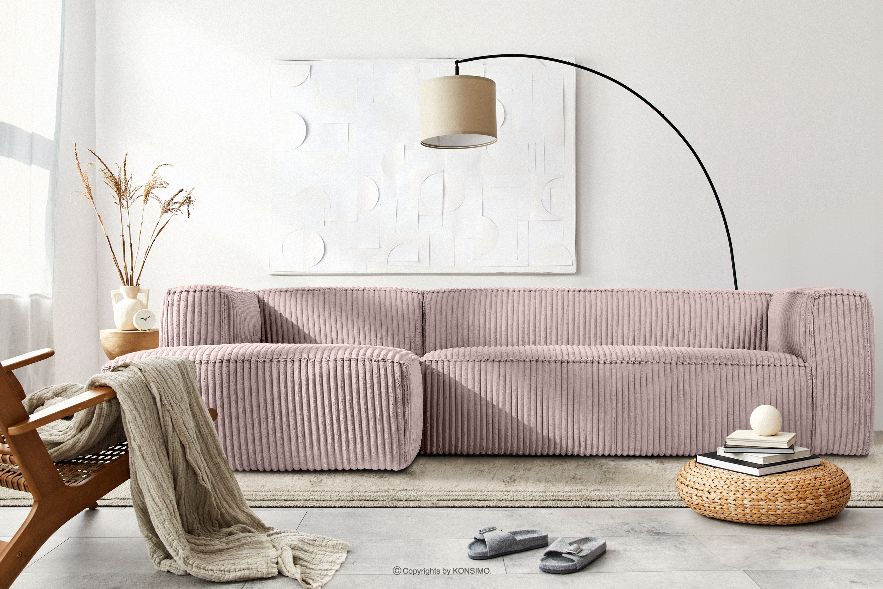 Großes rosa Ecksofa aus Kordstoff links mit solider Konstruktion und einzigartigem Design. Das Gestell dieses eleganten Möbelstücks wurde aus einer Kombination von Kiefern- und Buchenholz gefertigt, was nicht nur ein ästhetisch ansprechendes Aussehen, sondern auch eine jahrelange Haltbarkeit gewährleistet. Der Innenraum wird von einer soliden Konstruktion aus Span- und Faserplatten getragen, die Stabilität und Nutzungskomfort garantiert.