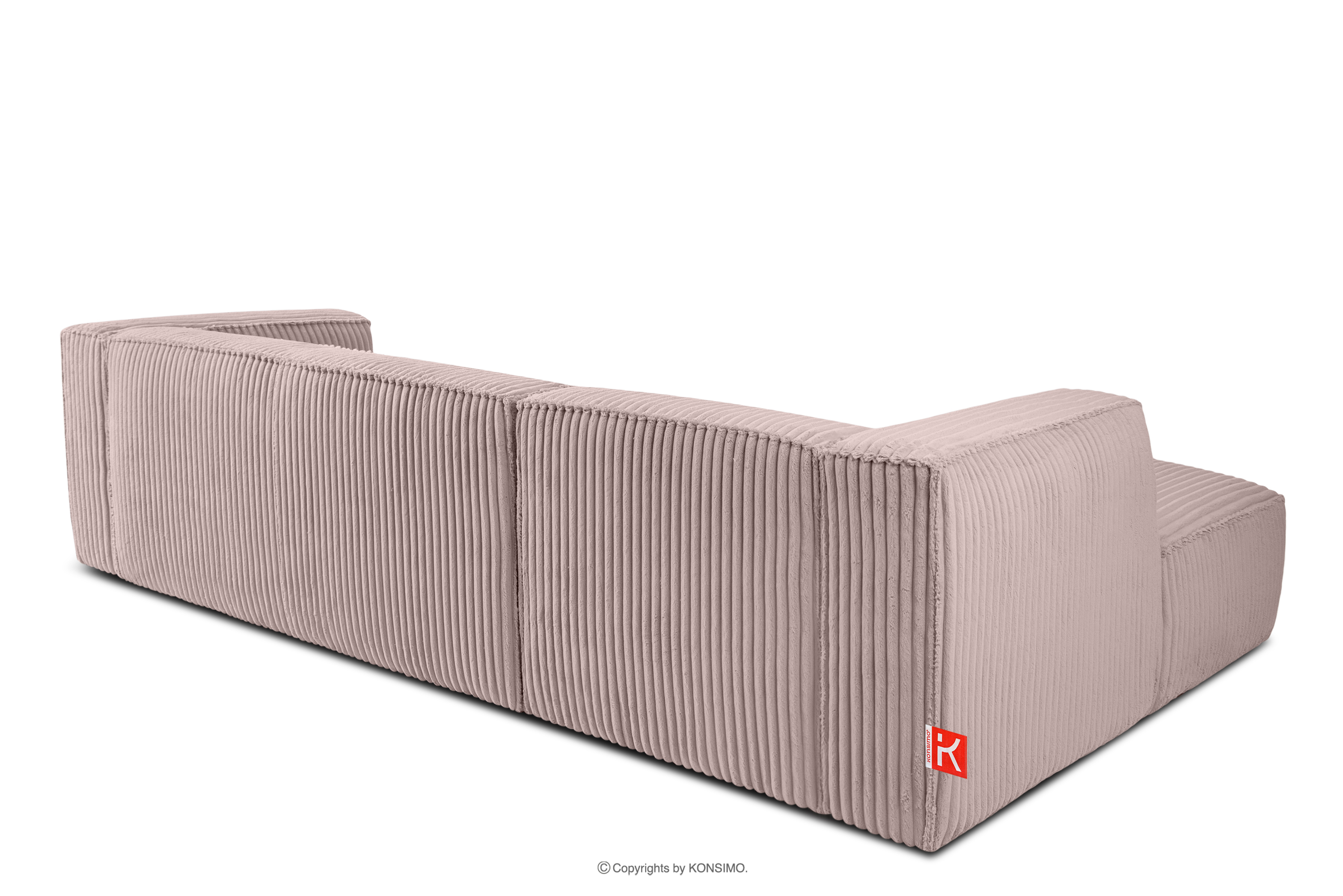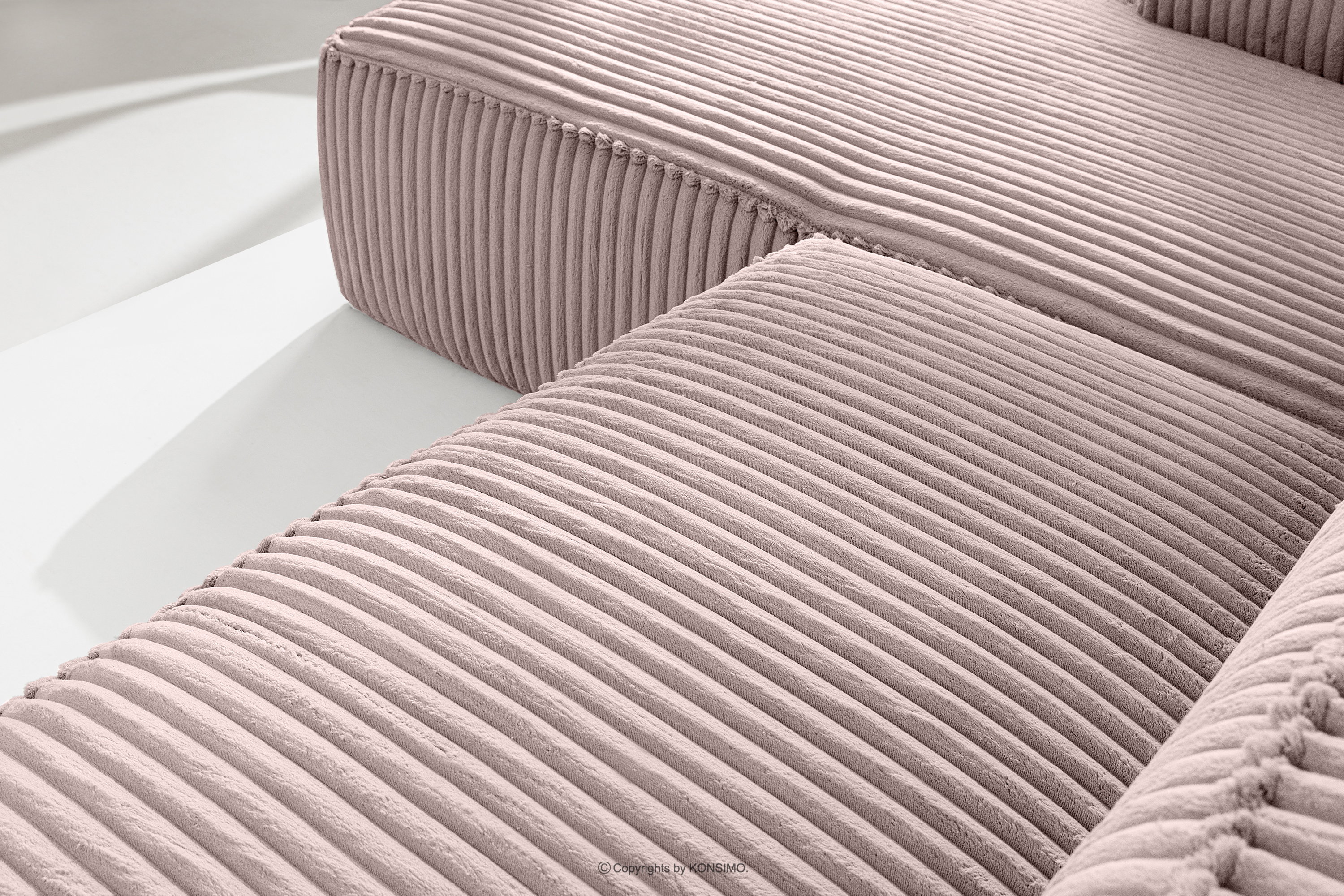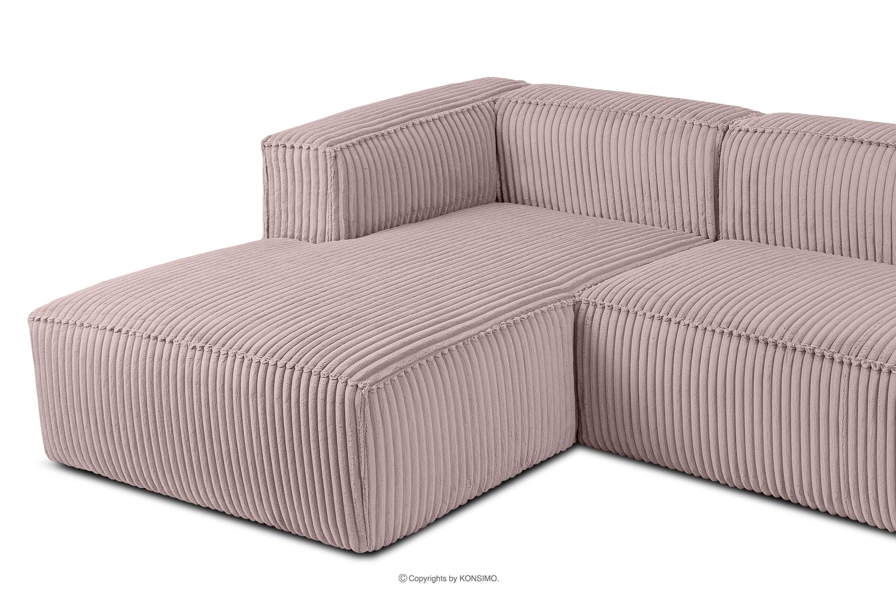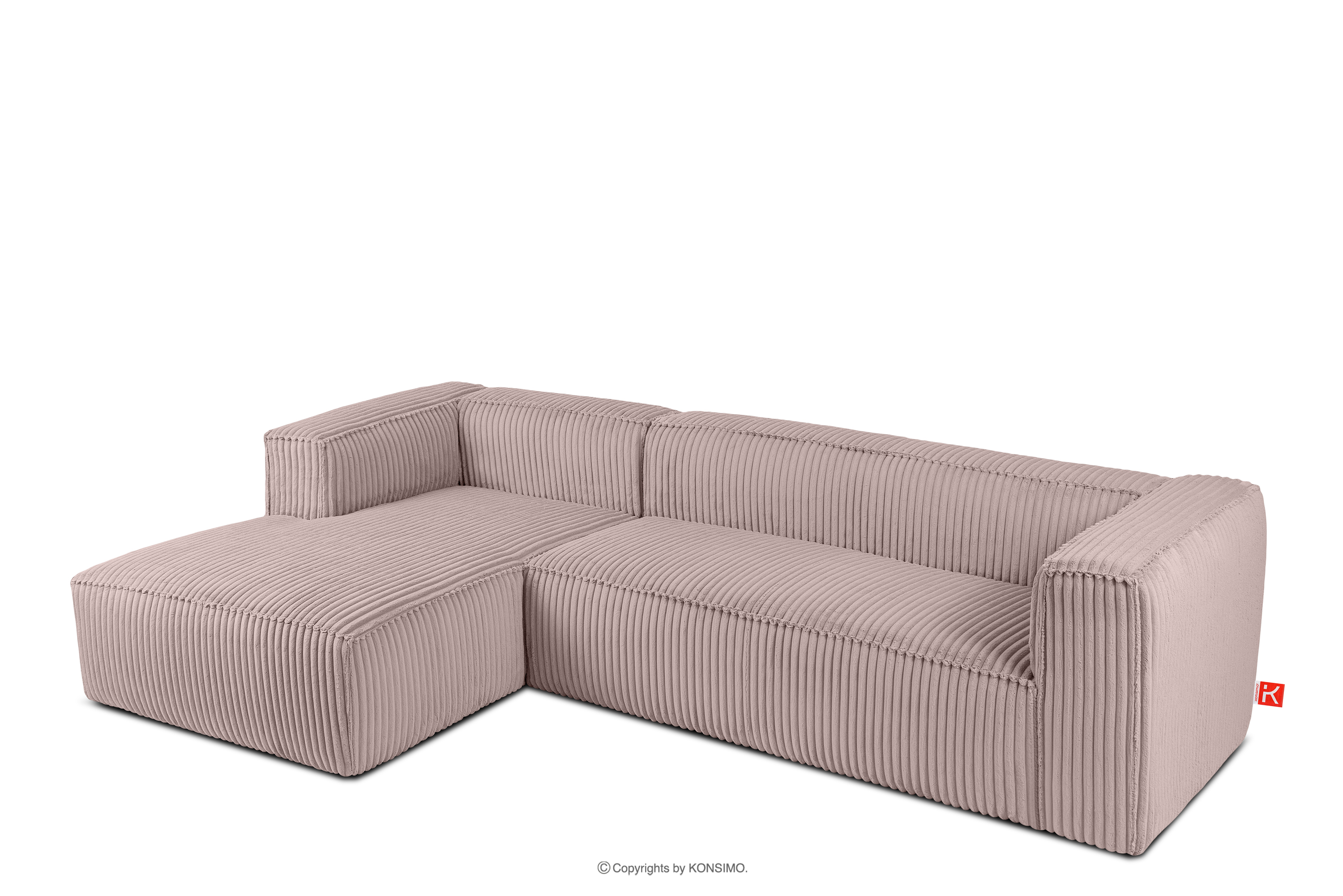 Großes rosa Ecksofa aus Kordstoff links mit solider Konstruktion und einzigartigem Design. Das Gestell dieses eleganten Möbelstücks wurde aus einer Kombination von Kiefern- und Buchenholz gefertigt, was nicht nur ein ästhetisch ansprechendes Aussehen, sondern auch eine jahrelange Haltbarkeit gewährleistet. Der Innenraum wird von einer soliden Konstruktion aus Span- und Faserplatten getragen, die Stabilität und Nutzungskomfort garantiert.