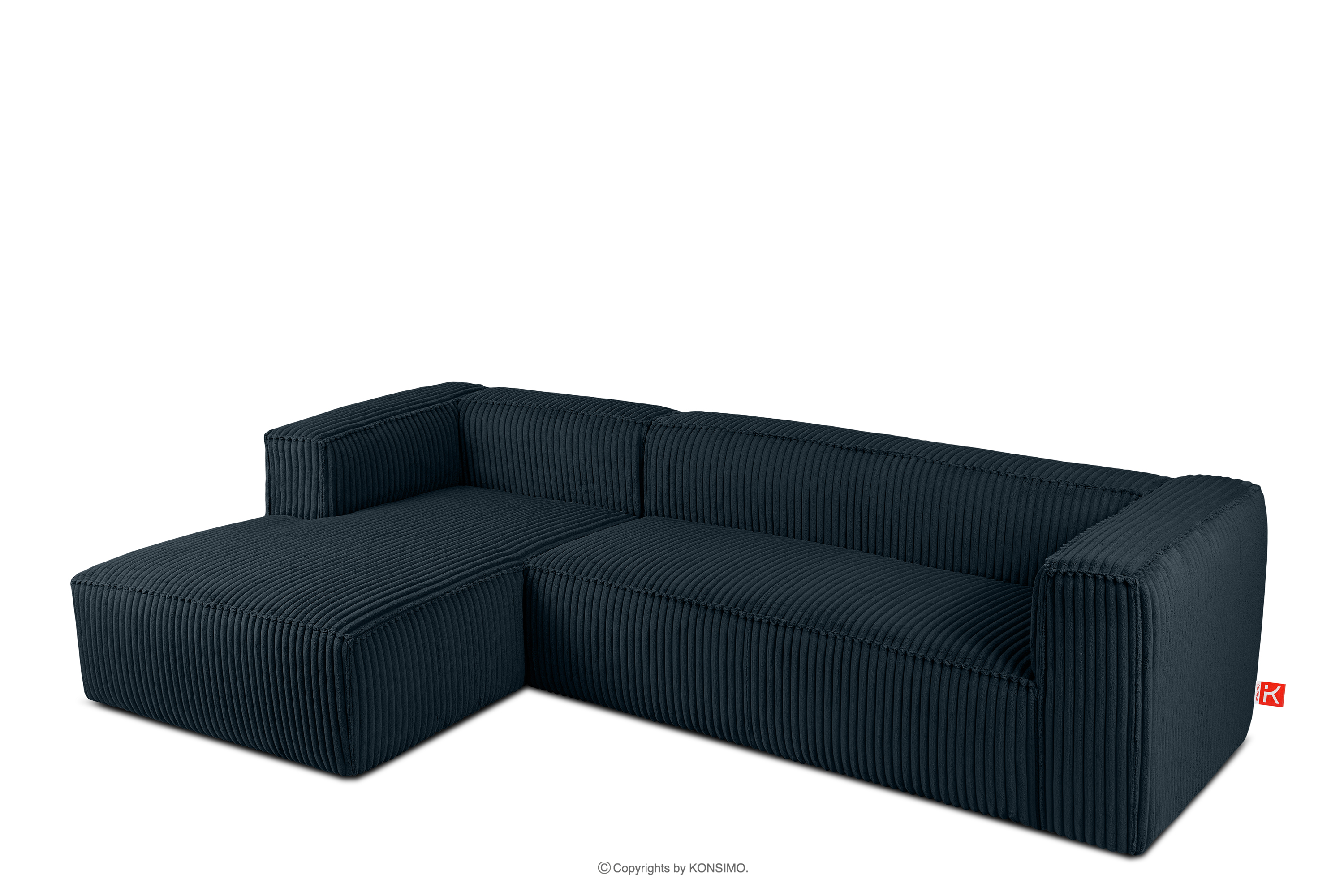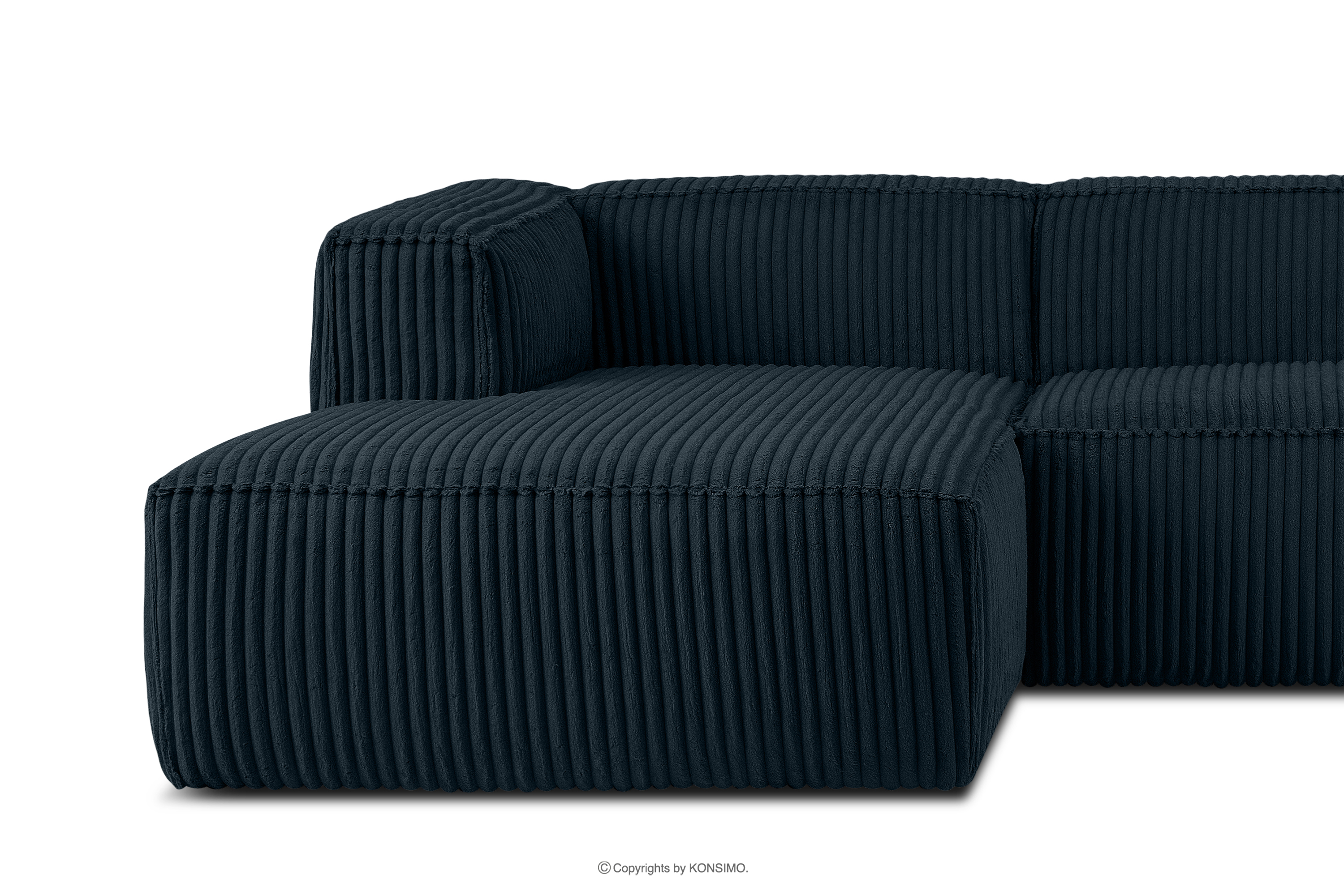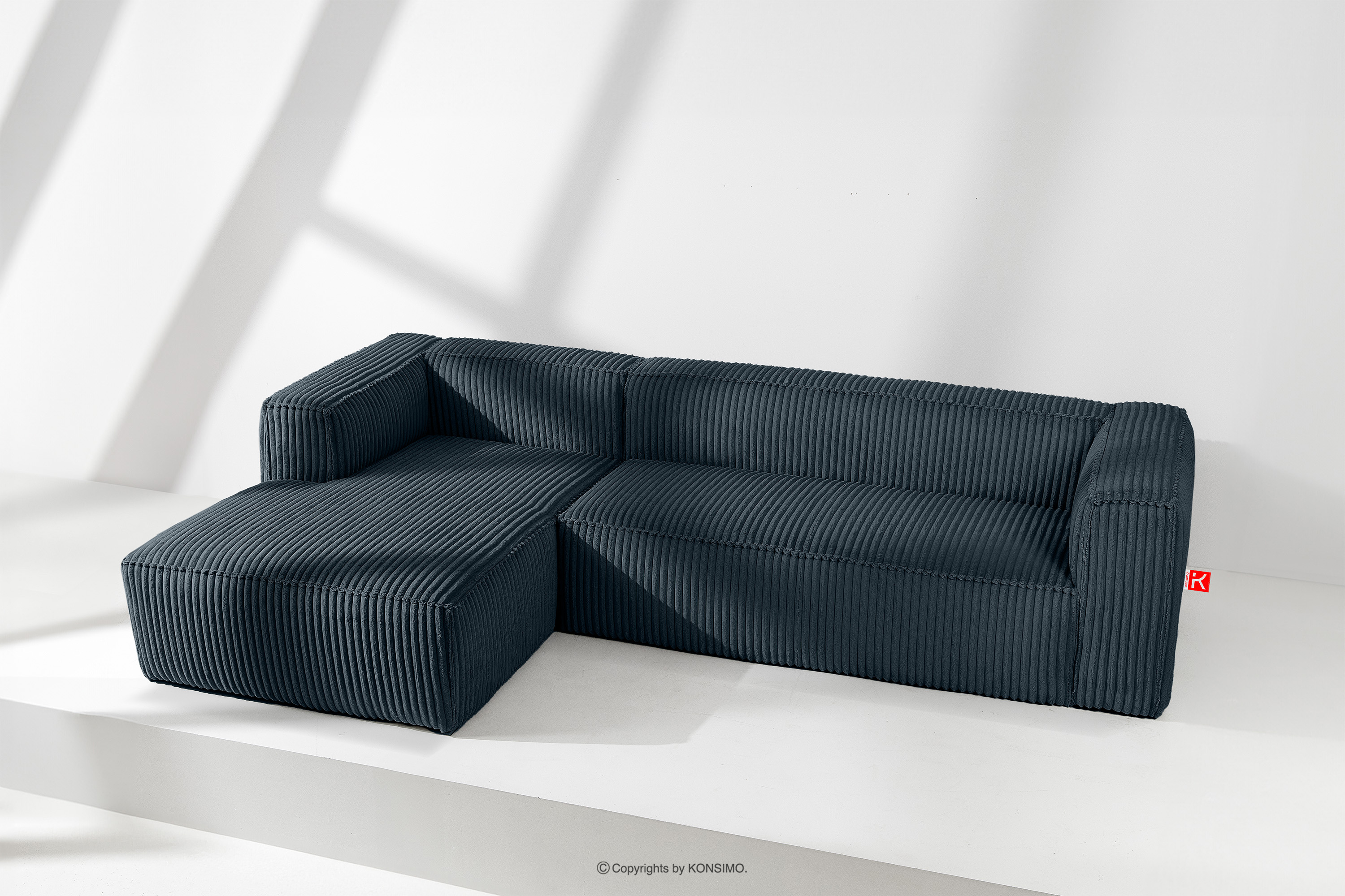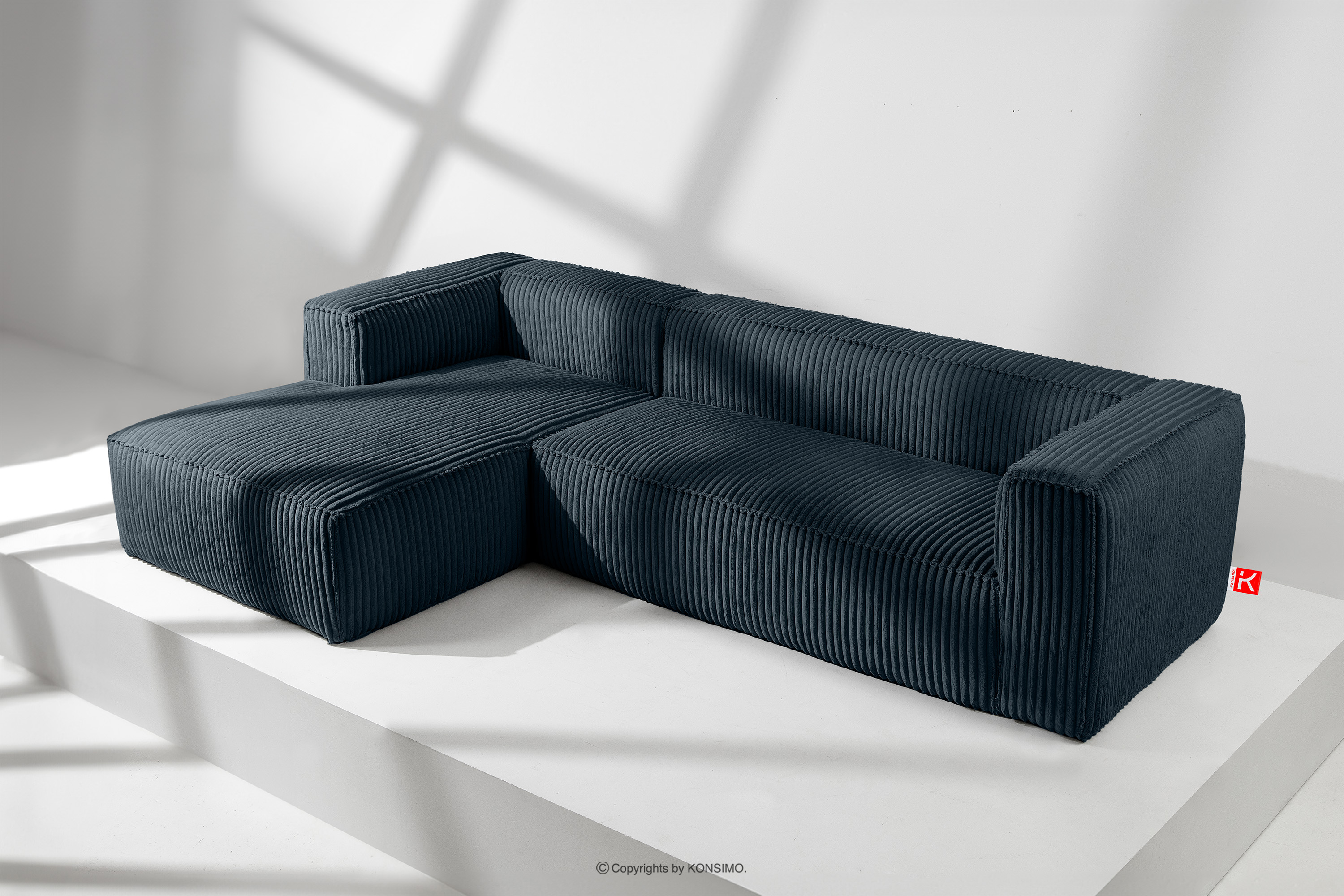 Großes marineblaues Ecksofa aus Kordstoff links mit einer soliden Konstruktion und einem einzigartigen Design. Das Gestell dieses eleganten Möbelstücks wurde aus einer Kombination von Kiefern- und Buchenholz gefertigt, was nicht nur ein ästhetisch ansprechendes Aussehen, sondern auch eine jahrelange Haltbarkeit gewährleistet. Der Innenraum wird von einer soliden Konstruktion aus Span- und Faserplatten getragen, die Stabilität und Nutzungskomfort garantiert.
