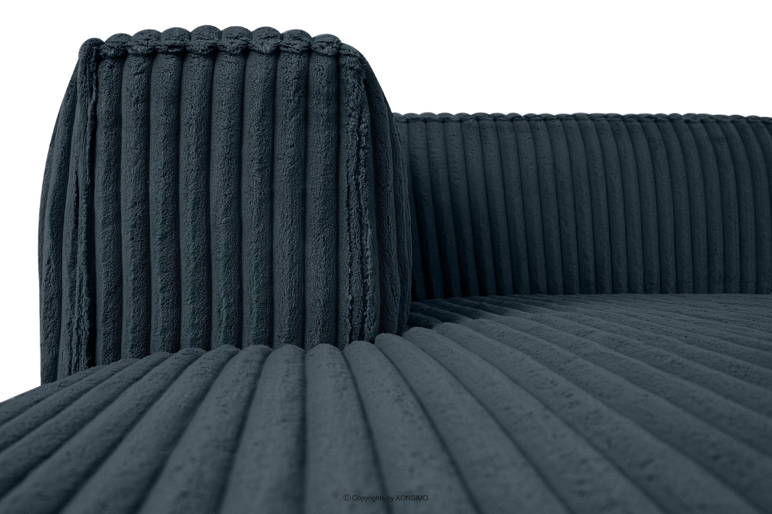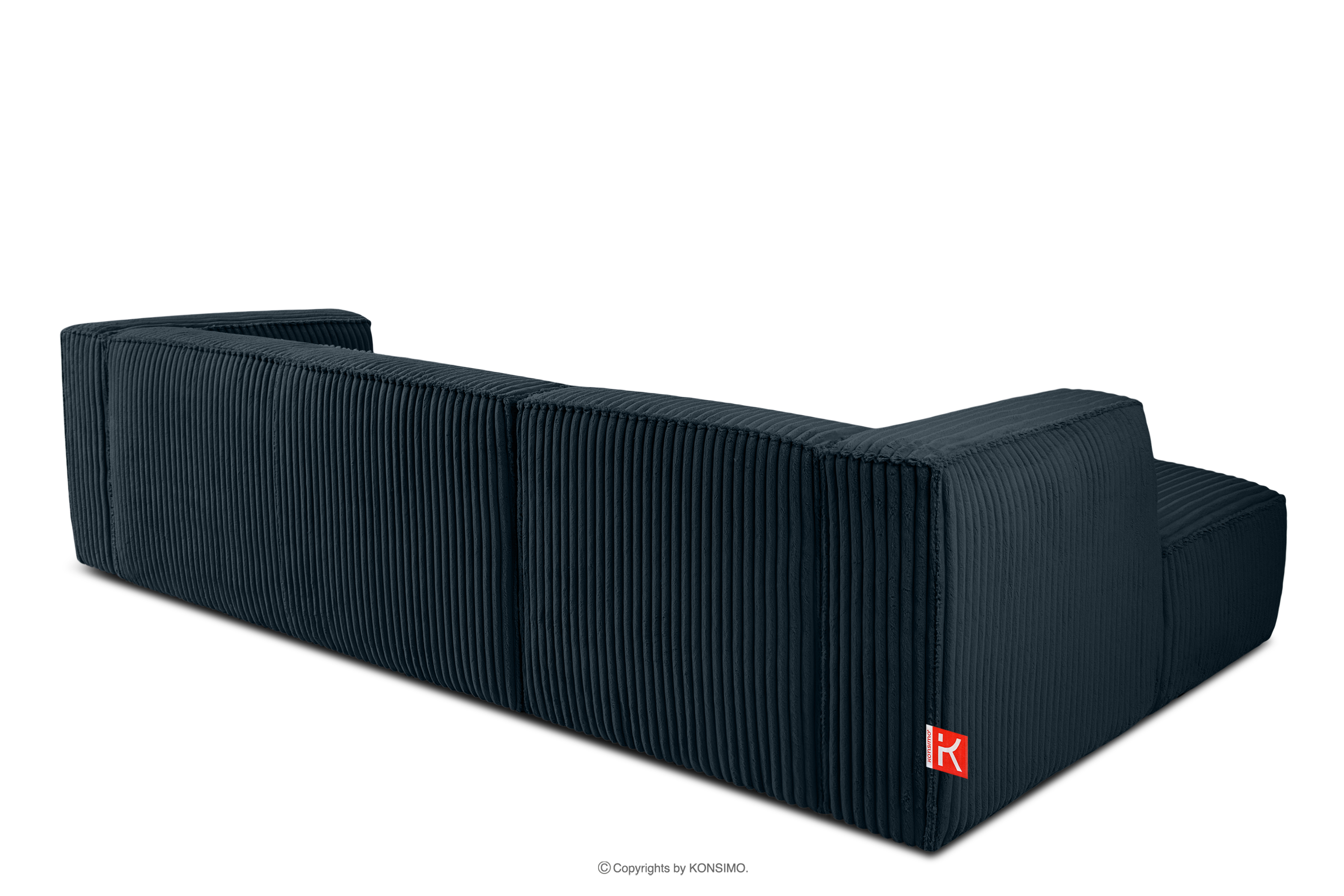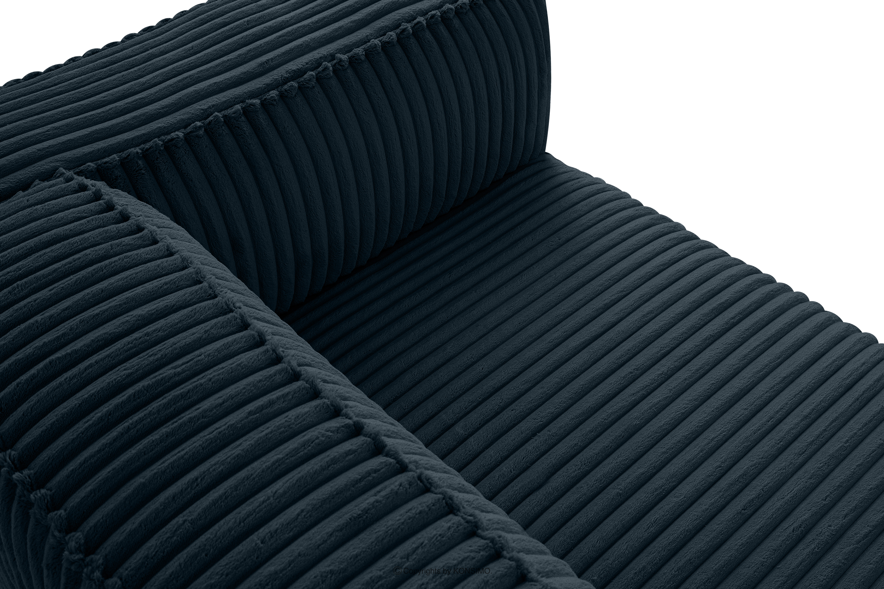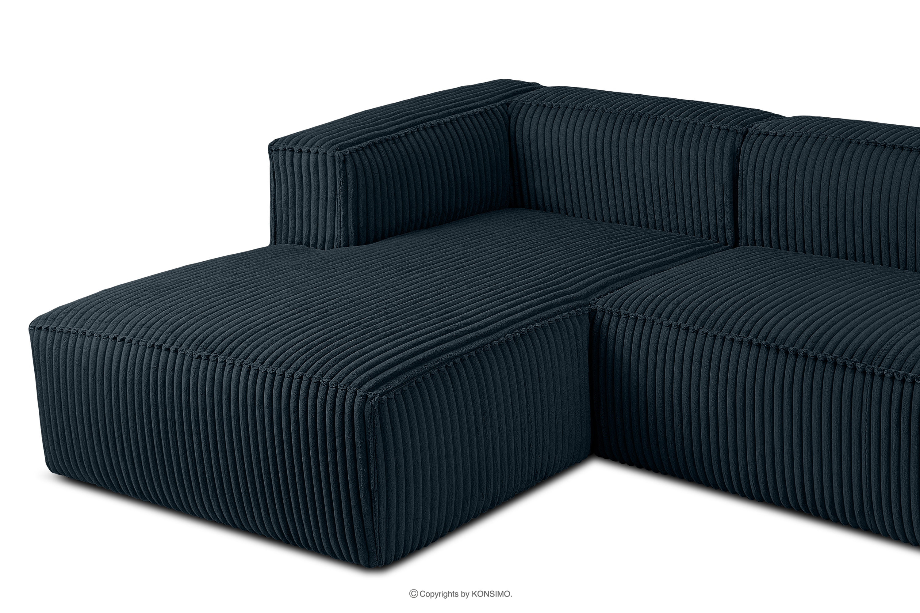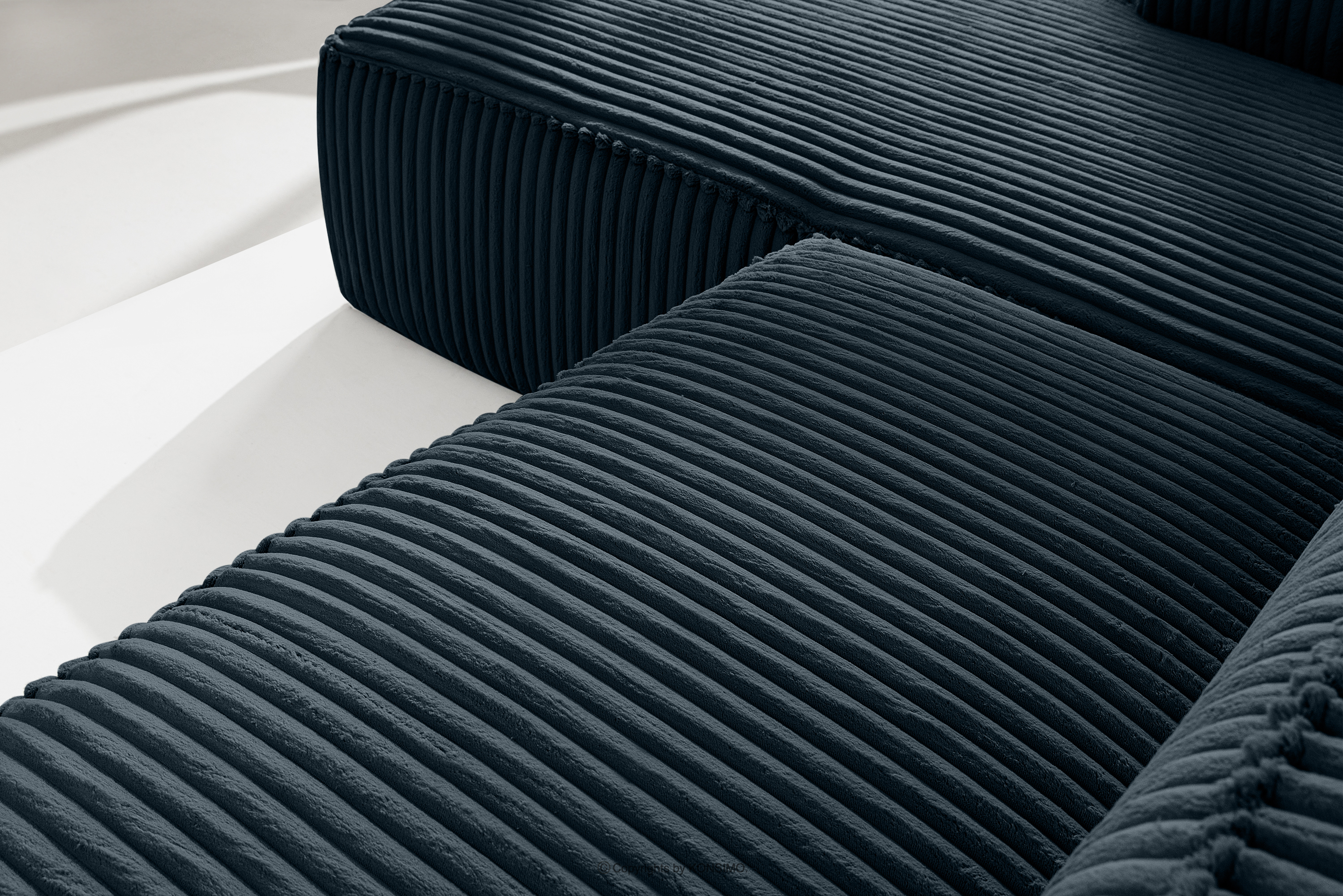 Großes marineblaues Ecksofa aus Kordstoff links mit einer soliden Konstruktion und einem einzigartigen Design. Das Gestell dieses eleganten Möbelstücks wurde aus einer Kombination von Kiefern- und Buchenholz gefertigt, was nicht nur ein ästhetisch ansprechendes Aussehen, sondern auch eine jahrelange Haltbarkeit gewährleistet. Der Innenraum wird von einer soliden Konstruktion aus Span- und Faserplatten getragen, die Stabilität und Nutzungskomfort garantiert.