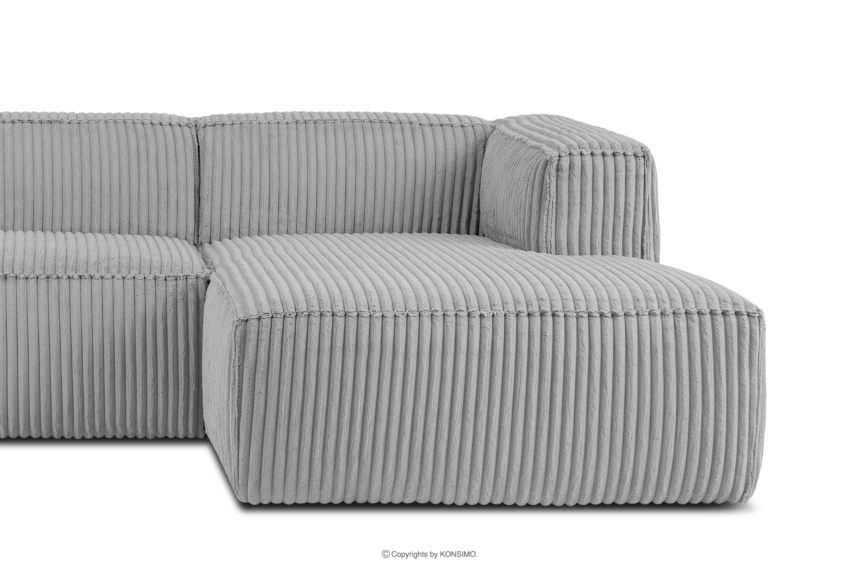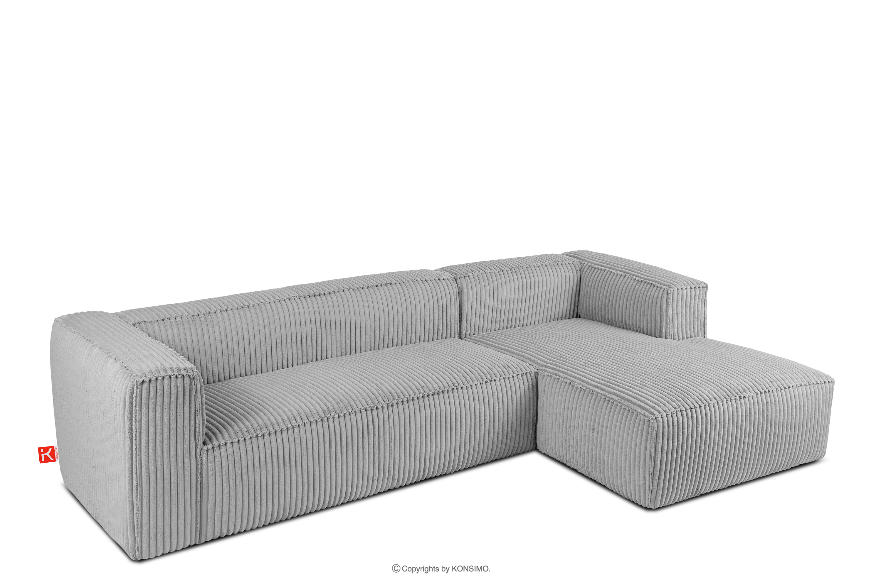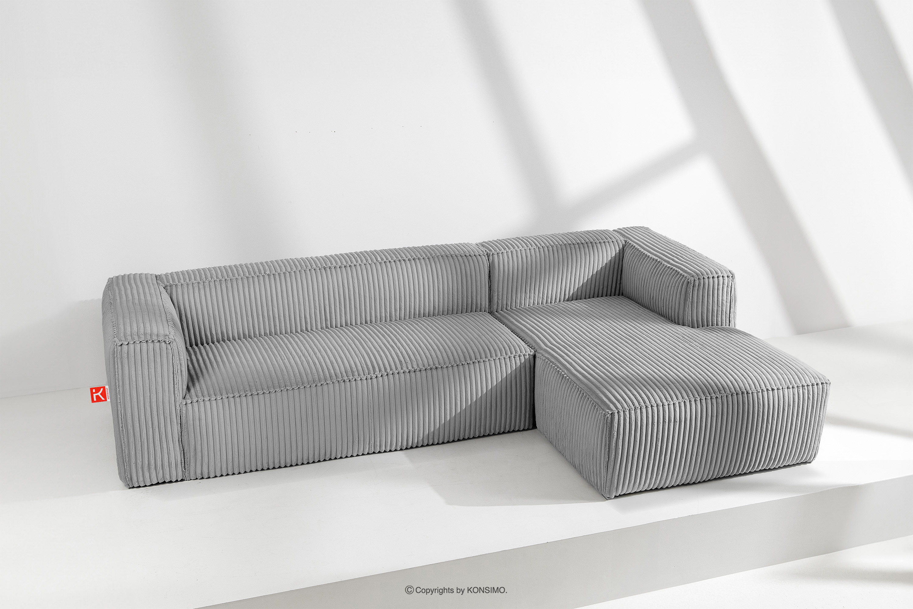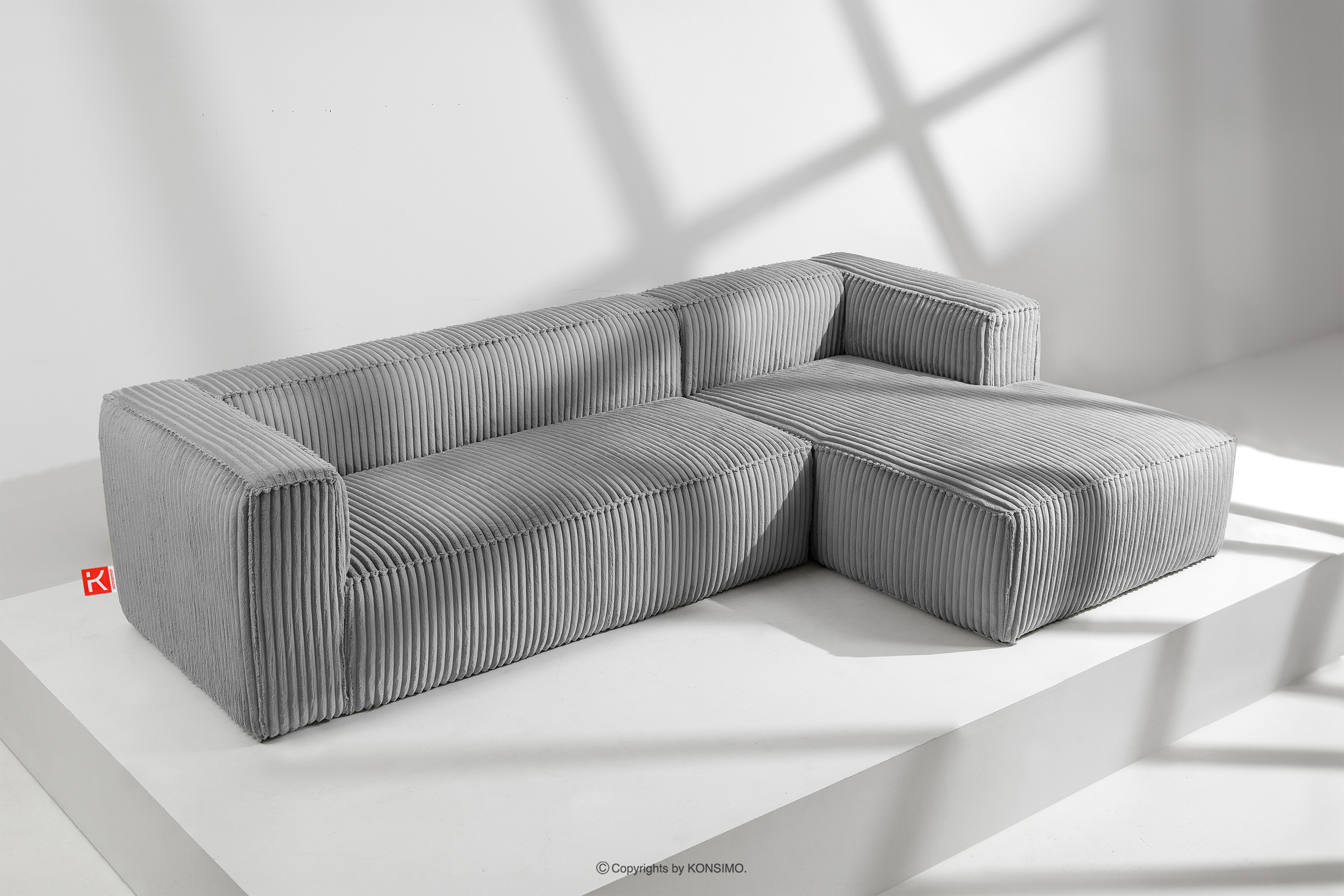 Großes hellgraues Ecksofa aus Kordstoff rechts mit einer soliden Konstruktion und außergewöhnlichem Design. Das Gestell dieses eleganten Möbelstücks wurde aus einer Kombination von Kiefern- und Buchenholz gefertigt, was nicht nur ein ästhetisches Aussehen, sondern auch eine lange Lebensdauer gewährleistet. Der Innenraum wird von einer soliden Konstruktion aus Span- und Faserplatten getragen, die Stabilität und Nutzungskomfort garantiert.