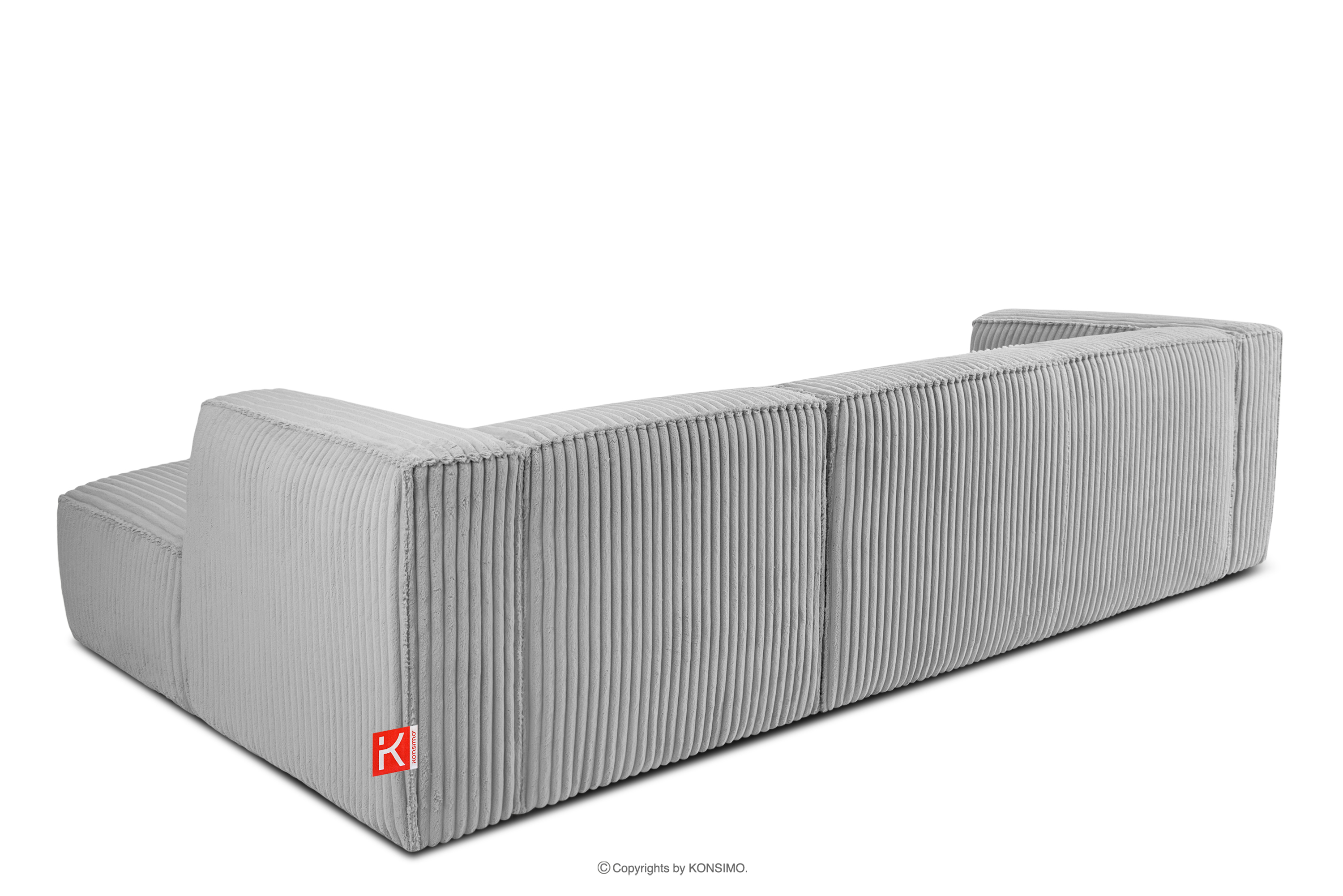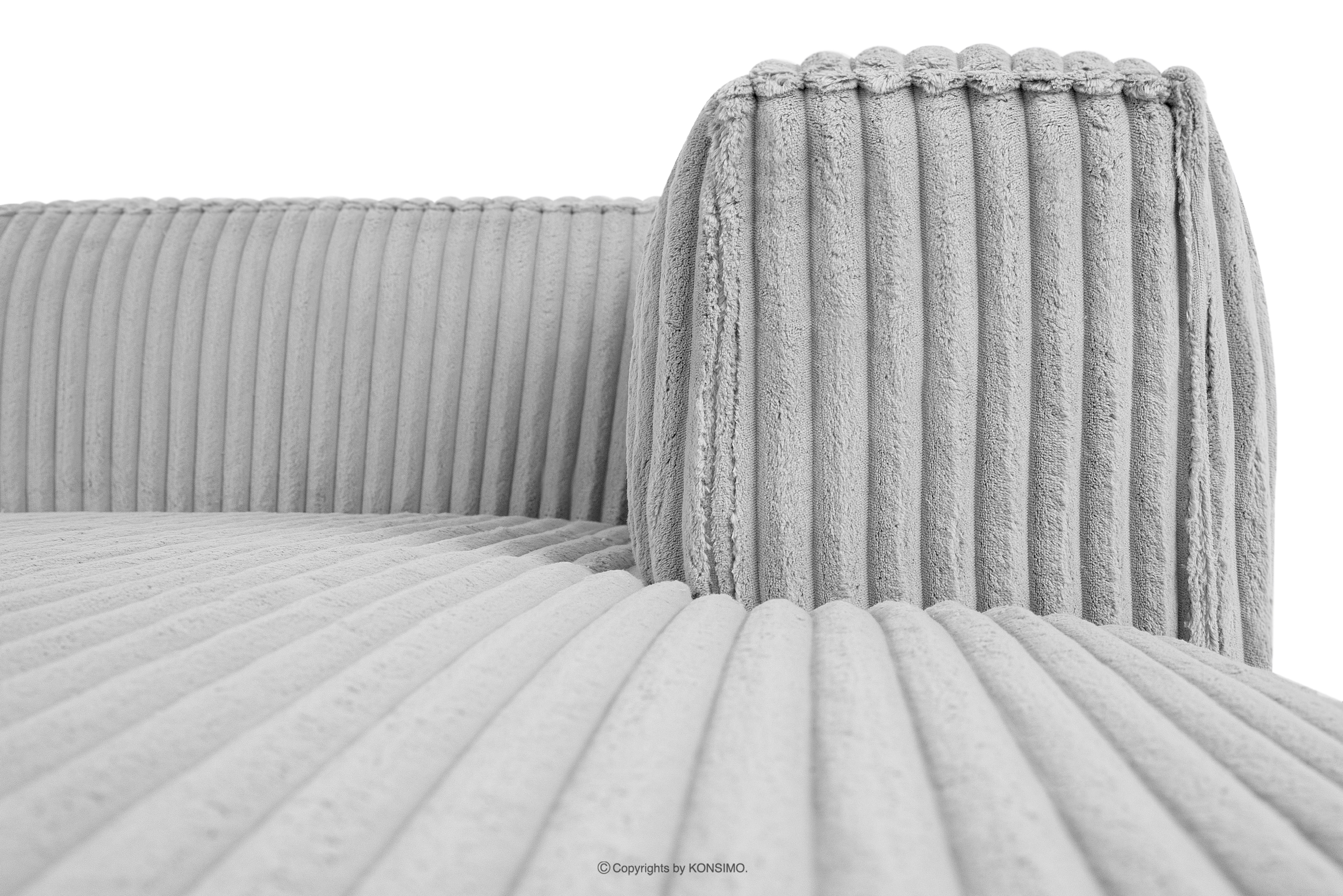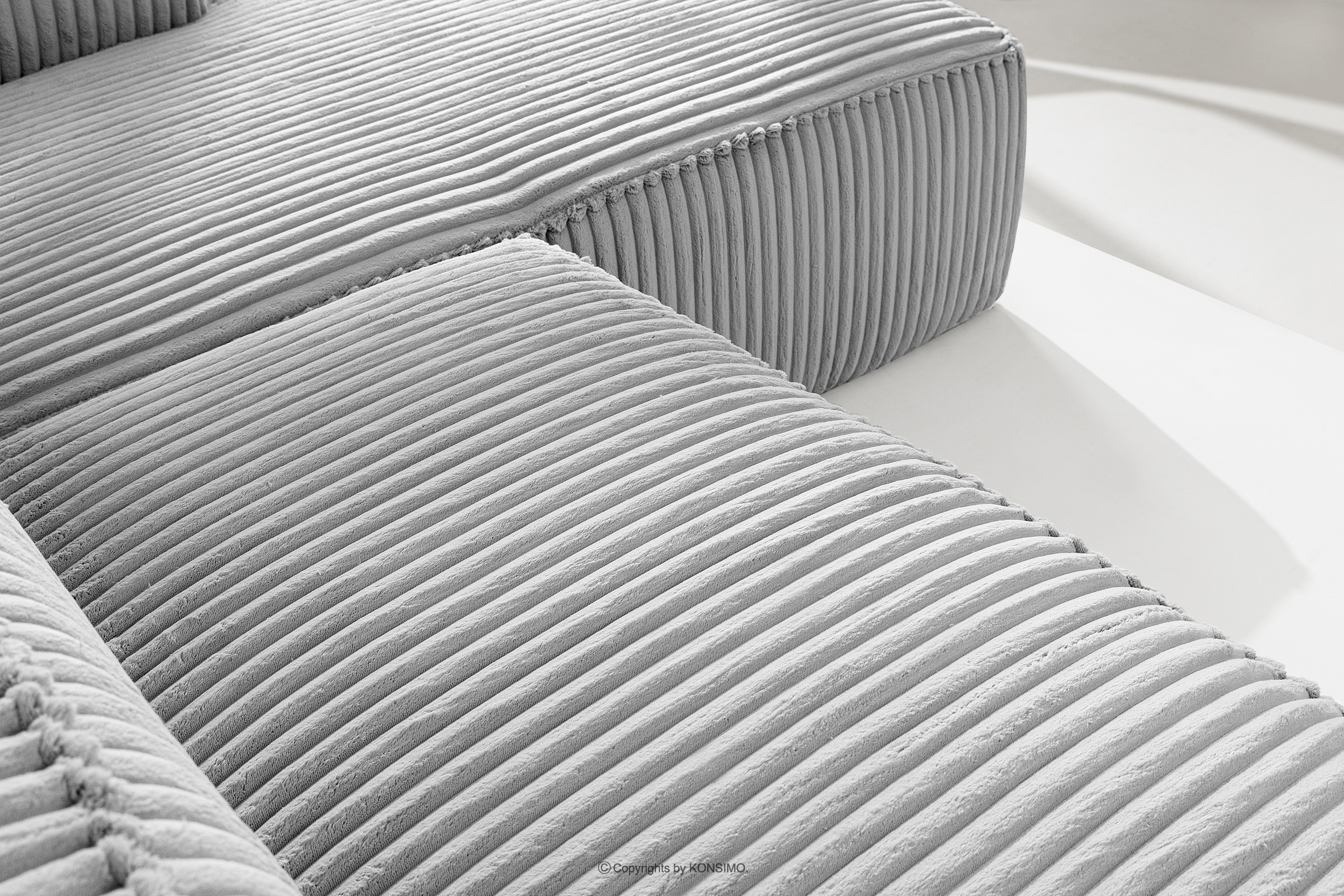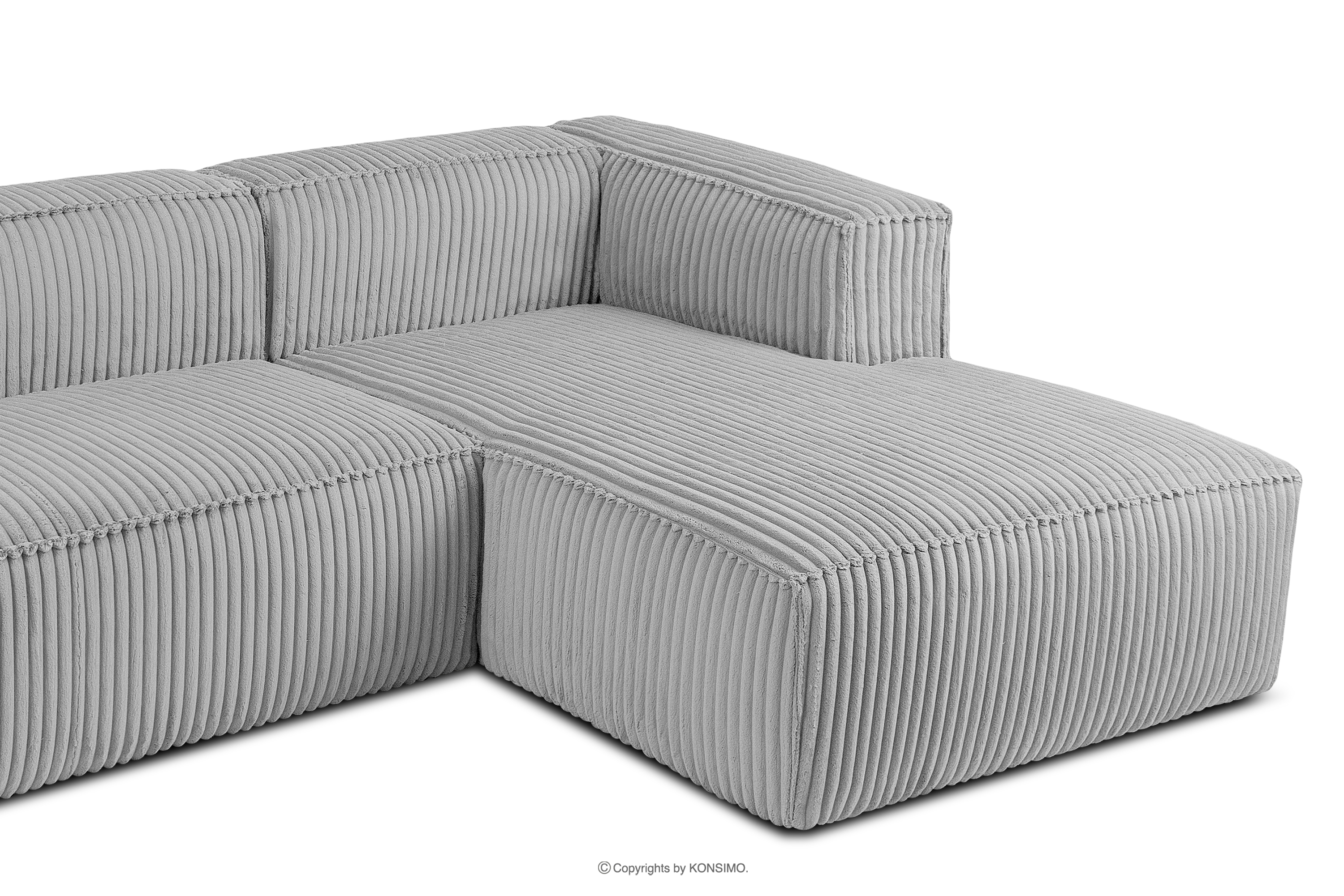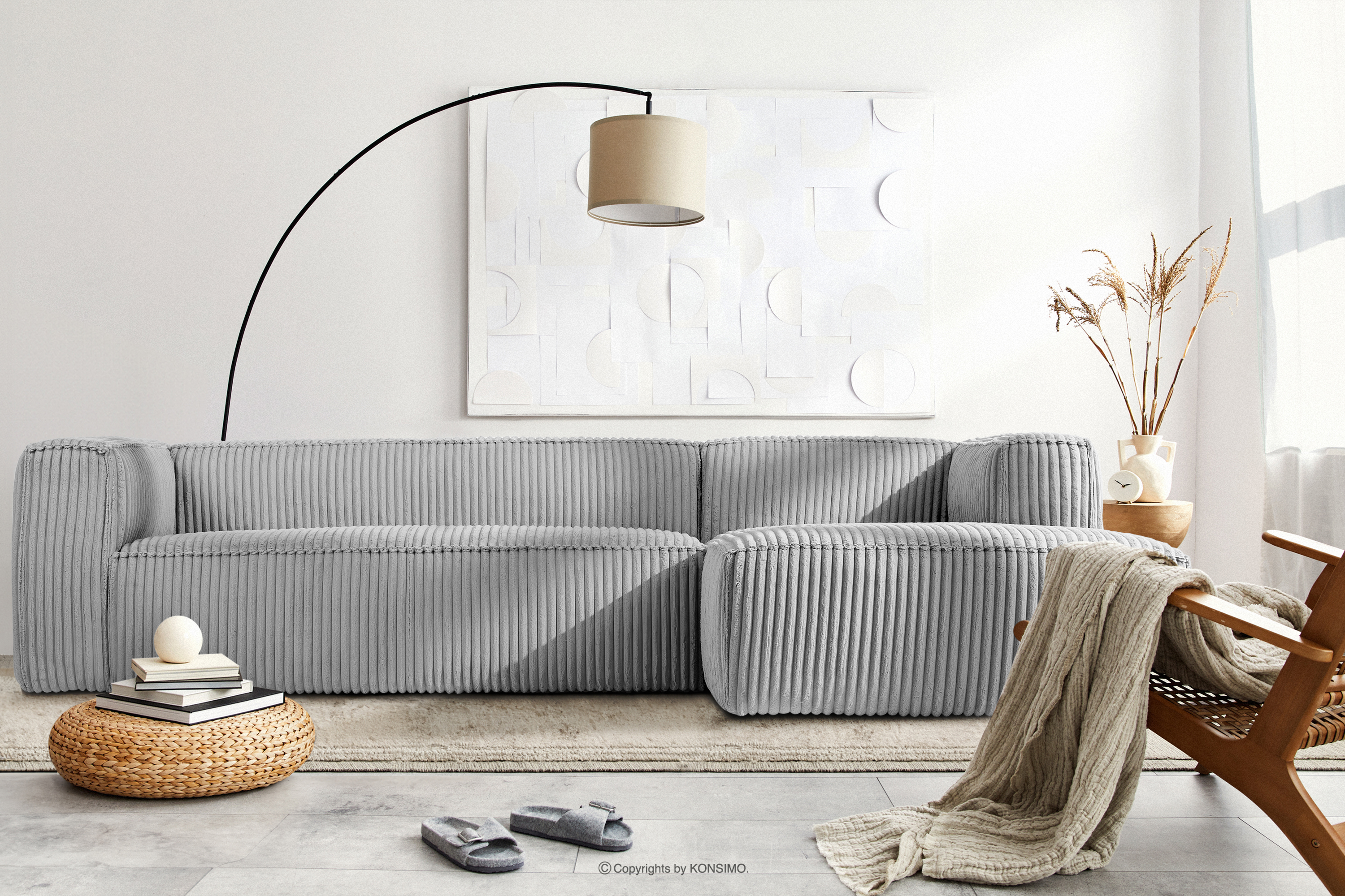 Großes hellgraues Ecksofa aus Kordstoff rechts mit einer soliden Konstruktion und außergewöhnlichem Design. Das Gestell dieses eleganten Möbelstücks wurde aus einer Kombination von Kiefern- und Buchenholz gefertigt, was nicht nur ein ästhetisches Aussehen, sondern auch eine lange Lebensdauer gewährleistet. Der Innenraum wird von einer soliden Konstruktion aus Span- und Faserplatten getragen, die Stabilität und Nutzungskomfort garantiert.