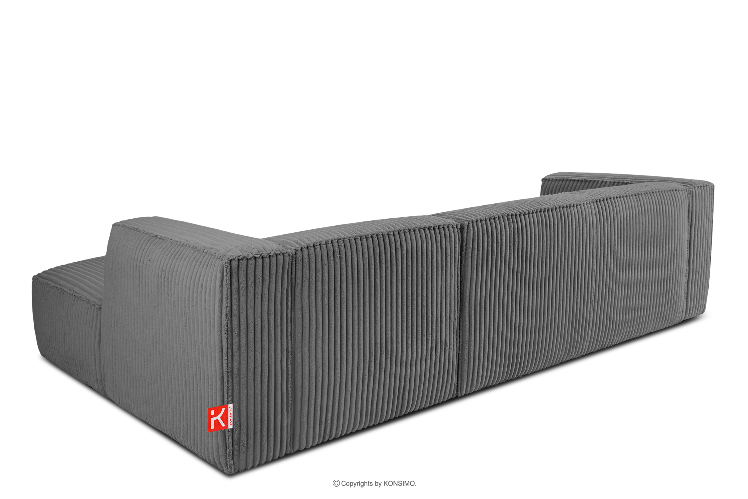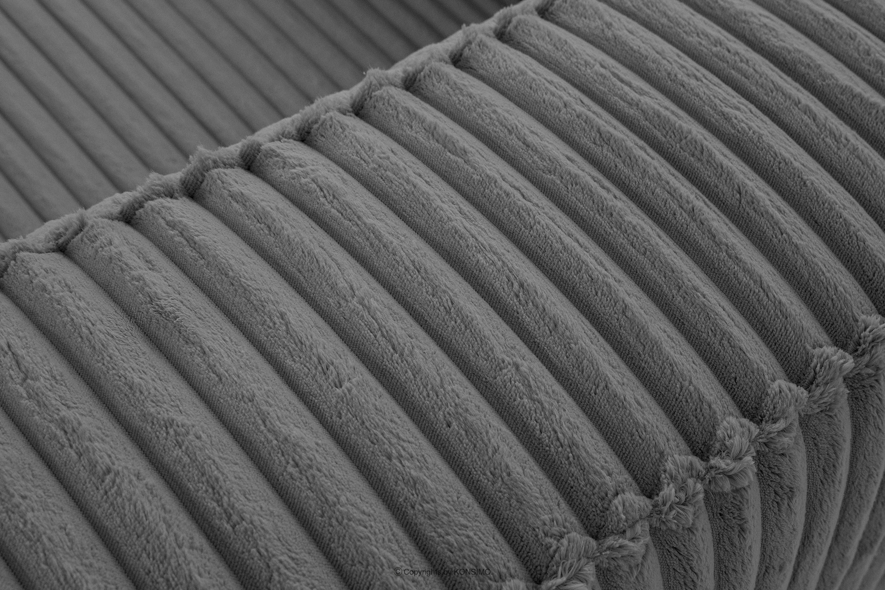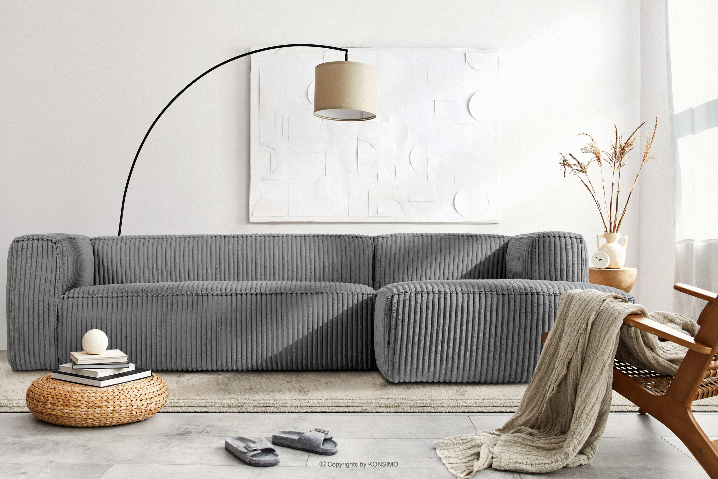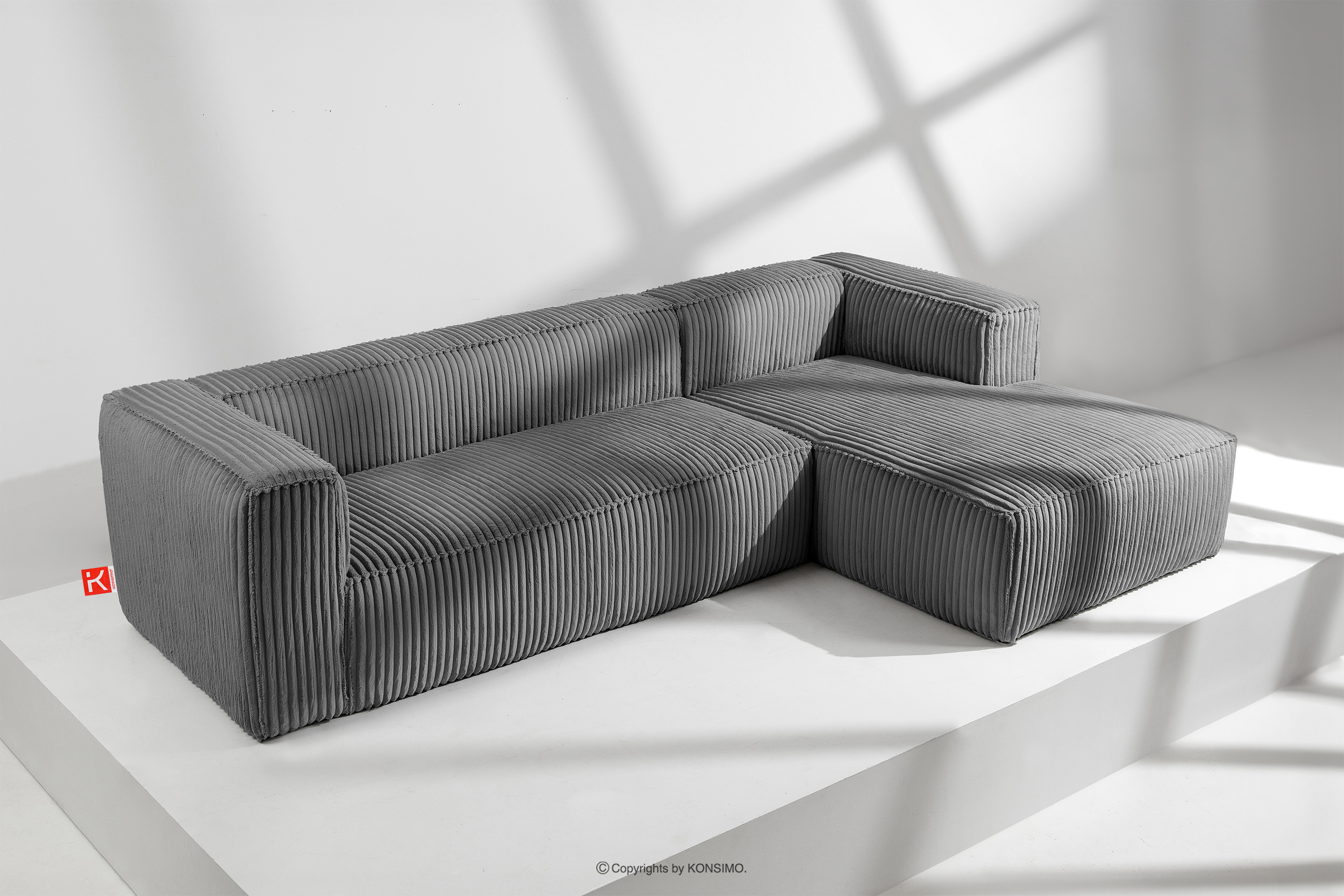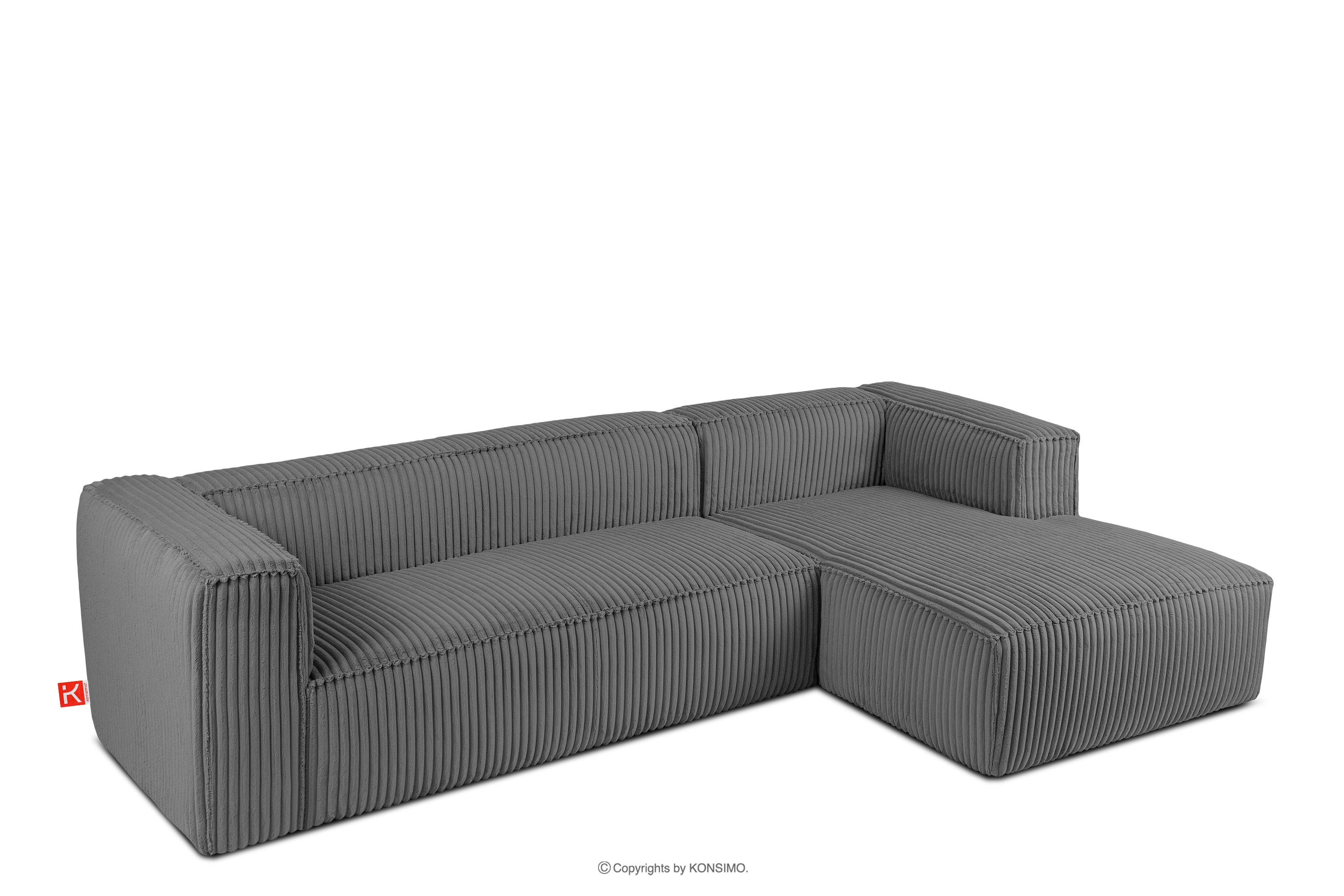 Großes dunkelgraues Ecksofa aus Kordstoff rechts mit einer soliden Konstruktion und außergewöhnlichem Design. Das Gestell dieses eleganten Möbelstücks wurde aus einer Kombination von Kiefern- und Buchenholz gefertigt, was nicht nur ein ästhetisches Aussehen, sondern auch eine lange Lebensdauer gewährleistet. Der Innenraum wird von einer soliden Konstruktion auf der Basis von Span- und Faserplatten getragen, die Stabilität und Nutzungskomfort garantiert.